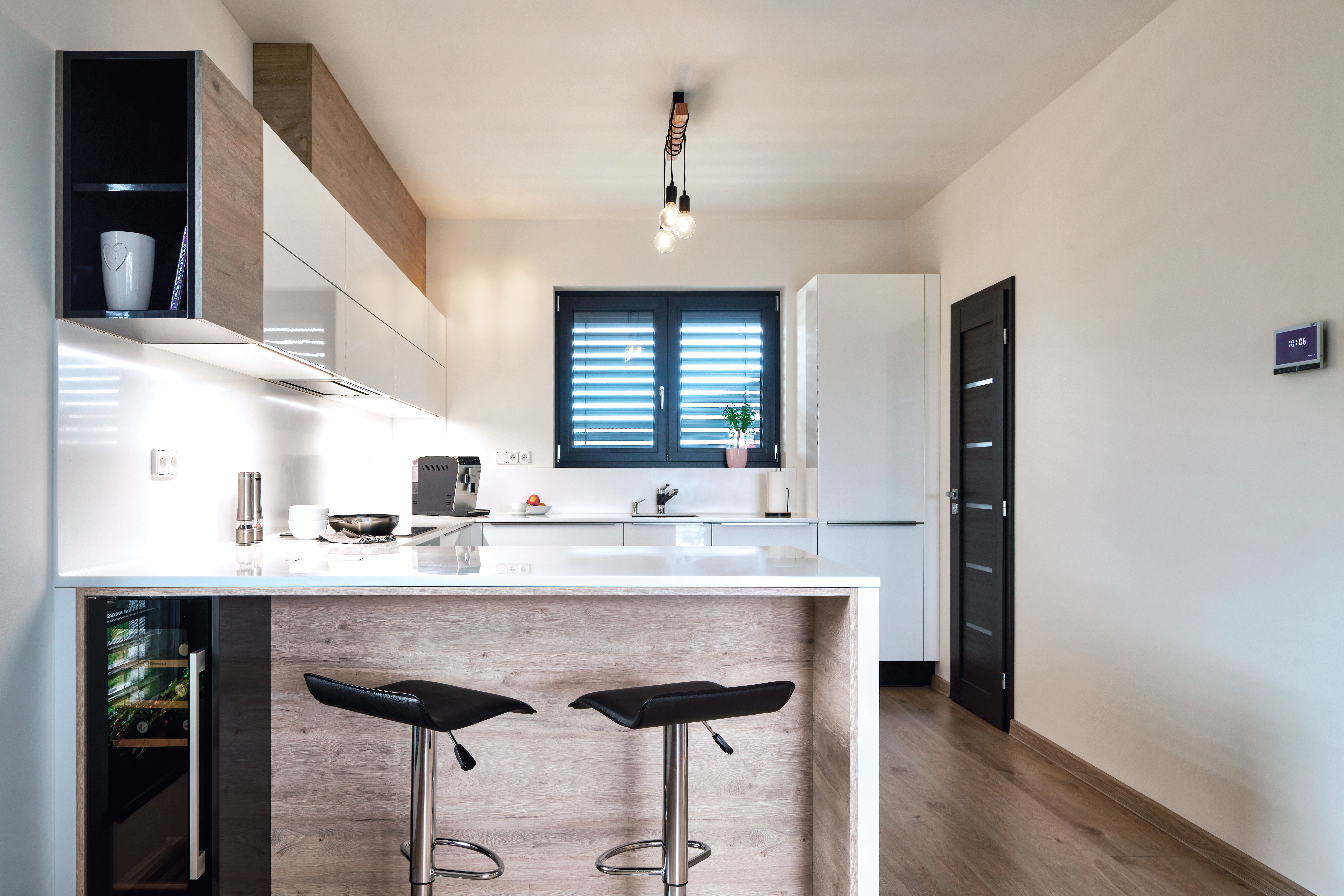 Eine wahrhaft von Luxus geprägte Design-Anbauküche. Das ist die Küche COMFORT in weißem, glänzendem Lack, akzentuiert durch das Furnier und den dominanten Griff.