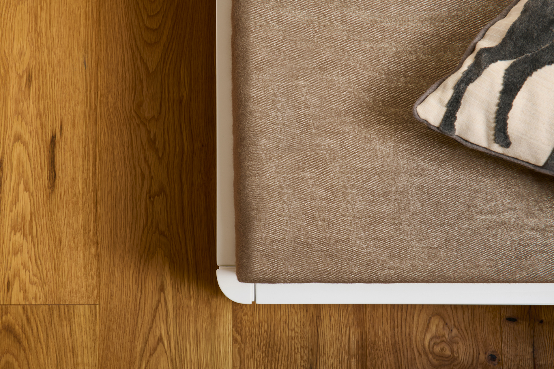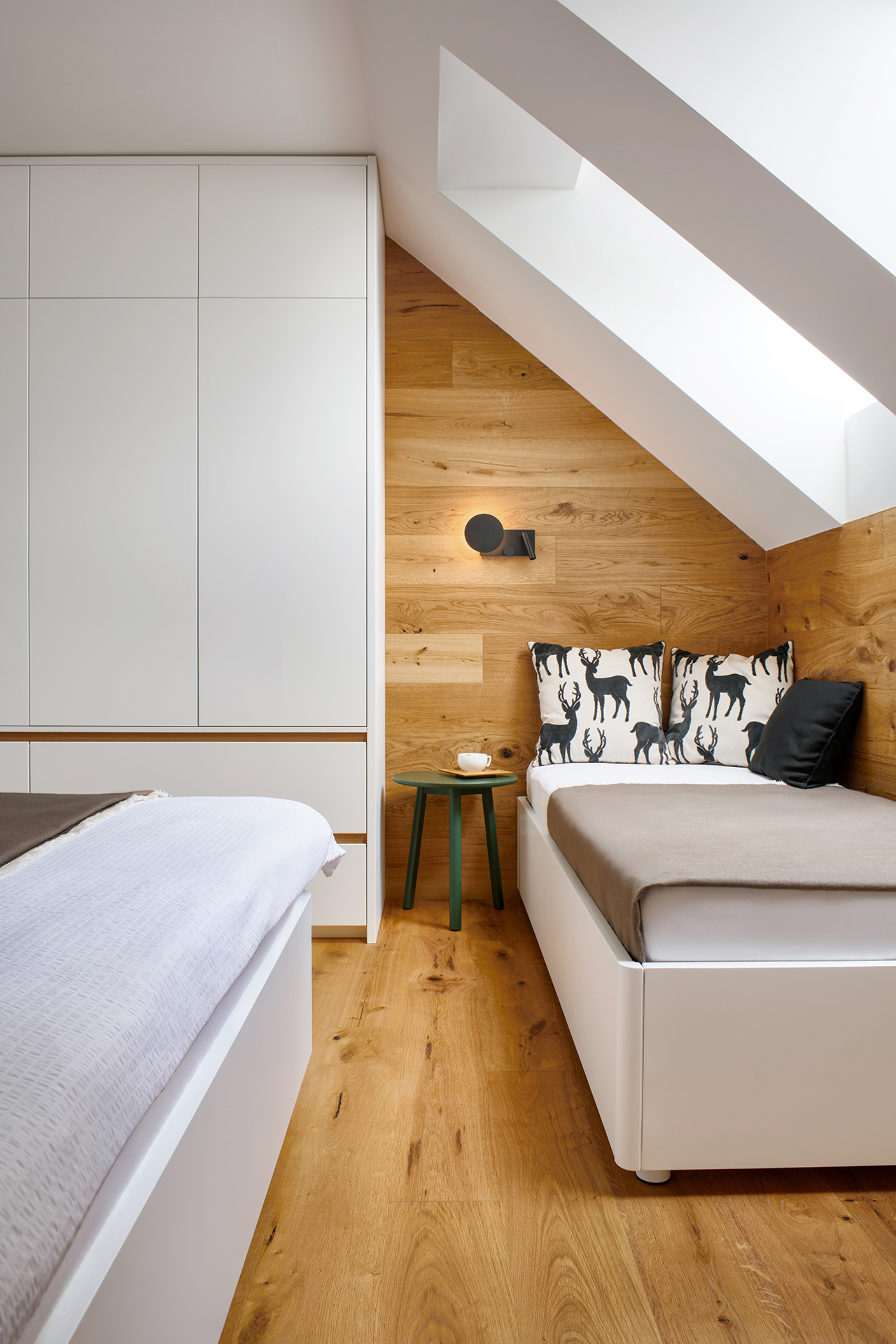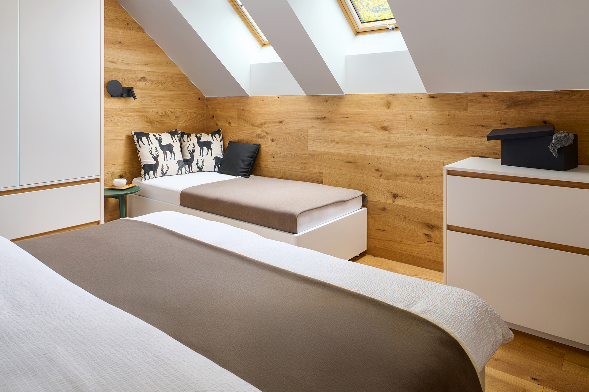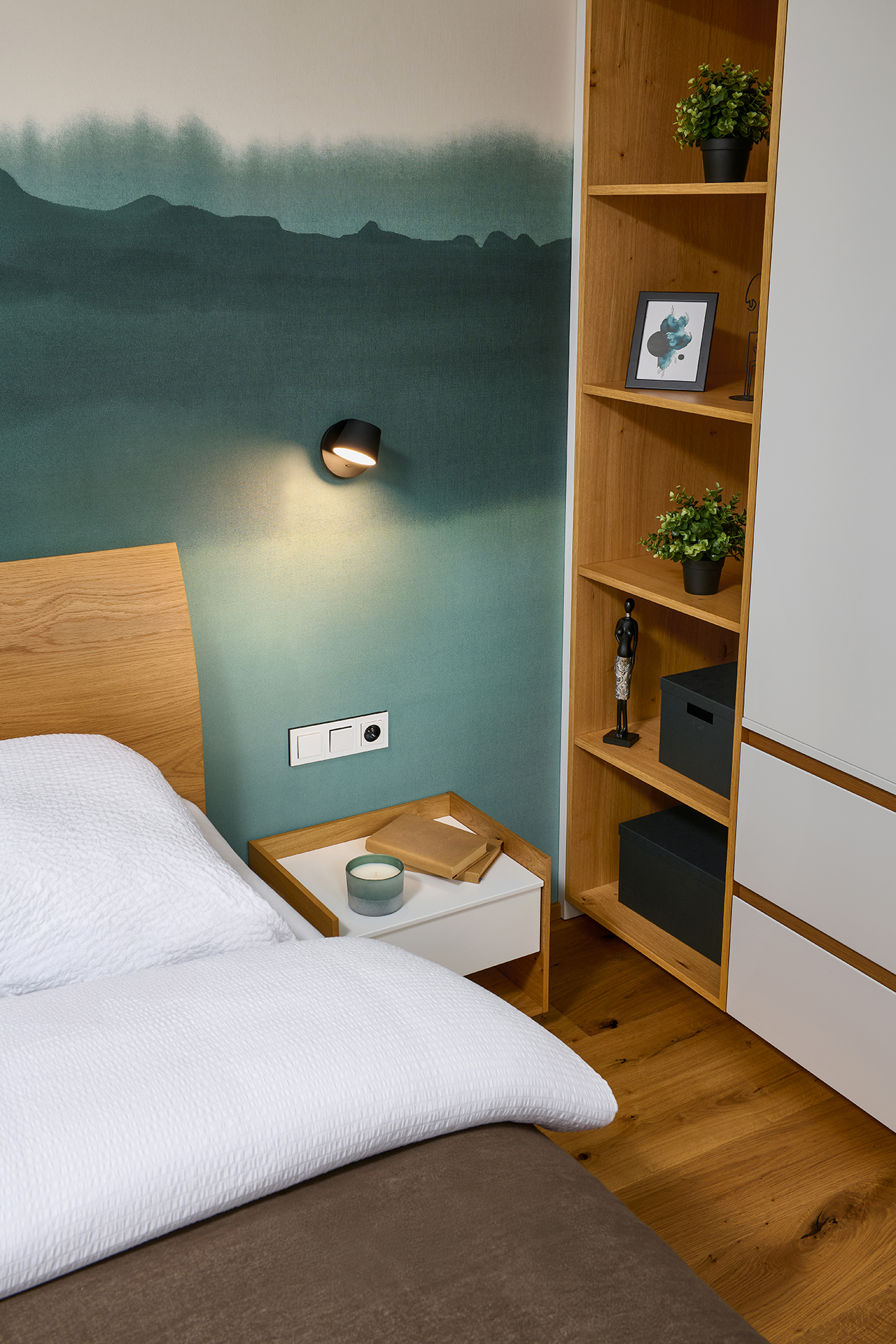 Ein diskreter Rückzugsort zum Entspannen bietet das Schlafzimmer mit den Betten KLAUDIE mit massivem Kopfteil und LARA mit elegant geschwungenen Linien, die dem Raum ein Gefühl von Sicherheit und Privatsphäre verleihen. Der Einbauschrank mit Tip-On-Öffnung und Solid-Griffen bietet eine praktische Aufbewahrungslösung, ohne den klaren und ruhigen Charakter des Interieurs zu stören.