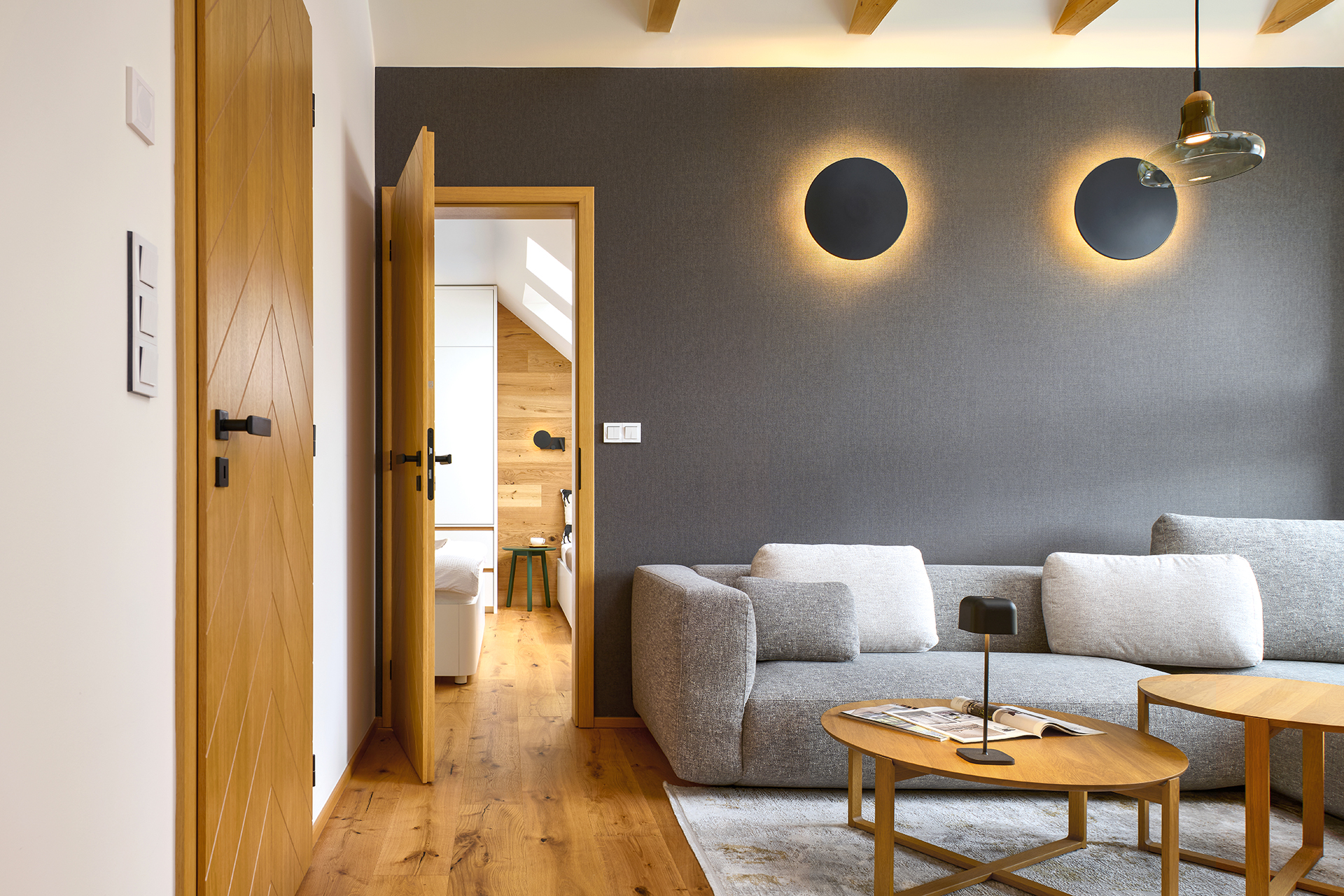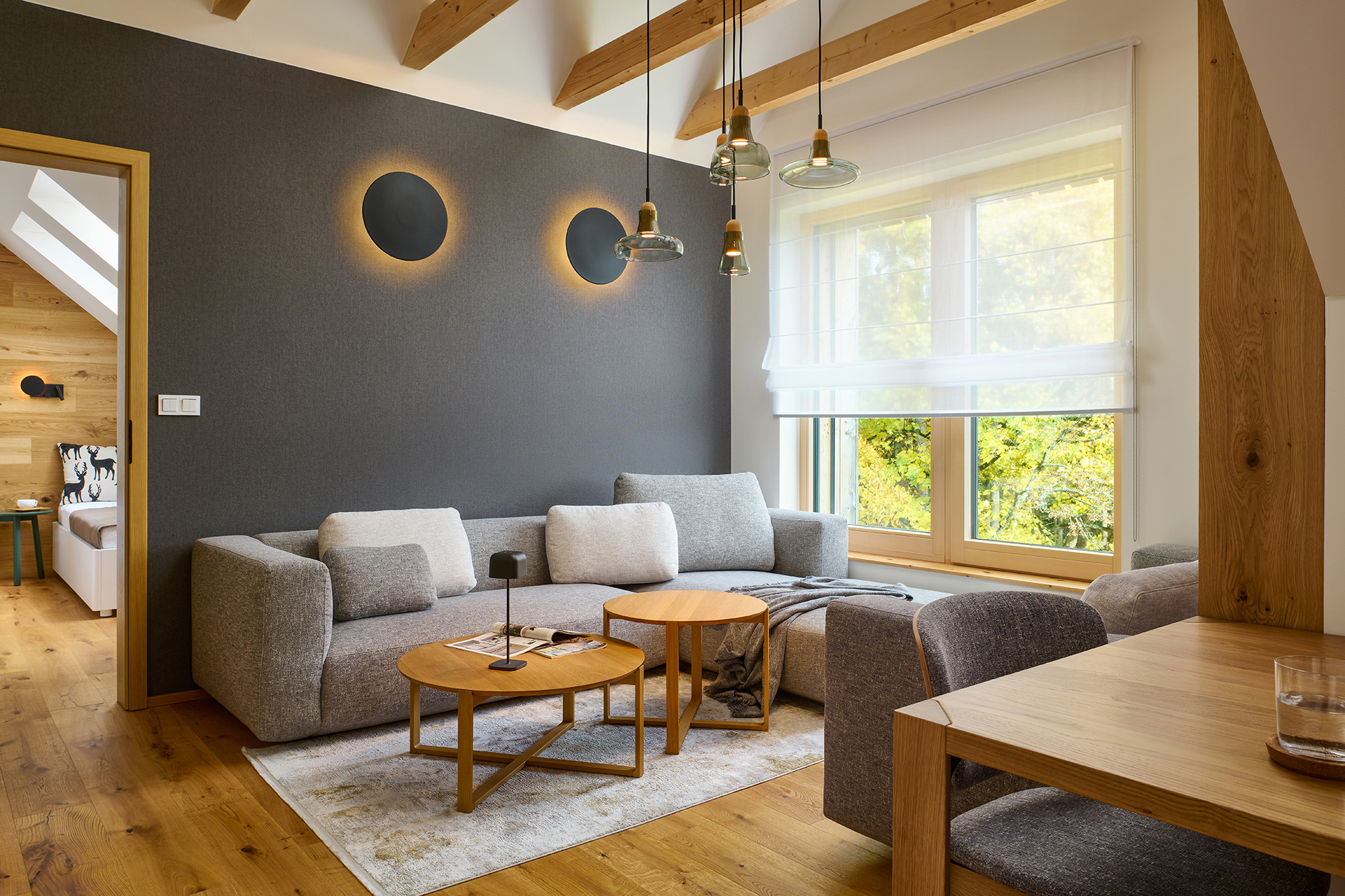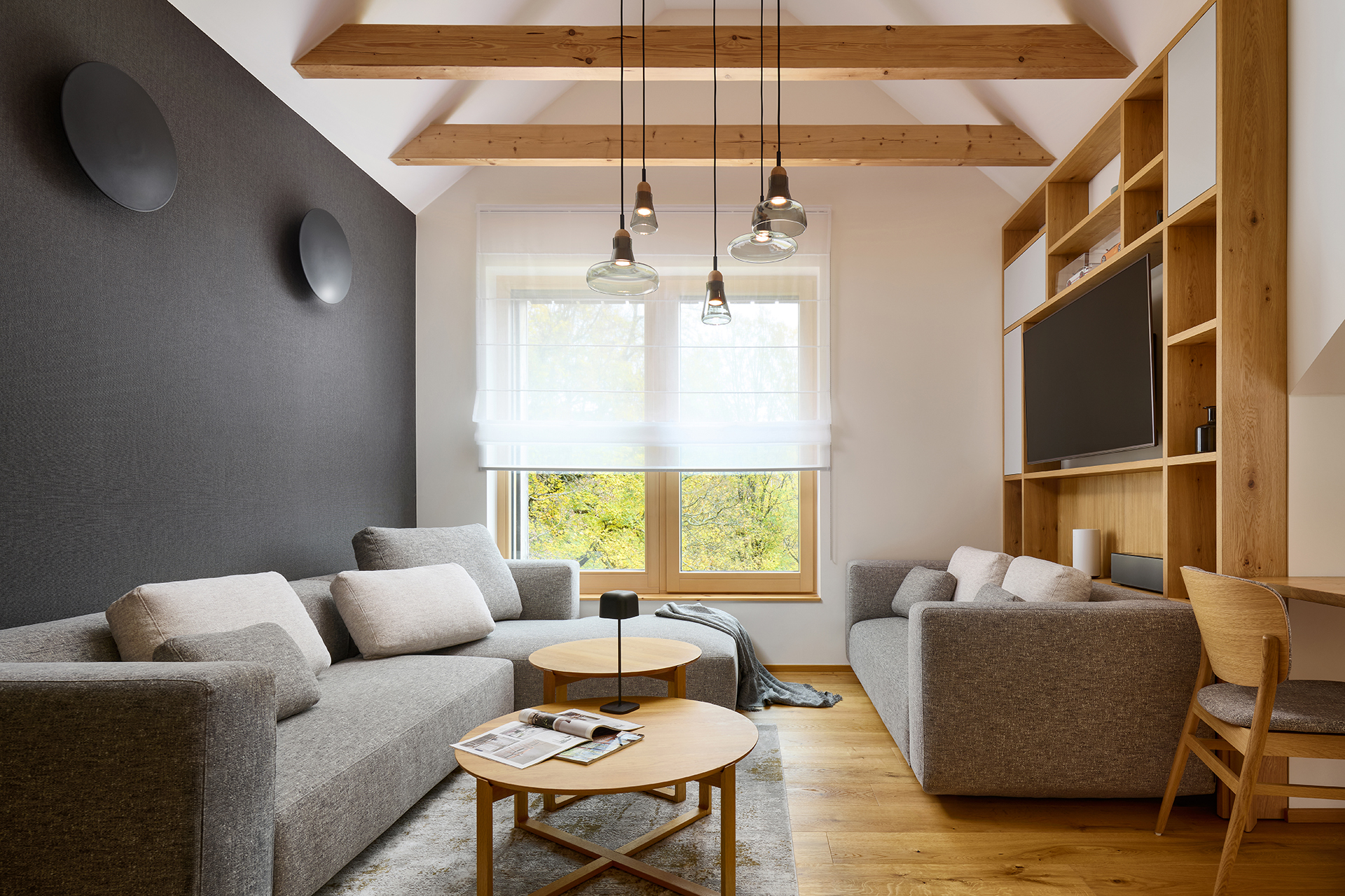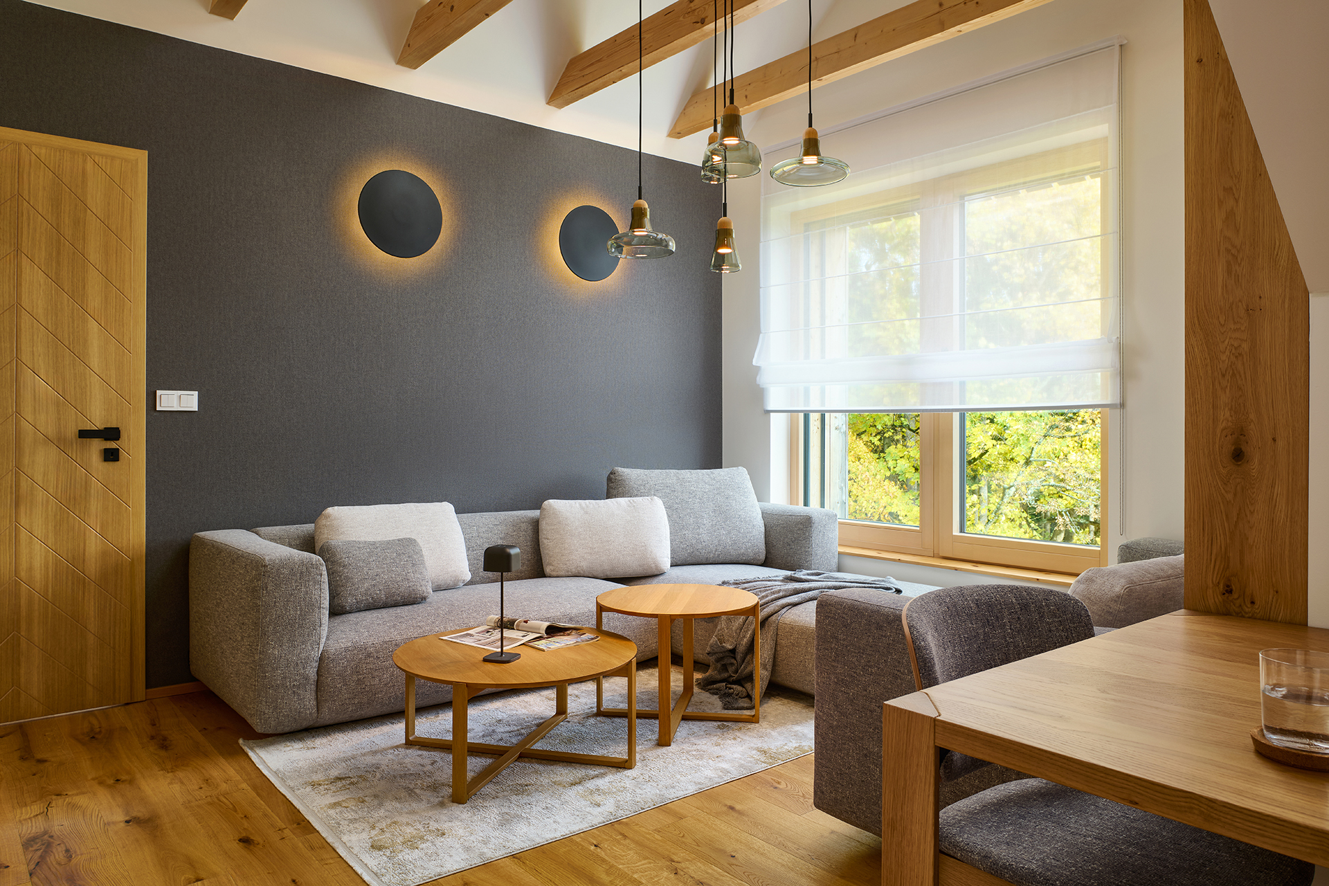 Von der Küche gelangt man nahtlos in den Wohnbereich, wo die HARMONY-Kombination sanfte Töne mit der natürlichen Maserung der Balken verbindet und die Gesamtatmosphäre des Raumes unterstreicht. Die bequeme Sitzgarnitur POLYGON ist wie geschaffen für Familienzusammenkünfte und ruhige, ungestörte Entspannung.