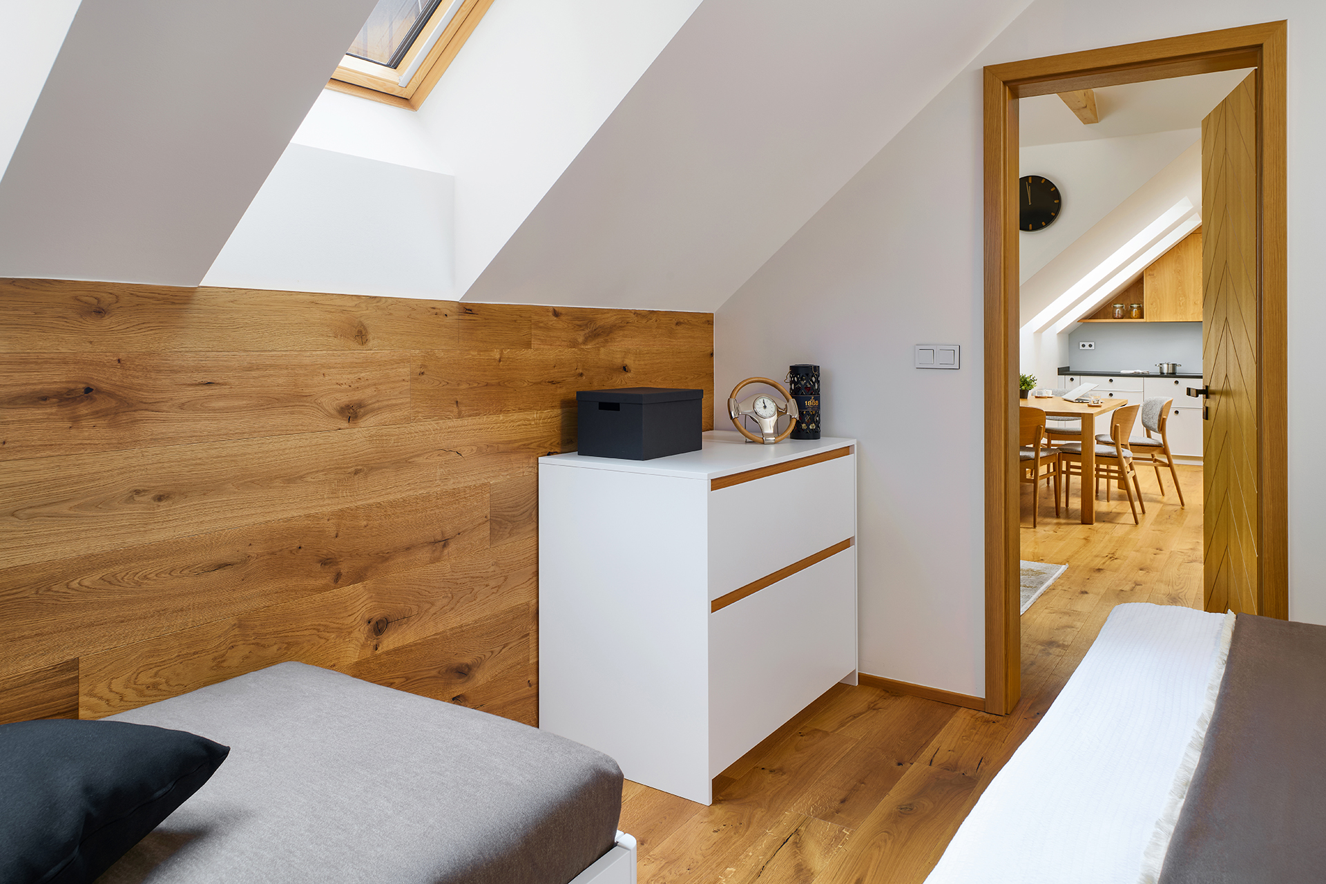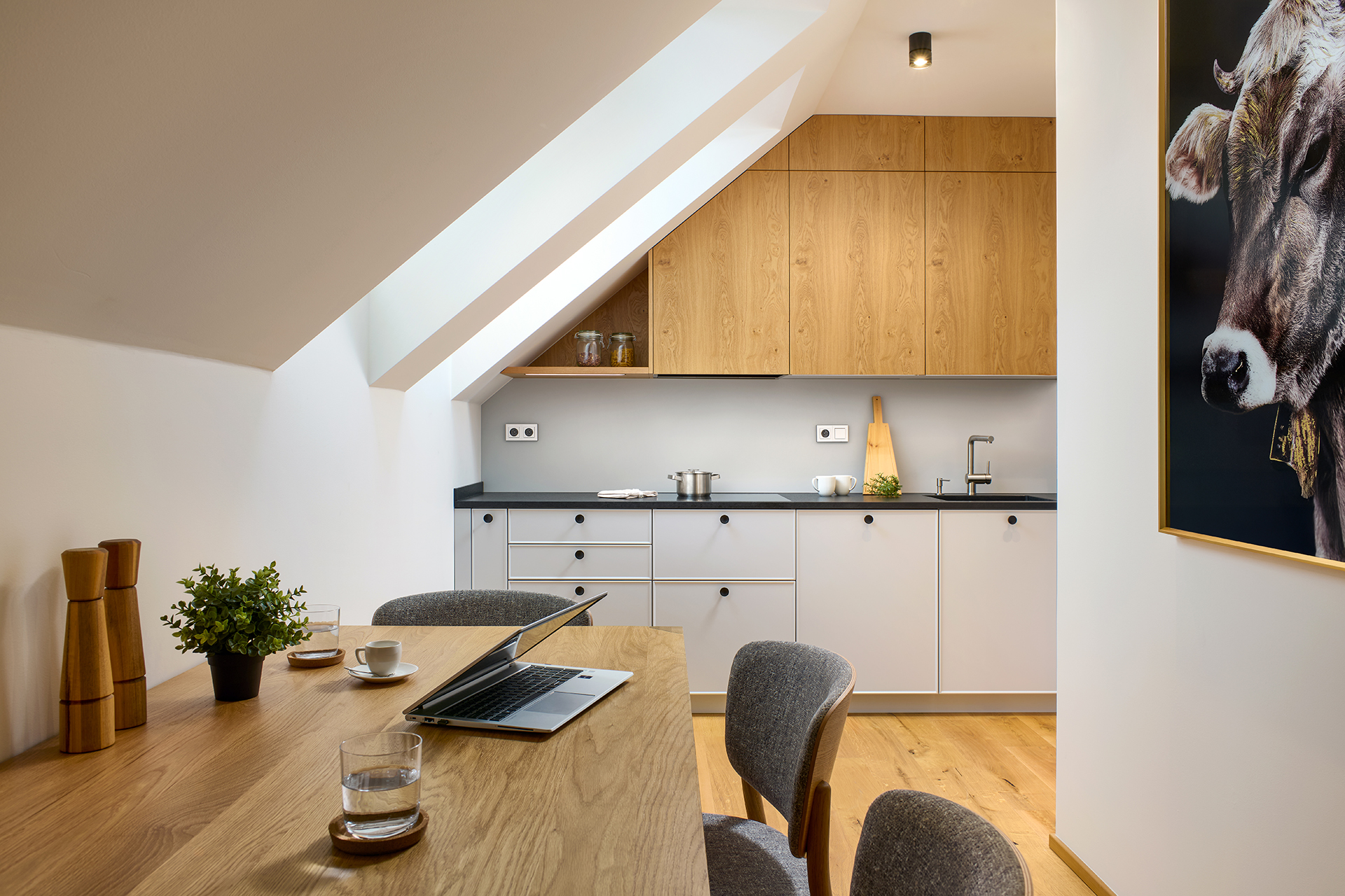 Dominant ist die Küche CUBIC in Hellgrau, bei der die Designer die atypische Dachschräge bis auf den letzten Zentimeter ausgenutzt haben. Die sanften Linien lassen das rustikale Eichenholz der Oberschränke zur Geltung kommen, dessen Textur dem Raum einen gemütlichen Charakter verleiht. Die kontrastierende schwarze Granitarbeitsplatte Nero Assoluto sorgt für Eleganz und Widerstandsfähigkeit, während die Siemens-Geräte einen zuverlässigen Betrieb gewährleisten.