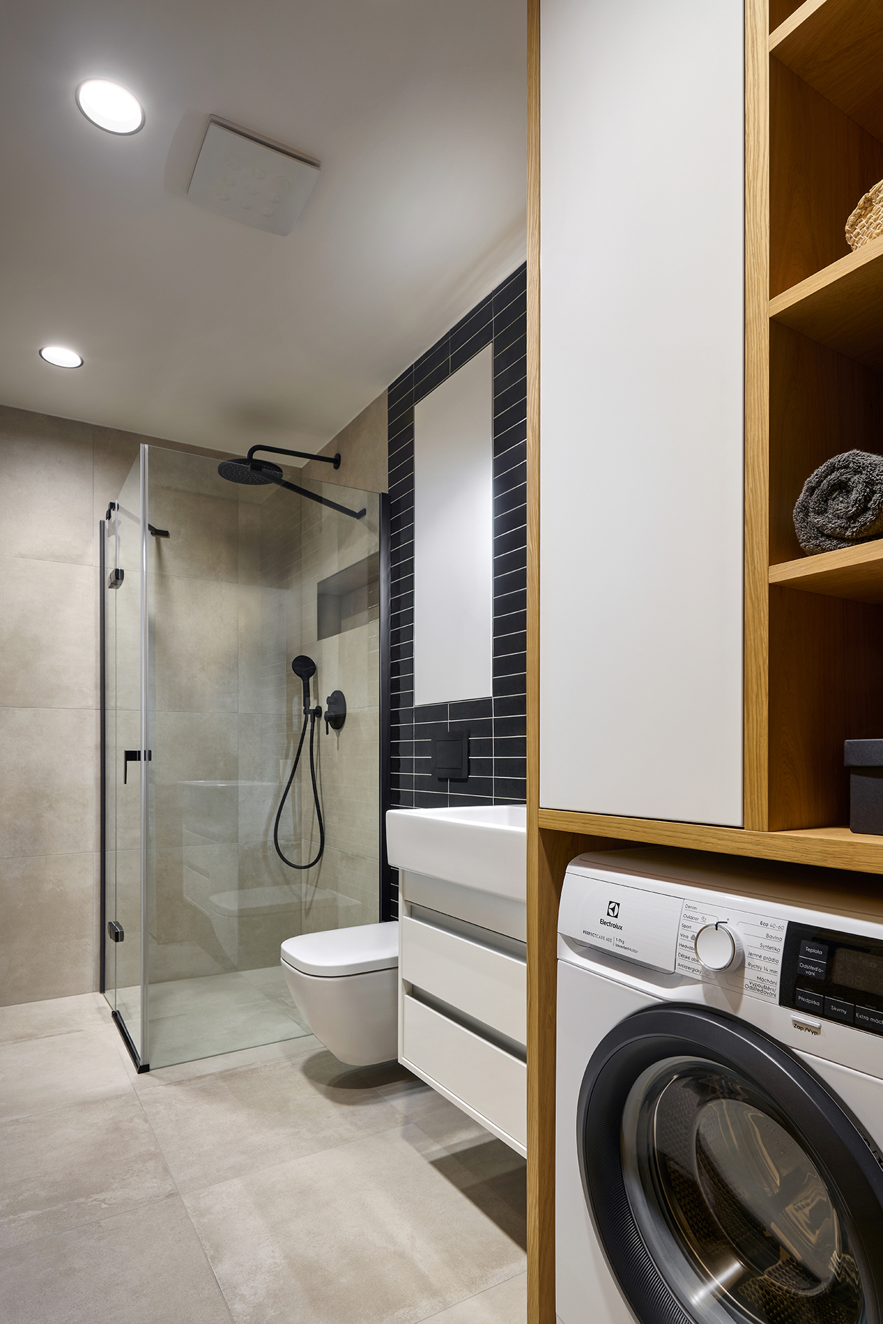 Von der Eingangshalle mit dezenten natürlichen Akzenten bis hin zum frischen, kompakten Badezimmer mit integrierter Waschmaschine ist das gesamte Interieur so konzipiert, dass es ausgewogen, funktional und komfortabel wirkt. Jeder Winkel bietet ein visuelles und sensorisches Erlebnis und unterstreicht die Harmonie des gesamten Raums.