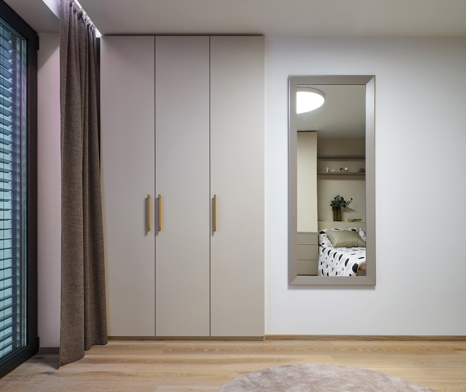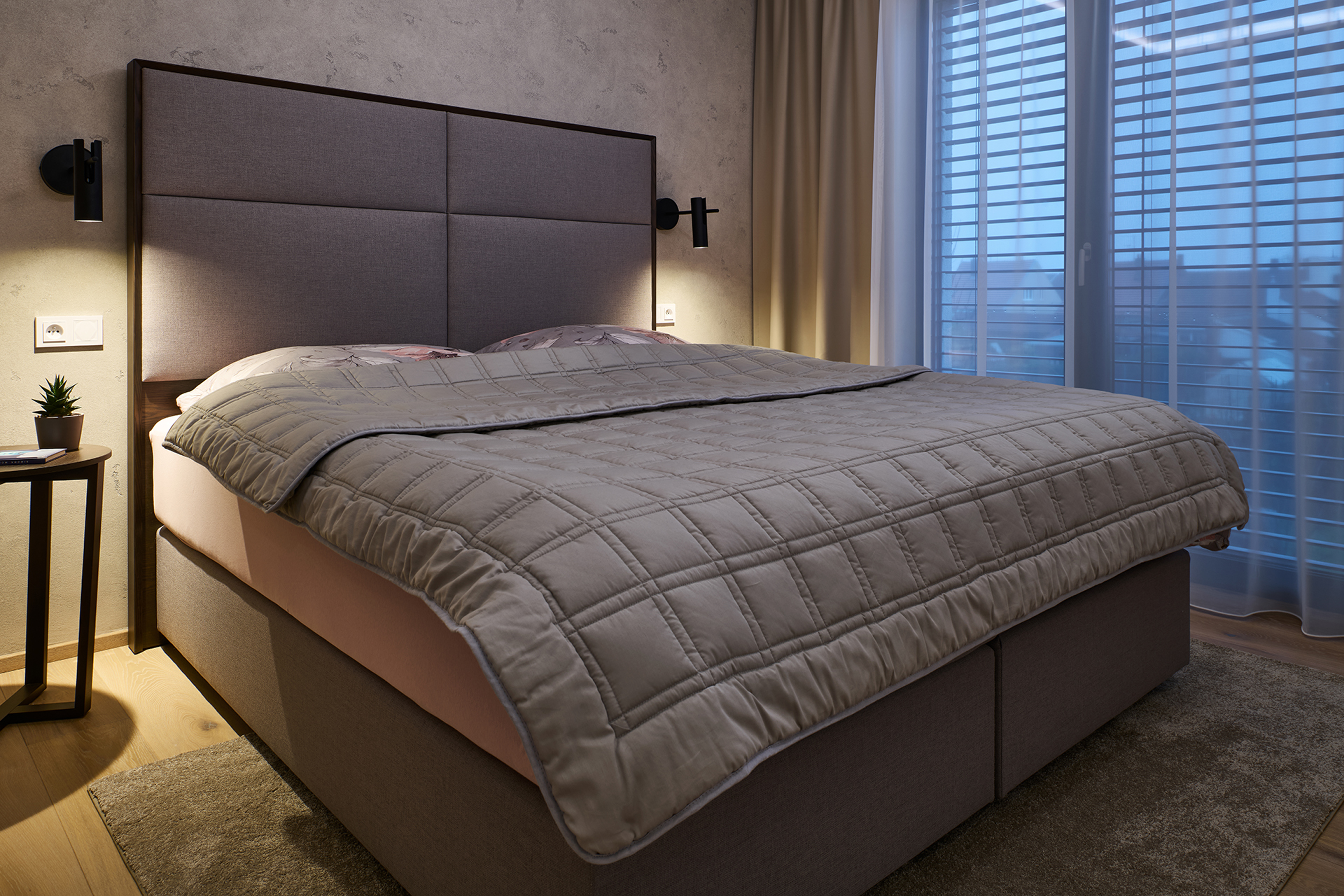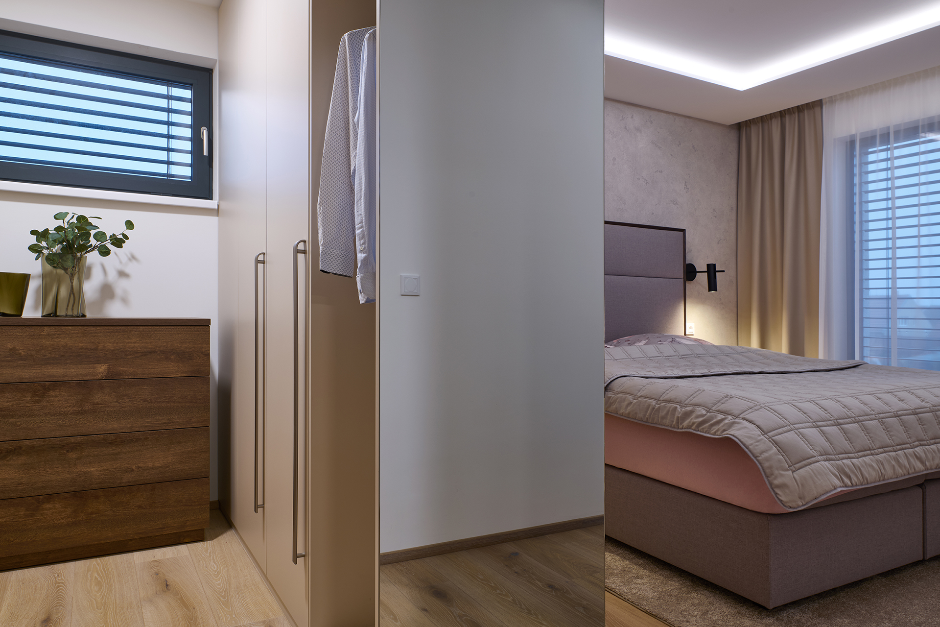 Das Schlafzimmer wird vom Bett LUTON mit furniertem Rahmen dominiert. Sein markantes, weich gepolstertes Kopfteil lädt auf den ersten Blick zum Entspannen ein und vermittelt ein Gefühl von Sicherheit und maximalem Komfort. An dieses zentrale Element schließt sich nahtlos der Kleiderschrank OPTIMA an. Den gemütlichen Charakter des Raumes vervollständigen Akustikpaneele, die neben ihrer dekorativen Wirkung auch zu einem besseren Klangkomfort beitragen.