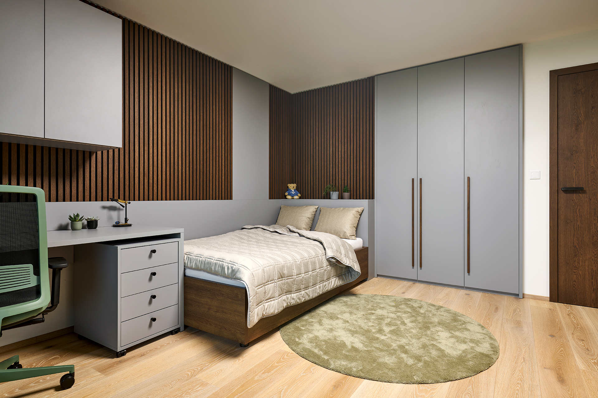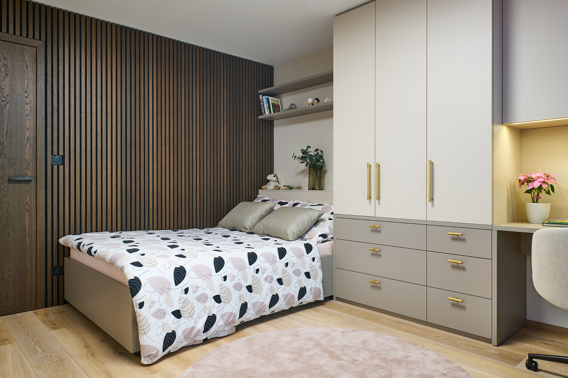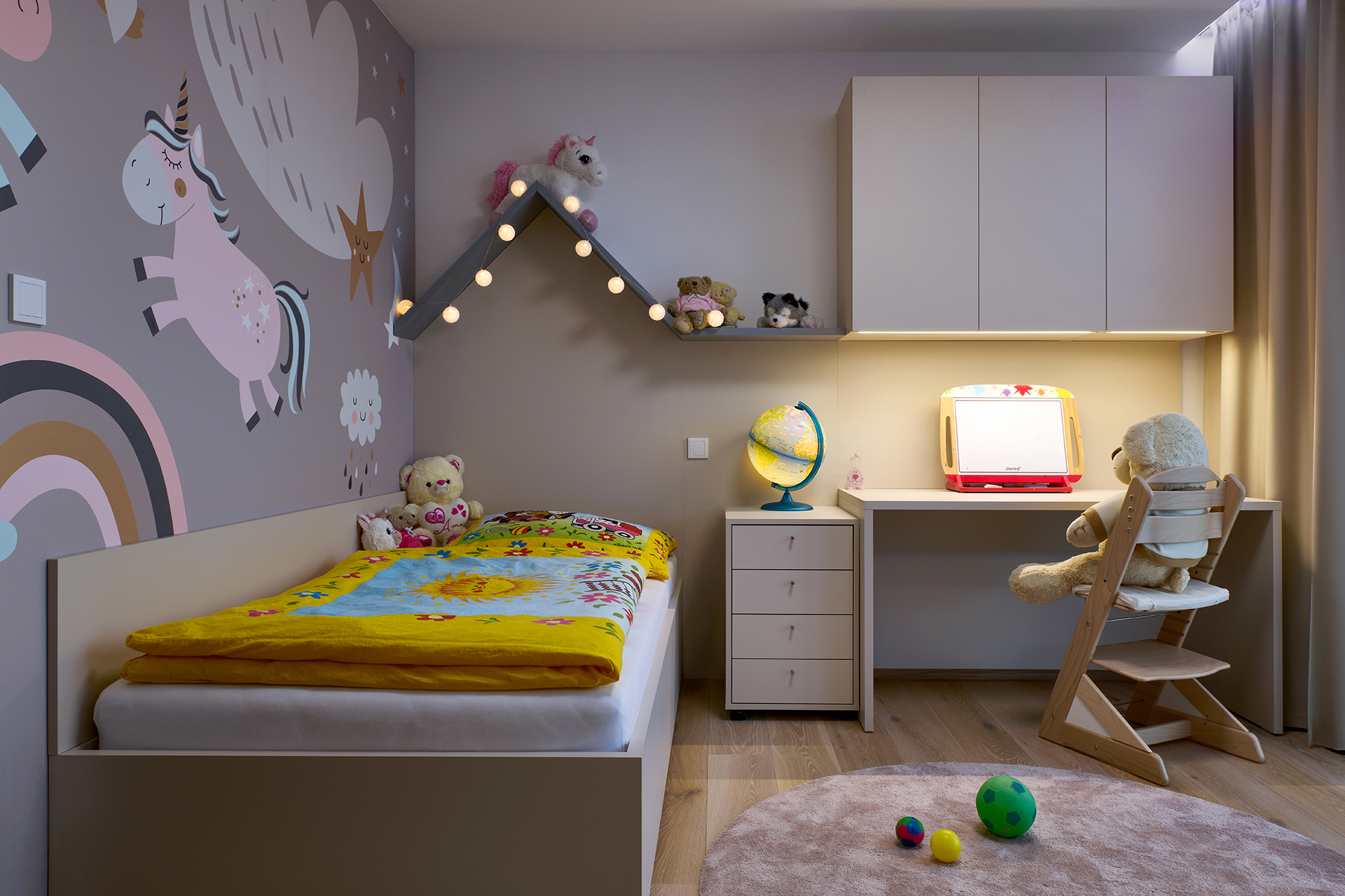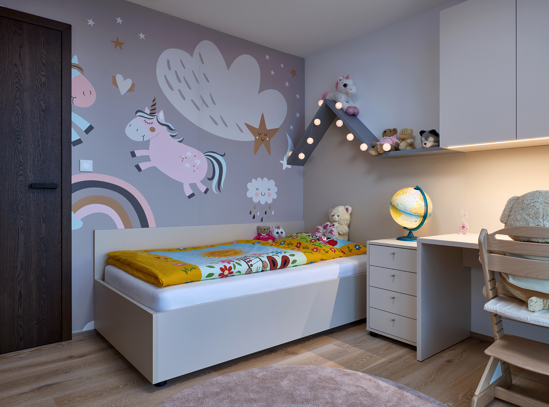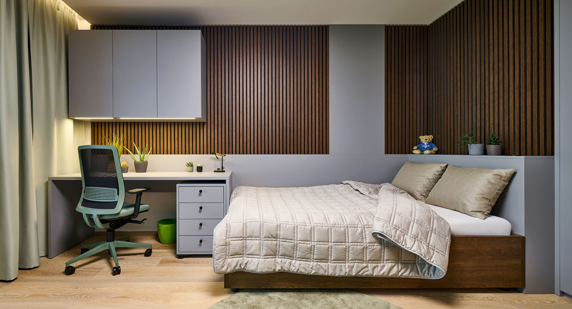 Die Kinderzimmer folgen einer einheitlichen Linie durch helle Laminate in Kombination mit natürlichen Dekoren. Die integrierte LED-Beleuchtung über den Arbeitsflächen sorgt für eine komfortable und angenehme Umgebung zum Lernen und für die Freizeit.