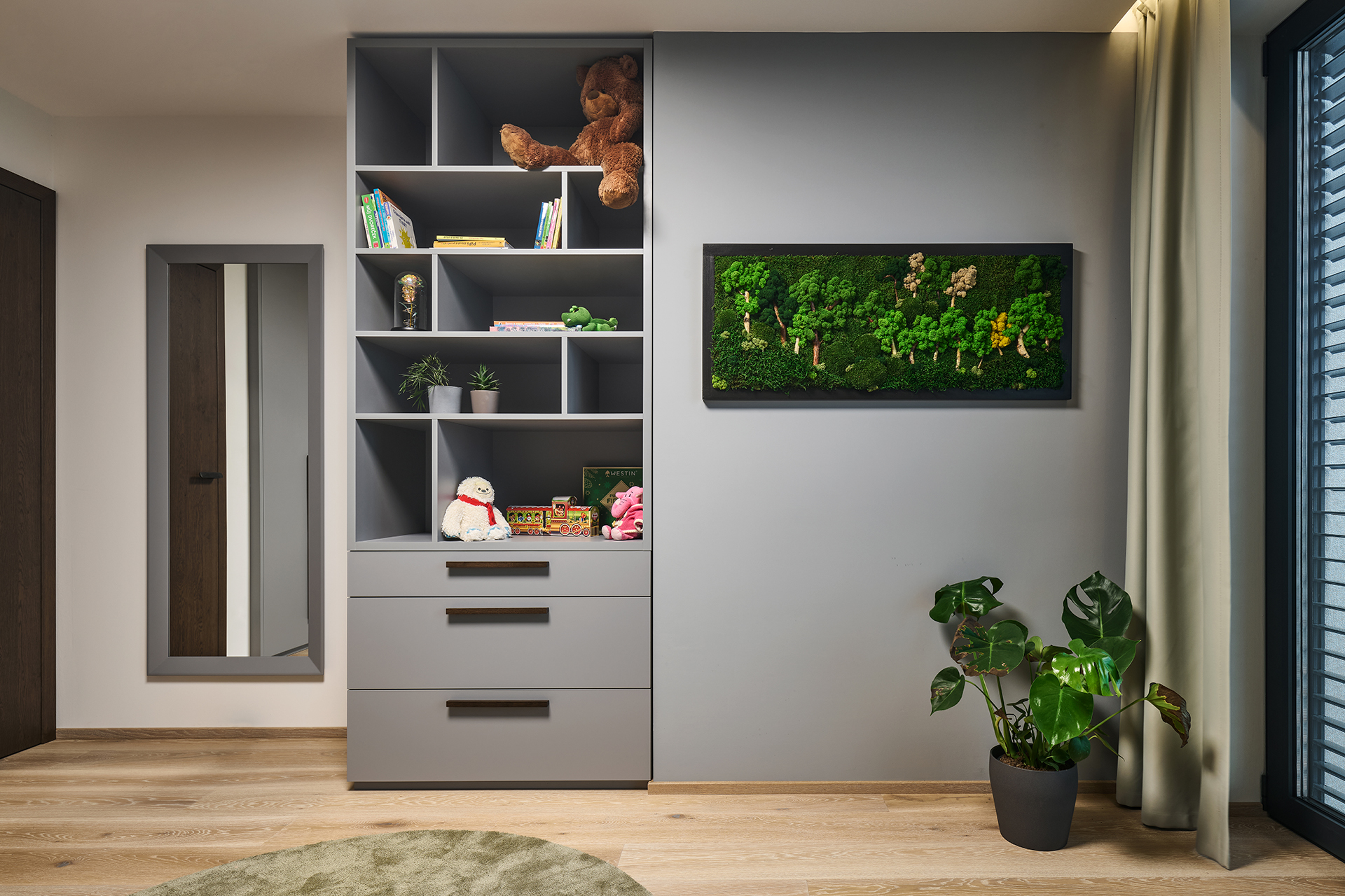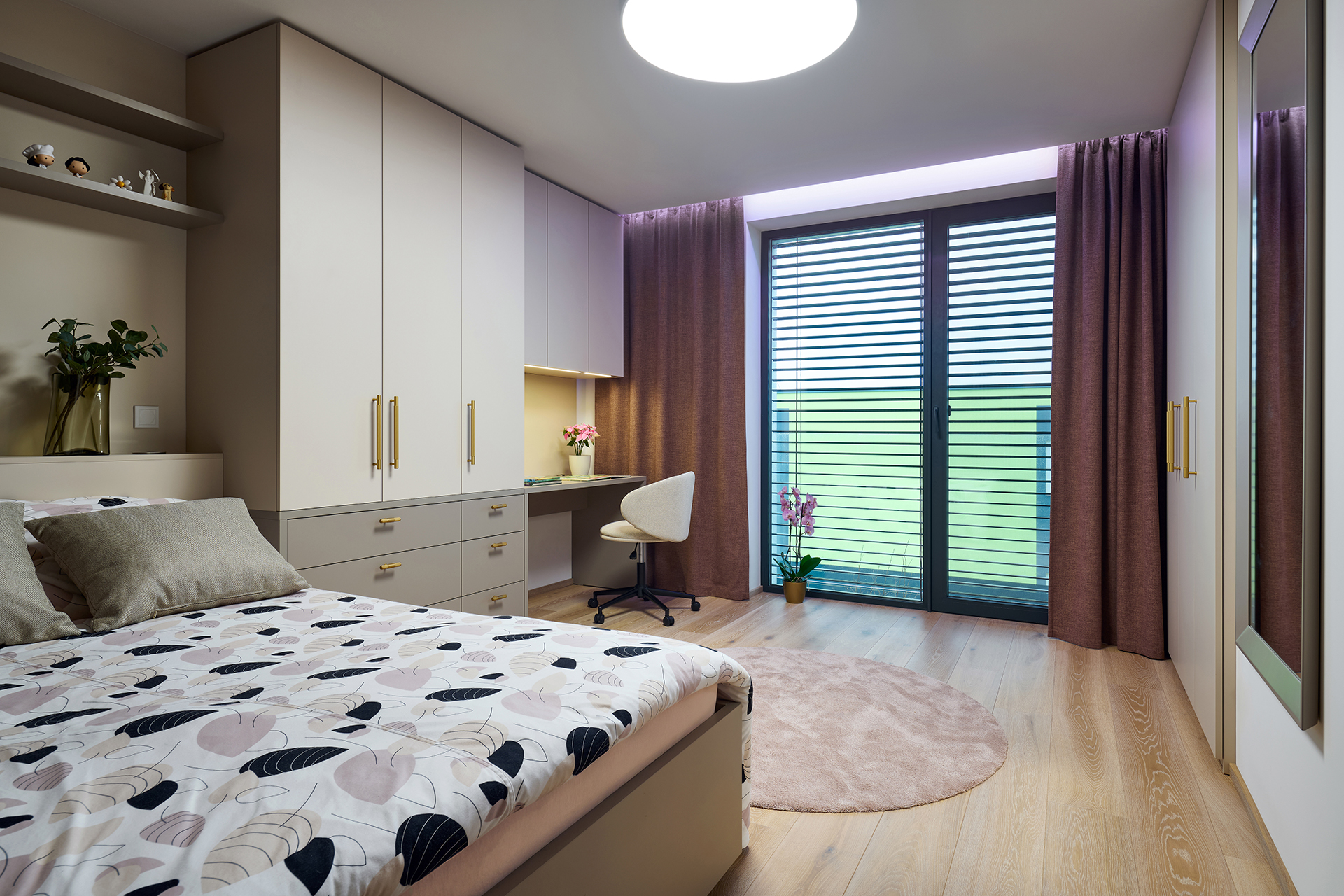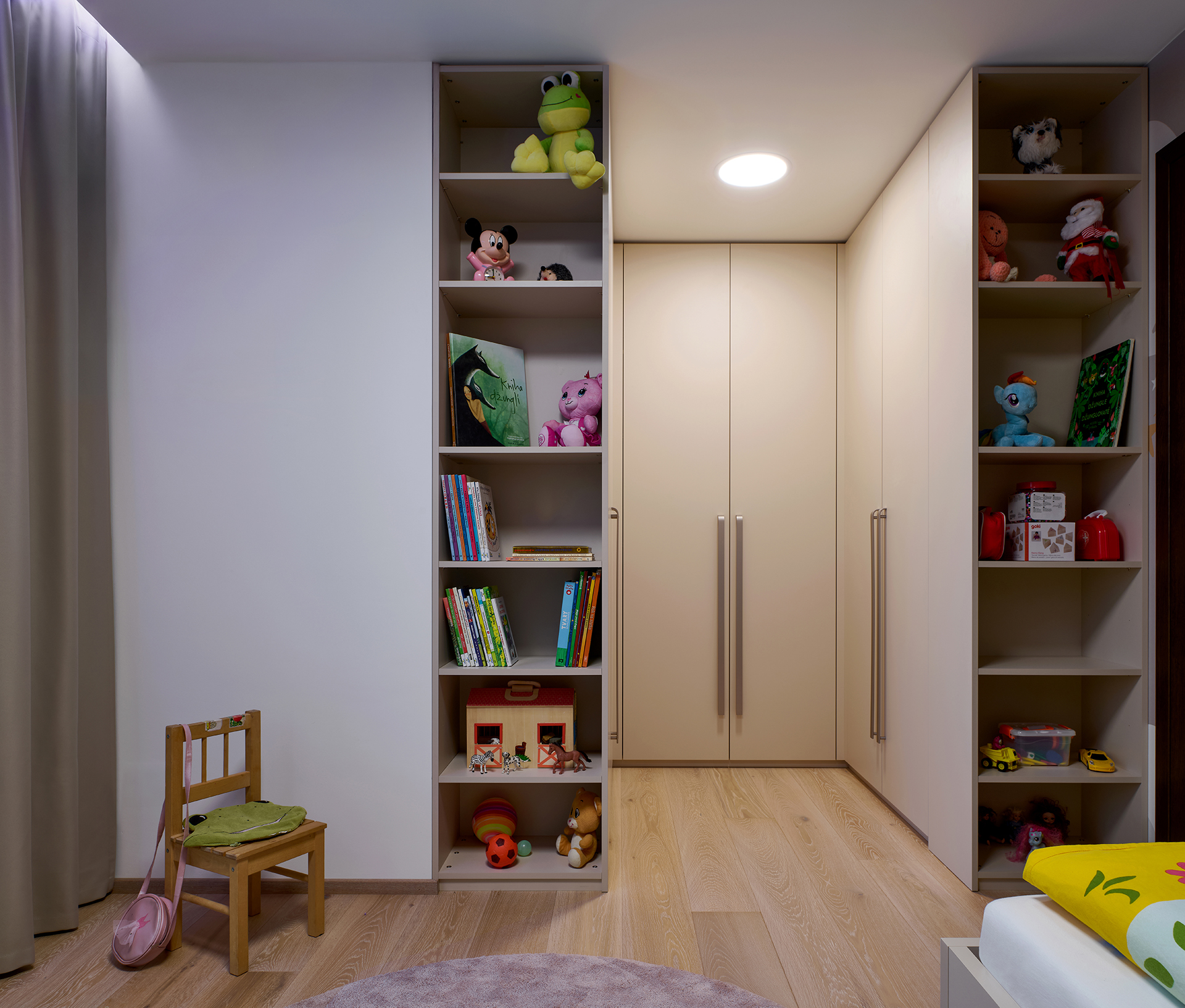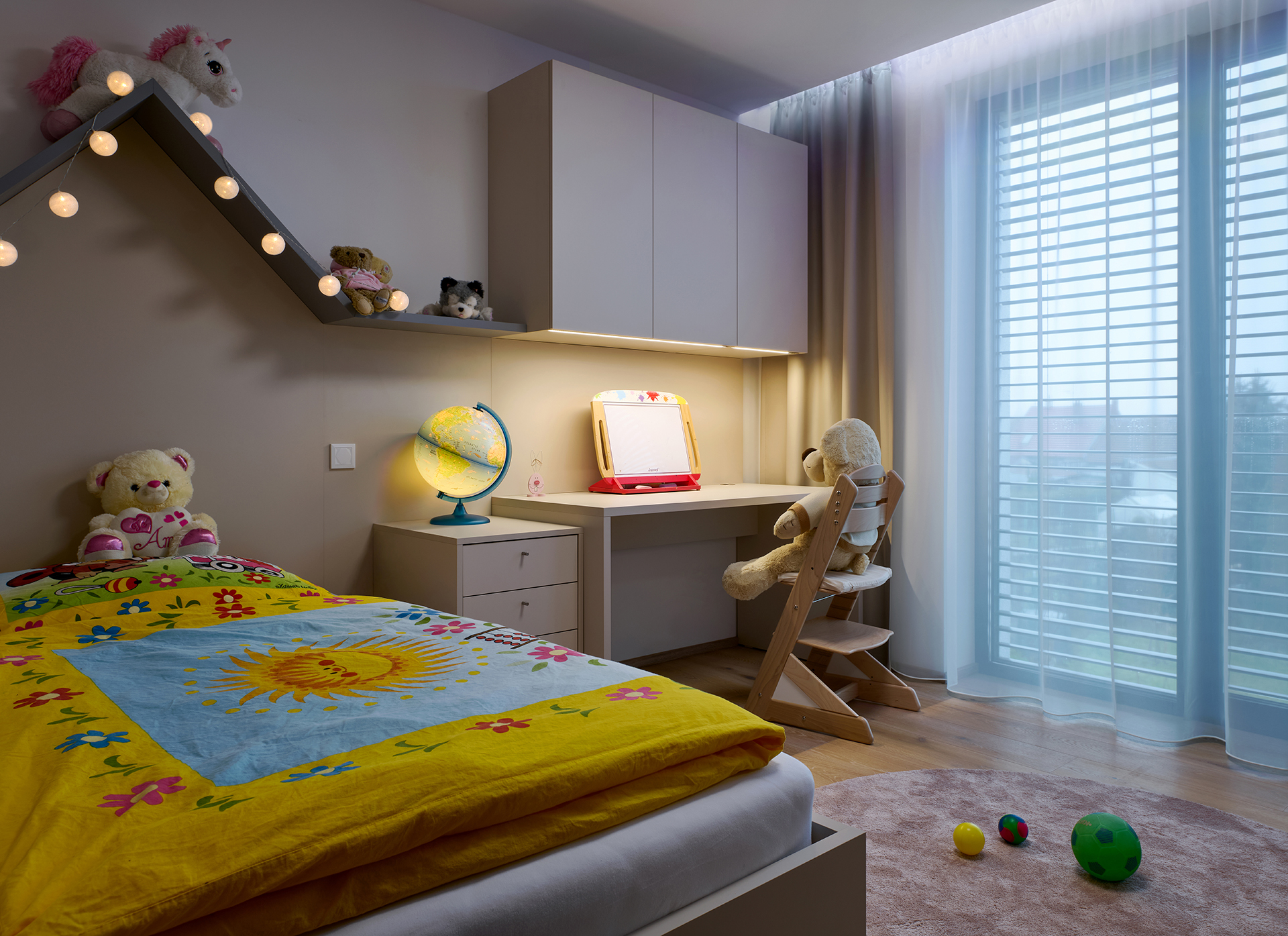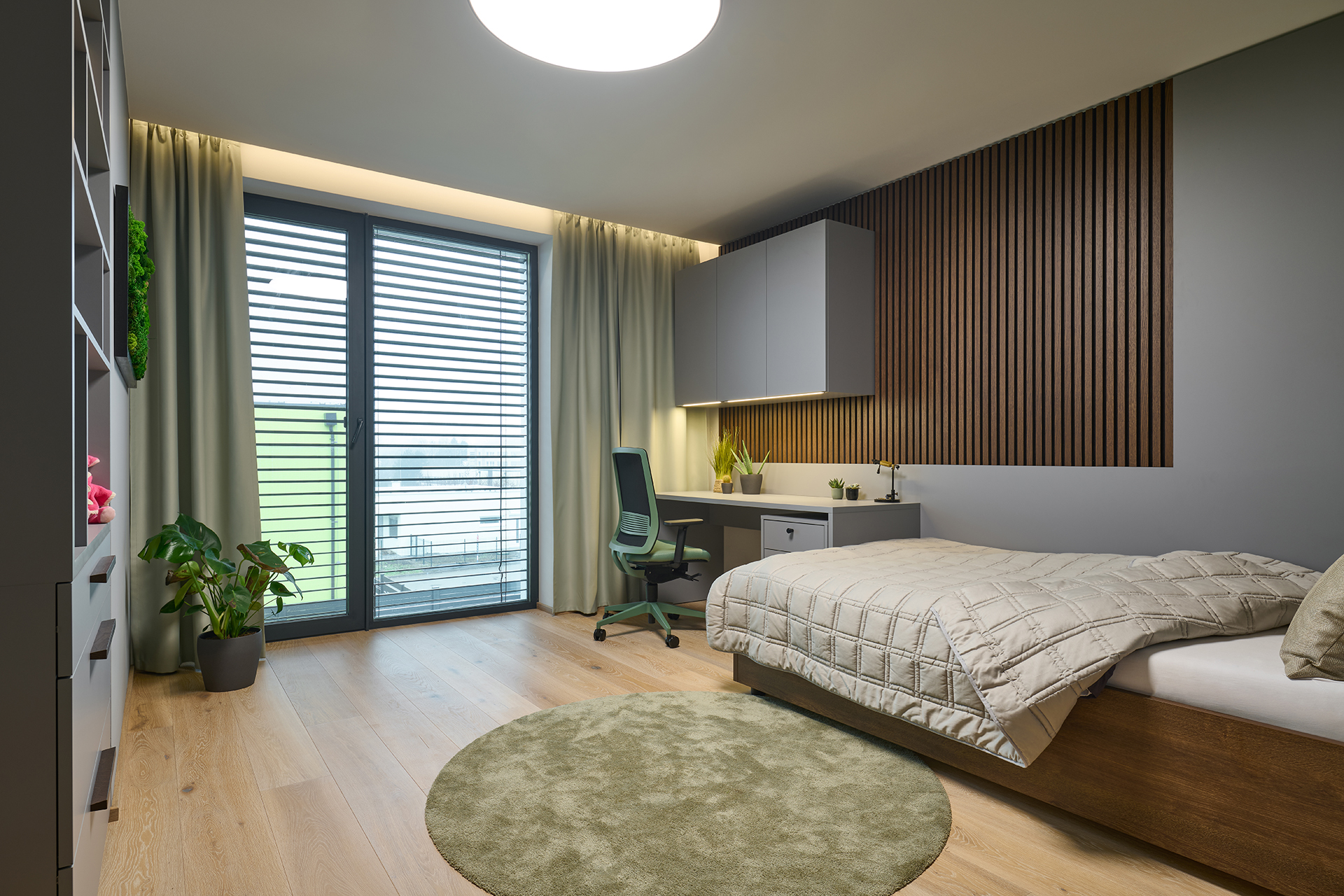 Die Kinderzimmer folgen einer einheitlichen Linie durch helle Laminate in Kombination mit natürlichen Dekoren. Die integrierte LED-Beleuchtung über den Arbeitsflächen sorgt für eine komfortable und angenehme Umgebung zum Lernen und für die Freizeit.