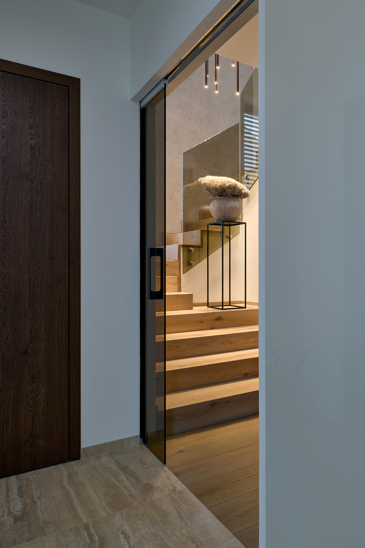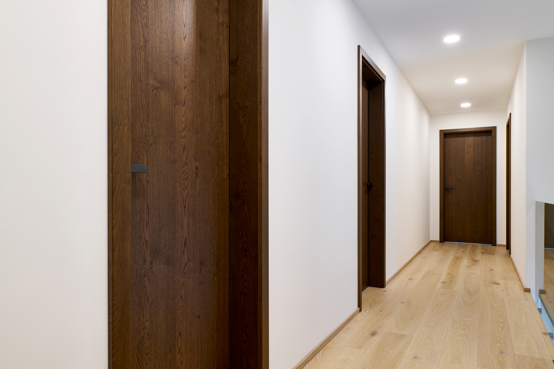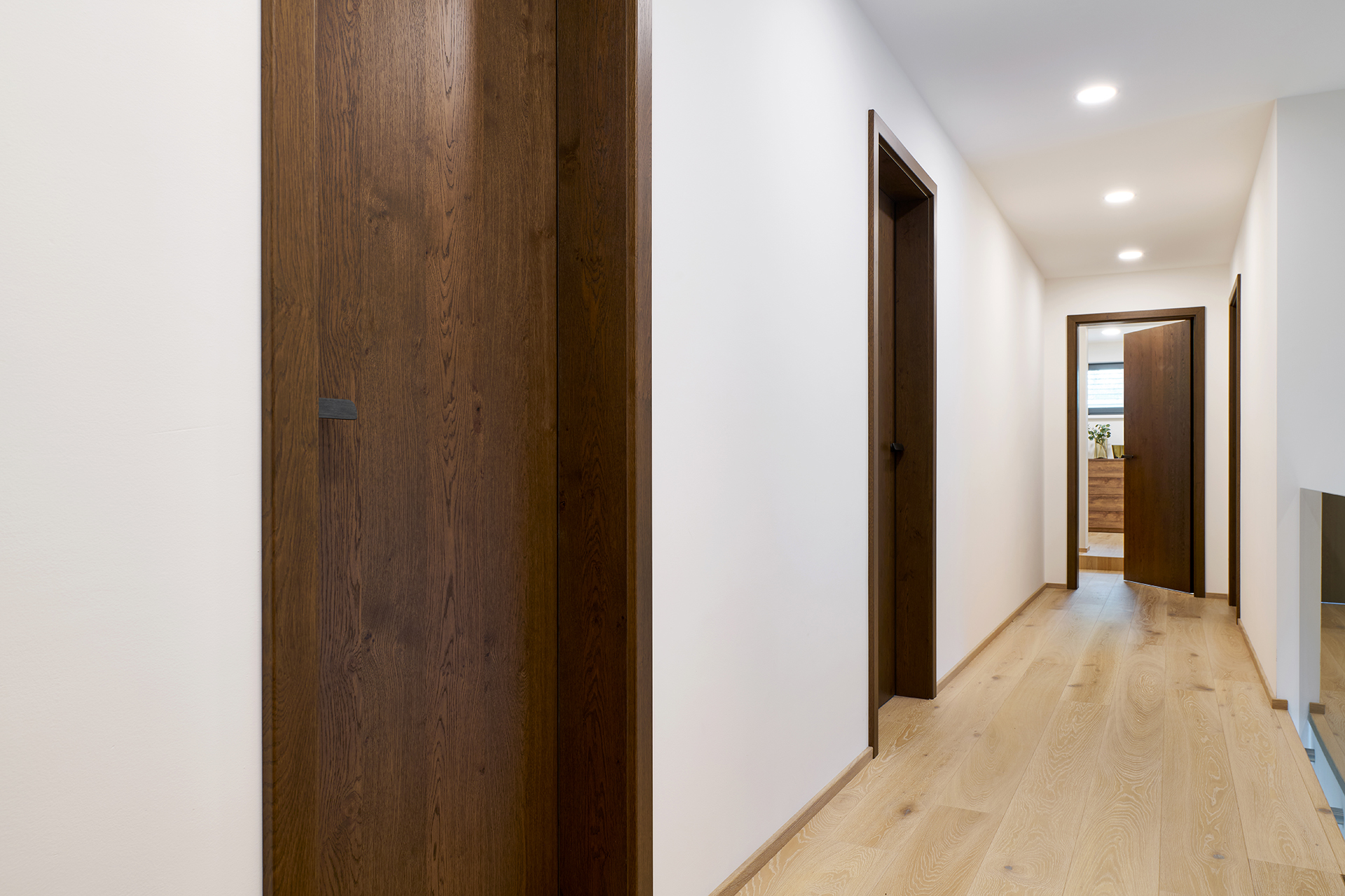 Auch die Innentüren spielen eine wichtige Rolle. In den repräsentativen Bereichen des Hauses wurden Türen mit SPACE-Verkleidung gewählt, während die anderen Räume mit den Varianten MILLENIUM LITE und SPACE LITE ergänzt wurden. Die Übergänge zwischen den einzelnen Räumen wirken so natürlich, klar und ungestört.