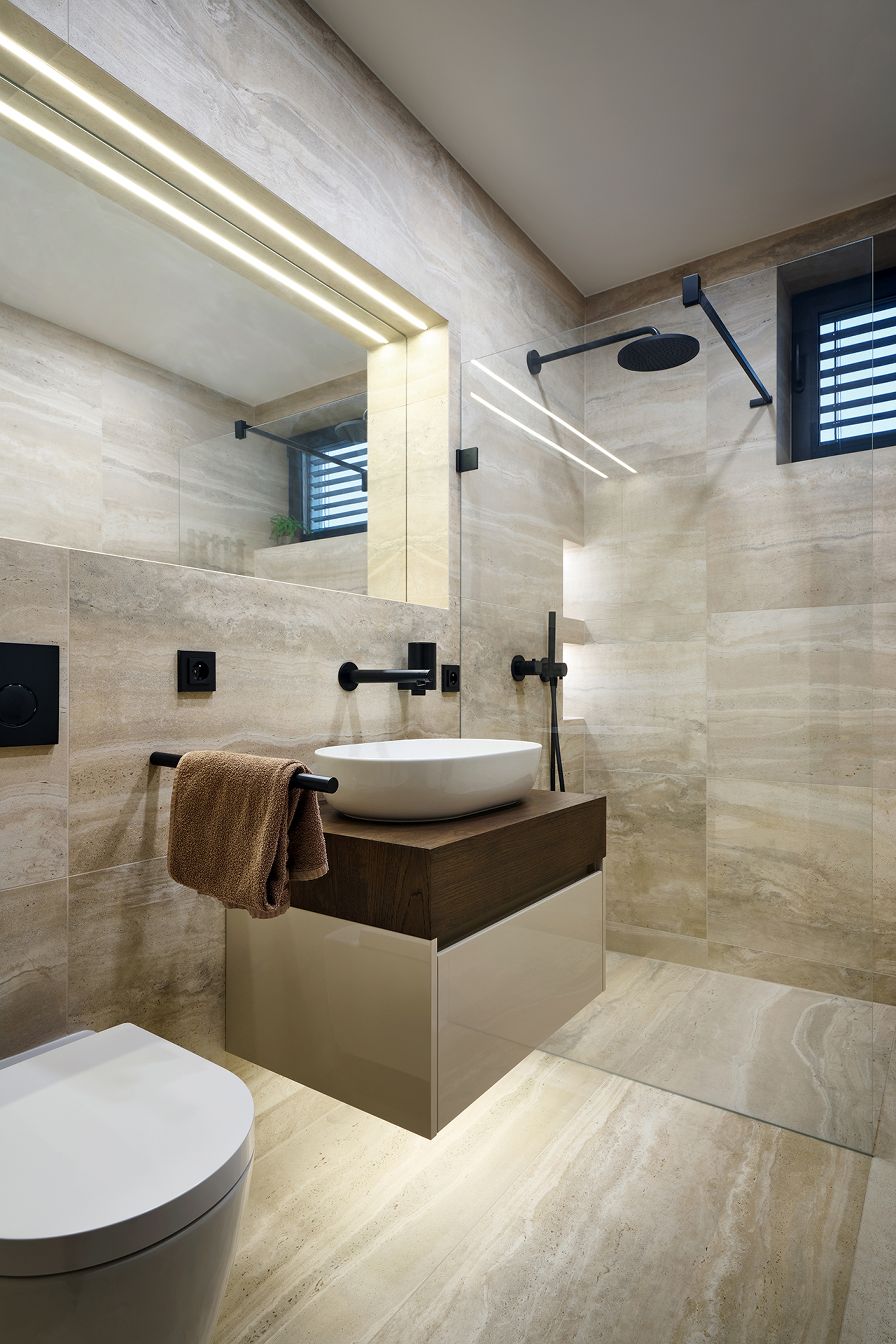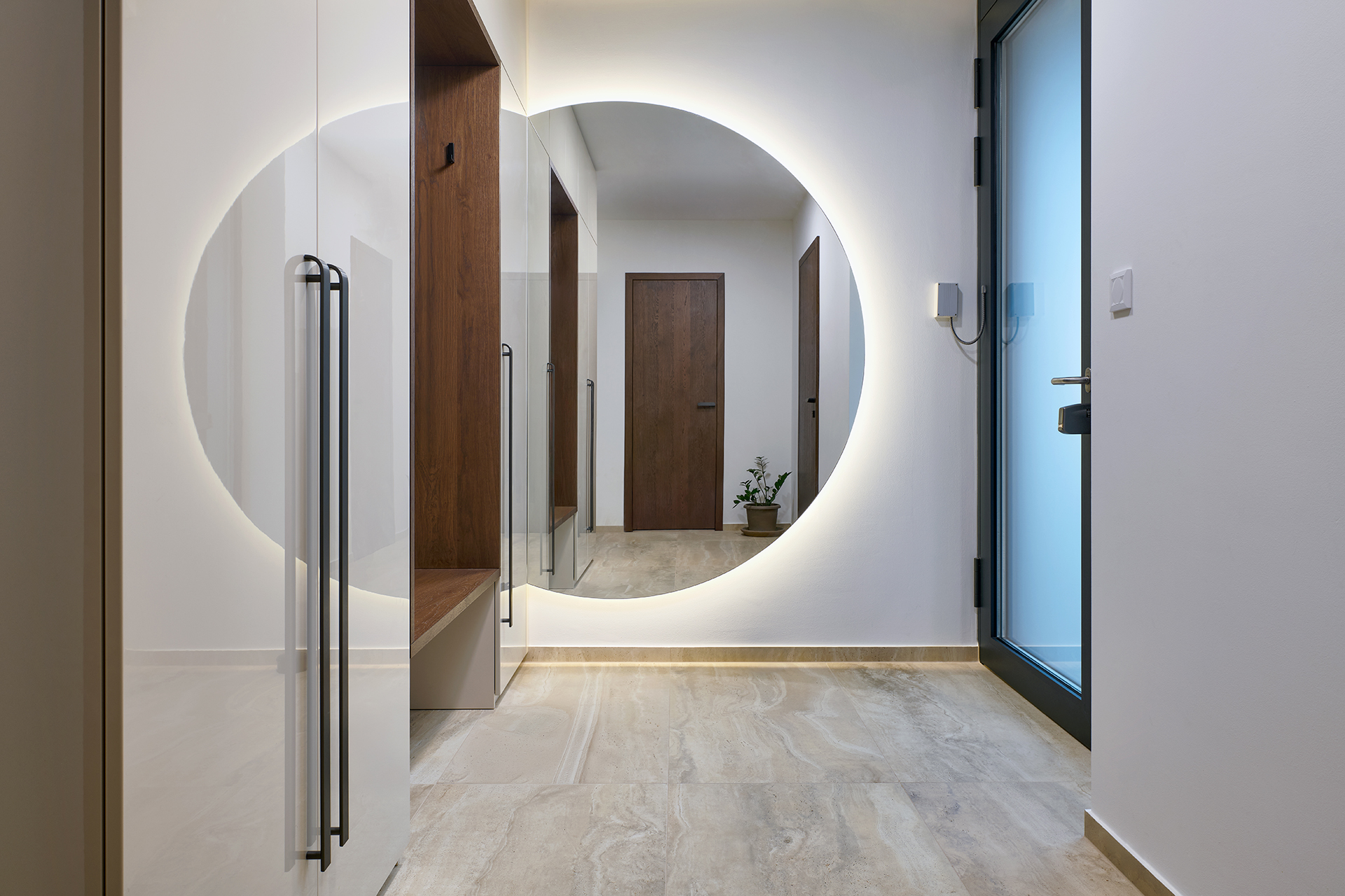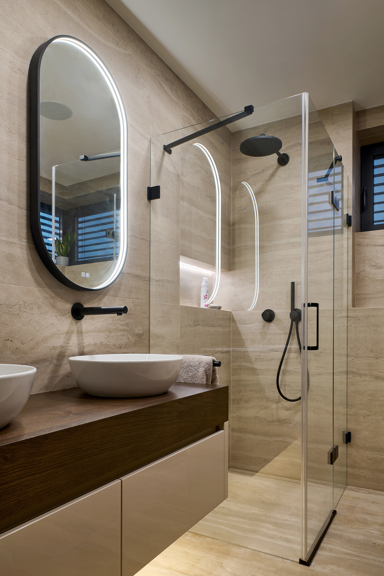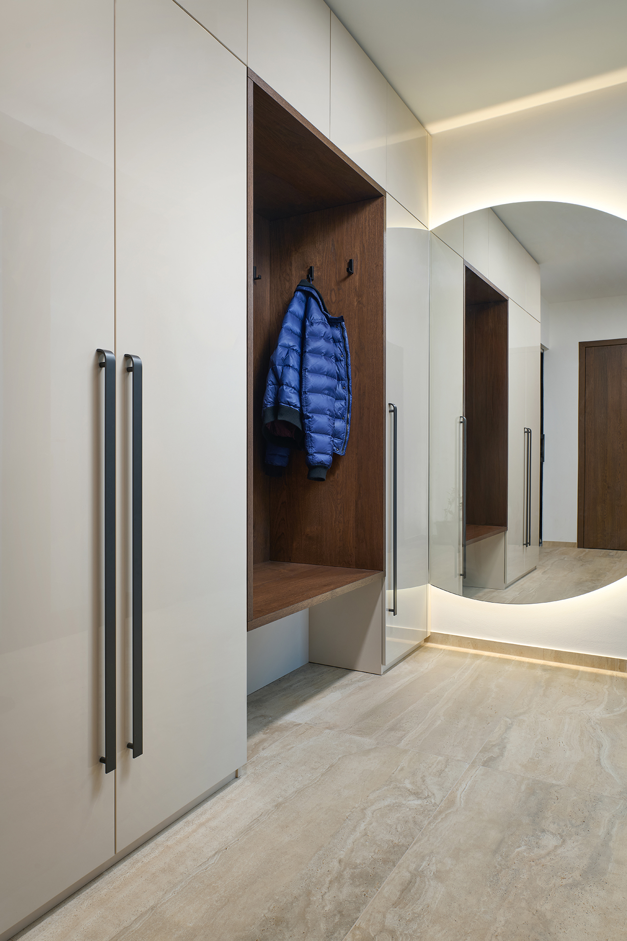 Die Badezimmer runden das Gesamtkonzept mit einer harmonischen Kombination aus glänzenden Oberflächen und Eichenholzplatten unter den Waschbecken ab. Die präzise Verarbeitung der Aufbewahrungssysteme und die ausgeklügelten Öffnungsprofile unterstreichen die Liebe zum Detail, die Funktionalität und die hohe Verarbeitungsqualität.