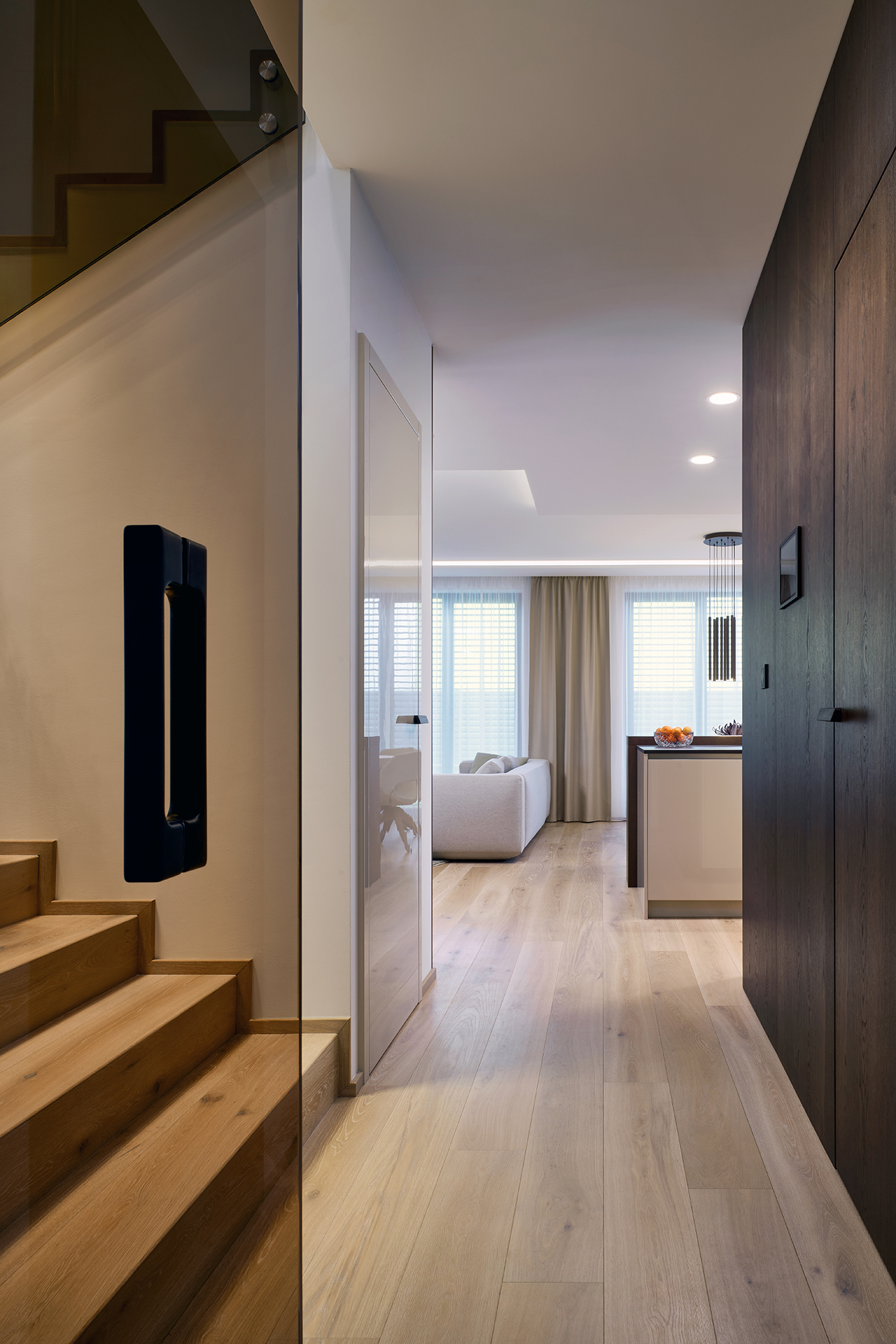 Bei der Gestaltung dieses Einfamilienhauses war die Hauptidee die visuelle Verbindung aller Teile des Innenraums zu einem einheitlichen und harmonischen Ganzen. Der gesamte Raum ist von einer beruhigenden Farbpalette in Champagnertönen durchzogen, die durch rustikales braunes Eichenfurnier natürlich ergänzt wird. Zusammen schaffen sie eine moderne und dennoch warme und angenehme Umgebung für den Alltag.