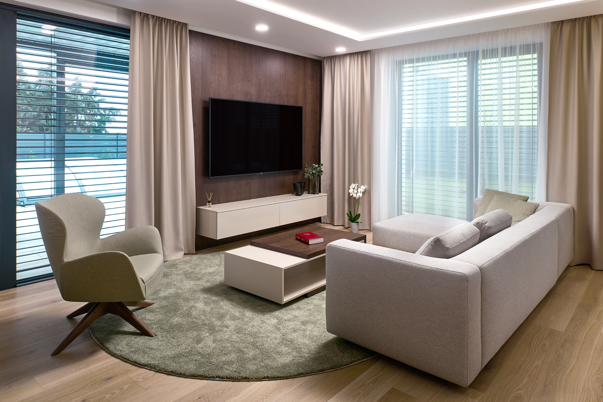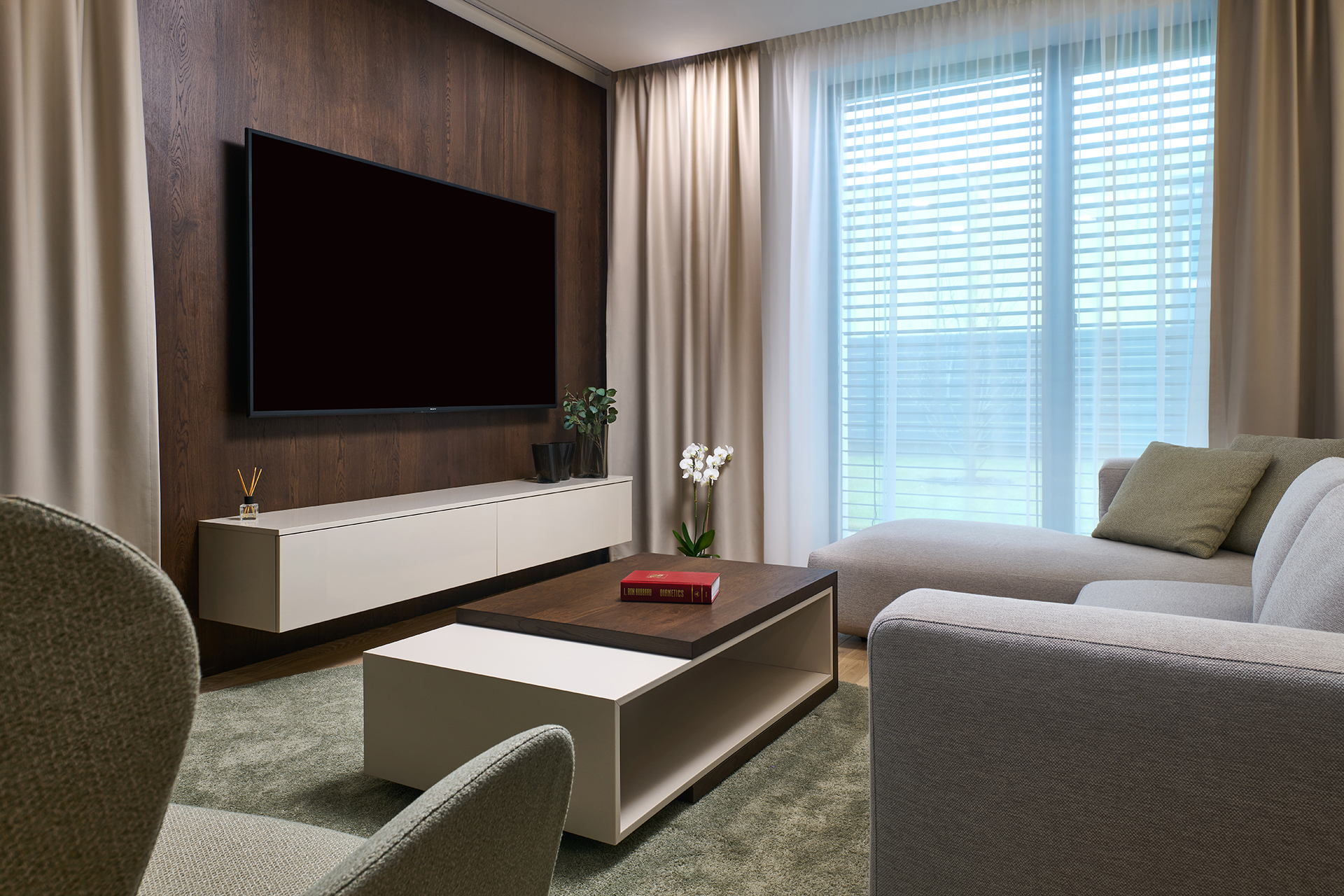 Das Wohnzimmer setzt den gleichen Designstil fort. Das Sofa POLYGON und der Sessel MIDI bieten einen bequemen Rückzugsort für die tägliche Entspannung, während der Couchtisch KS43 in matt lackierter Ausführung zur visuellen Vereinheitlichung des Interieurs beiträgt.