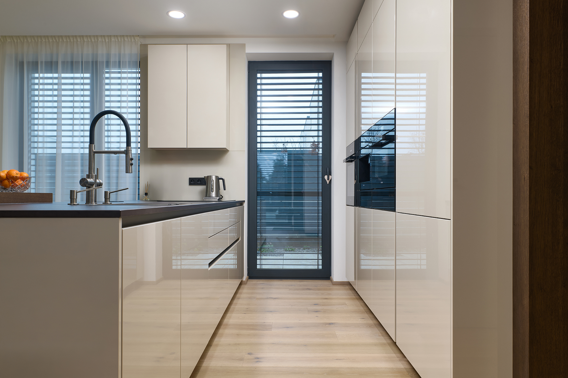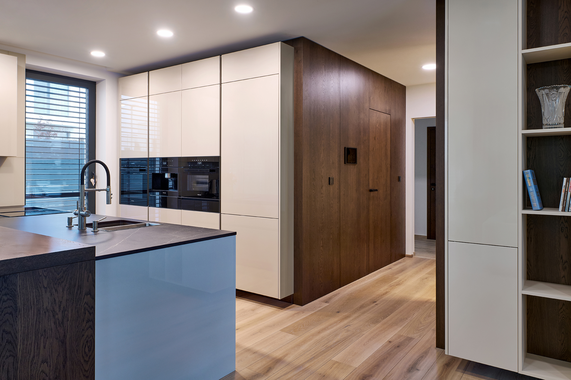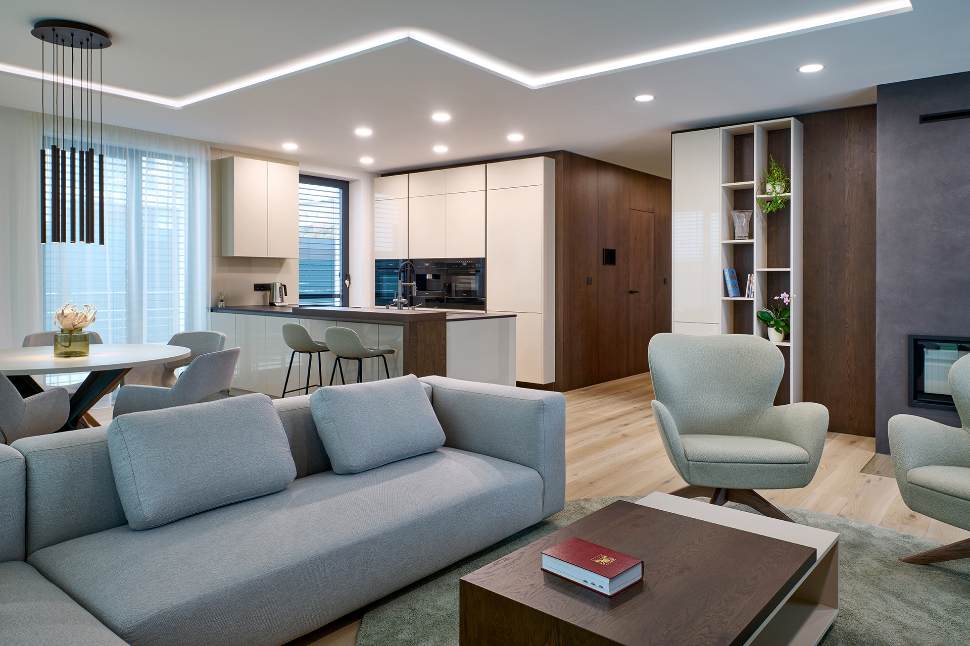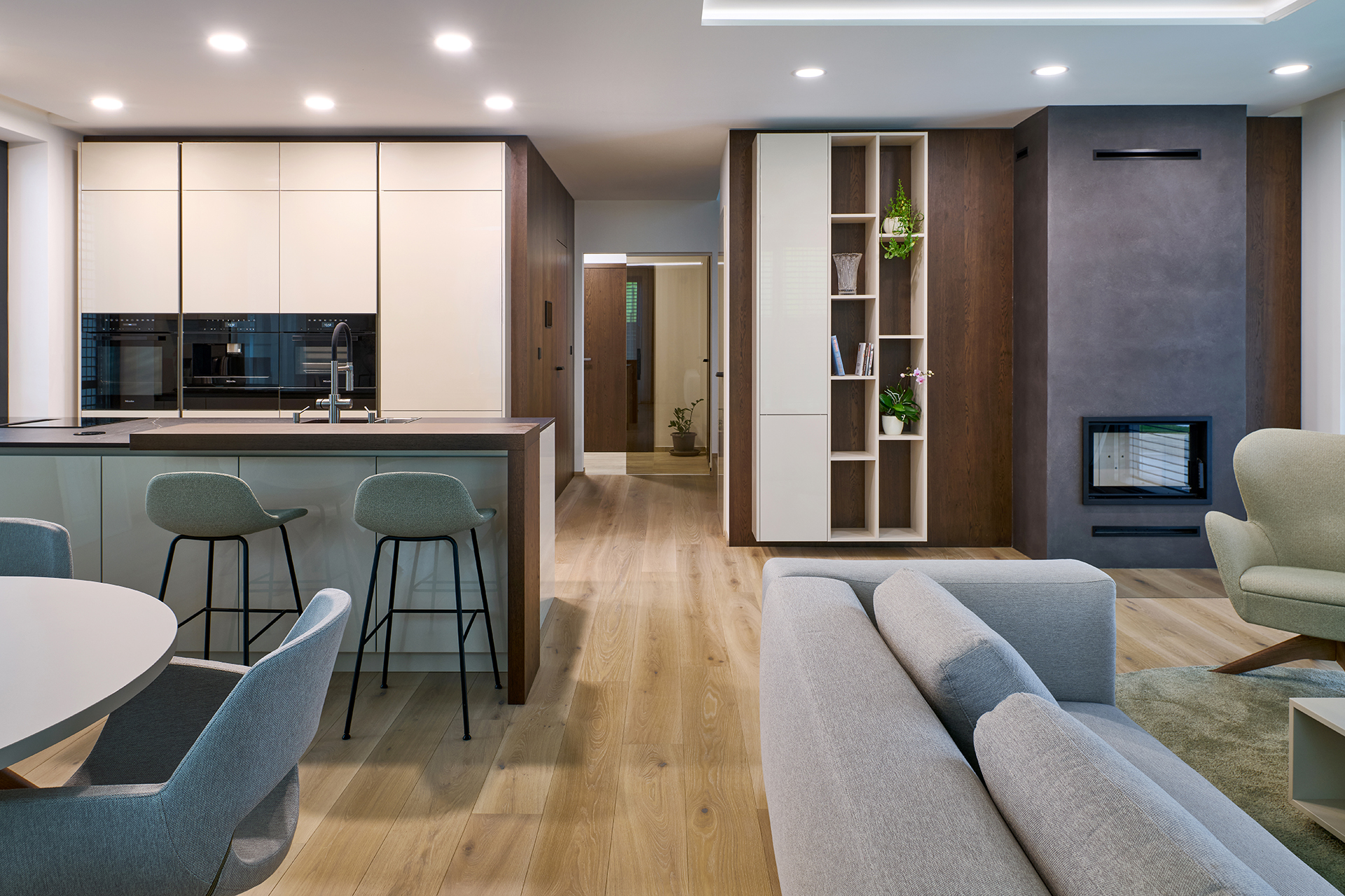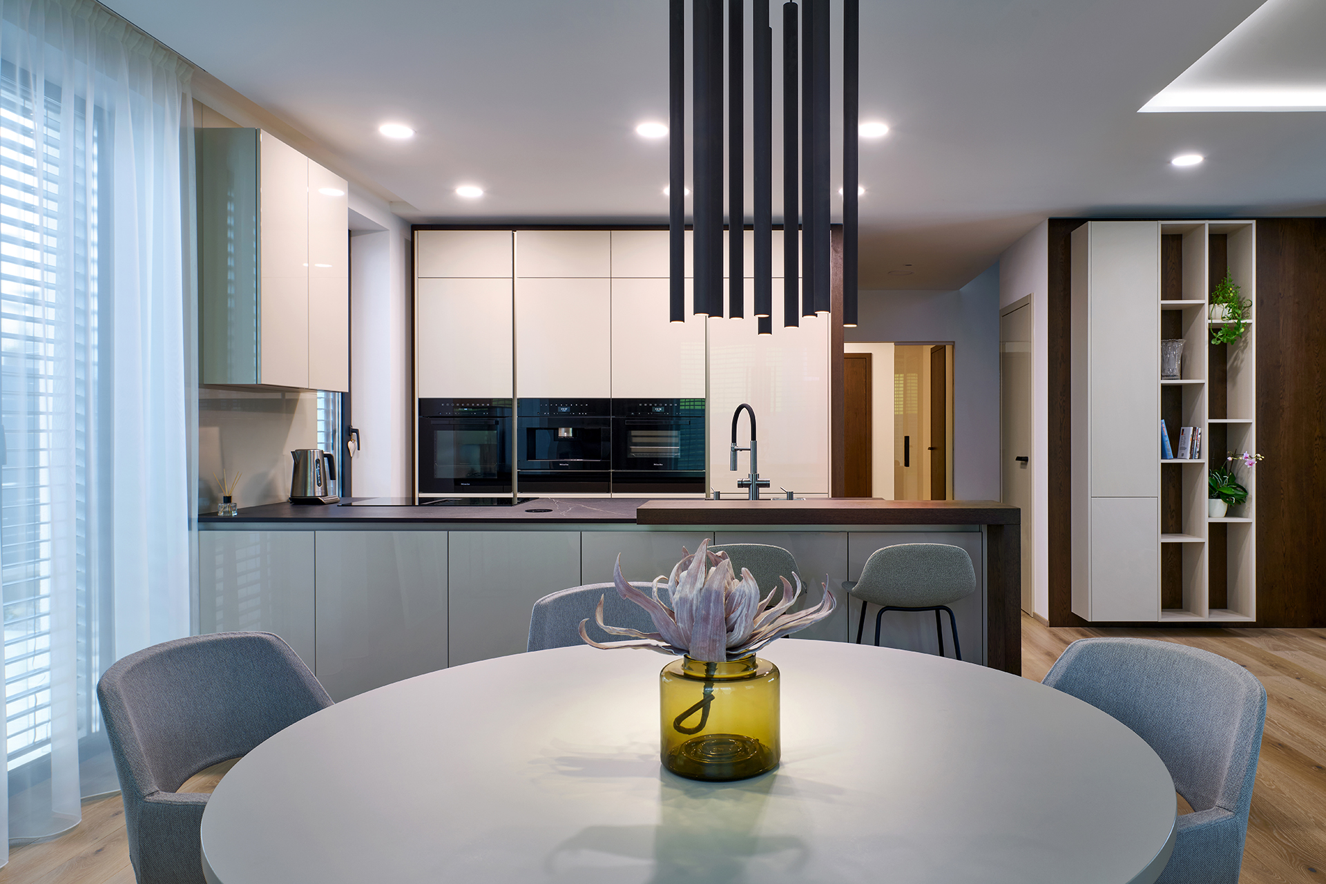 Die Hauptrolle spielt die Küche ELITE in glänzender Lackausführung, ergänzt durch Elemente aus Naturholz. Die Arbeitsfläche aus Dekton Kelya bietet eine hohe Widerstandsfähigkeit und eine ausgeprägte Tiefe der Maserung. Die Premium-Ausstattung wird durch Geräte von Miele unterstrichen. An die Küche schließt sich nahtlos der Essbereich mit einem runden Tisch an, ergänzt durch CARA OPEN-Esszimmerstühle und MEGAN MINI-Barhocker, die Kochen und Essen elegant miteinander verbinden.