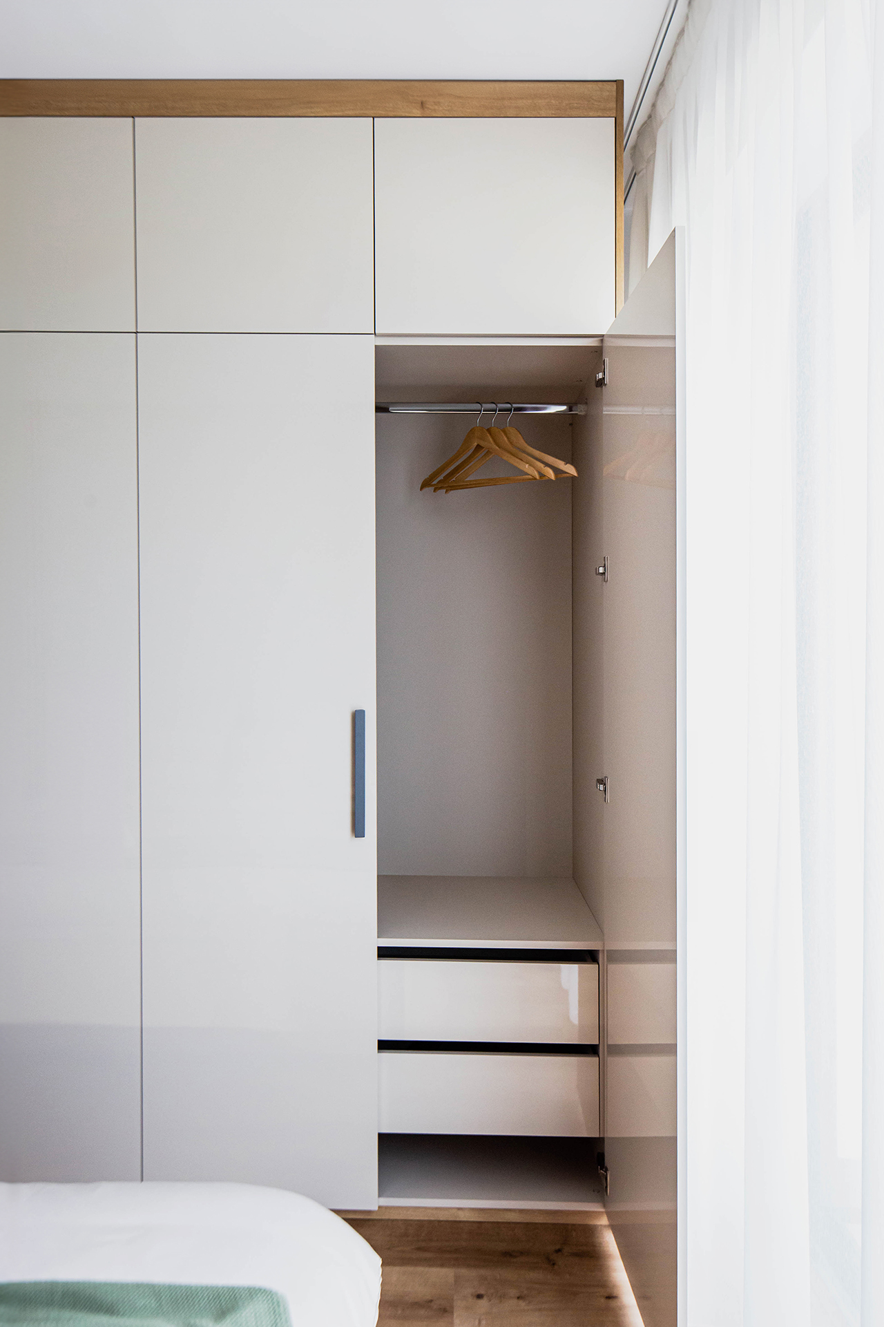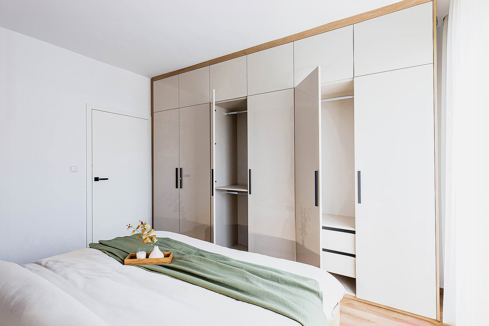 Dominant ist der Kleiderschrank OPTIMA in glänzendem Champagner, dessen glatte Oberfläche das Tageslicht vom Balkonfenster reflektiert und den Raum optisch vergrößert. Im Kontrast zu den glänzenden Schränken steht das Bett in Eiche Rustikal Natur, das dem Raum Gemütlichkeit und ein Gefühl von Stabilität verleiht.