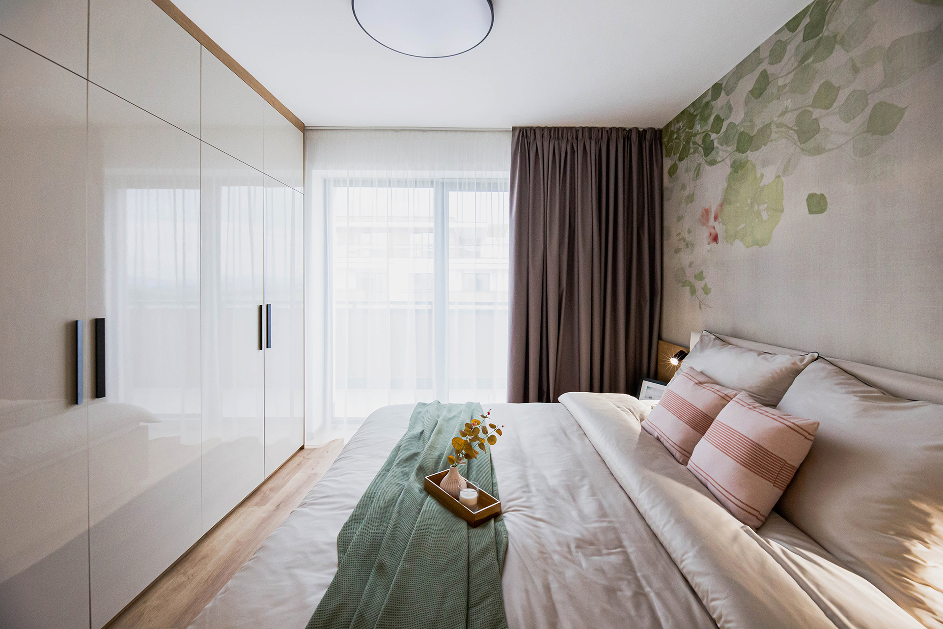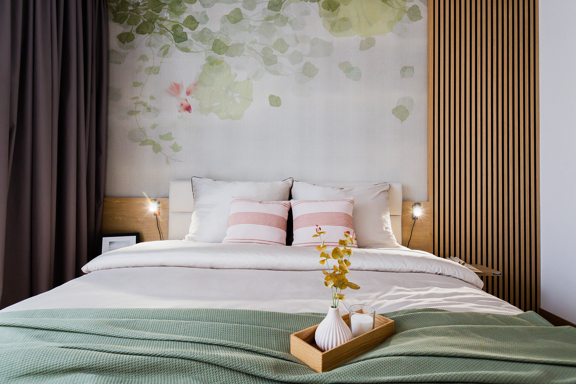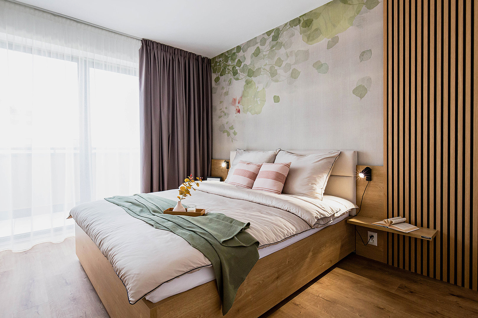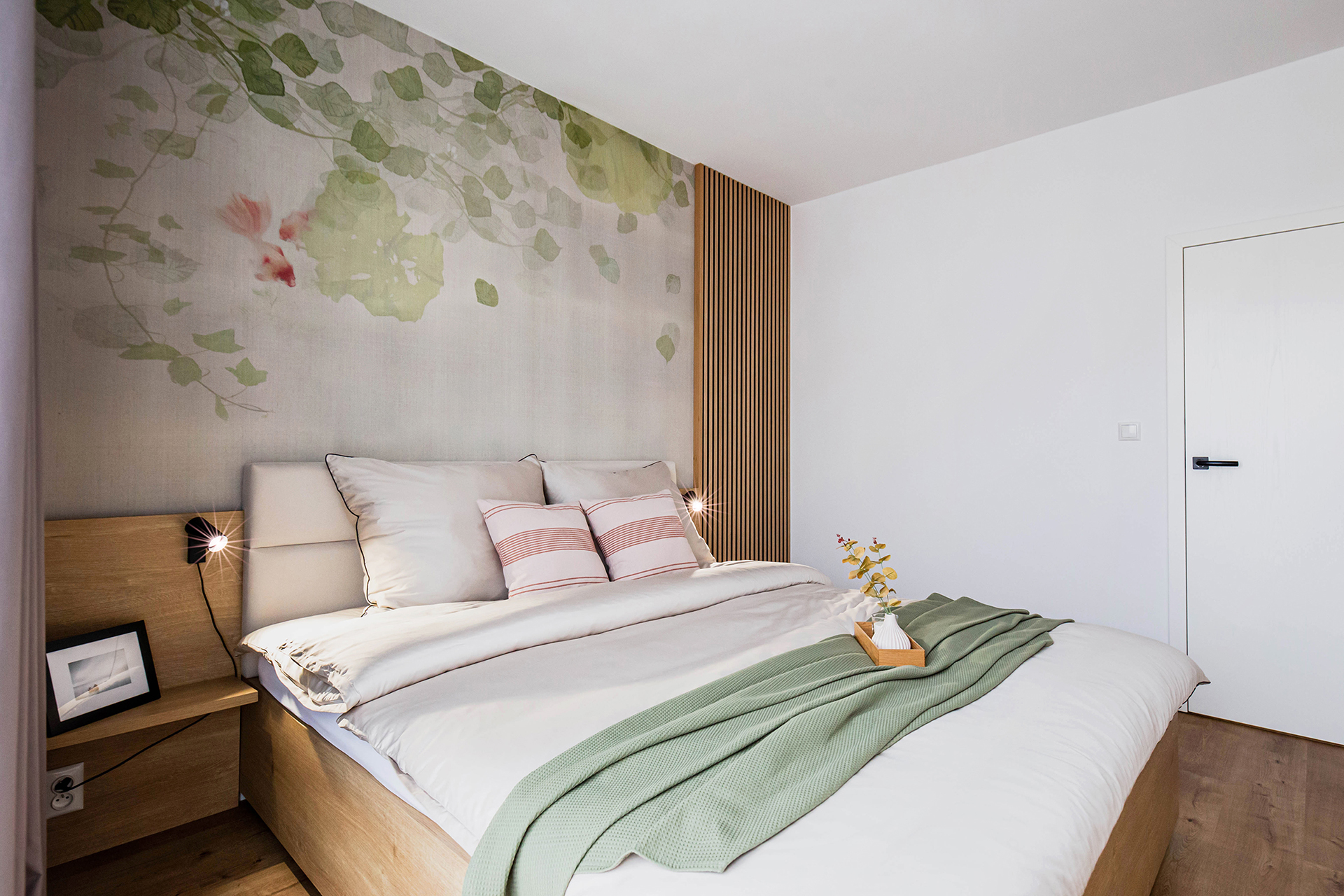 Die Wand hinter dem Bett wird durch eine zarte Blumentapete in gedämpften Grün- und Rosatönen belebt, die eine Verbindung zur Natur herstellt. Vertikale Holzlamellen verleihen dem Raum eine moderne Textur und Tiefe. Weiche Textilien runden die Atmosphäre ab – von dunklen Vorhängen, die für einen ruhigen Schlaf sorgen, bis hin zu einem frischen mintgrünen Überwurf.