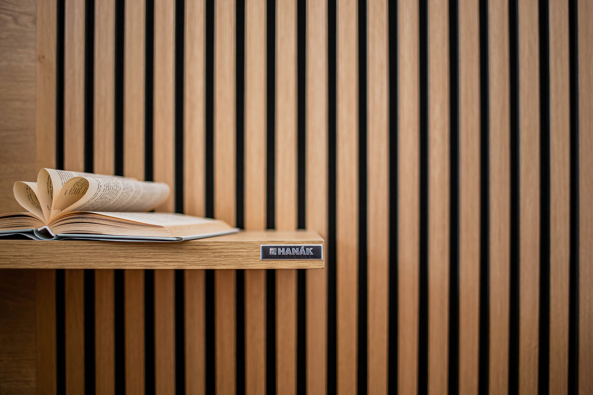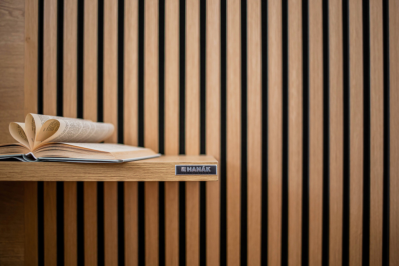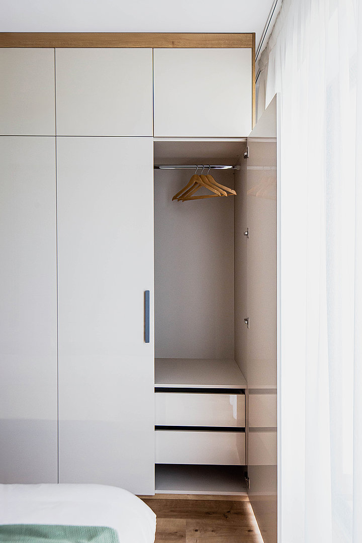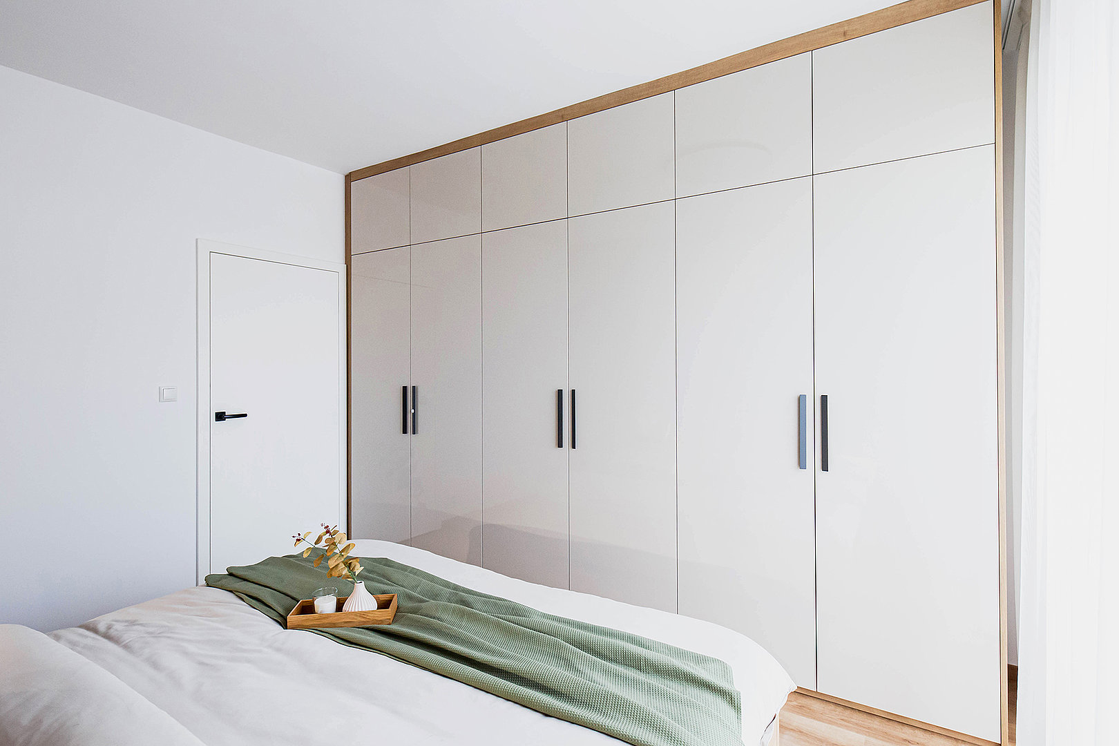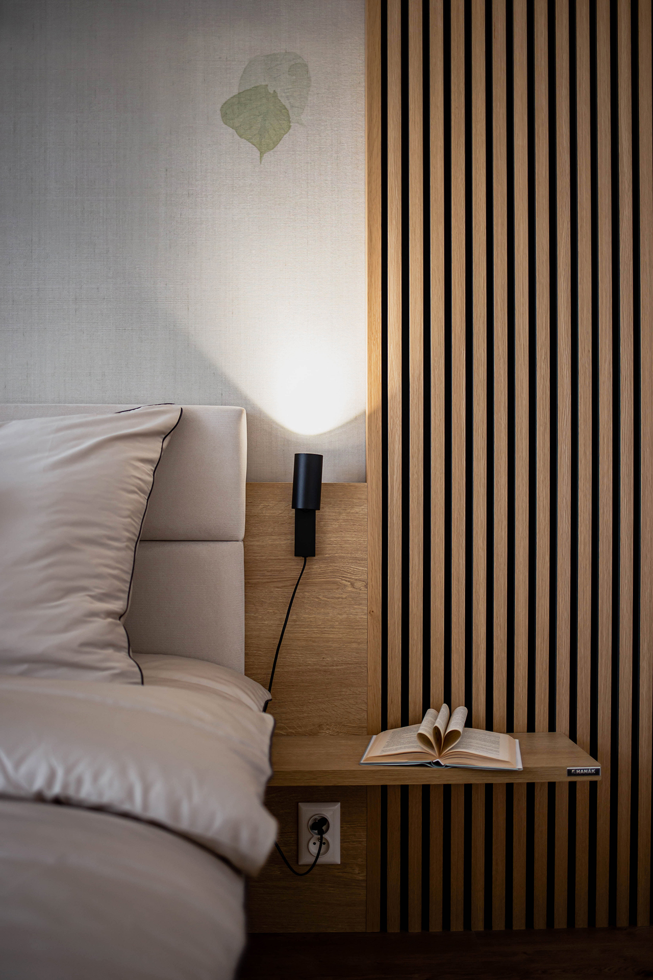 Die Wand hinter dem Bett wird durch eine zarte Blumentapete in gedämpften Grün- und Rosatönen belebt, die eine Verbindung zur Natur herstellt. Vertikale Holzlamellen verleihen dem Raum eine moderne Textur und Tiefe. Weiche Textilien runden die Atmosphäre ab – von dunklen Vorhängen, die für einen ruhigen Schlaf sorgen, bis hin zu einem frischen mintgrünen Überwurf.