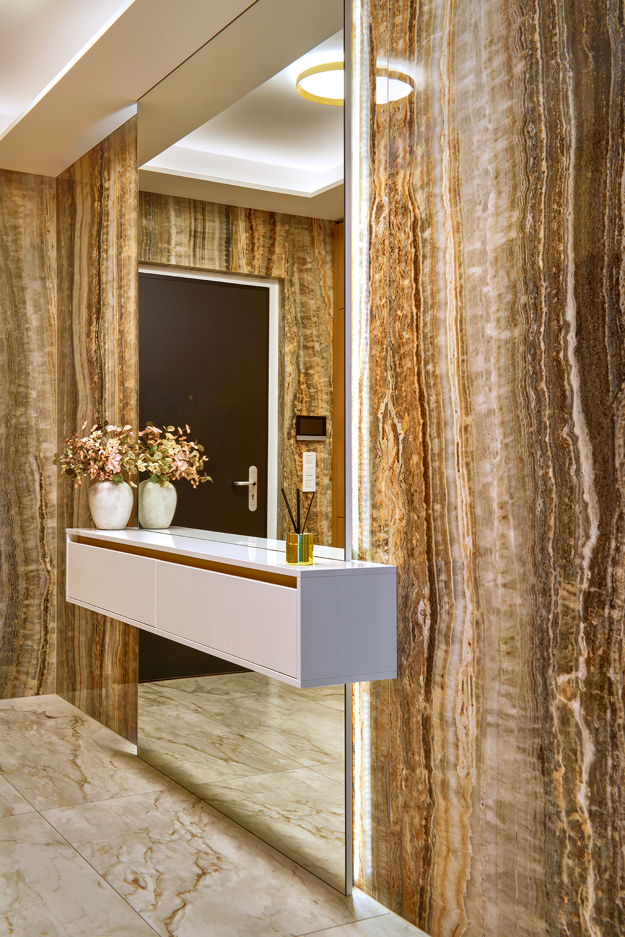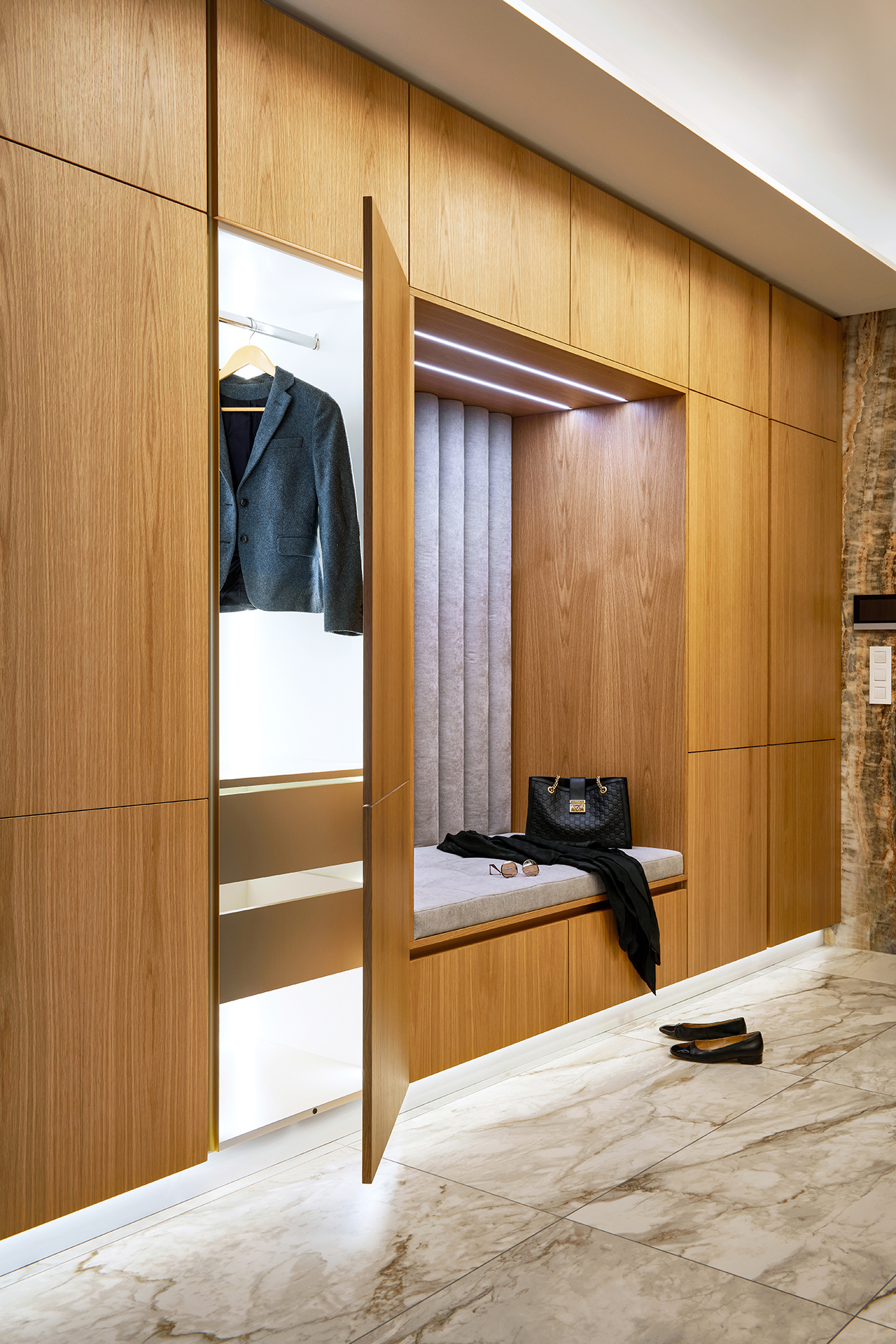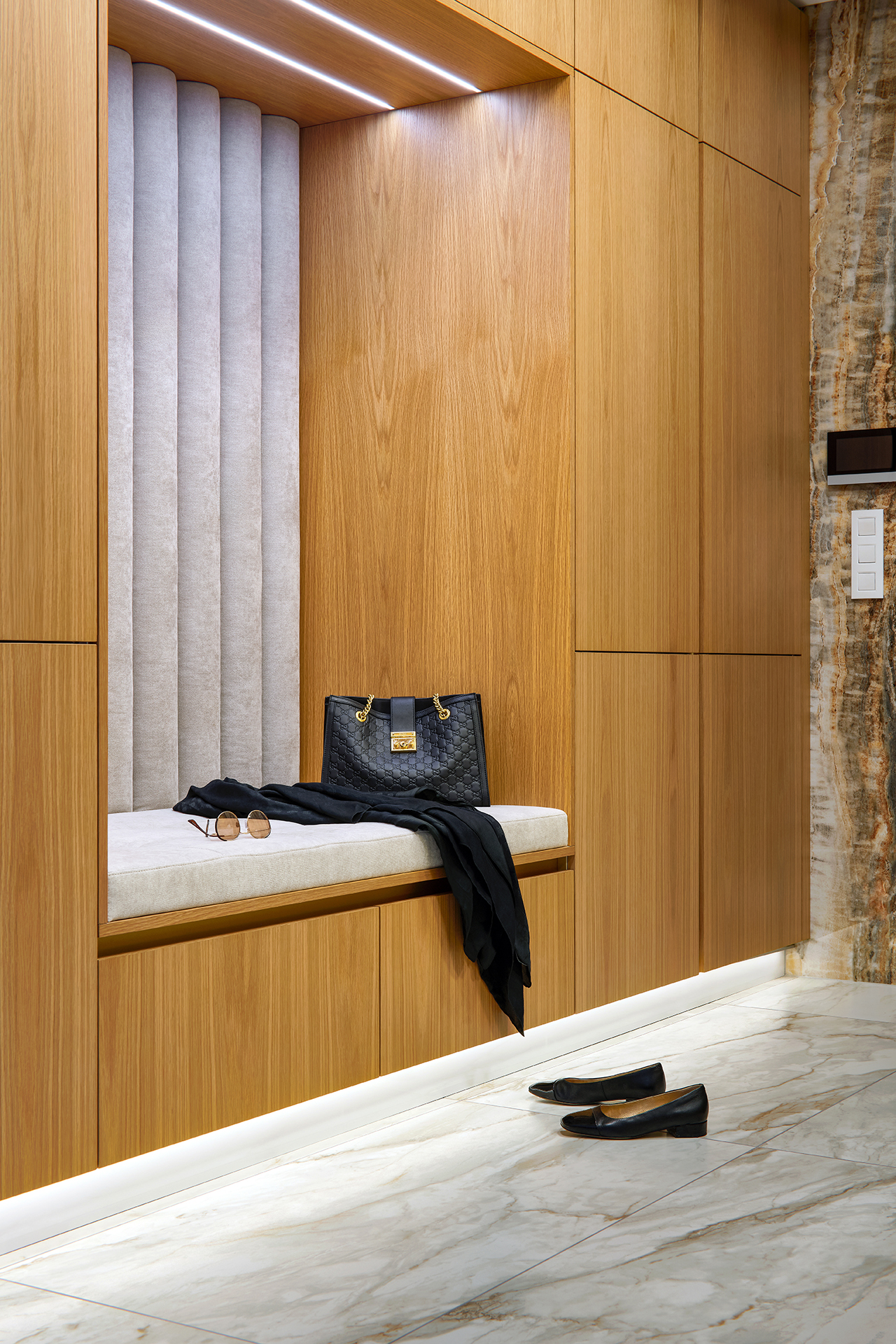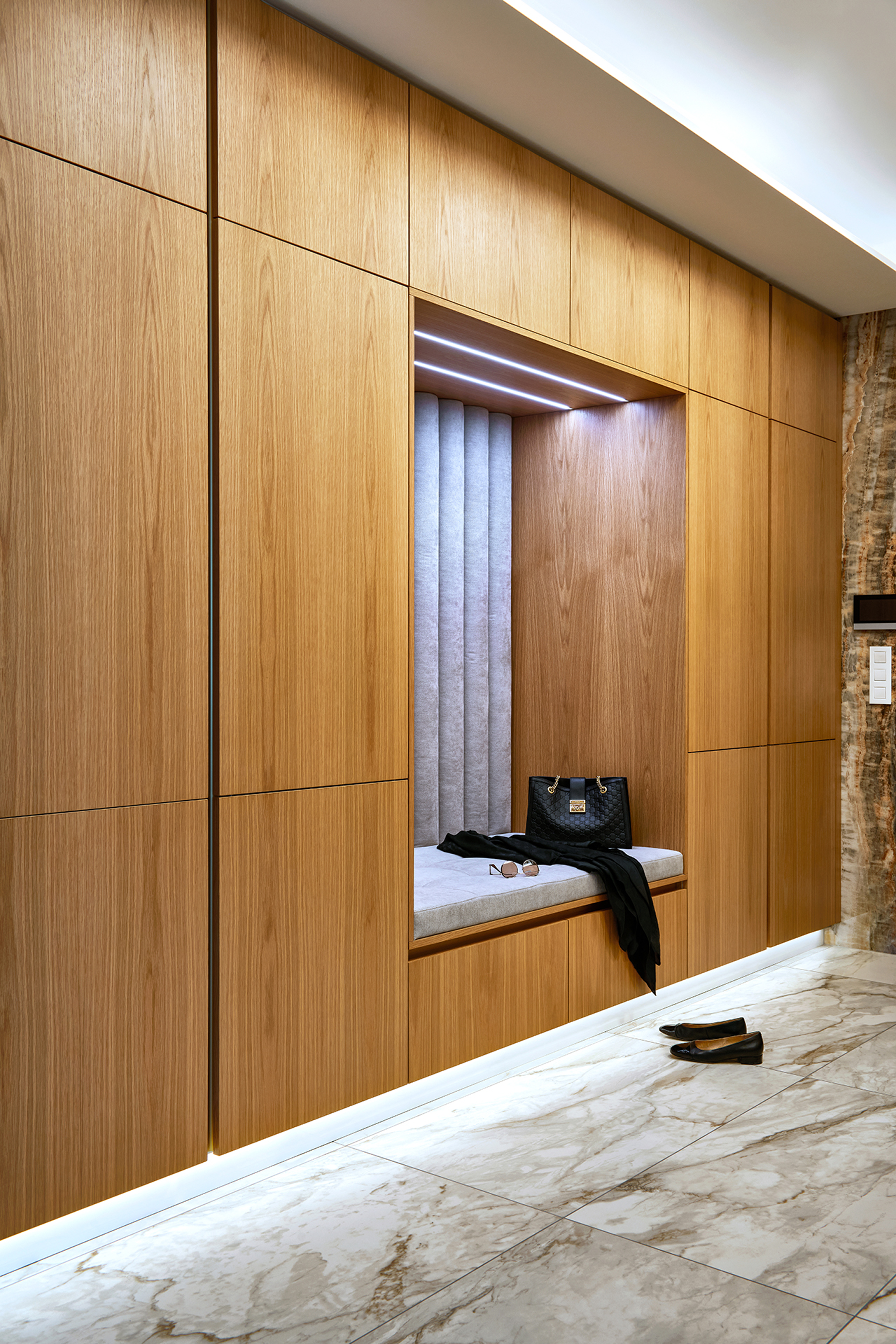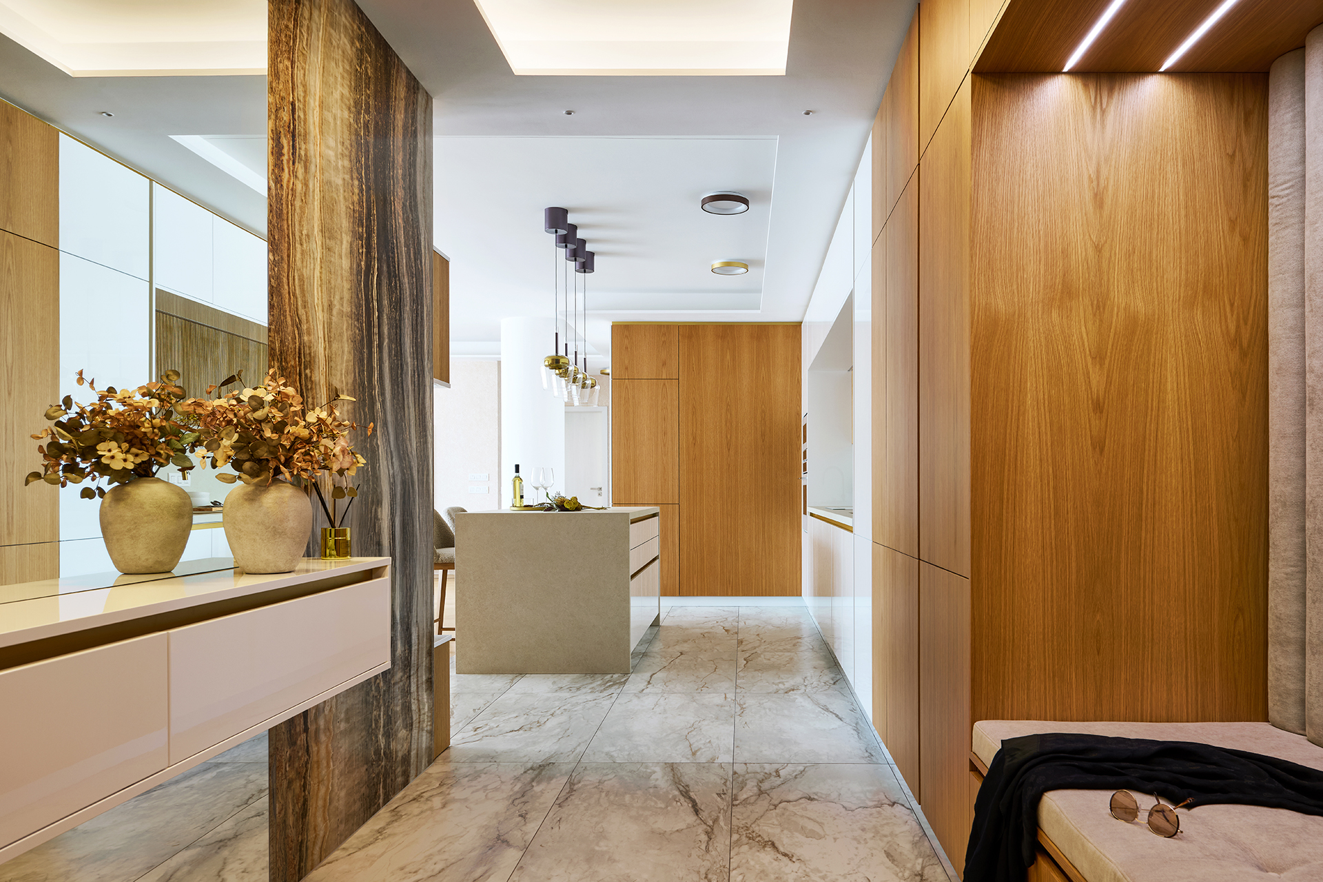 The interior is further complemented by built-in elements in keeping with the style of the kitchen. The LINE wardrobe in American old oak decor, complemented by seating, is a natural and elegant part of the interior thanks to its precise workmanship. Another striking feature is the entrance area of the apartment, which is dominated by natural stone with a distinctive pattern. In contrast to this, the minimalist hanging chest of drawers and large-format mirror with backlighting stand out, visually expanding the space and giving it a modern and sophisticated look.