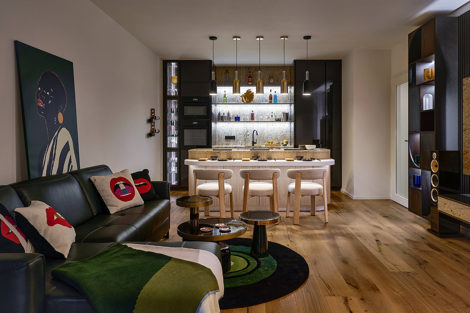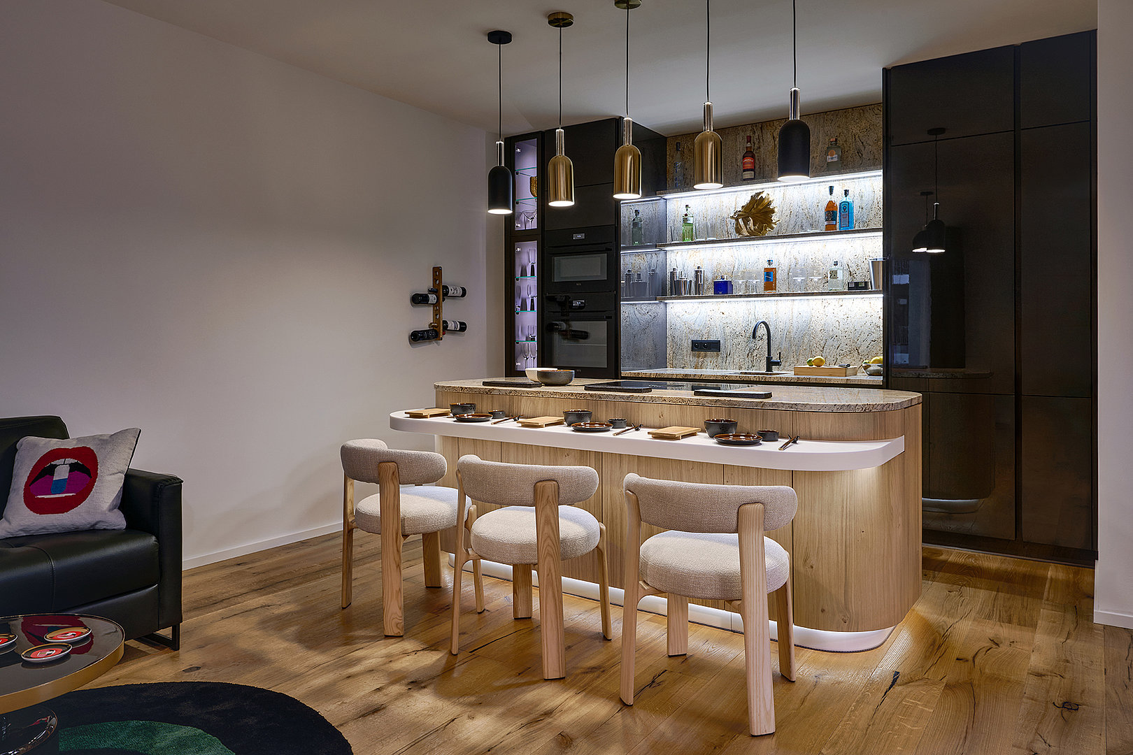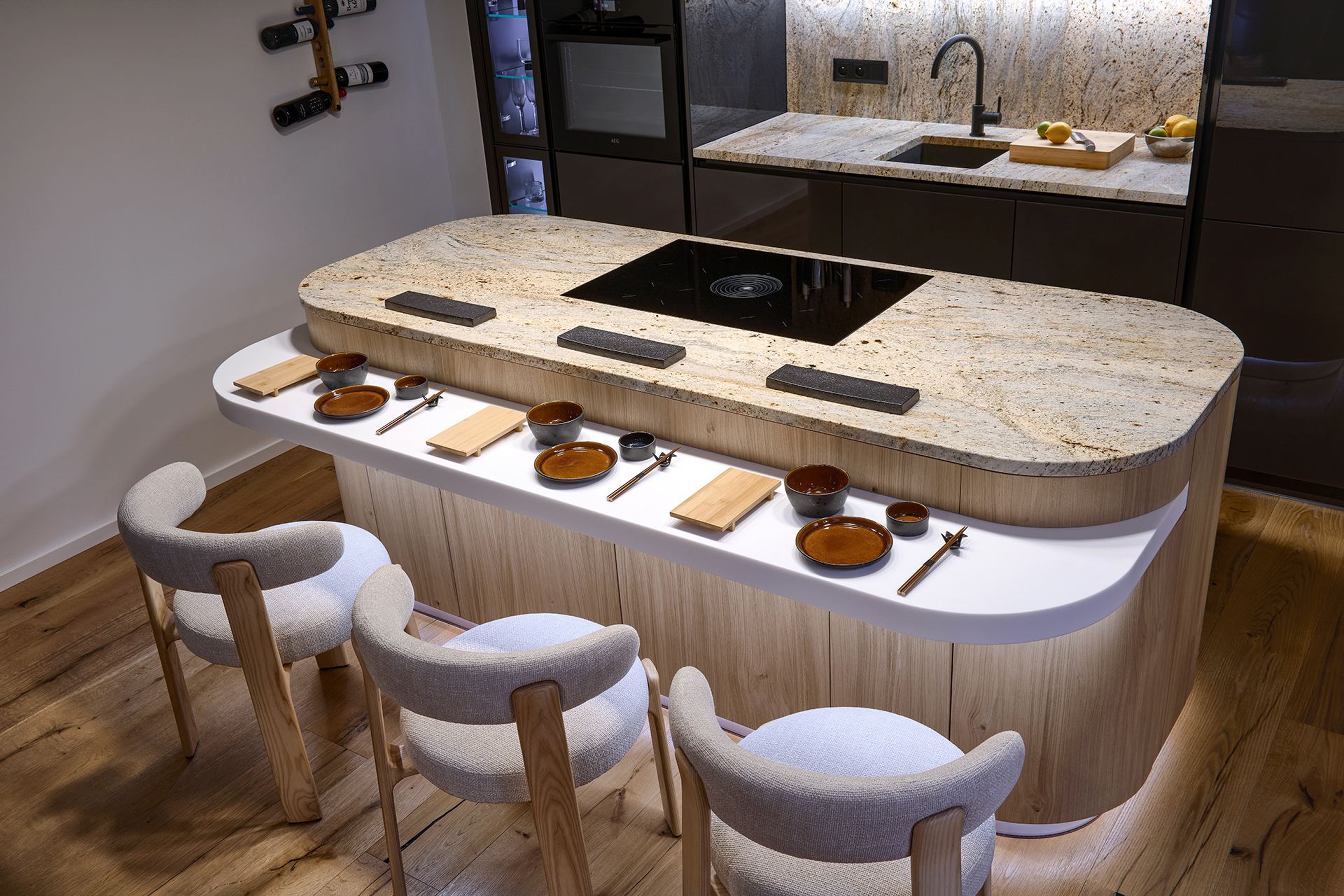 One of the main elements of the interior is a generously proportioned island in a rustic oak finish. Its gently rounded shapes soften the overall look and seamlessly connect to the bar seating made of Corian mineral stone. The backlit plinth gives the island a lightness and visually separates it from the floor. The minimalist character of the entire design is complemented by a BORA hob with integrated extraction, recessed into the granite worktop so as not to disturb the clean and cohesive look of the kitchen.