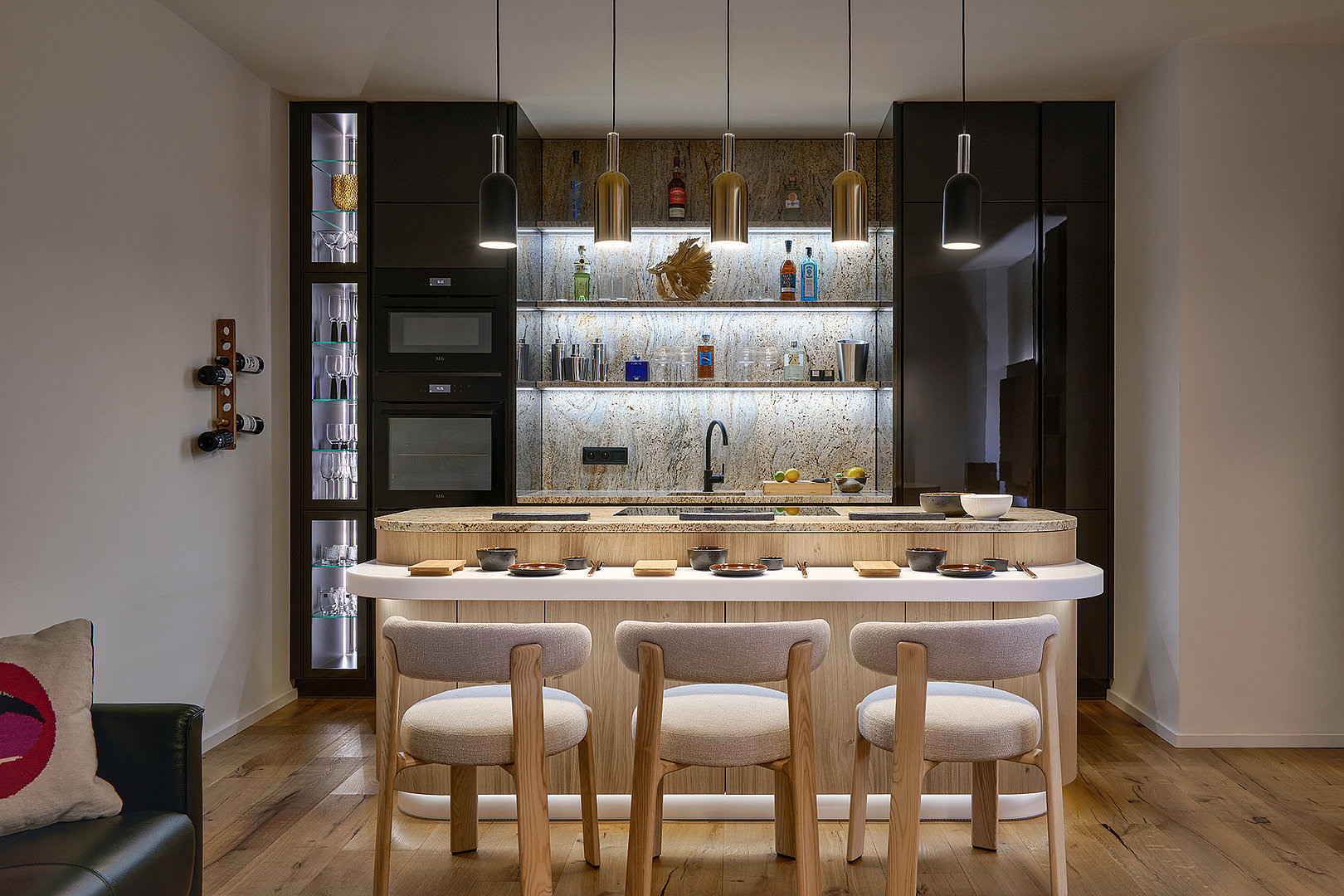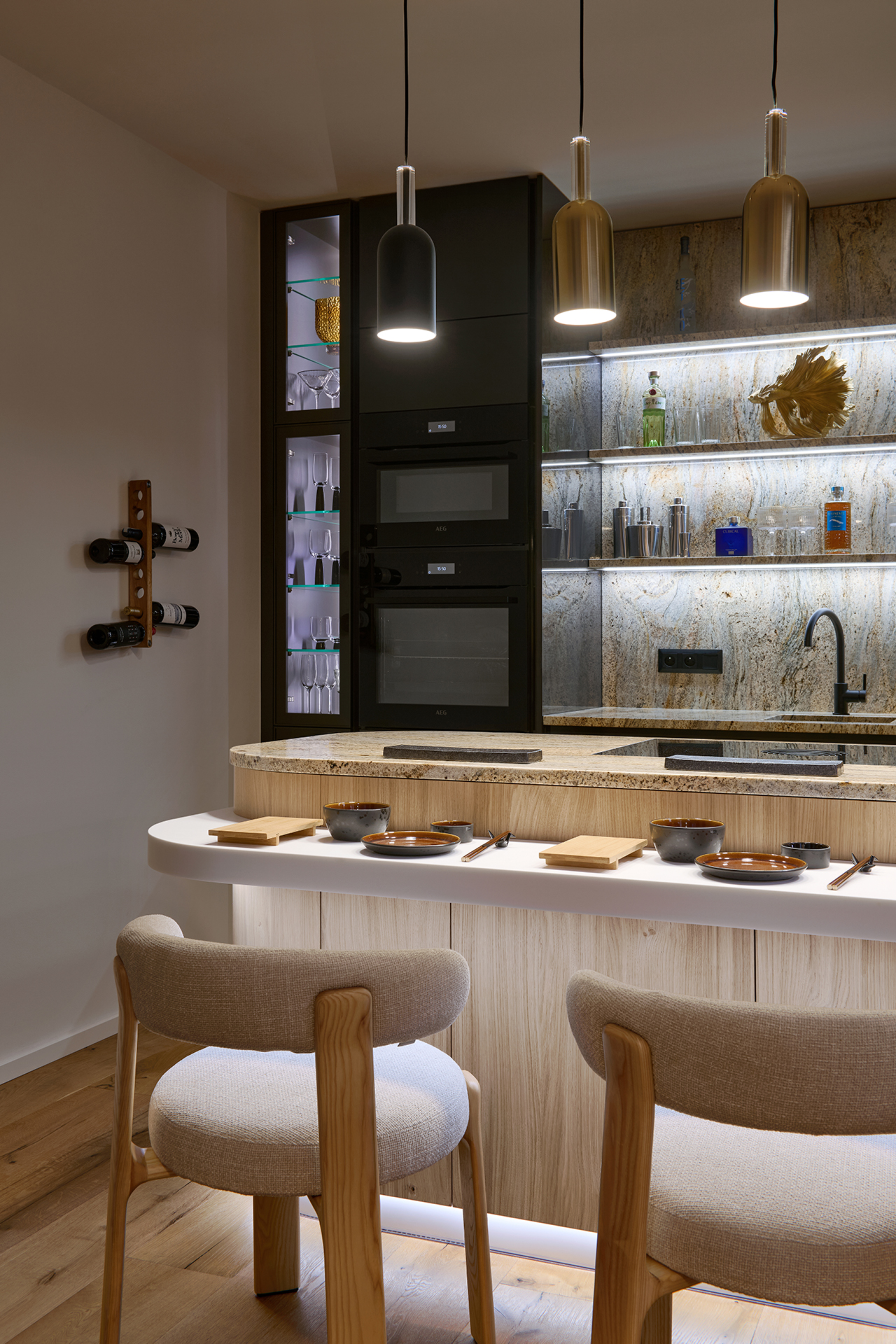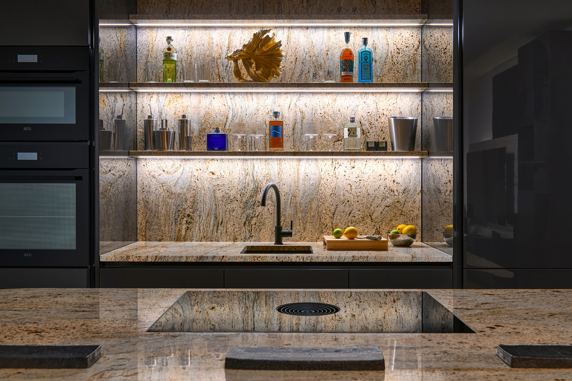 The kitchen is based on a thoughtful contrast of distinctive materials and a balanced composition. A set of tall cabinets in a deep titanium gloss finish provides an elegant backdrop for the dominant Millennium Gold granite pattern. This exceptional stone is used on the worktop and shelves, where it naturally complements the atmosphere of the entire space thanks to integrated backlighting with color-changing options.