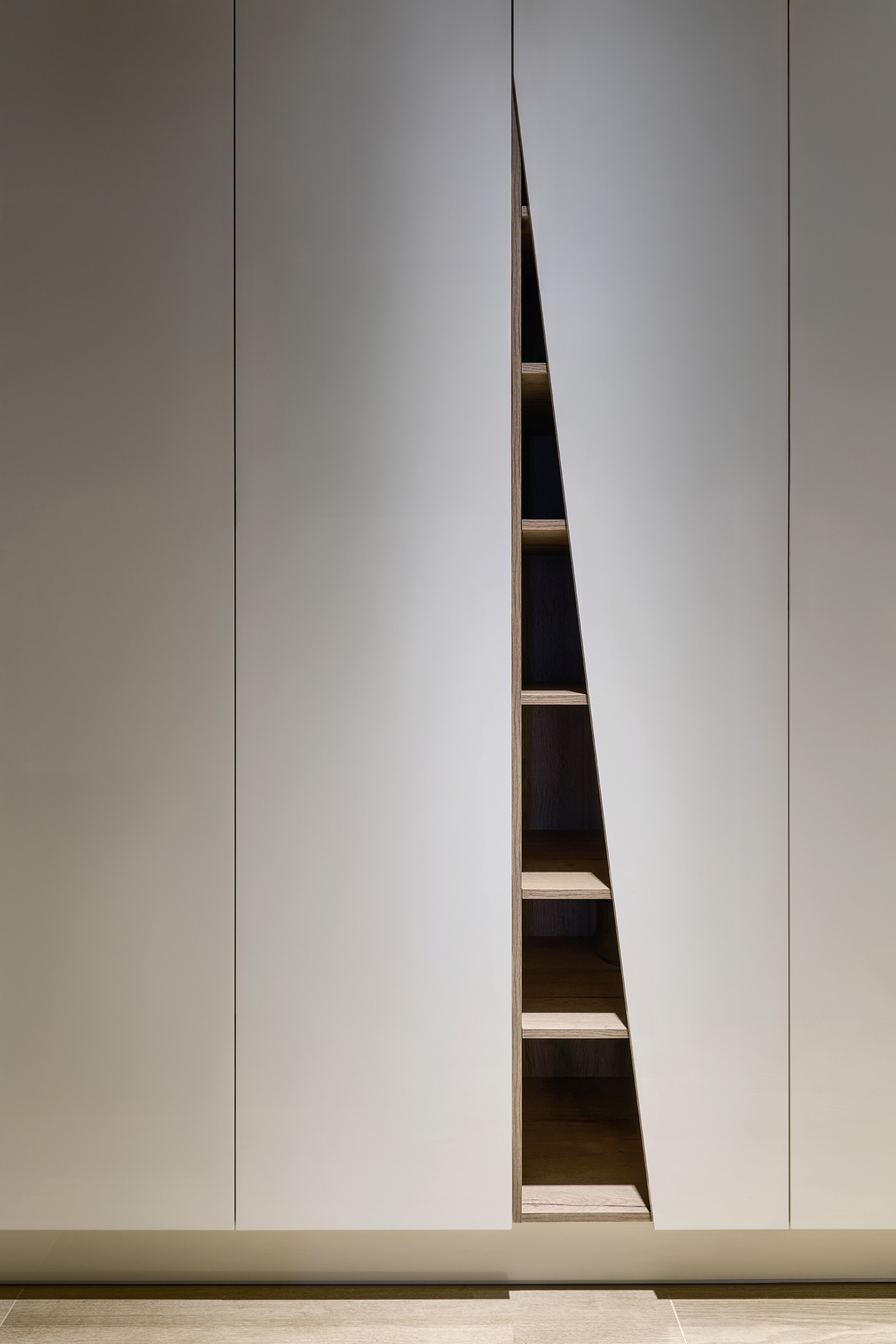 The wall by the door combines storage elements with an atypical bench and black leather seat. Geometric dark details emphasize the contrast with the wooden paneling, and above the bench is an original custom-made metal coat rack that complements the character of the space.