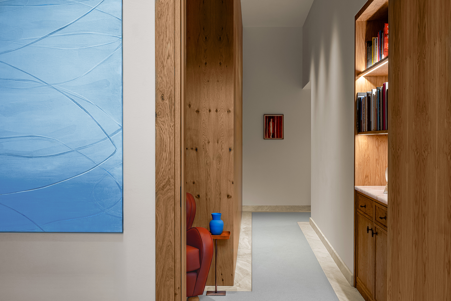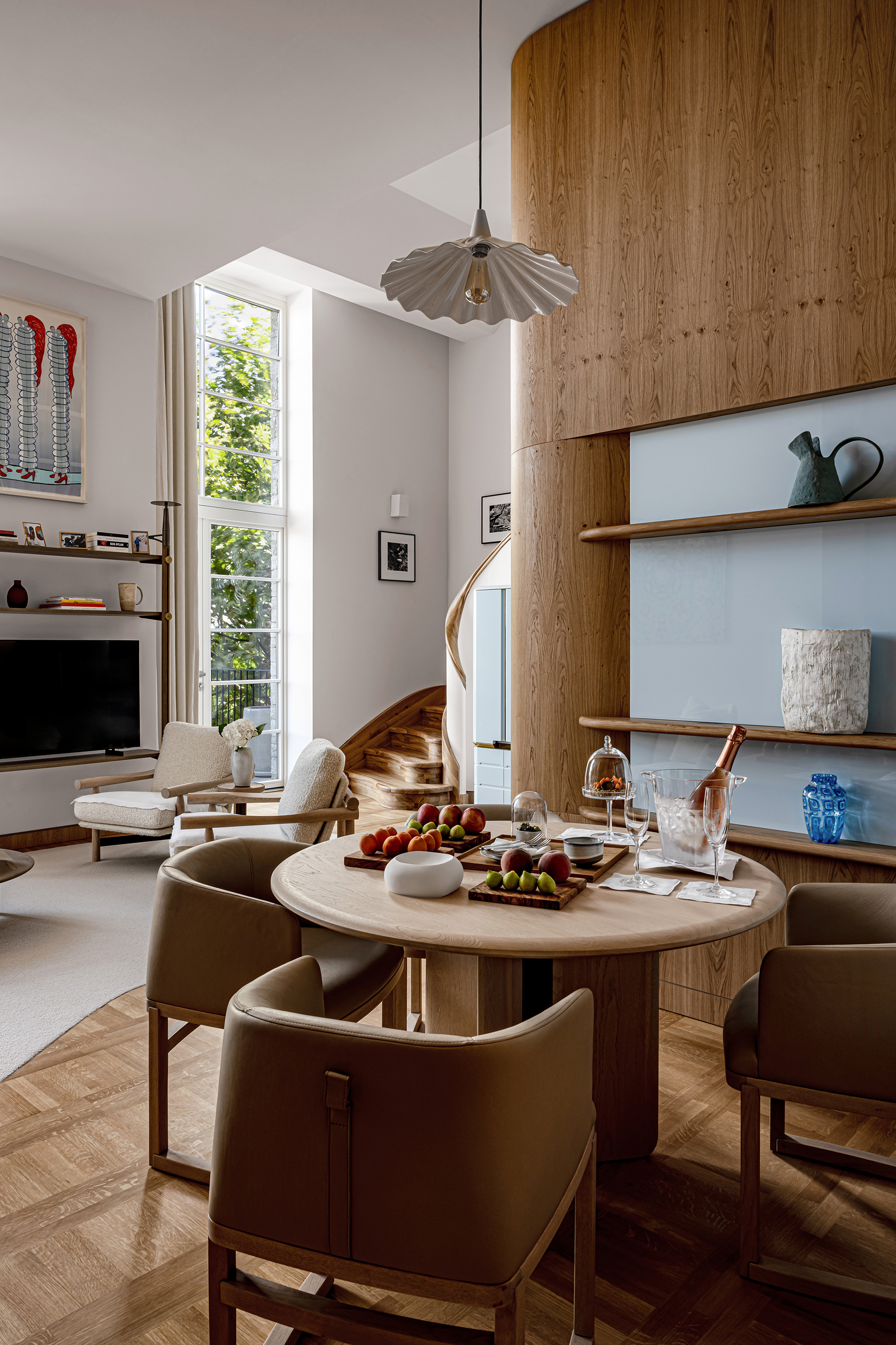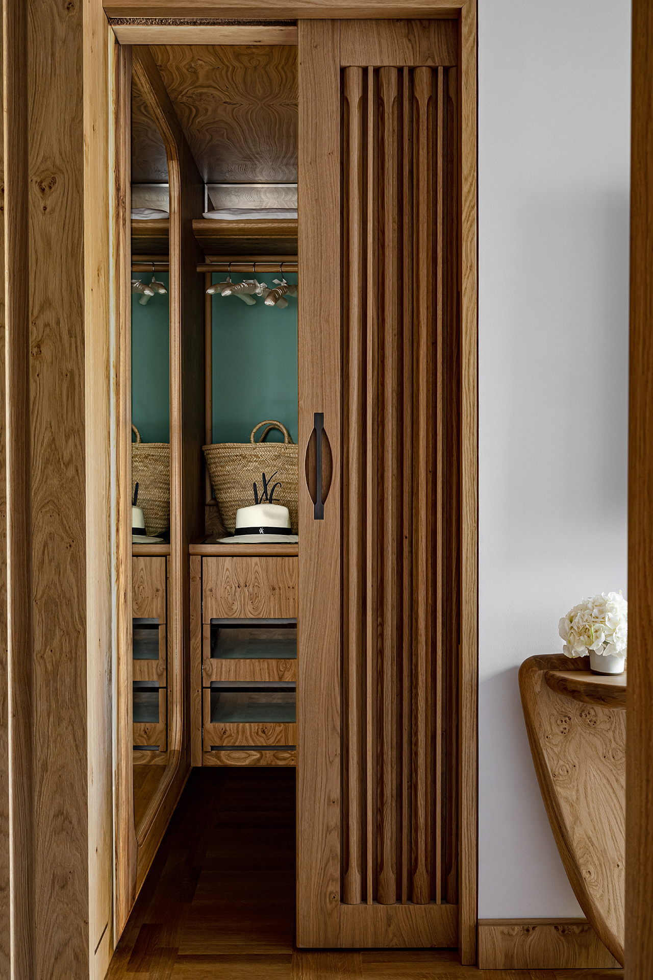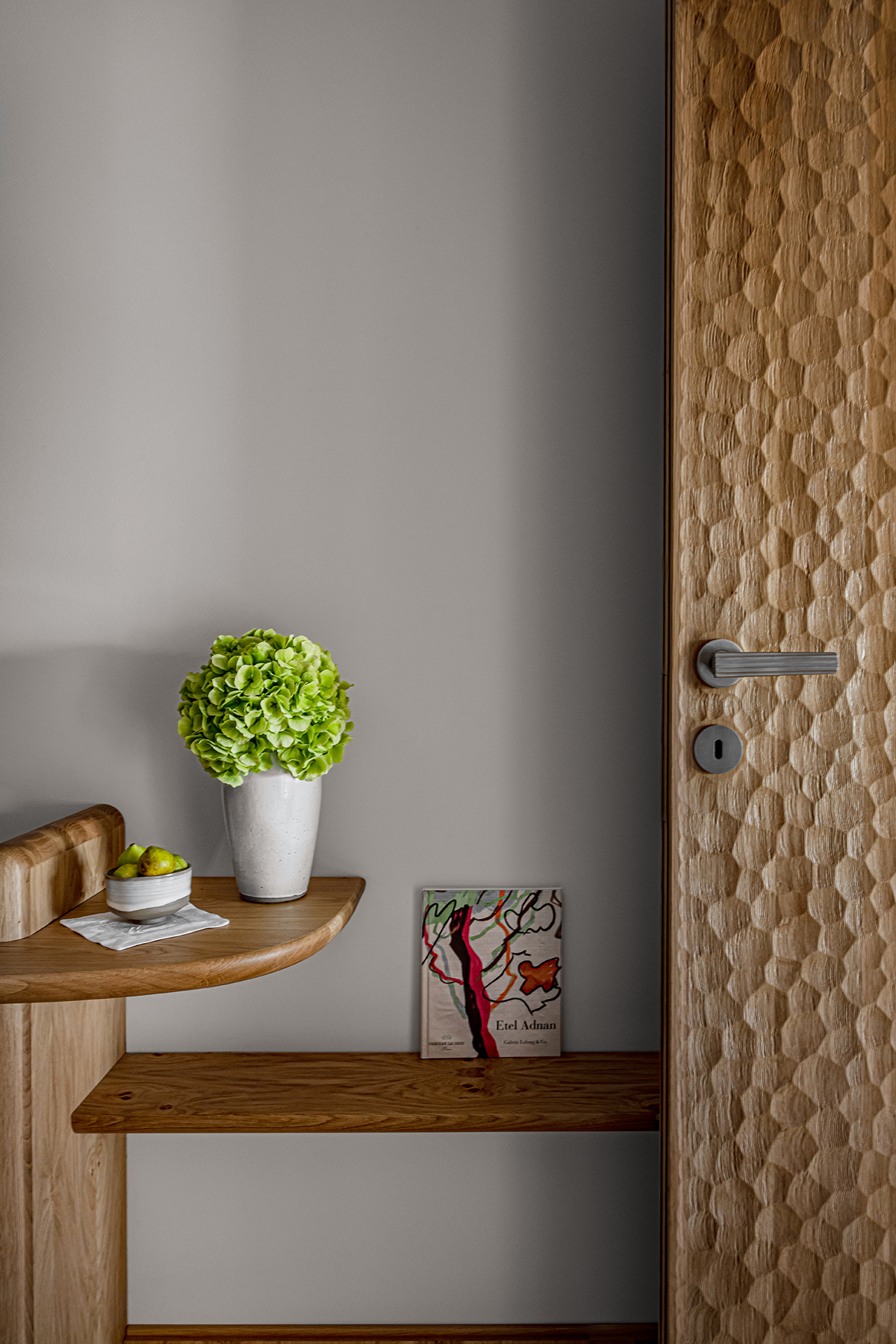 L'ensemble de l'intérieur est unifié par un placage en chêne naturel, utilisé non seulement pour les meubles, mais aussi pour les revêtements muraux et d'autres éléments. Son motif unique apporte de la profondeur, une élégance chaleureuse et un caractère organique à l'espace. Les surfaces parfaitement assemblées forment un ensemble harmonieux qui porte la signature du savoir-faire artisanal, tandis que les matériaux naturels soulignent l'authenticité et la qualité intemporelle.
