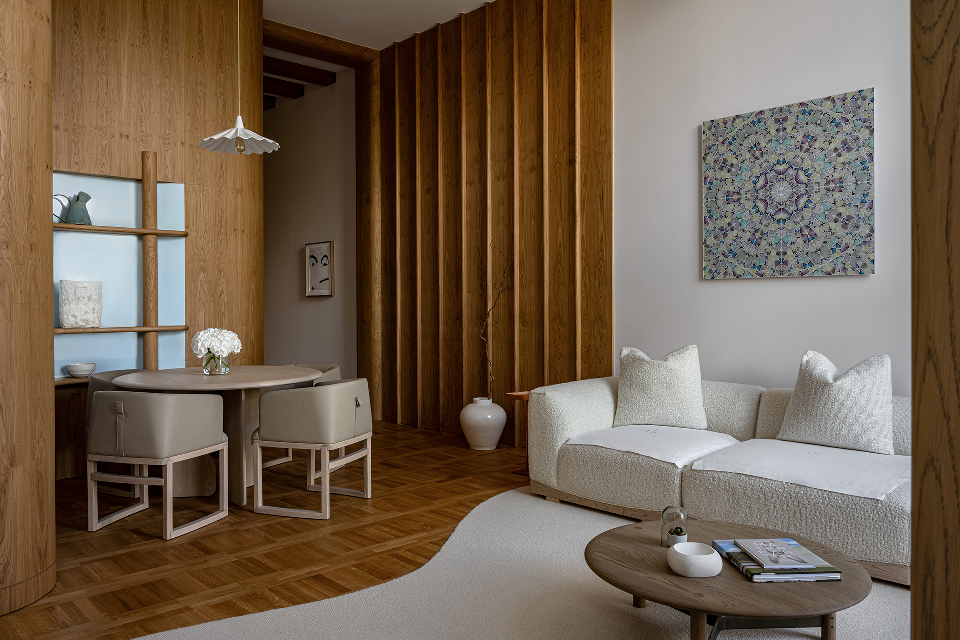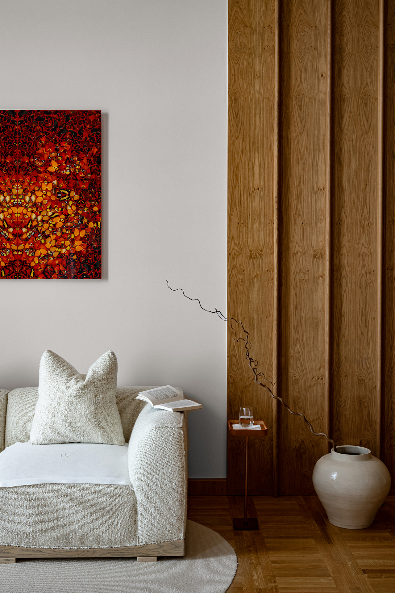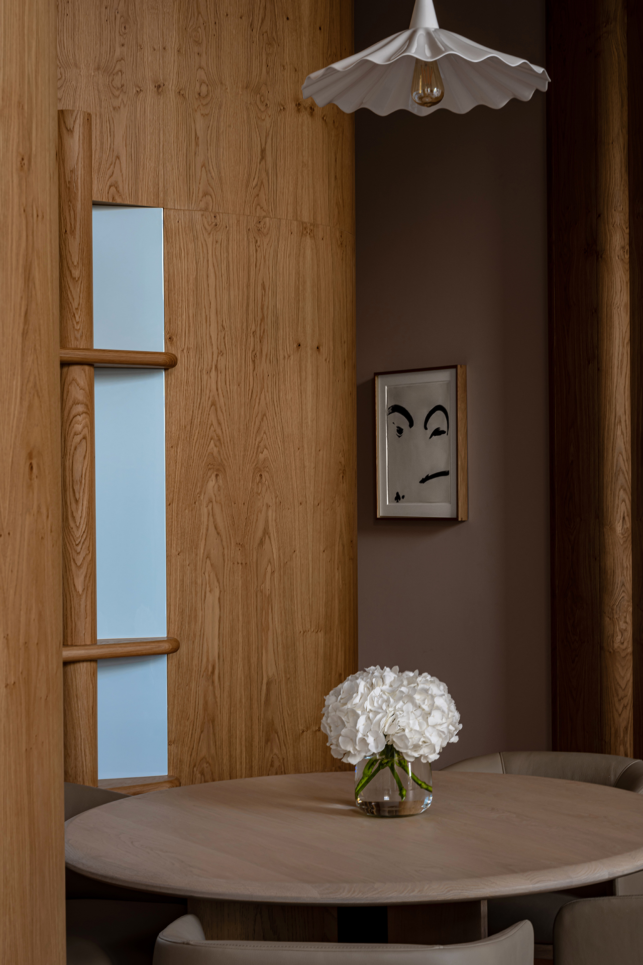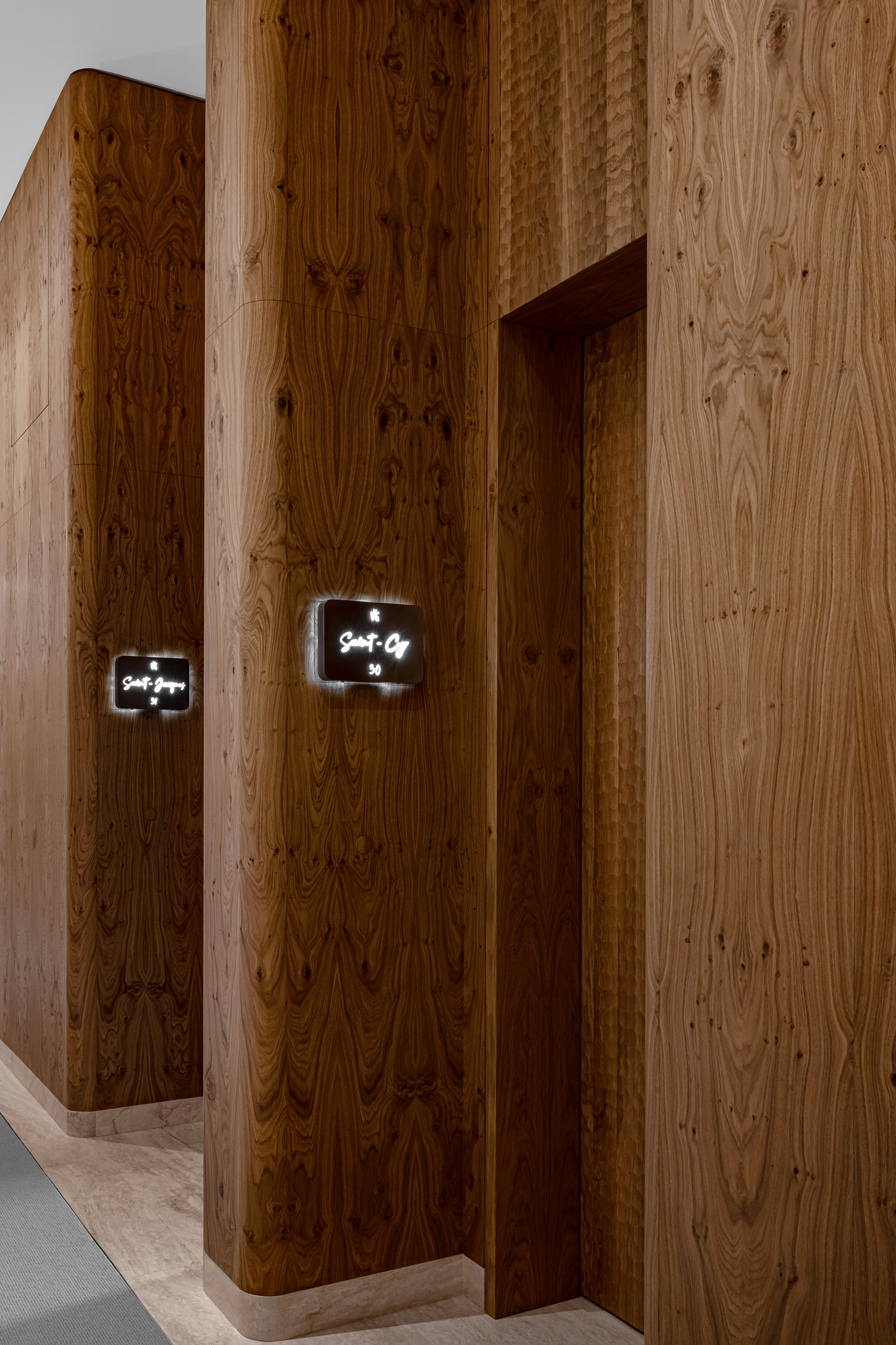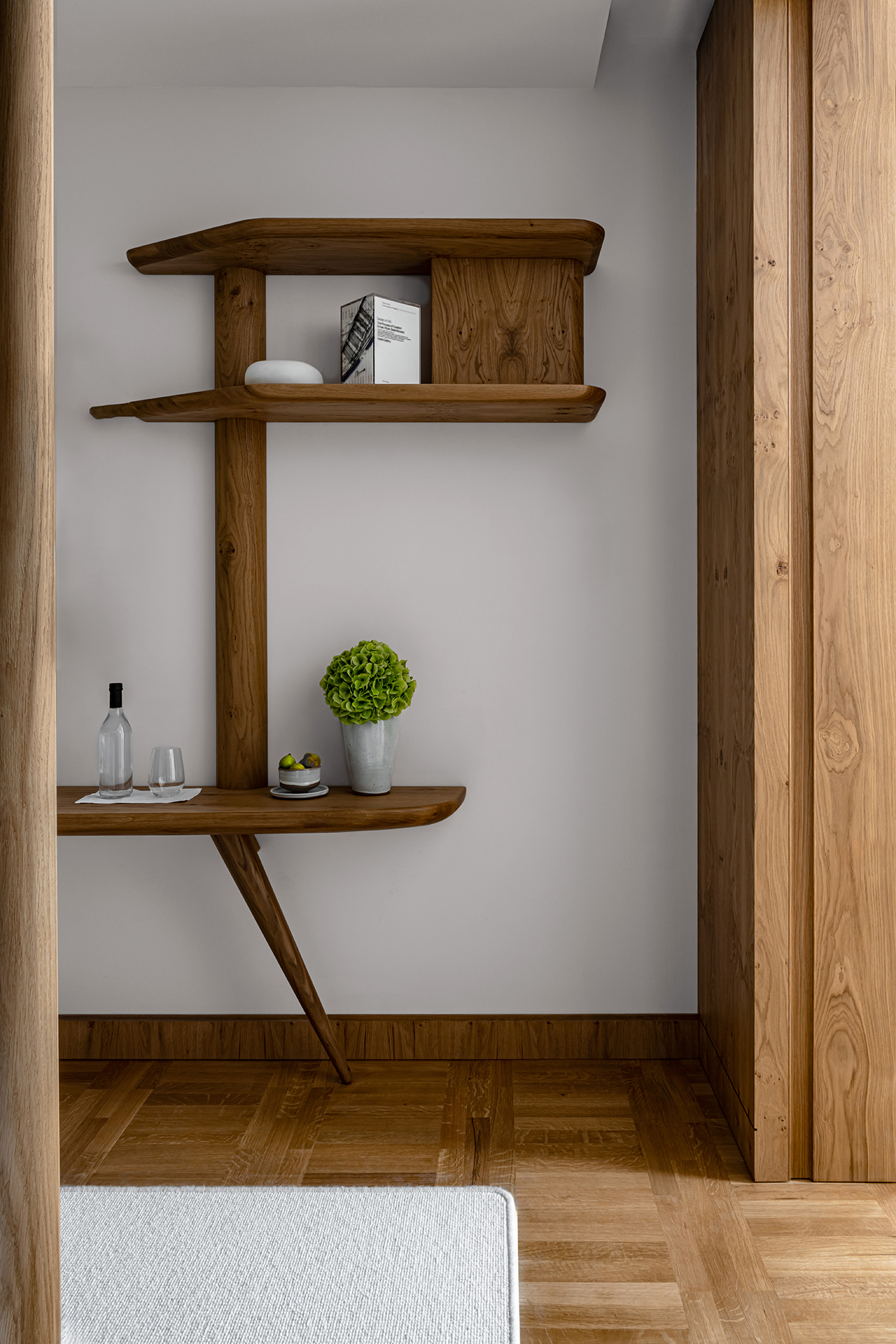 L'ensemble de l'intérieur est unifié par un placage en chêne naturel, utilisé non seulement pour les meubles, mais aussi pour les revêtements muraux et d'autres éléments. Son motif unique apporte de la profondeur, une élégance chaleureuse et un caractère organique à l'espace. Les surfaces parfaitement assemblées forment un ensemble harmonieux qui porte la signature du savoir-faire artisanal, tandis que les matériaux naturels soulignent l'authenticité et la qualité intemporelle.