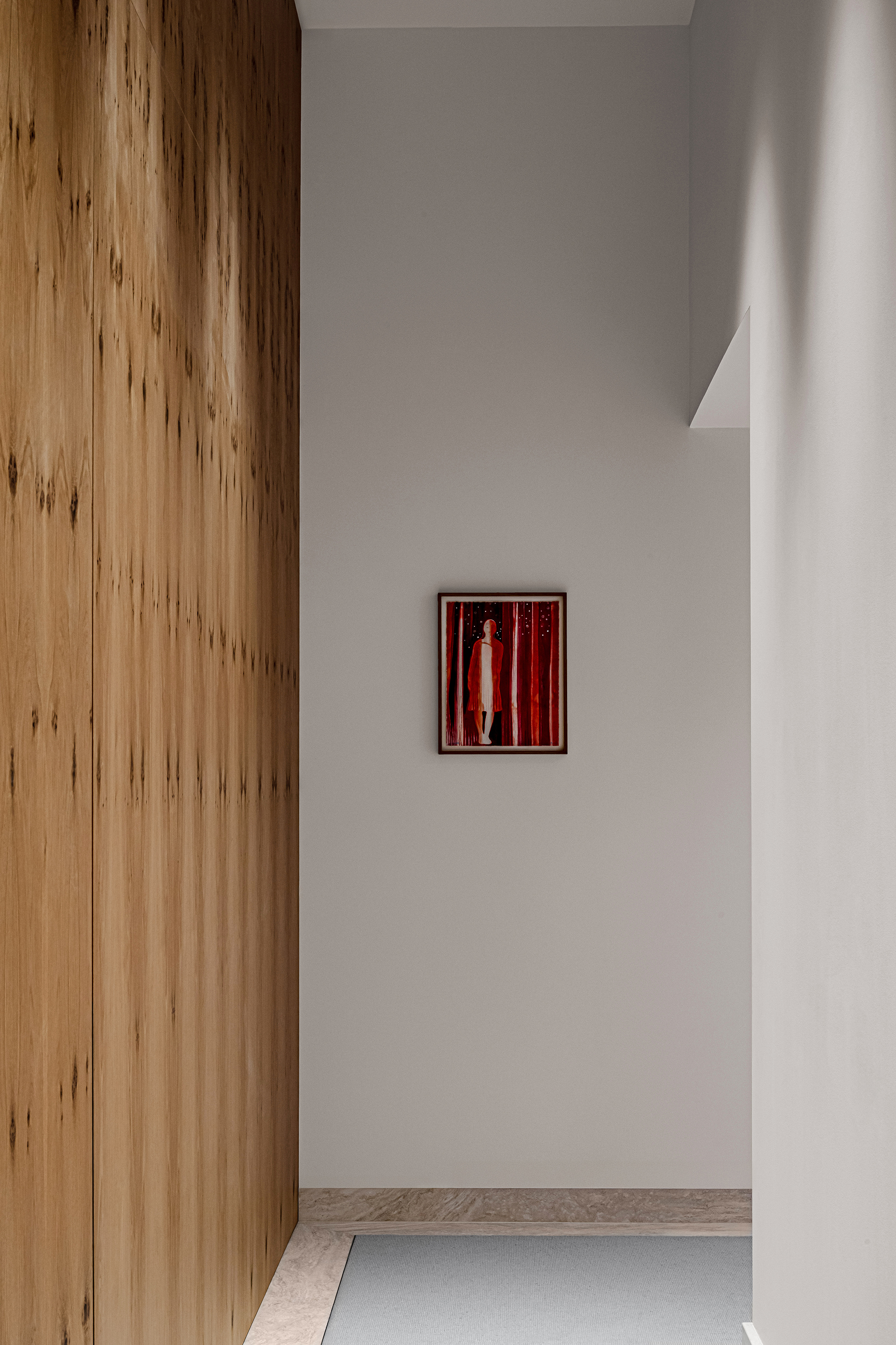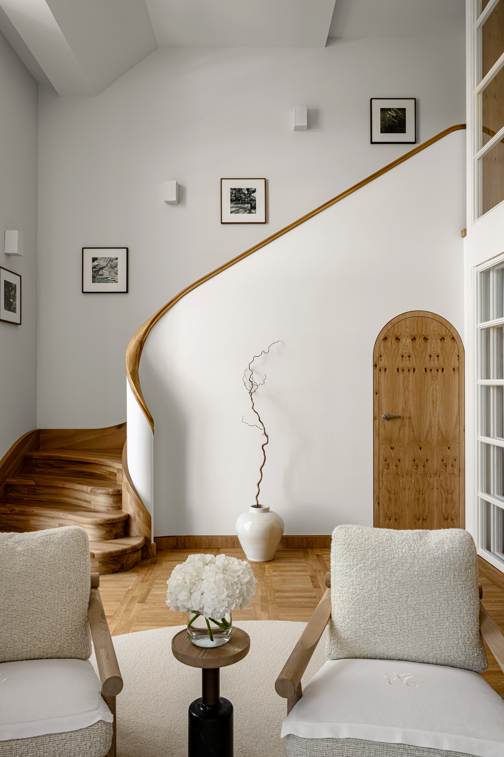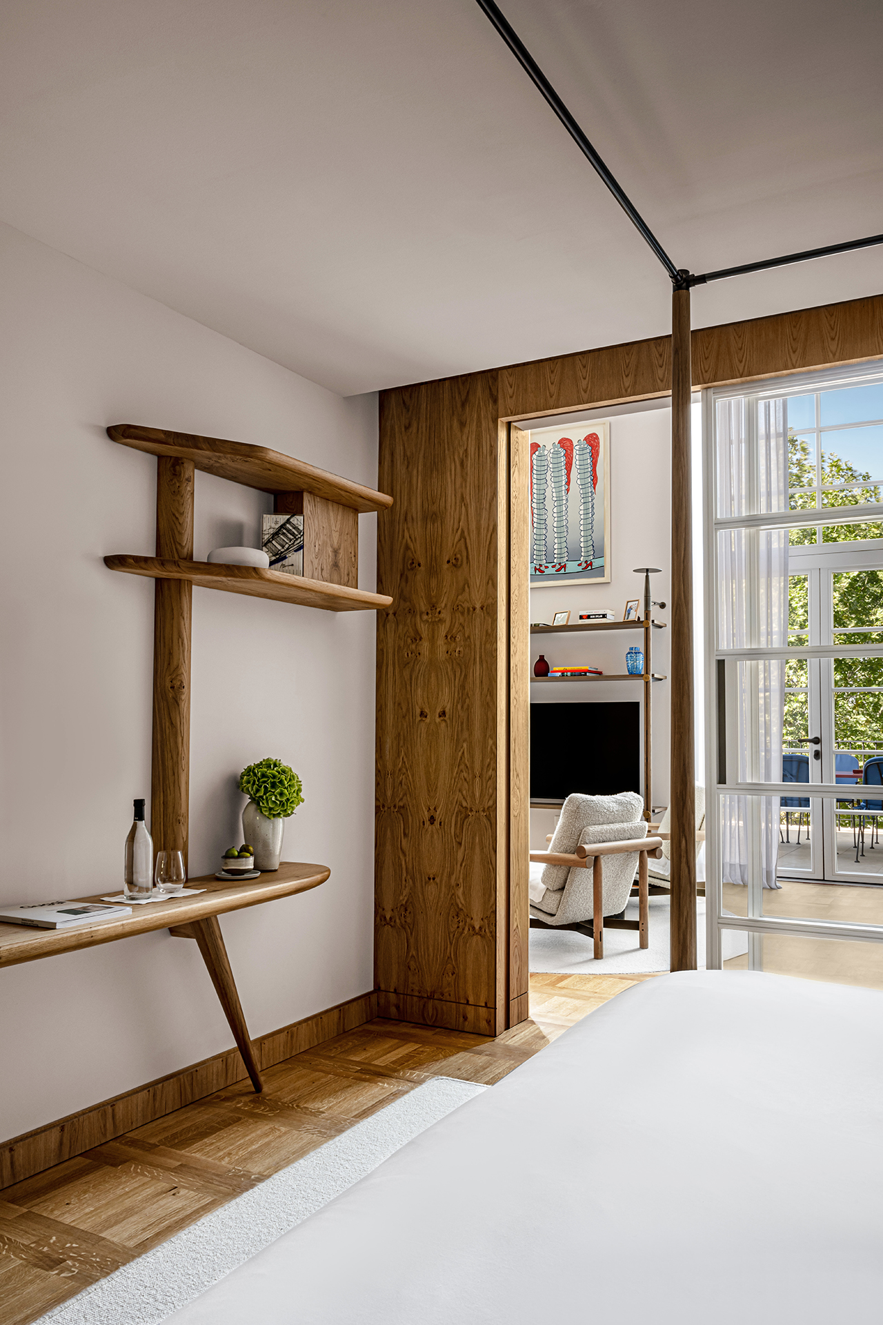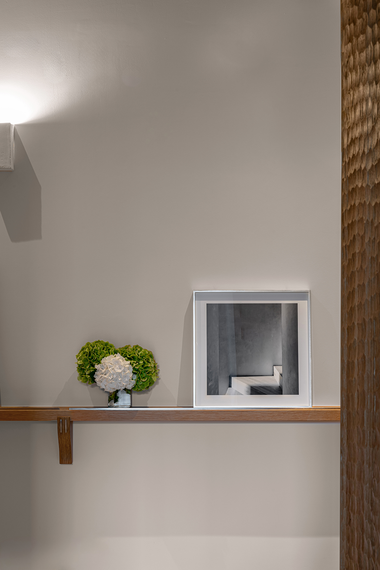 L'ensemble de l'intérieur est unifié par un placage en chêne naturel, utilisé non seulement pour les meubles, mais aussi pour les revêtements muraux et d'autres éléments. Son motif unique apporte de la profondeur, une élégance chaleureuse et un caractère organique à l'espace. Les surfaces parfaitement assemblées forment un ensemble harmonieux qui porte la signature du savoir-faire artisanal, tandis que les matériaux naturels soulignent l'authenticité et la qualité intemporelle.