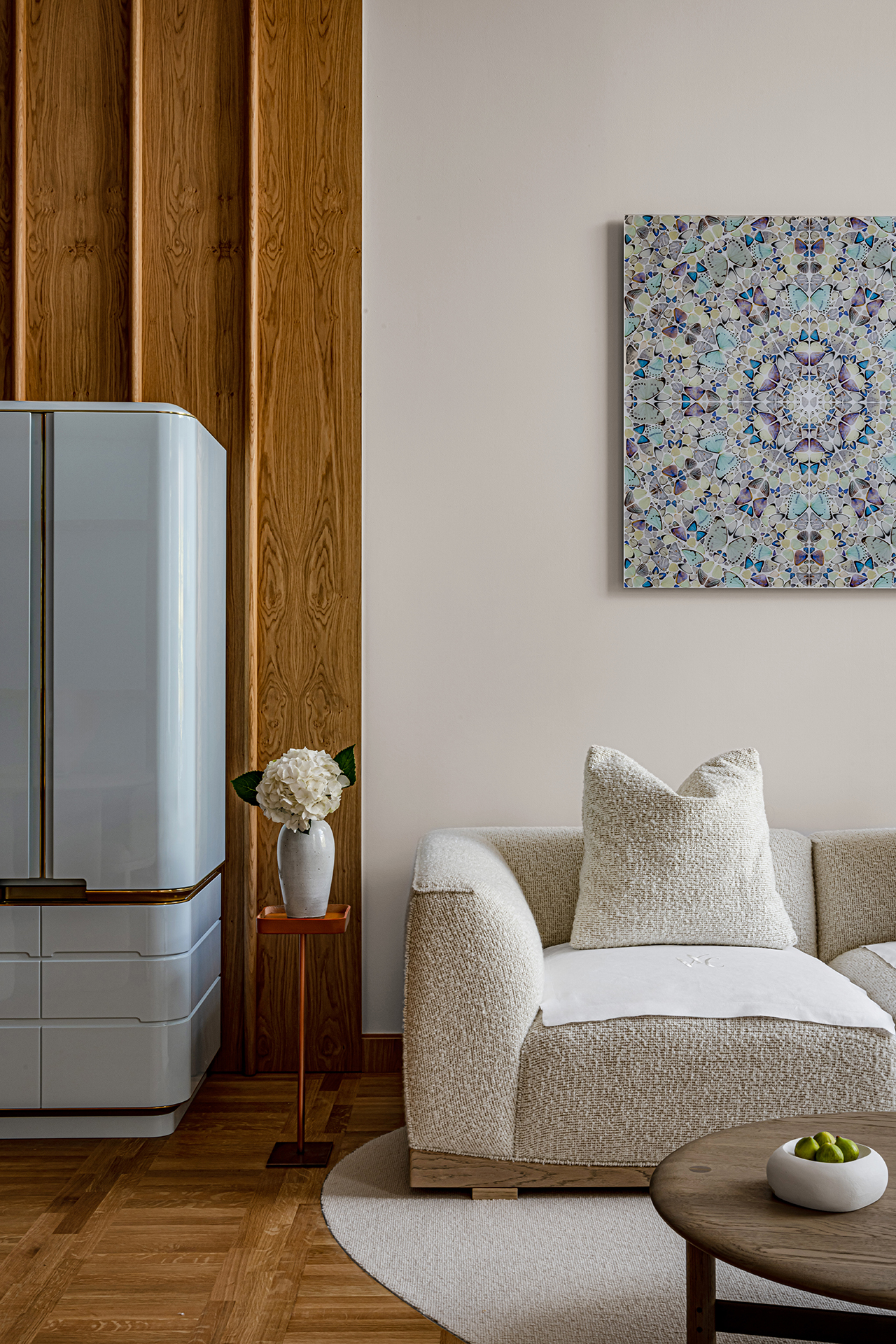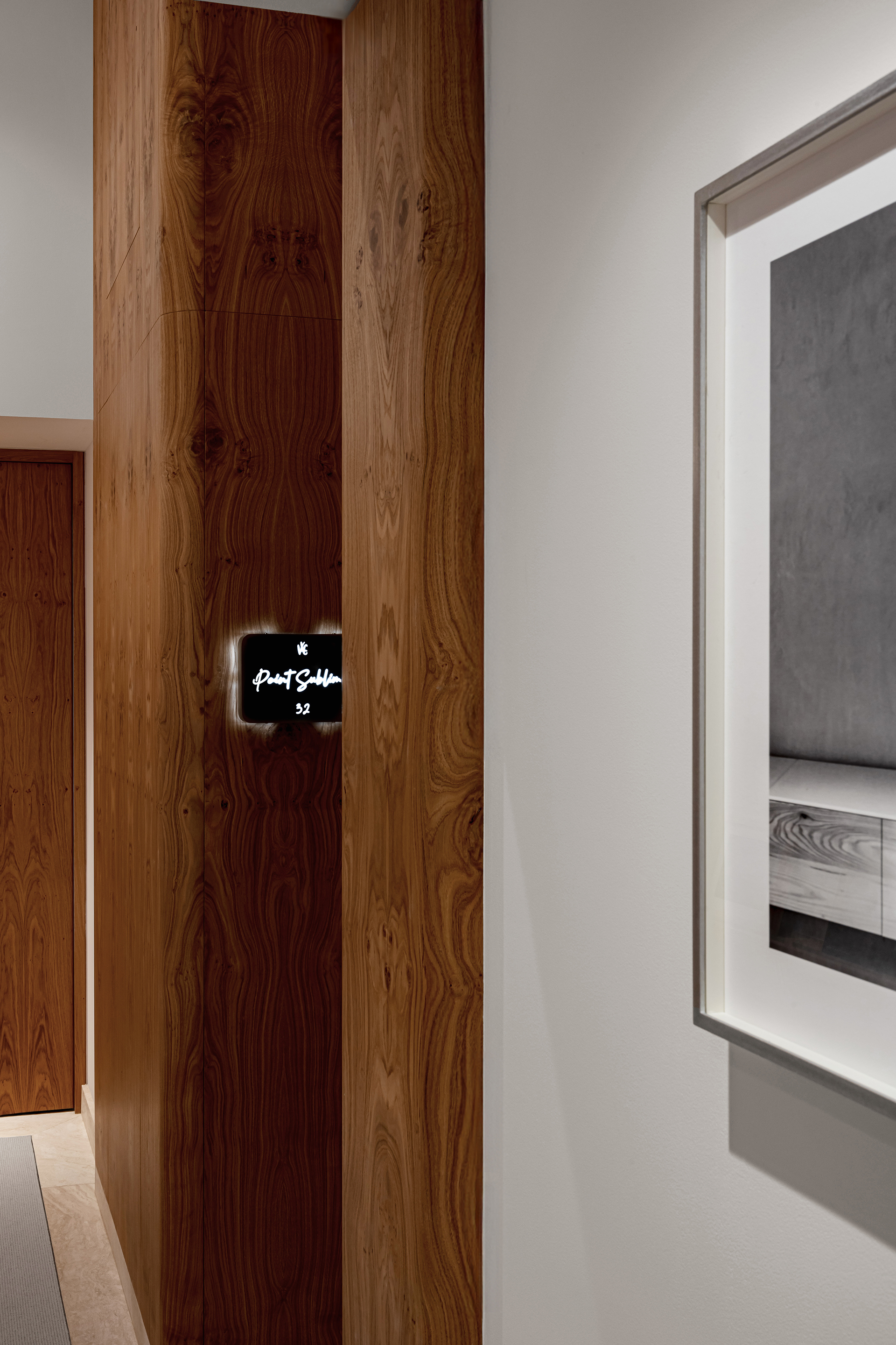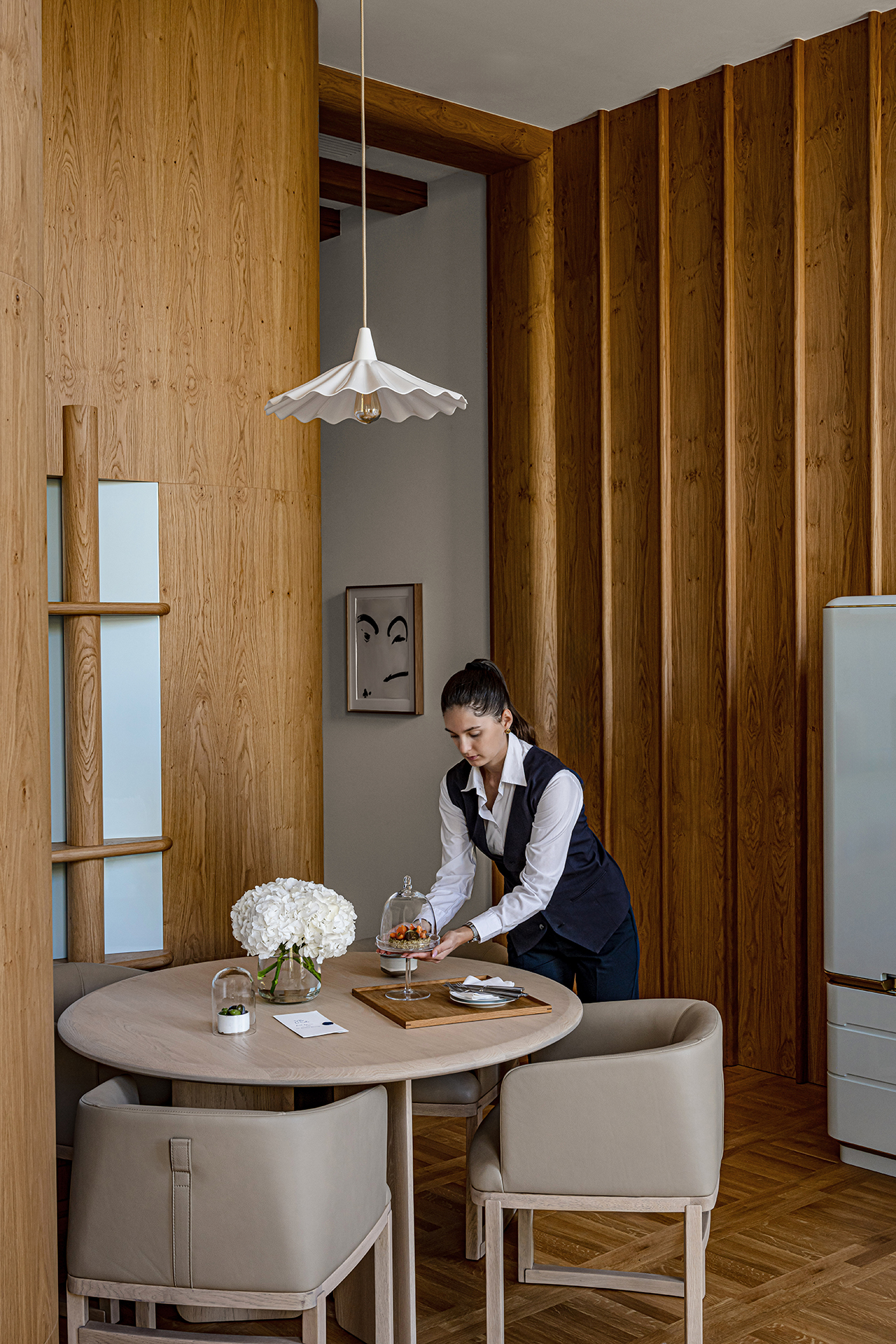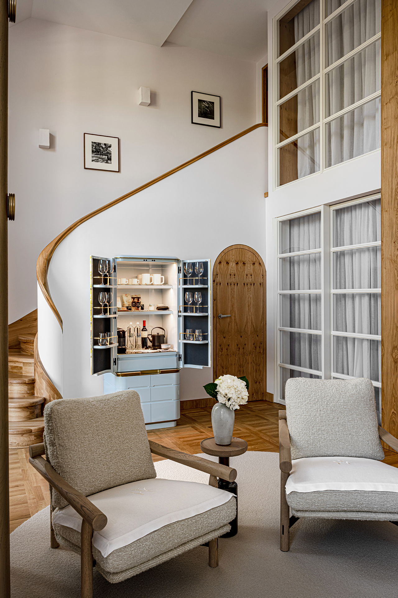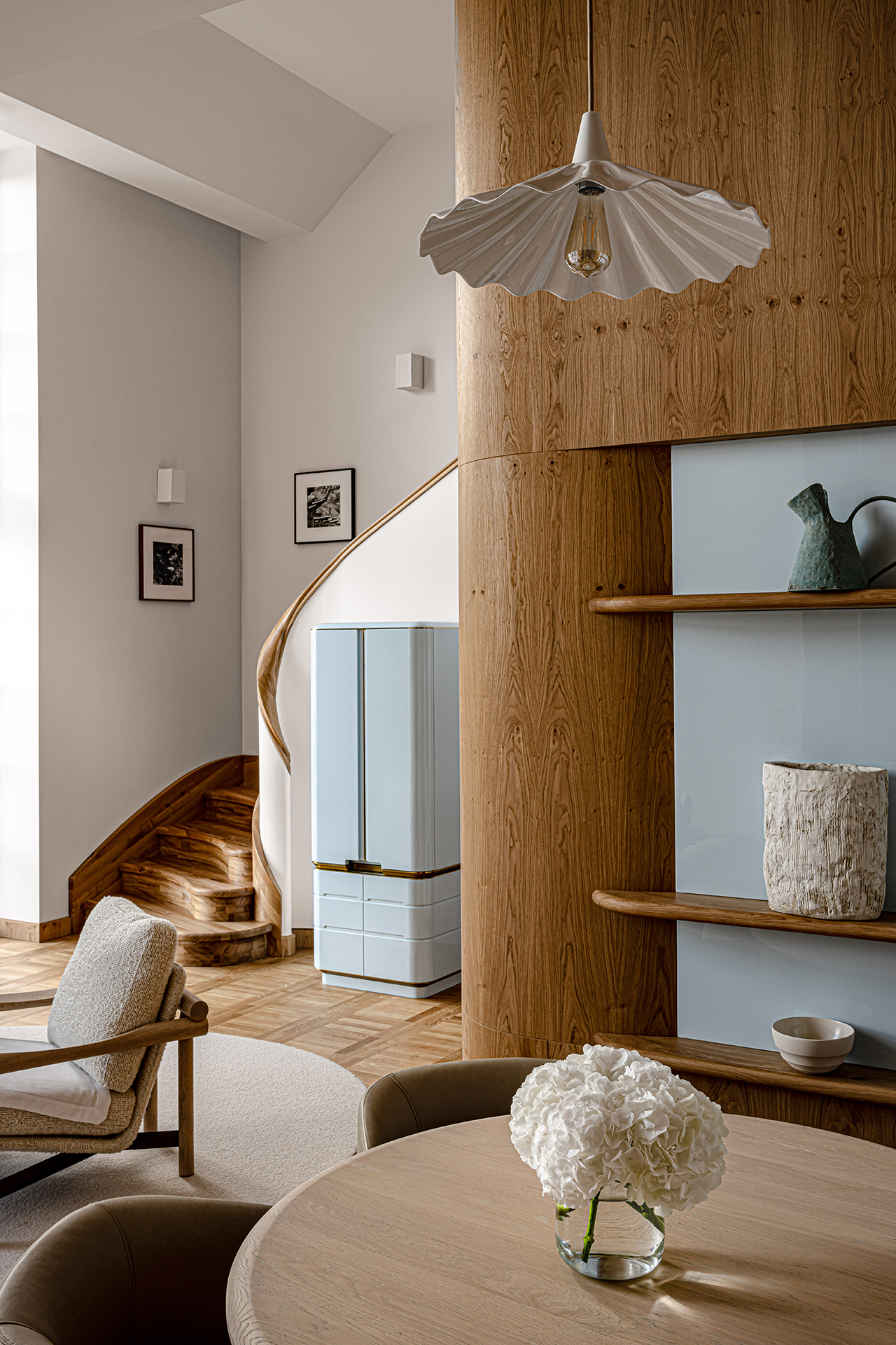 Notre travail ici a donné naissance à des appartements exclusifs, conçus et réalisés dans un esprit de solutions tout à fait atypiques. Chaque détail a été soigneusement pensé, des portes sculptées à la main, qui sont un manifeste de savoir-faire artisanal et d'extrême précision, aux lits rembourrés de matériaux haut de gamme, en passant par le bar emblématique d'un bleu azur brillant. Ce dernier a été créé exclusivement pour ce projet et son caractère exceptionnel est souligné par des détails en laiton poli, un revêtement en cuir fin et des éléments en verre trempé.