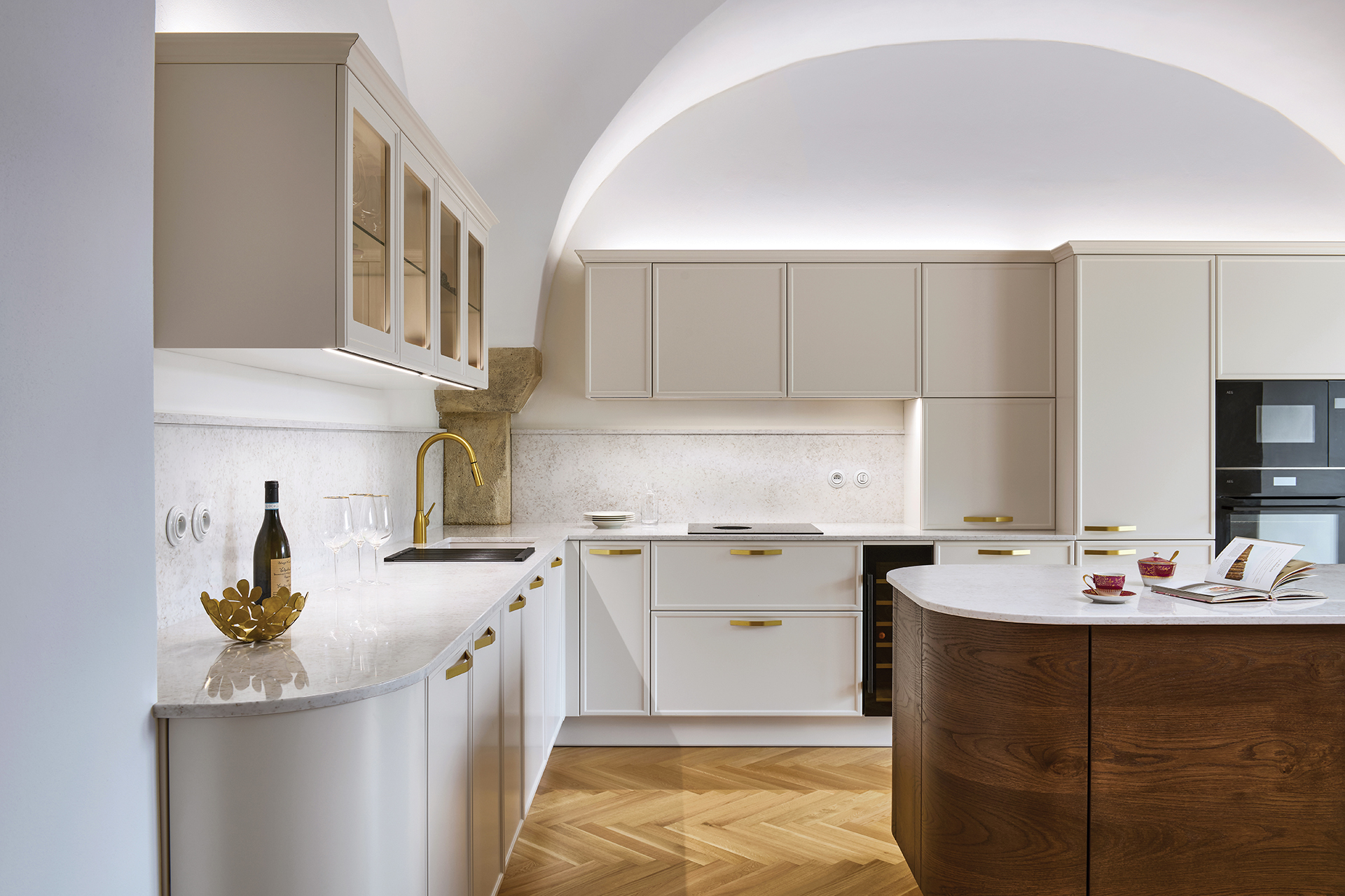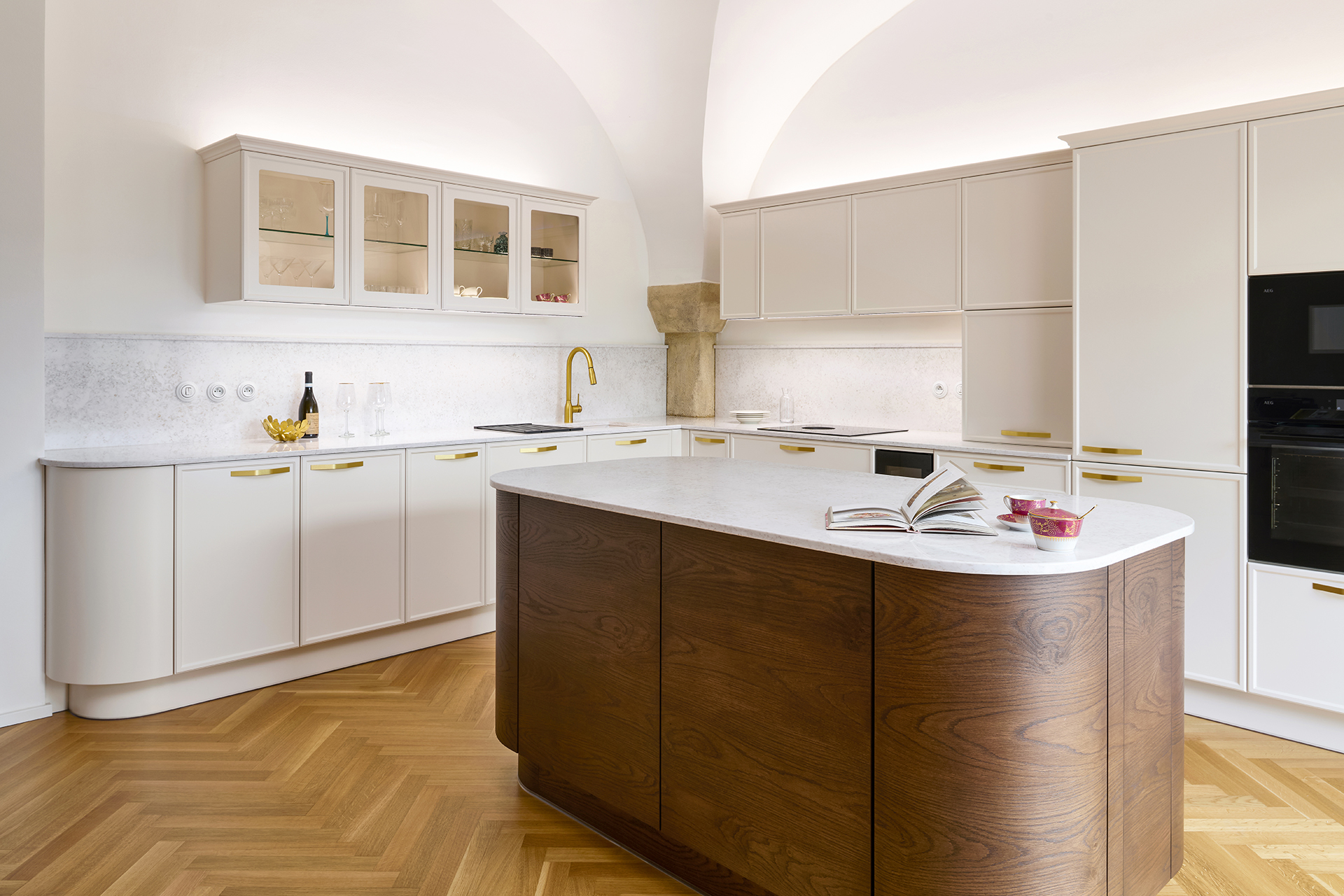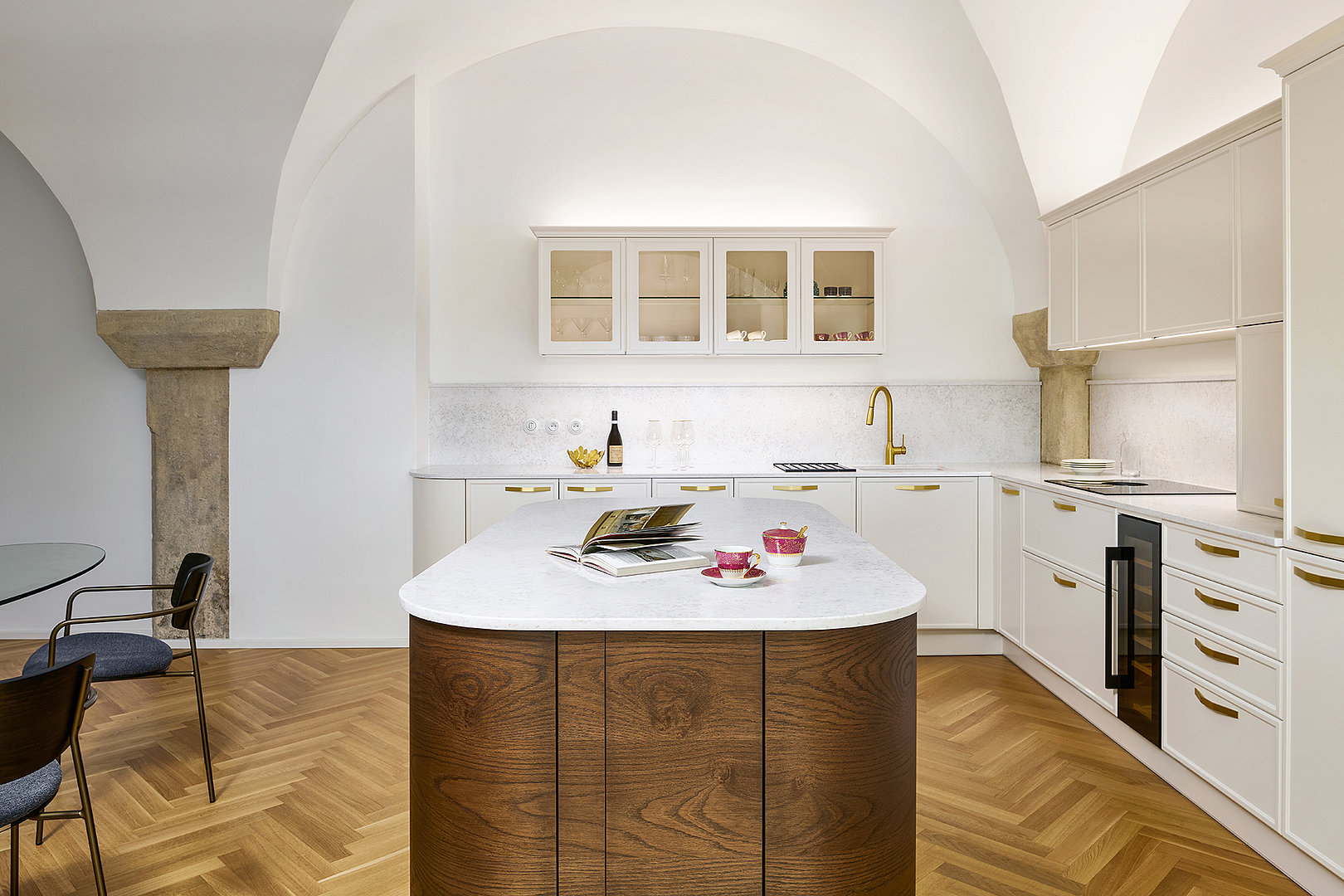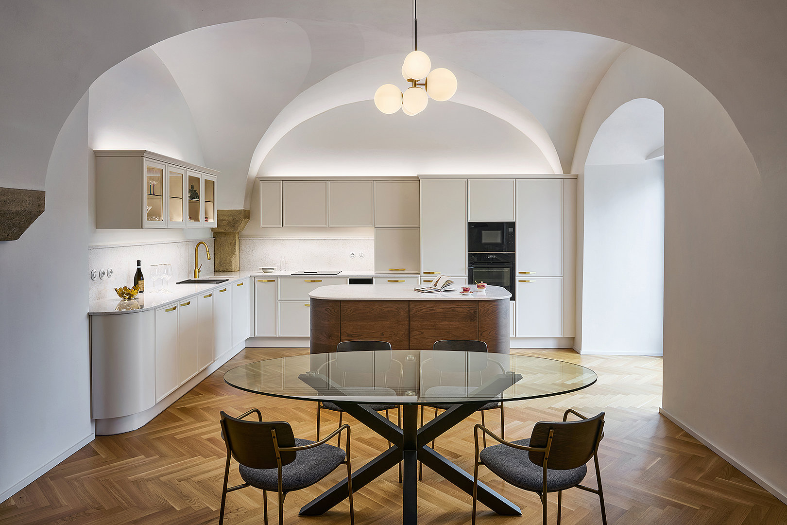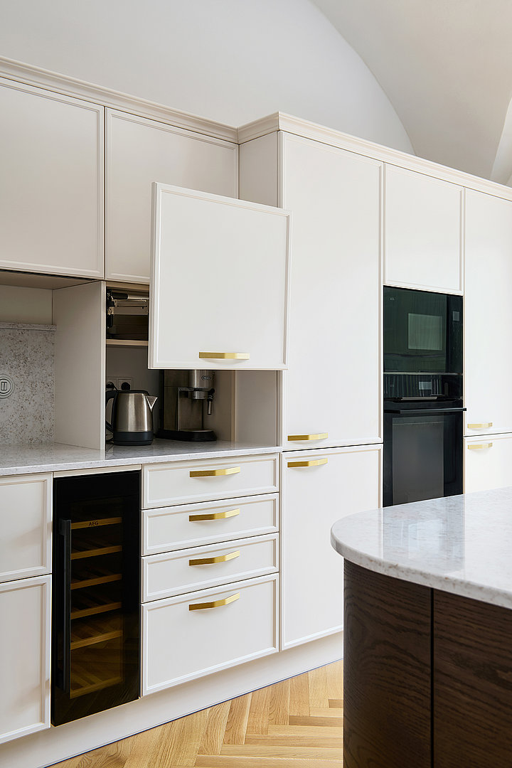 Le modèle LYON en laque mate blanc antique domine l'ensemble de l'espace et s'harmonise naturellement avec l'architecture historique grâce à sa teinte douce. Les formes minimalistes mettent en valeur la qualité de la fabrication et les détails : les poignées élégantes en laiton ou les vitrines rétroéclairées confèrent à l'intérieur légèreté et aération.