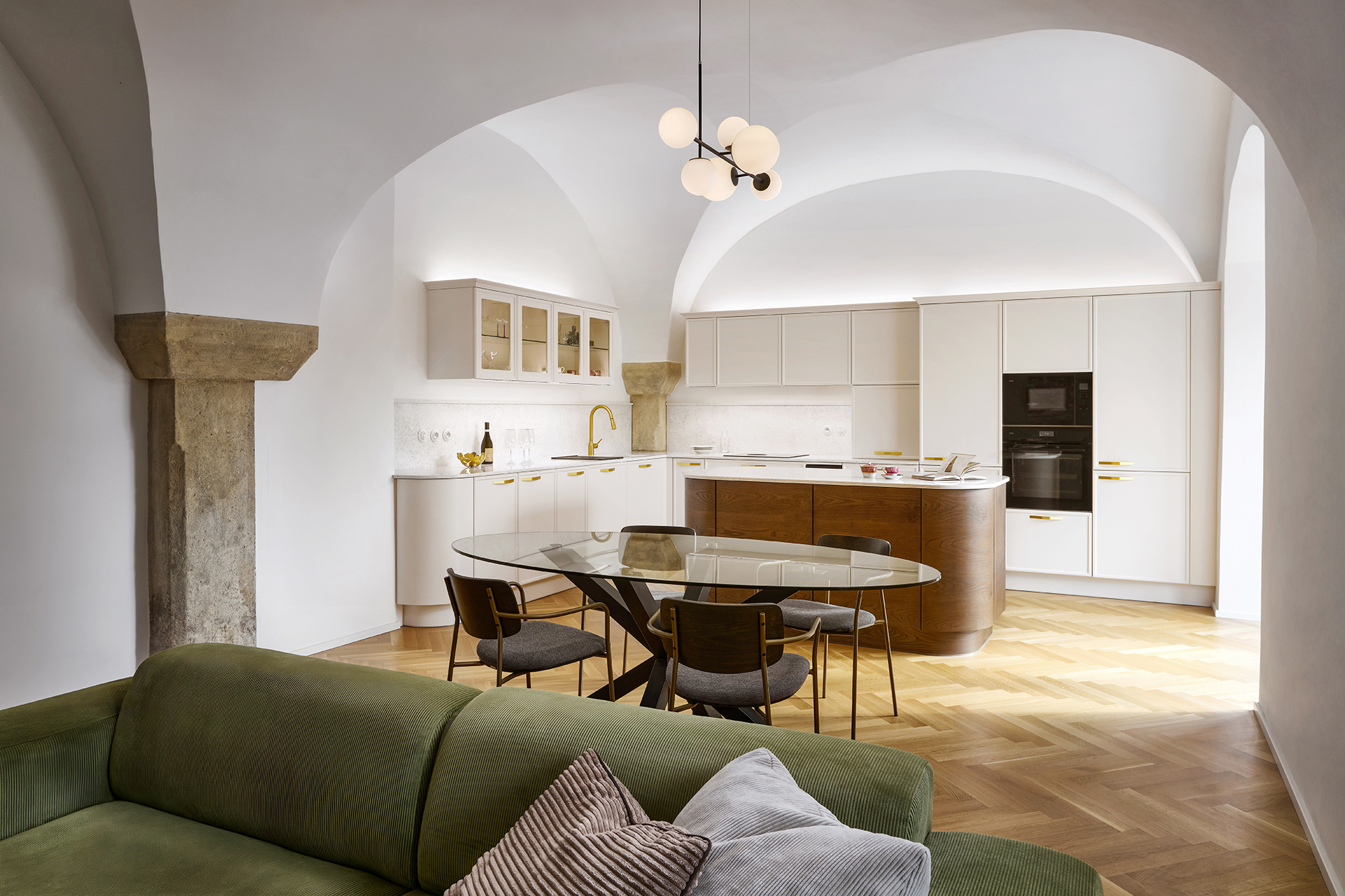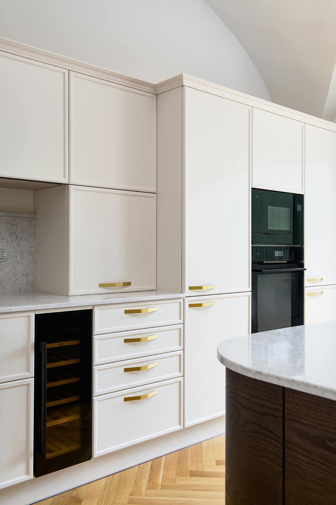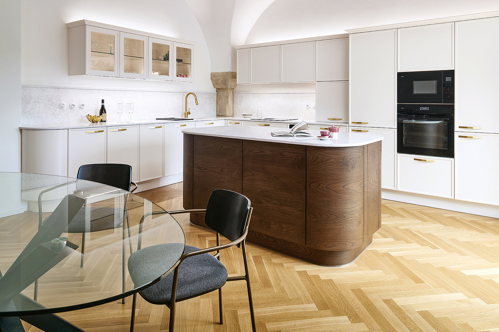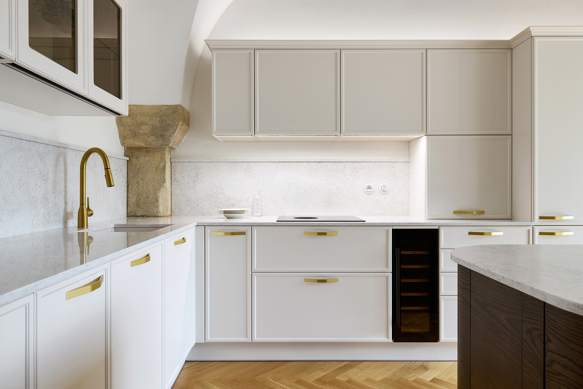 Le modèle LYON en laque mate blanc antique domine l'ensemble de l'espace et s'harmonise naturellement avec l'architecture historique grâce à sa teinte douce. Les formes minimalistes mettent en valeur la qualité de la fabrication et les détails : les poignées élégantes en laiton ou les vitrines rétroéclairées confèrent à l'intérieur légèreté et aération.