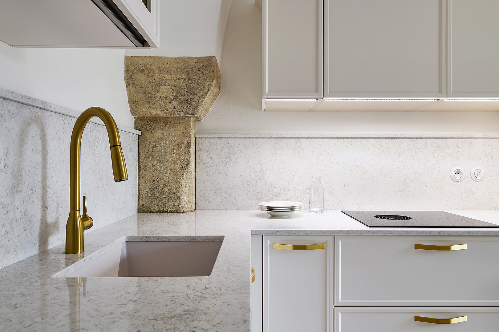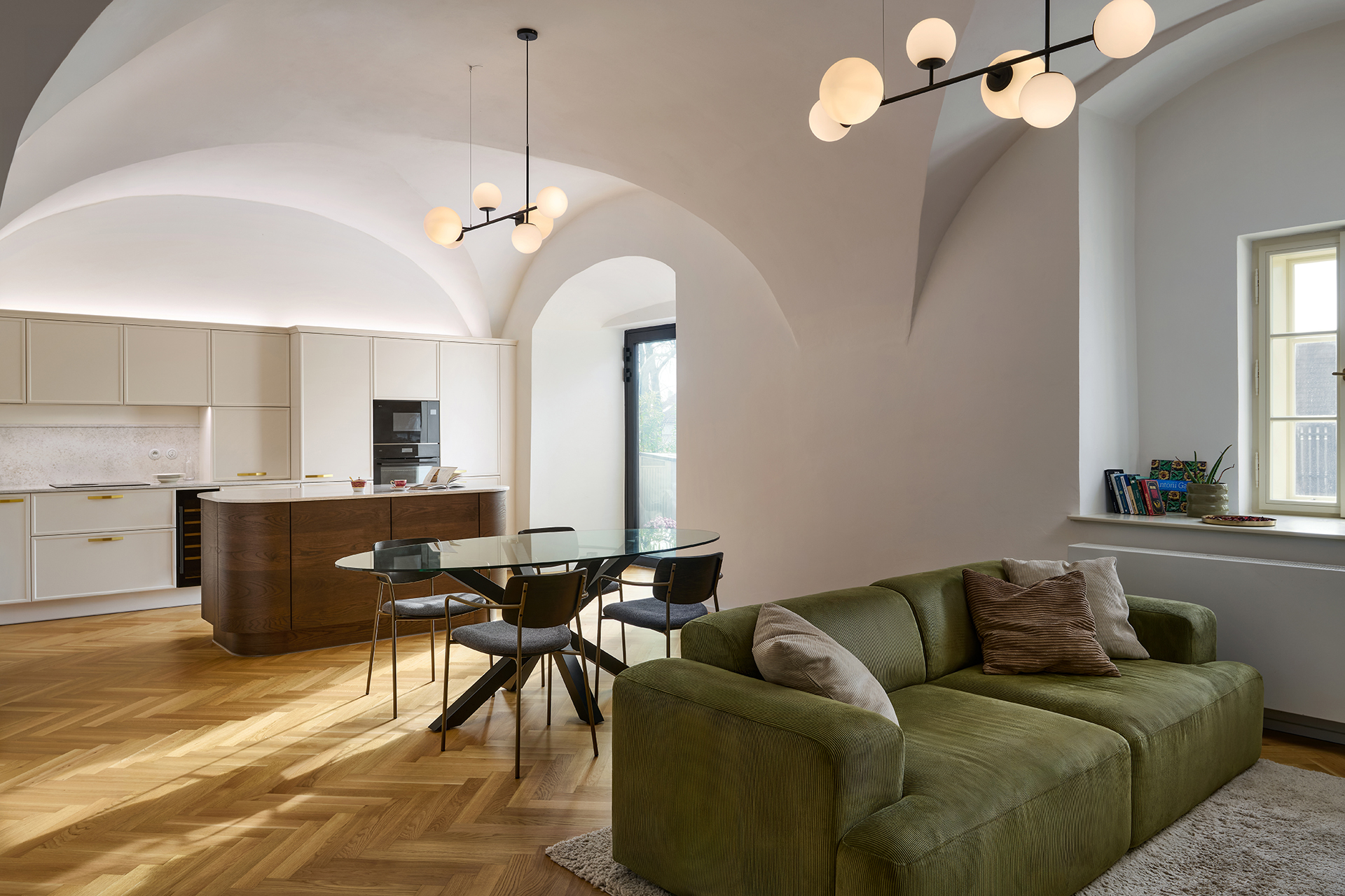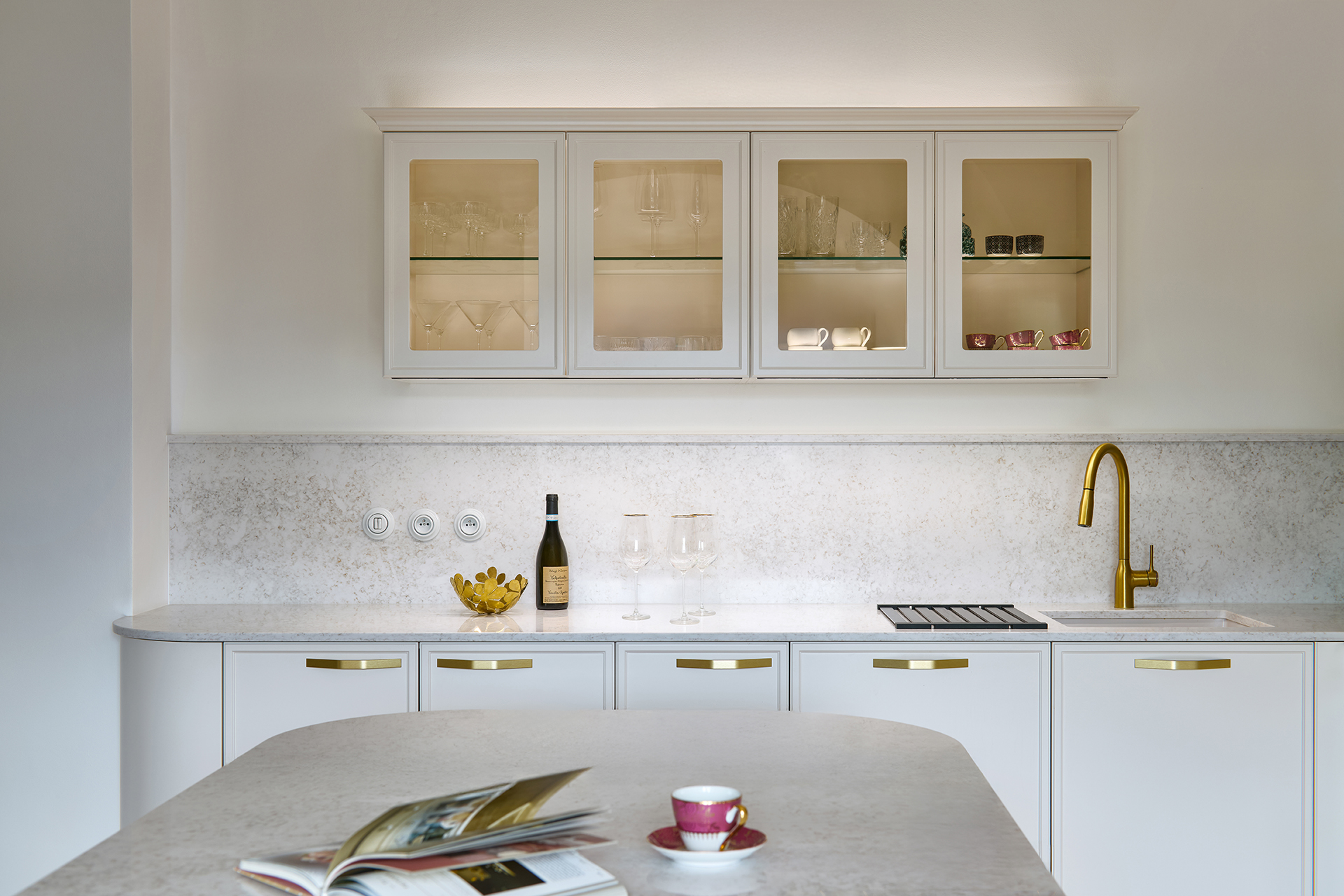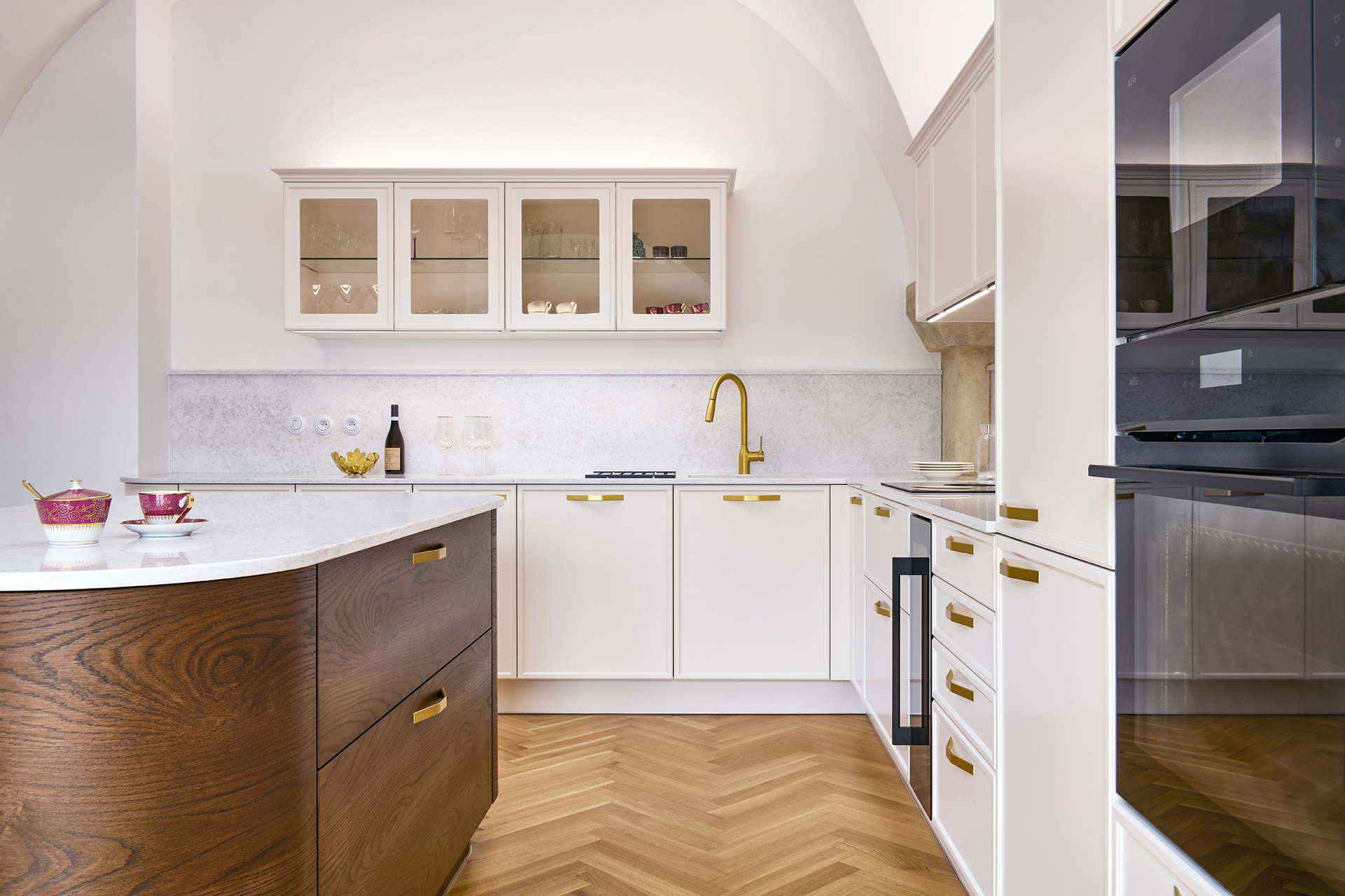 Le modèle LYON en laque mate blanc antique domine l'ensemble de l'espace et s'harmonise naturellement avec l'architecture historique grâce à sa teinte douce. Les formes minimalistes mettent en valeur la qualité de la fabrication et les détails : les poignées élégantes en laiton ou les vitrines rétroéclairées confèrent à l'intérieur légèreté et aération.