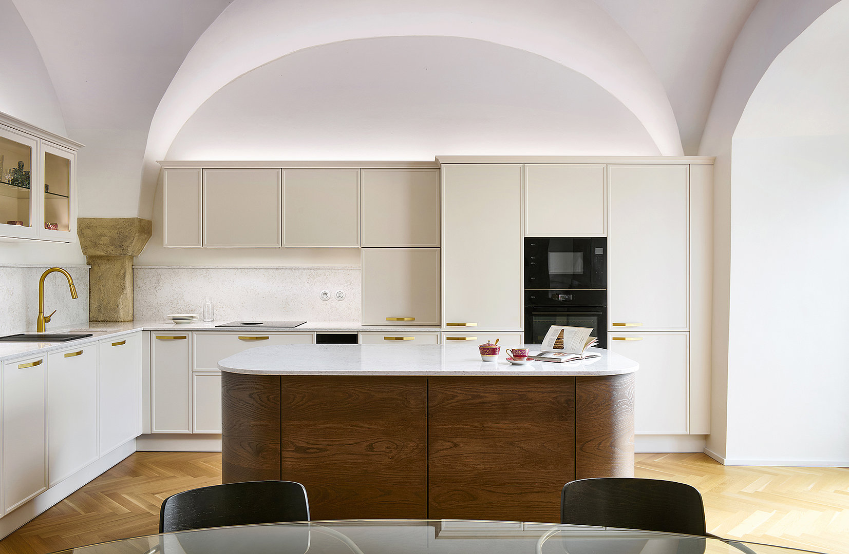 Dans le cadre unique d'un ancien château, une cuisine a été créée qui allie avec sensibilité l'histoire et la conception moderne du luxe. L'atmosphère des plafonds voûtés et des murs imposants constitue le décor idéal pour cette réalisation, où se marient des matériaux haut de gamme, une finition précise et des lignes fluides.