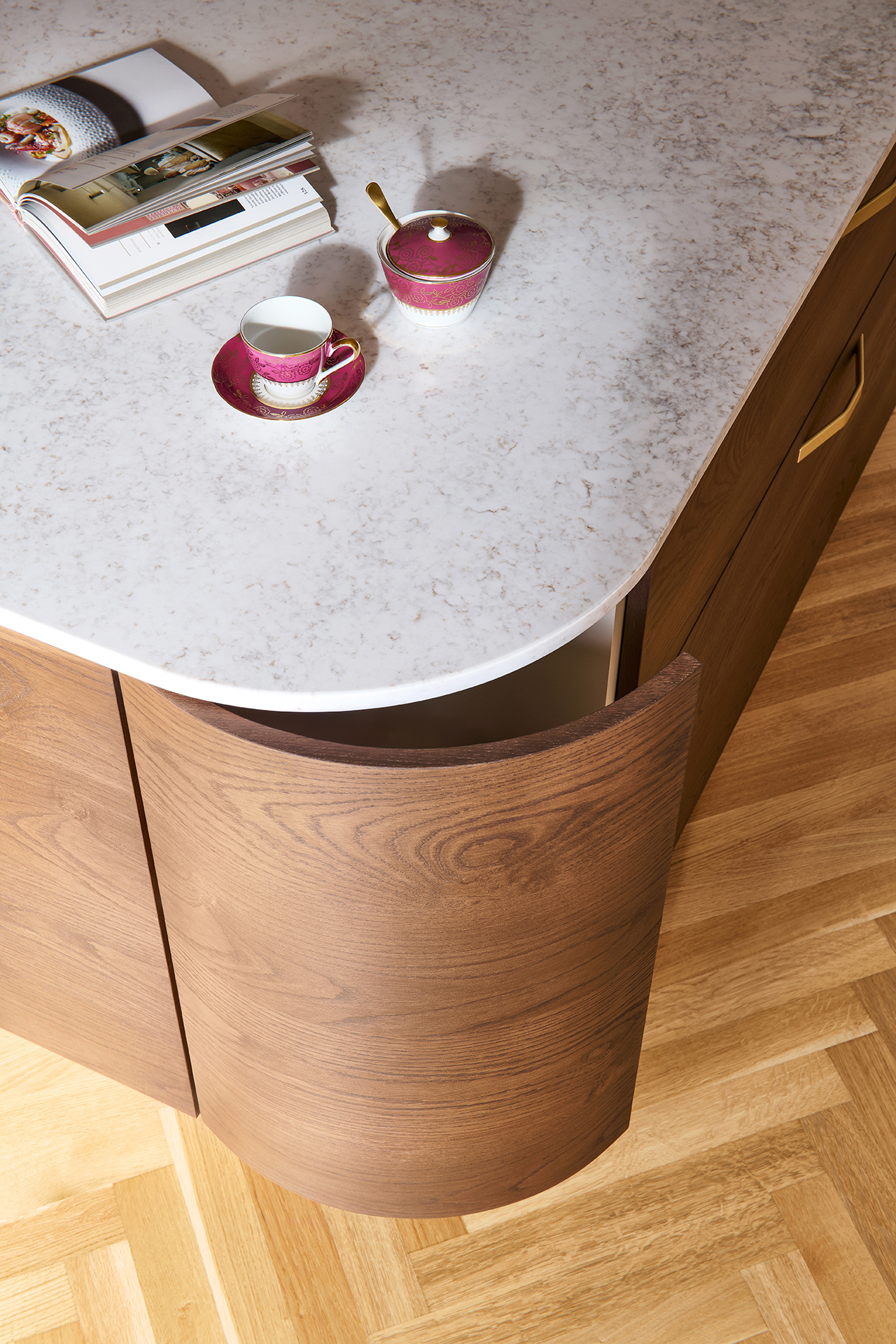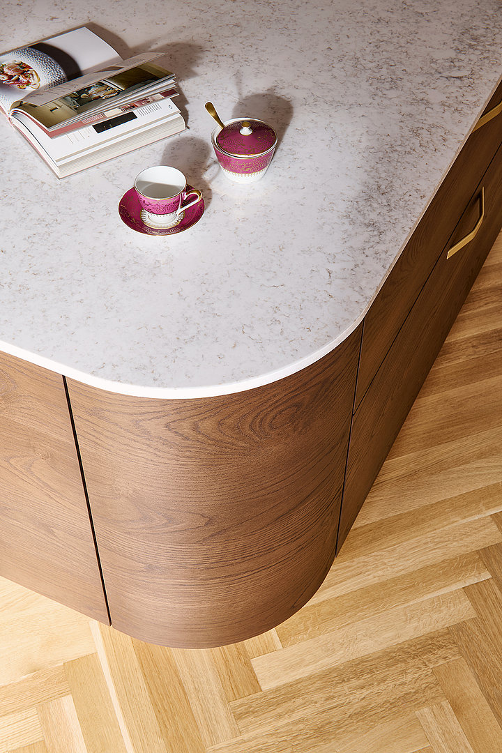 L'élément central et le point d'ancrage visuel de toute la cuisine est l'îlot LINE en chêne rustique brun. Les bords arrondis favorisent la fluidité des mouvements dans la pièce et adoucissent l'impression générale. La combinaison du bois naturel et de la pierre technique confère à l'îlot une profondeur visuelle et une sensation de qualité réelle au toucher. Le plan de travail haut de gamme Technistone Wedding Lily souligne le caractère exclusif tout en offrant une résistance maximale à l'usage quotidien.