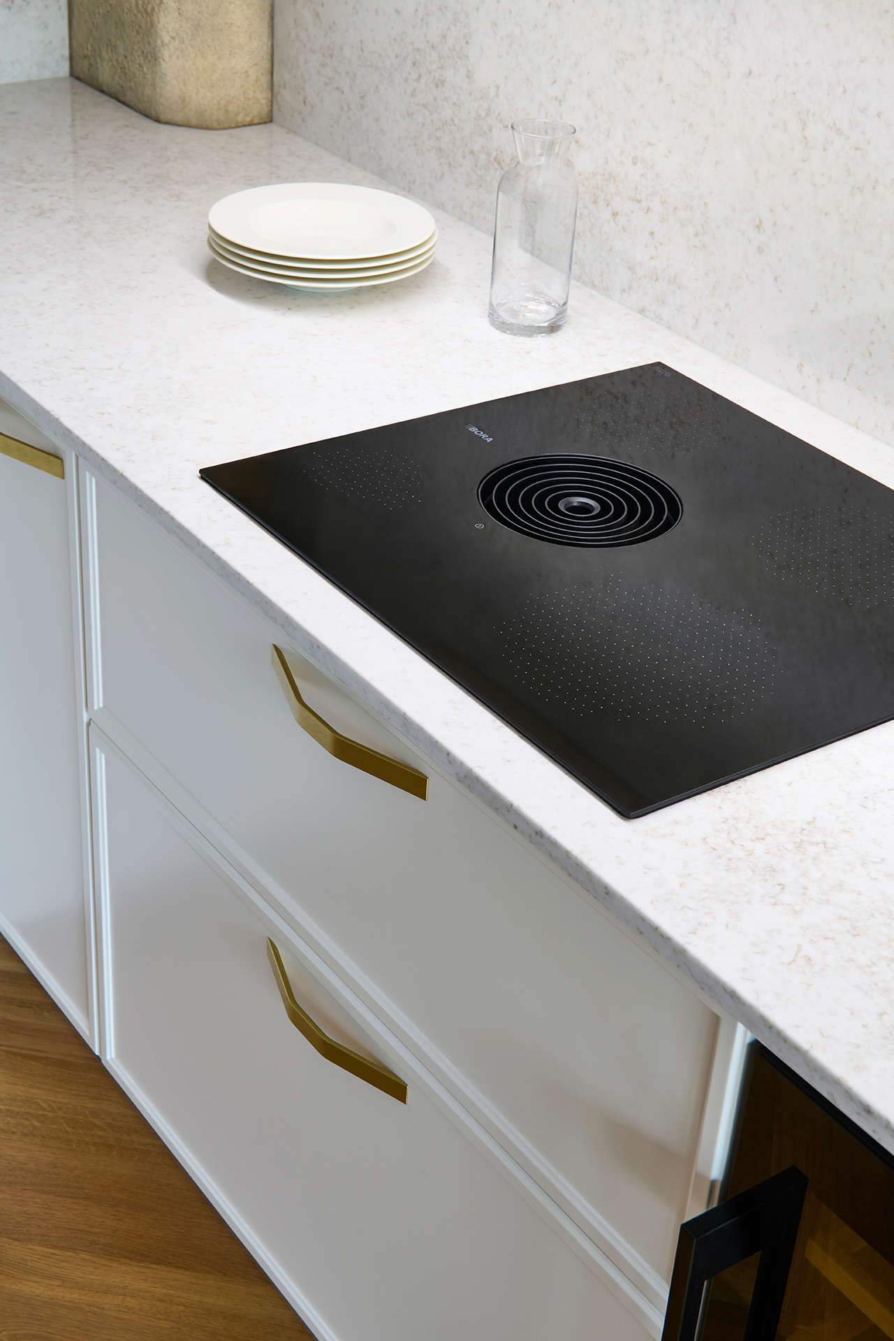 Derrière des lignes parfaitement épurées se cache une technologie moderne de la plus haute qualité. La plaque de cuisson BORA avec hotte intégrée, les appareils électroménagers AEG et l'évier en céramique SYSTEMCERAM sont élégamment dissimulés dans un ensemble qui donne une impression d'harmonie et de sérénité.