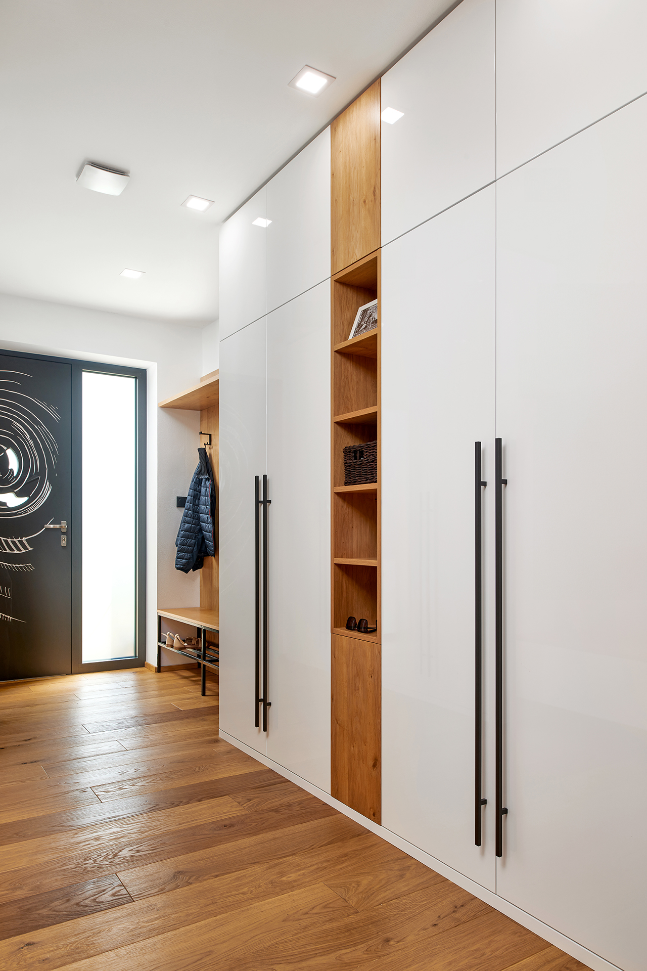 Vstupní hala je vizitkou každého domova. V tomto projektu jsme ji proměnili v moderní, elegantní a maximálně praktický prostor, který okamžitě upoutá.