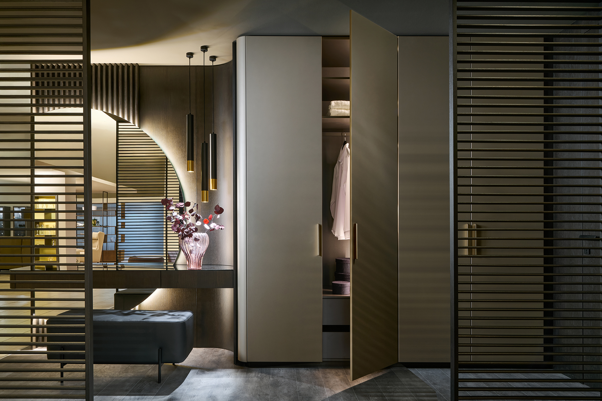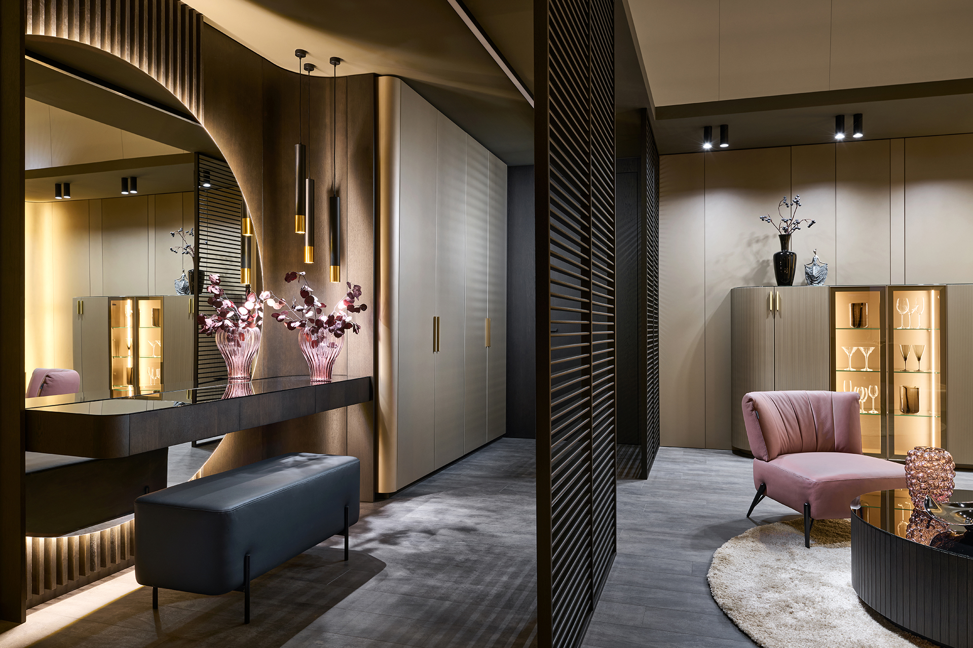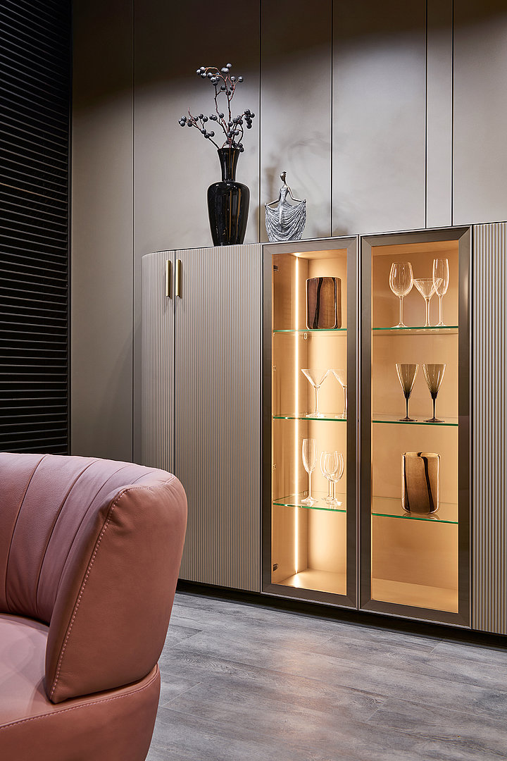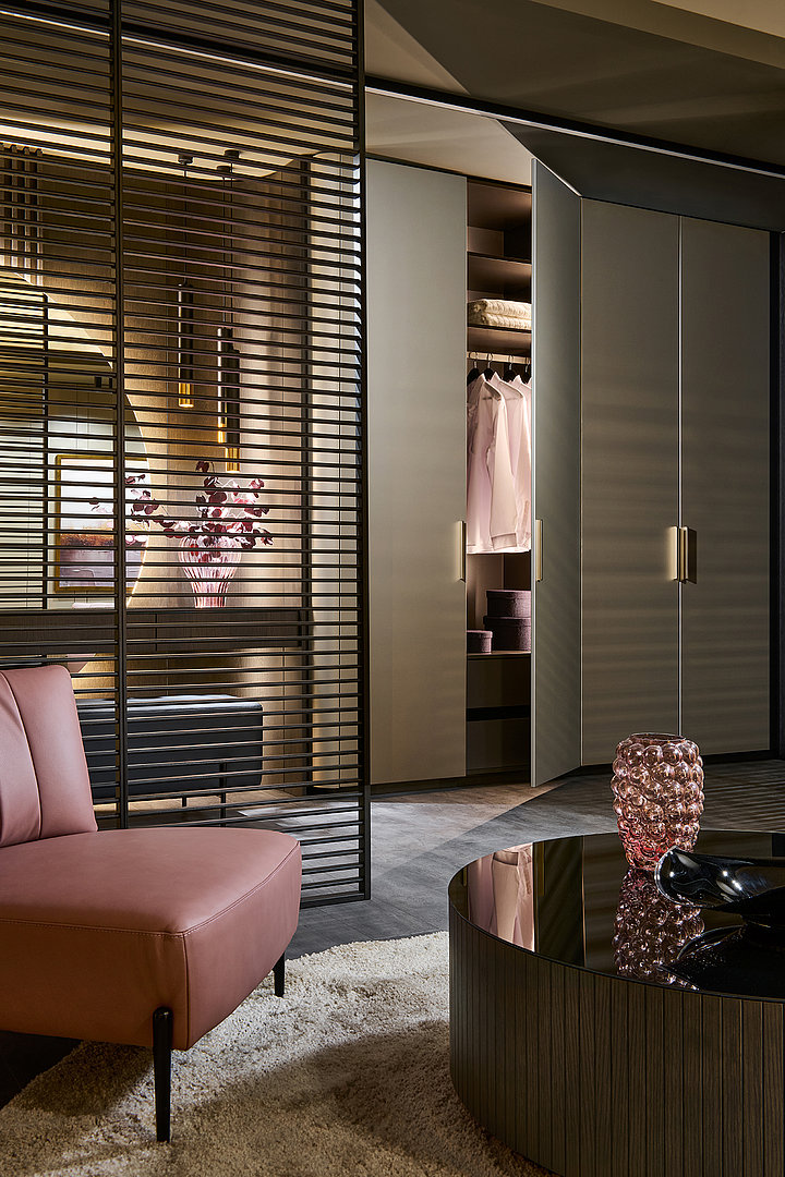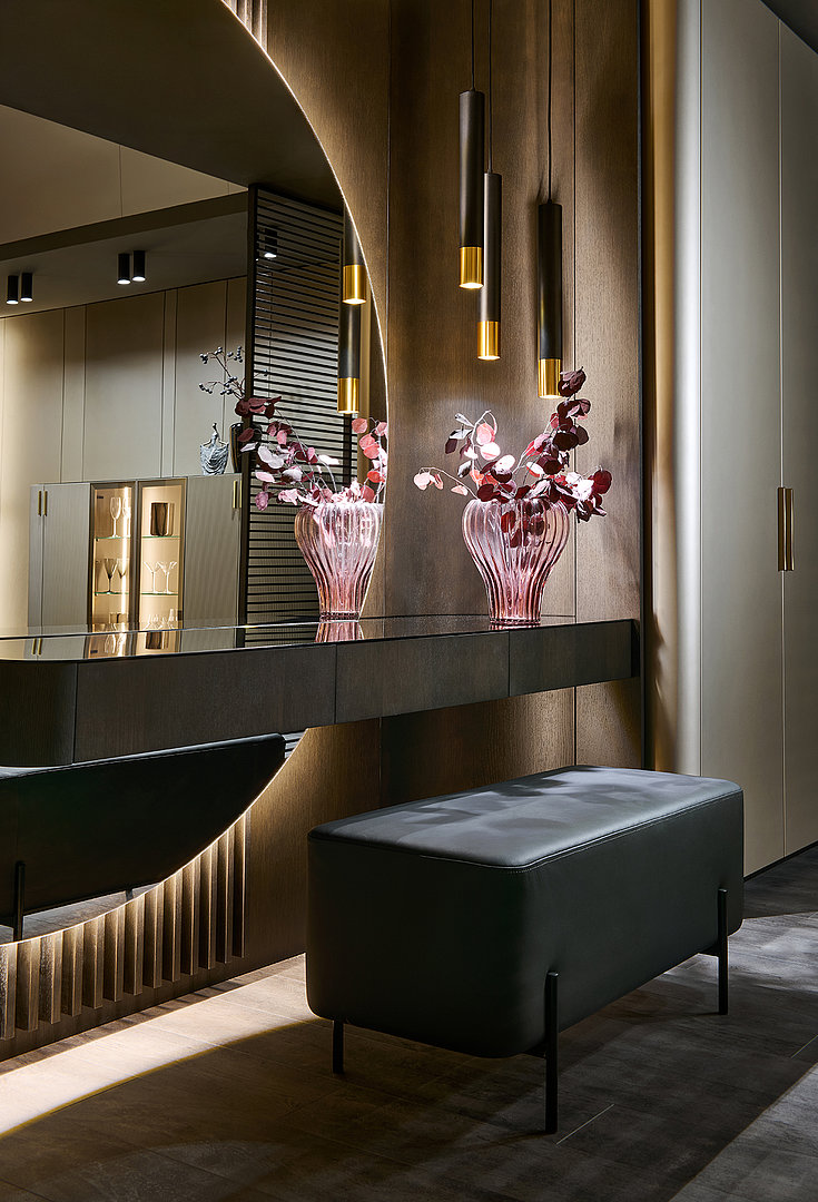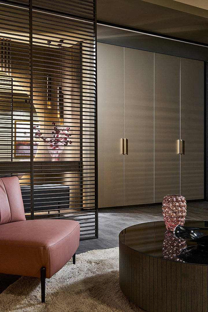 Precizní práce s rádiusy R25 a R80 umožňuje jednotlivým prvkům přirozeně navazovat a plynout bez rušivých hran. Výsledkem je prostředí, které působí harmonicky, klidně a zároveň mimořádně čistě. Sofistikovaný odstín Pearl Bronze s metalickým nádechem mění svůj charakter s každým dopadajícím paprskem světla – od hluboké sametové bronzi až po jemné zlatavé odlesky.