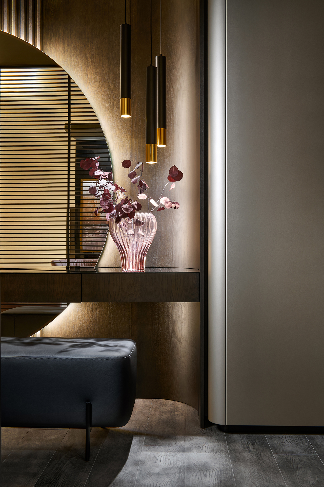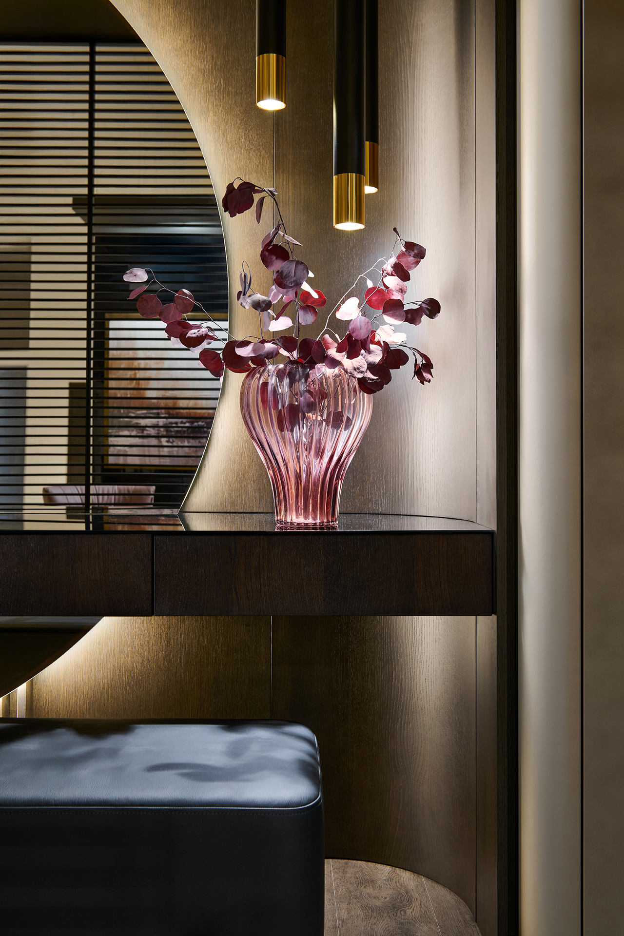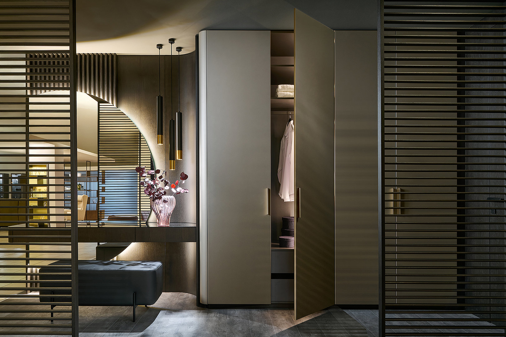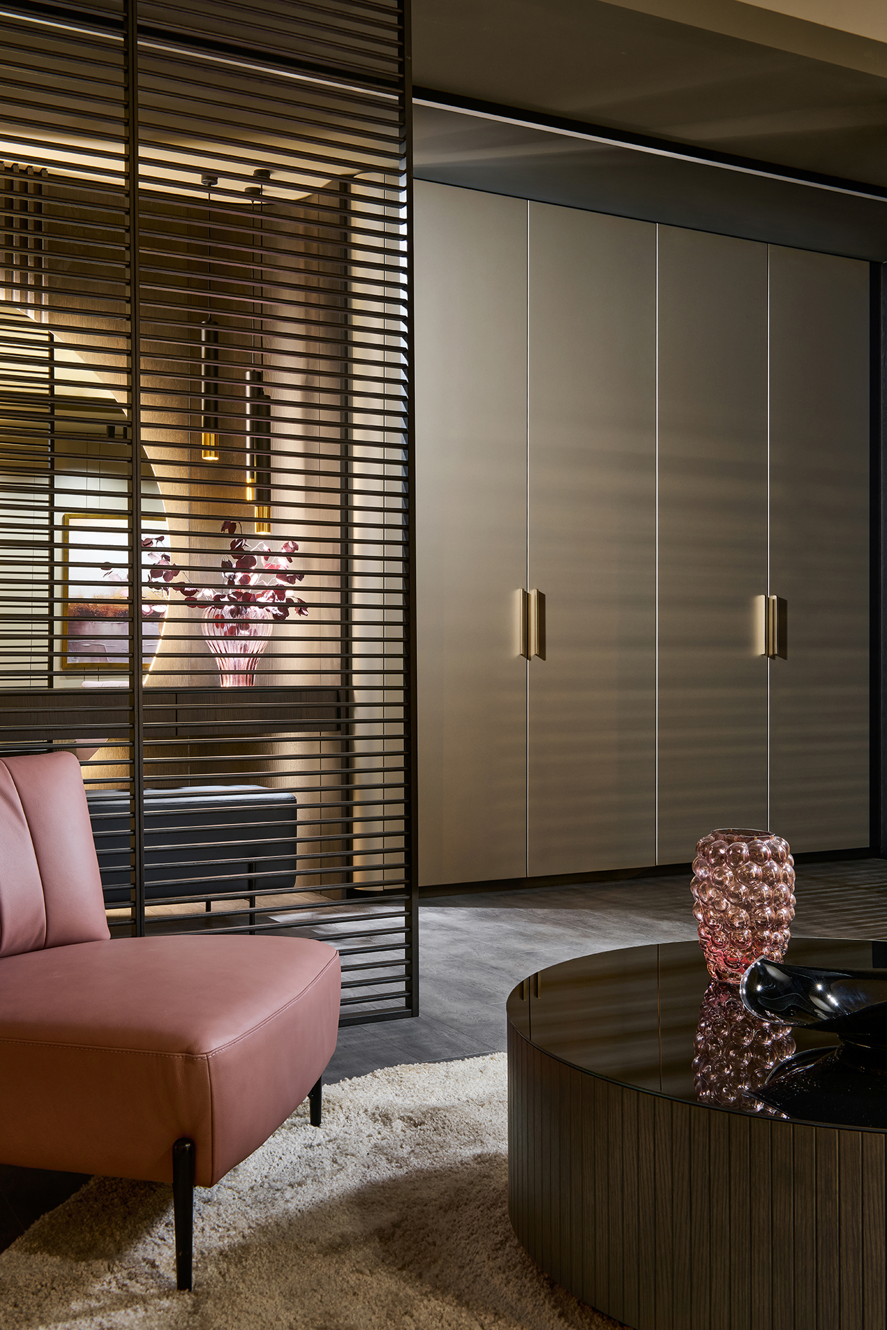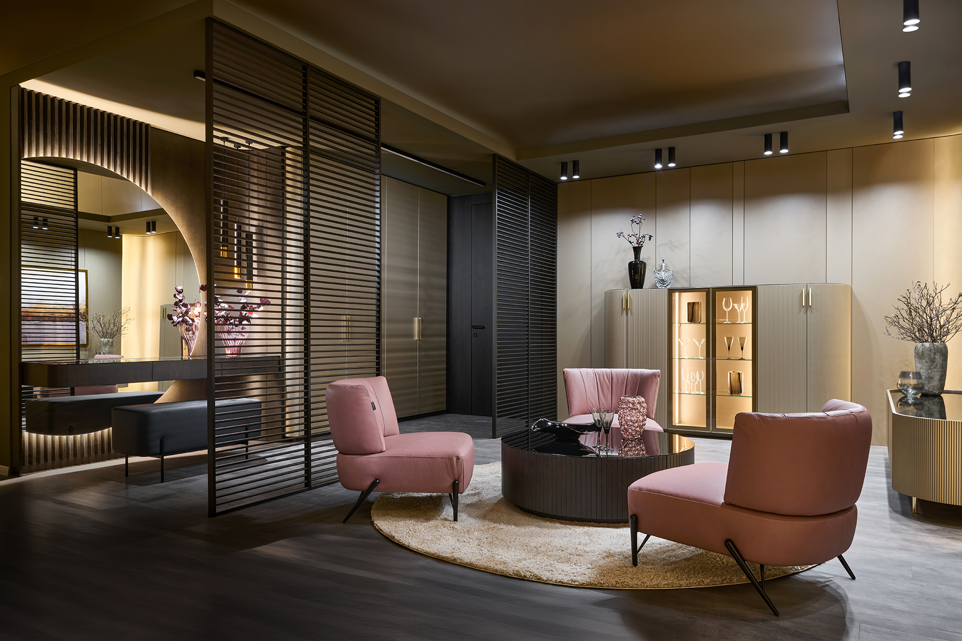 Precizní práce s rádiusy R25 a R80 umožňuje jednotlivým prvkům přirozeně navazovat a plynout bez rušivých hran. Výsledkem je prostředí, které působí harmonicky, klidně a zároveň mimořádně čistě. Sofistikovaný odstín Pearl Bronze s metalickým nádechem mění svůj charakter s každým dopadajícím paprskem světla – od hluboké sametové bronzi až po jemné zlatavé odlesky.