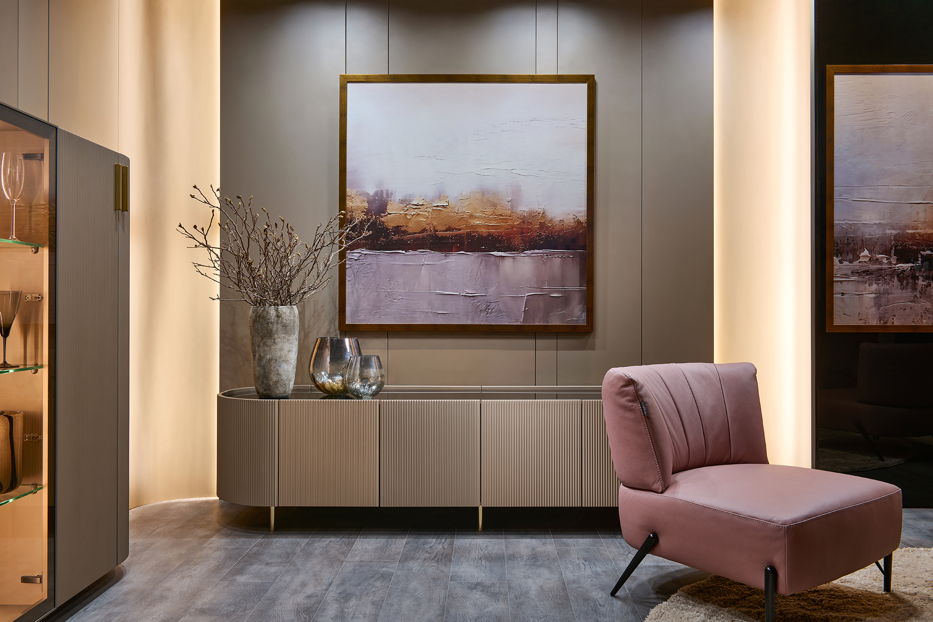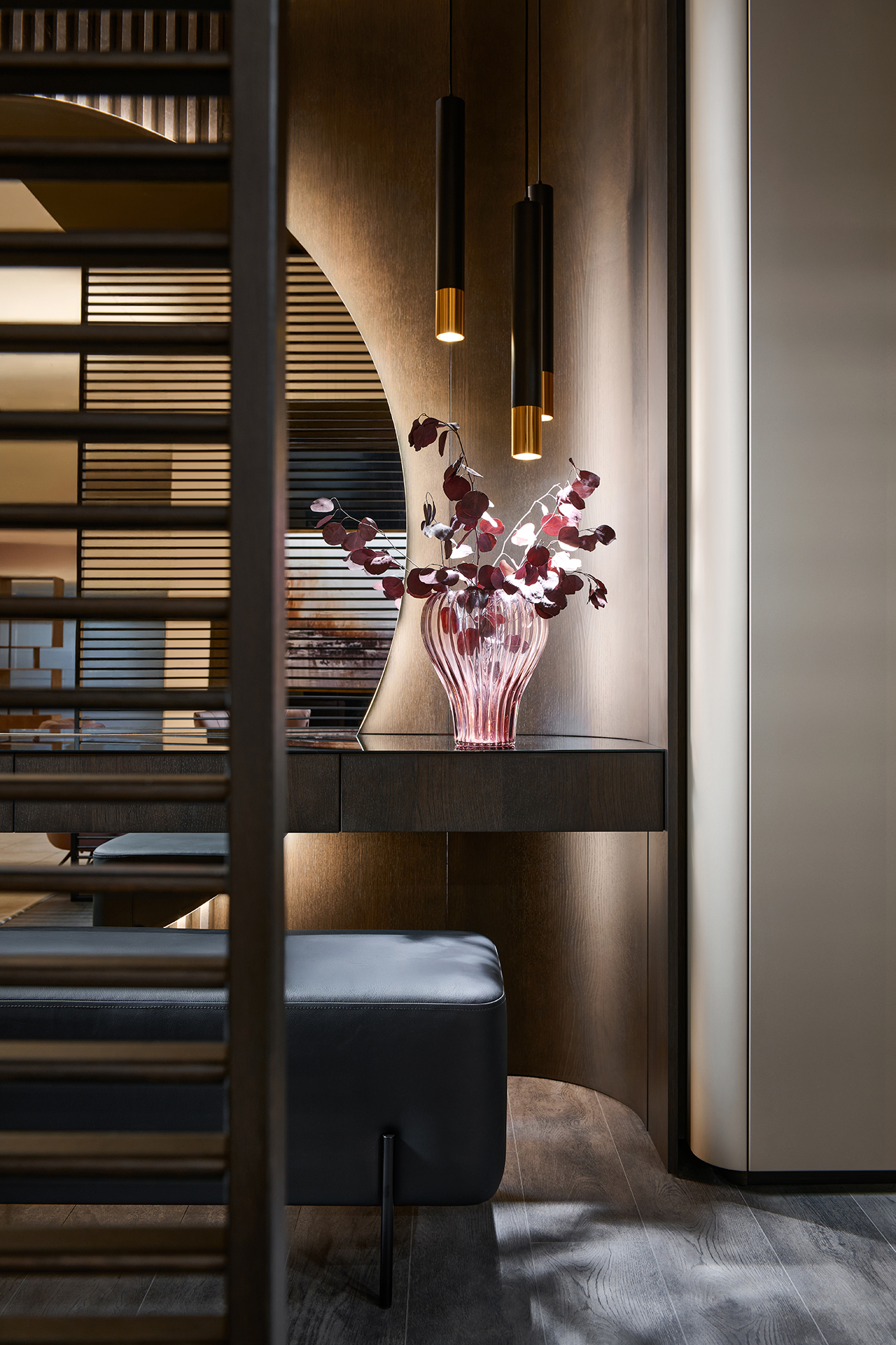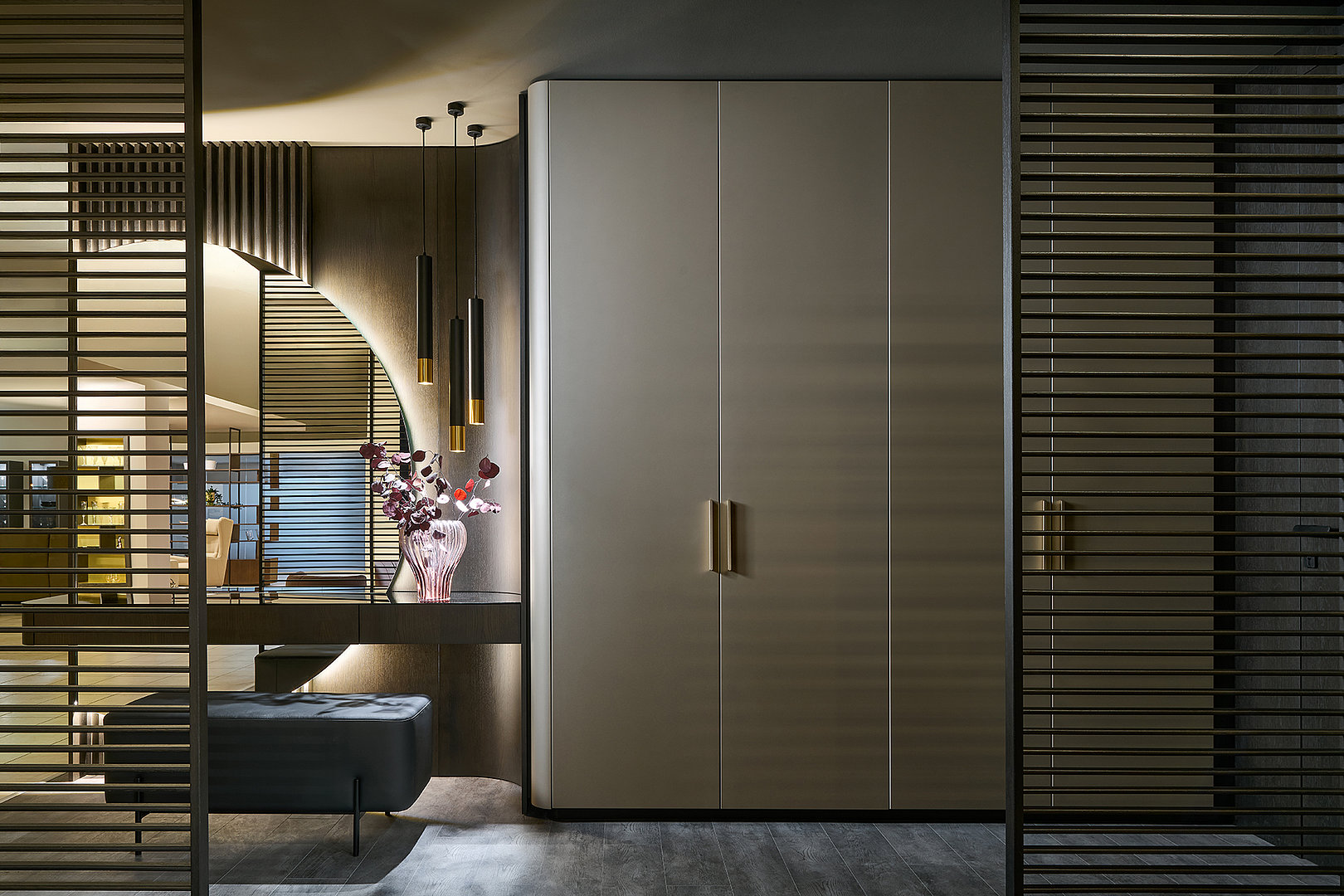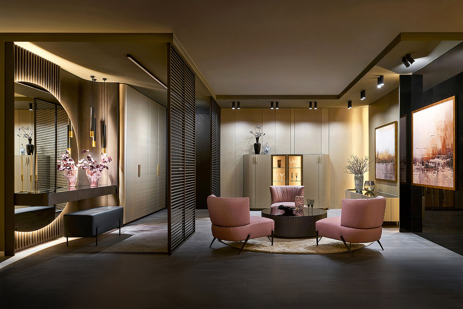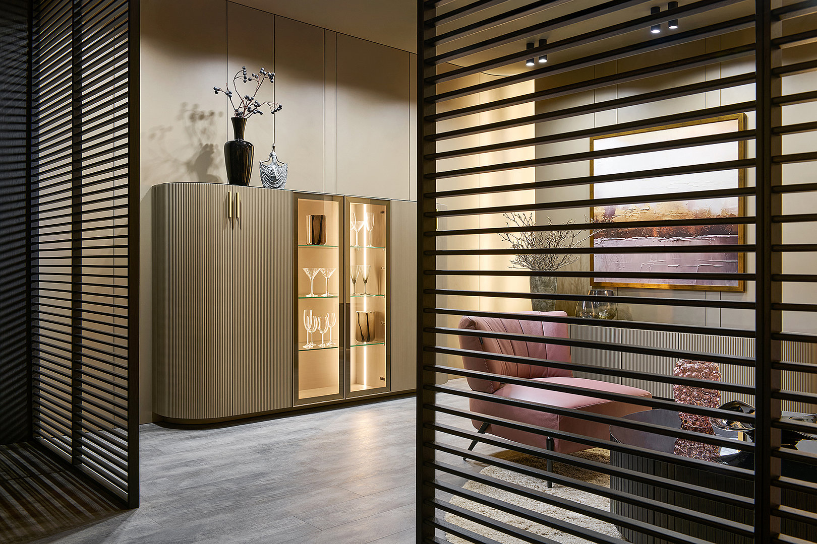 Precizní práce s rádiusy R25 a R80 umožňuje jednotlivým prvkům přirozeně navazovat a plynout bez rušivých hran. Výsledkem je prostředí, které působí harmonicky, klidně a zároveň mimořádně čistě. Sofistikovaný odstín Pearl Bronze s metalickým nádechem mění svůj charakter s každým dopadajícím paprskem světla – od hluboké sametové bronzi až po jemné zlatavé odlesky.