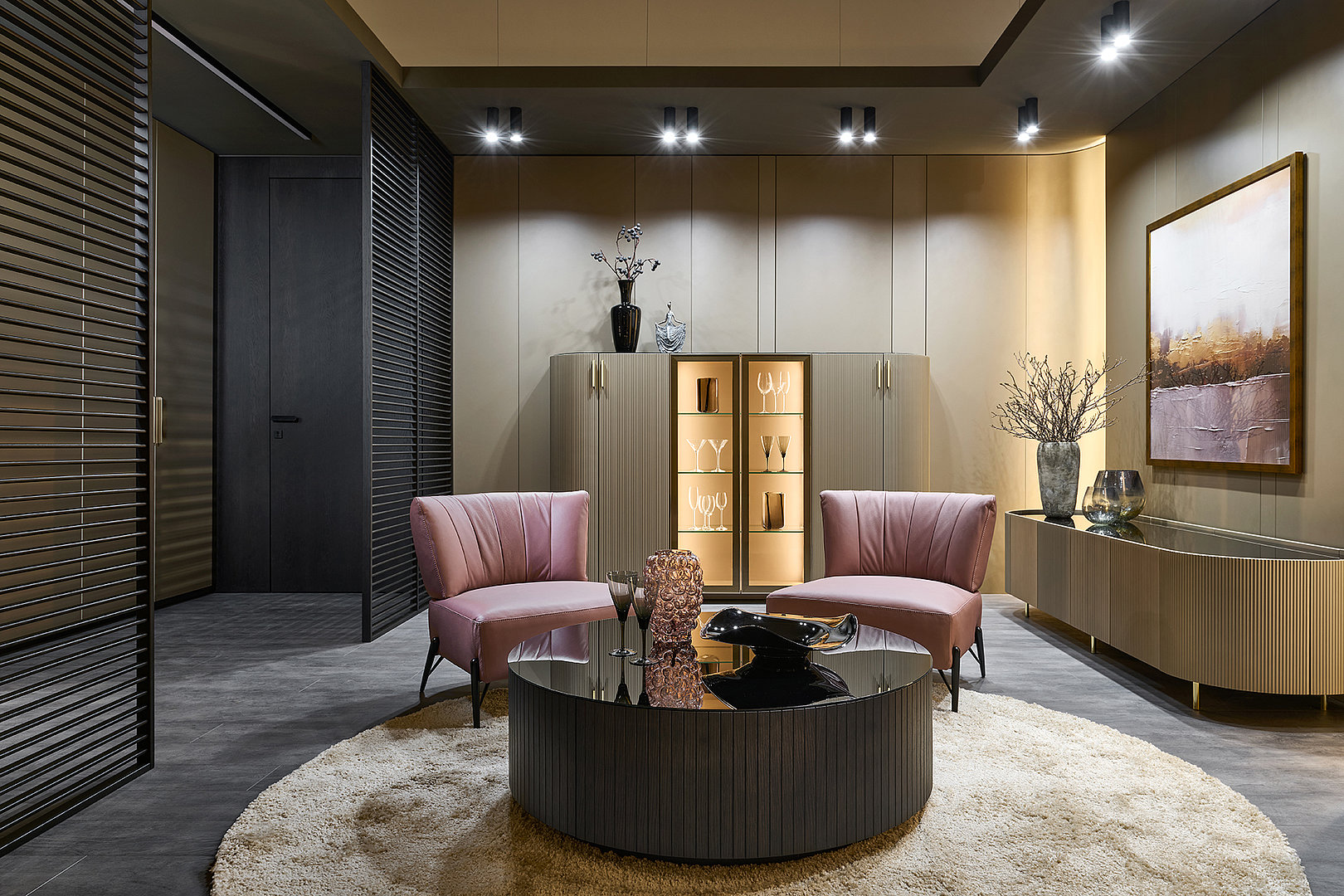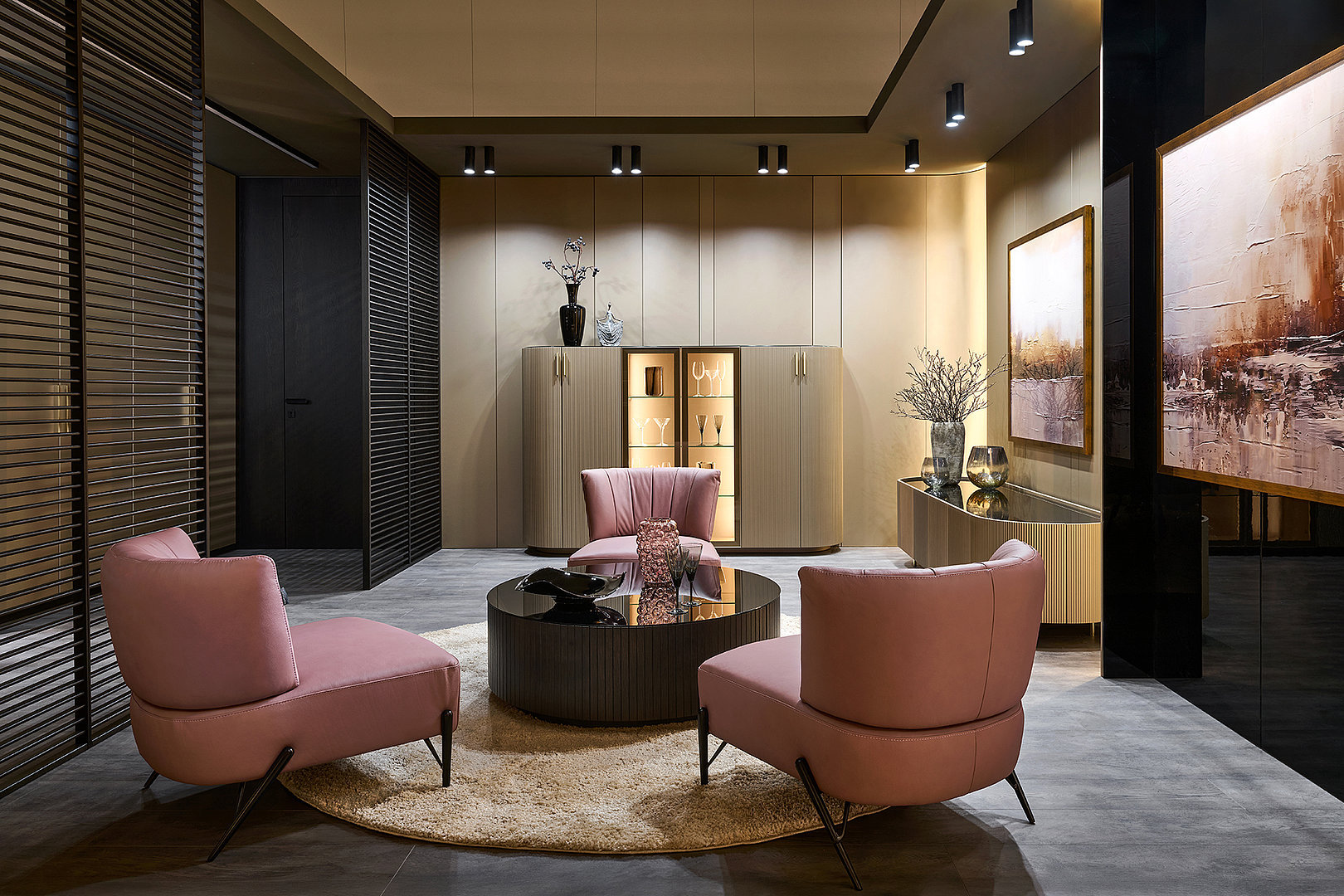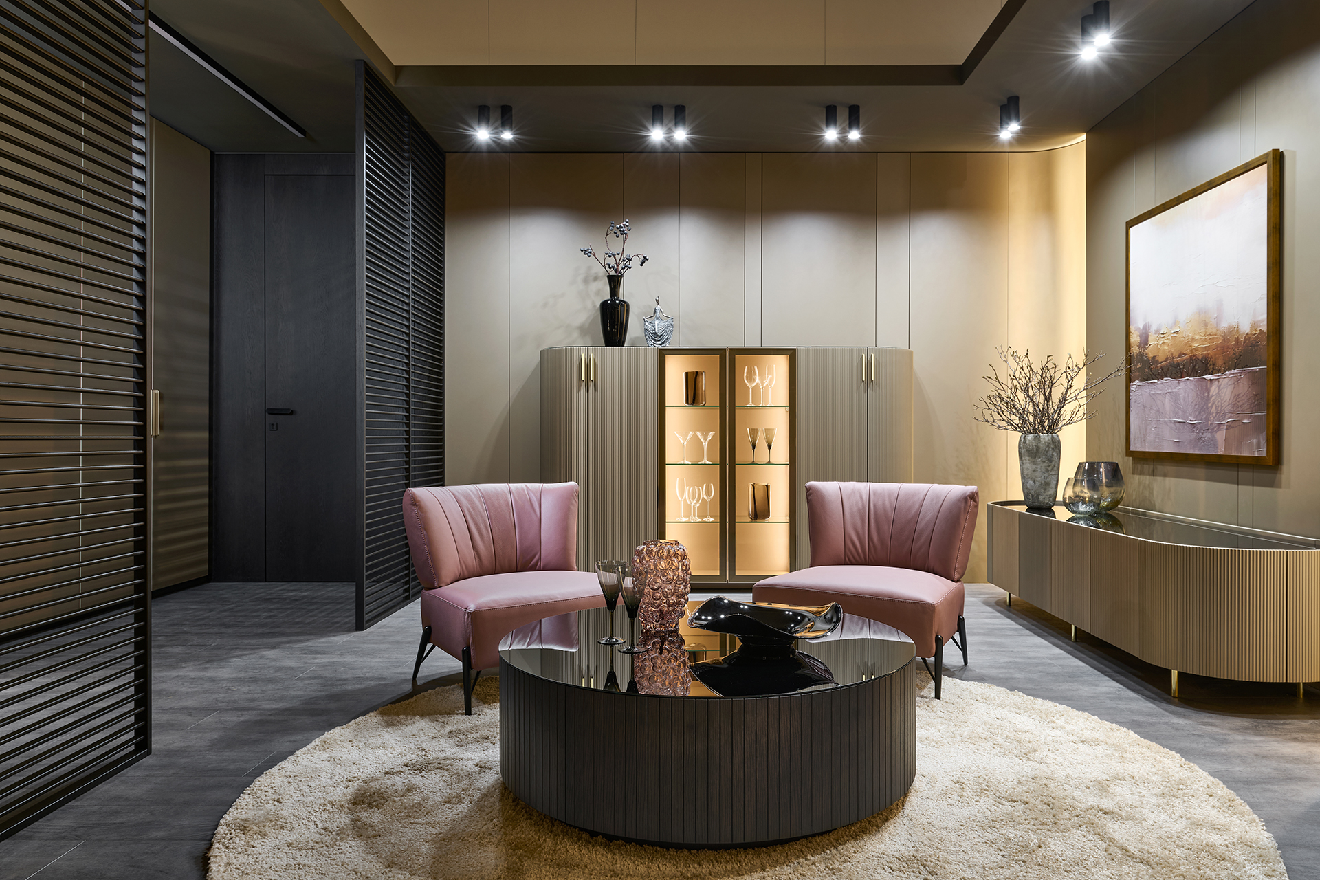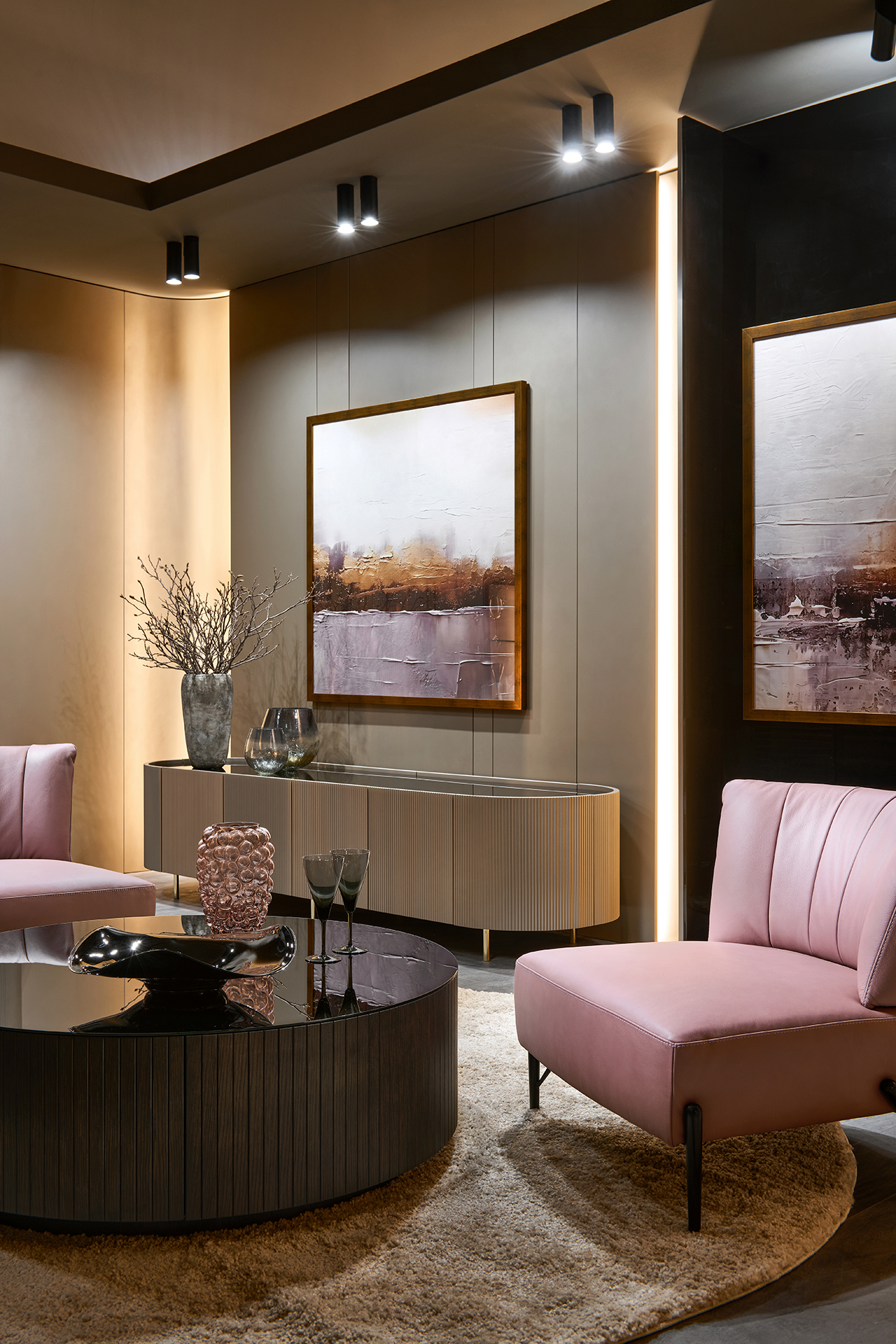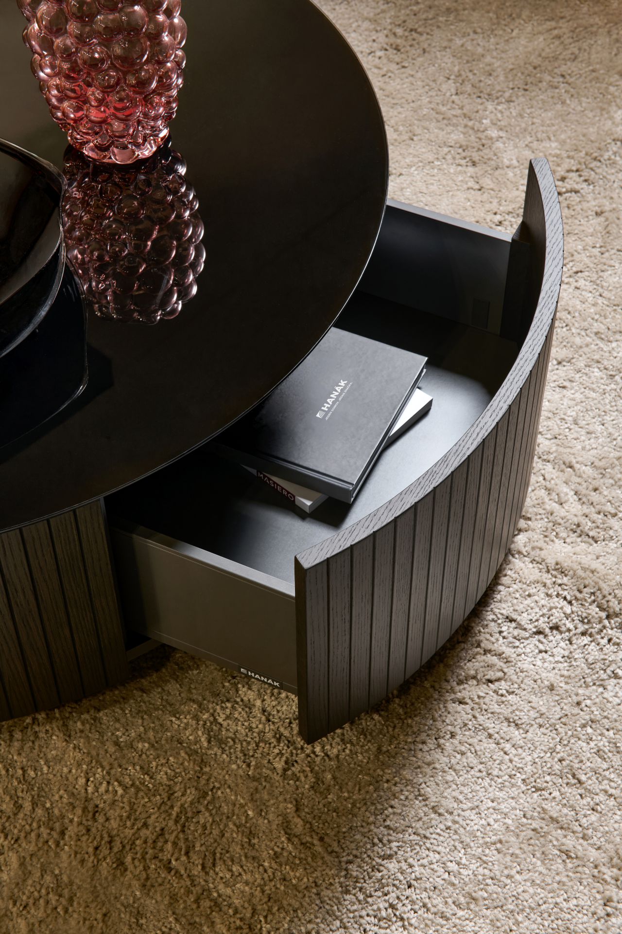 Celou kompozici ukotvuje ikonický kulatý stolek z amerického dubu v provedení Carbon, navržený jako atypické řešení na míru. Jeho dvířka v designu MIAMI dodávají celku charakter a zároveň ukrývají praktický úložný prostor, který podtrhuje důraz na detail i funkčnost.