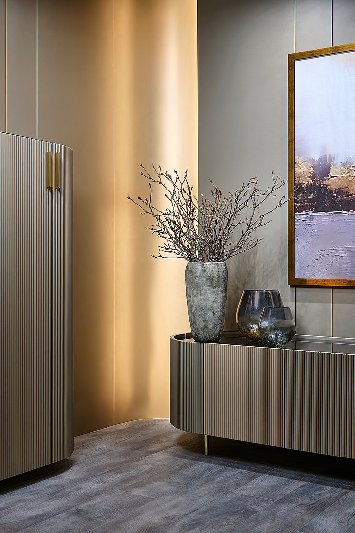 Vstupte do prostoru, kde se čas přirozeně zpomaluje a estetika přerůstá v hluboký prožitek. Tato expozice v našem studiu je oslavou moderního luxusu, který staví na promyšlené práci se strukturou a výběru ušlechtilých materiálů. Dominantním prvkem interiéru jsou plynulé, organicky tvarované křivky v provedení WAVE, které do něj vnášejí jemný rytmus a vizuální lehkost.