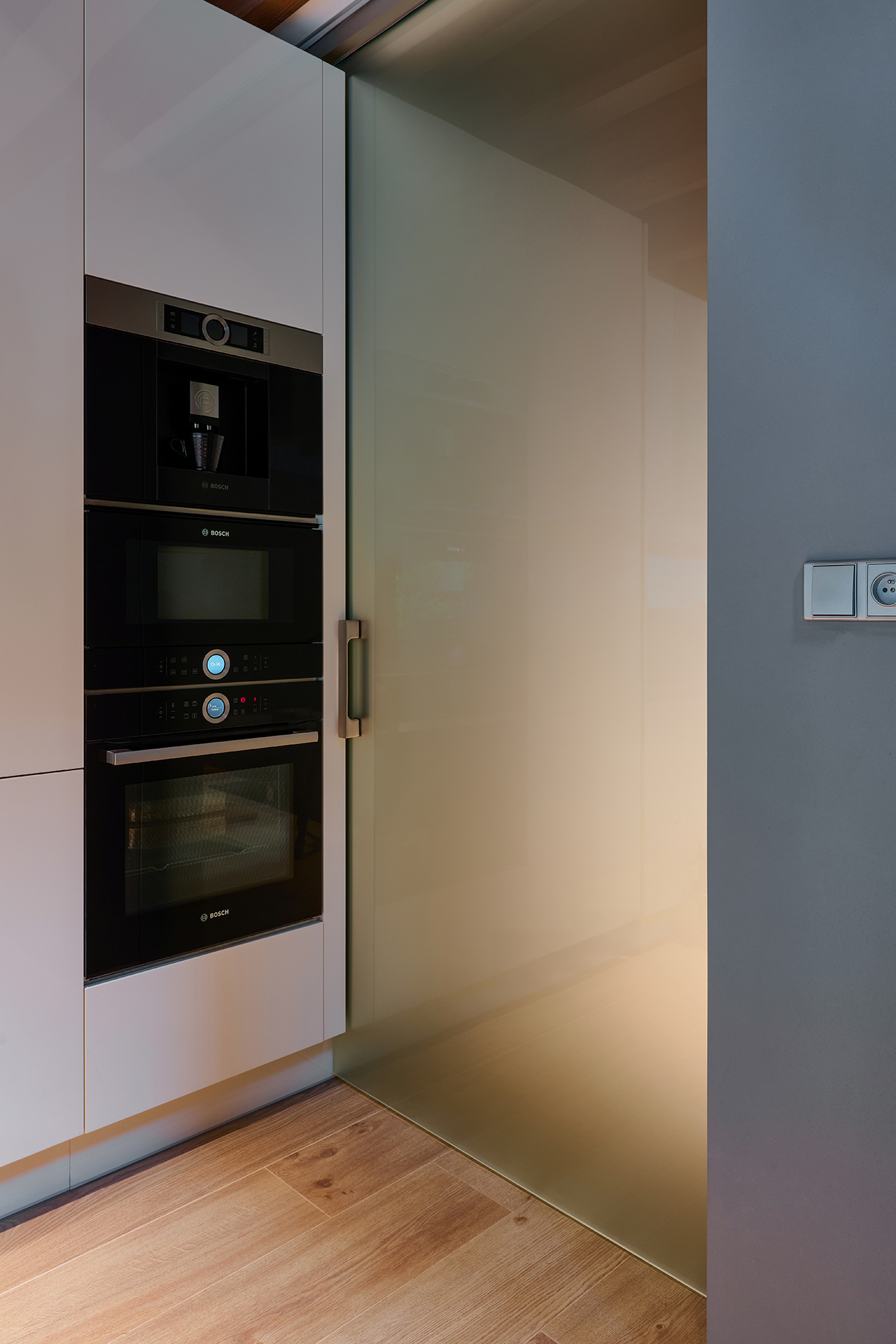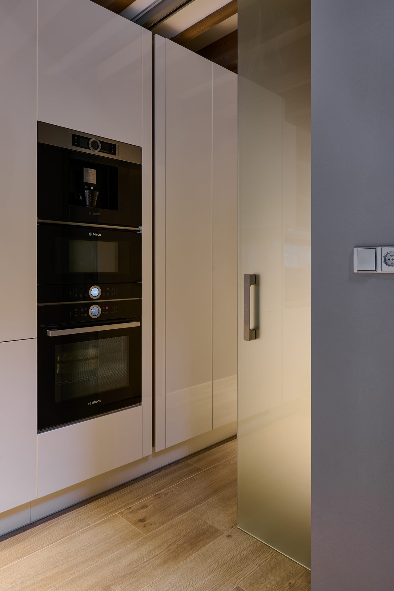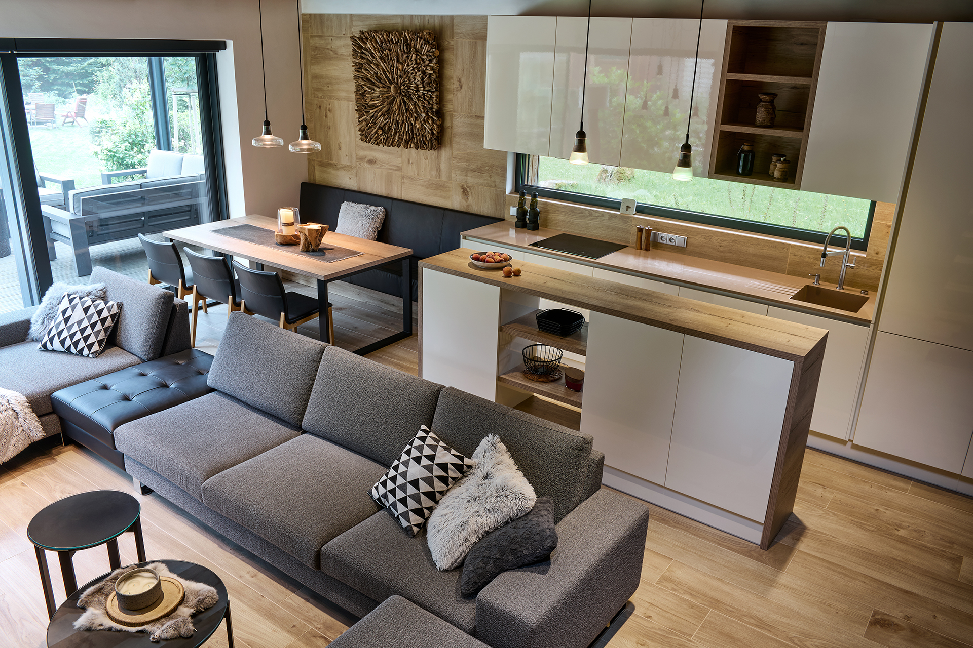 Kuchyně ELITE dominuje otevřené obytné části, kde se dekor lesklé magnolie snoubí se zlatým dubem a pracovní deskou Polyston. Světlé plochy a čisté tvary prostor opticky odlehčují, zatímco struktura dřeva mu propůjčuje teplý a příjemný tón. Na kuchyň navazuje atypický jídelní set – stůl a lavice čalouněná v kůži tvoří praktické a elegantní řešení pro každodenní stolování.