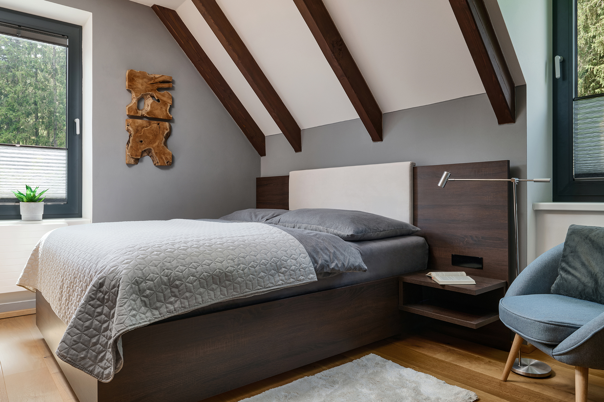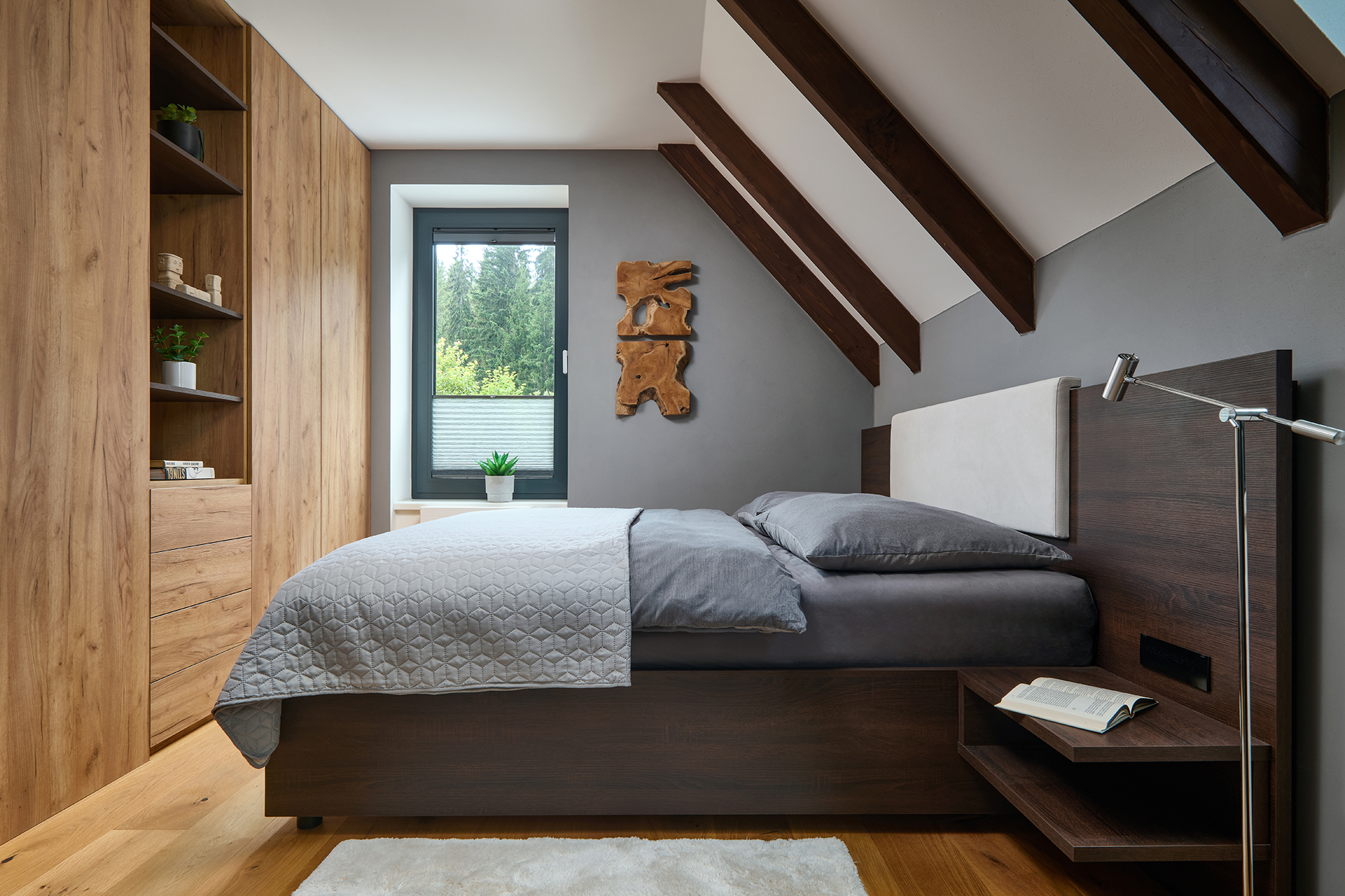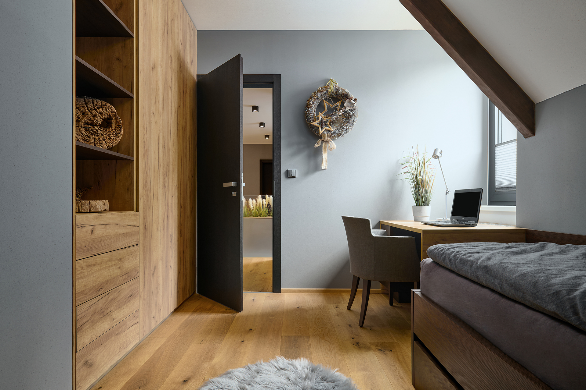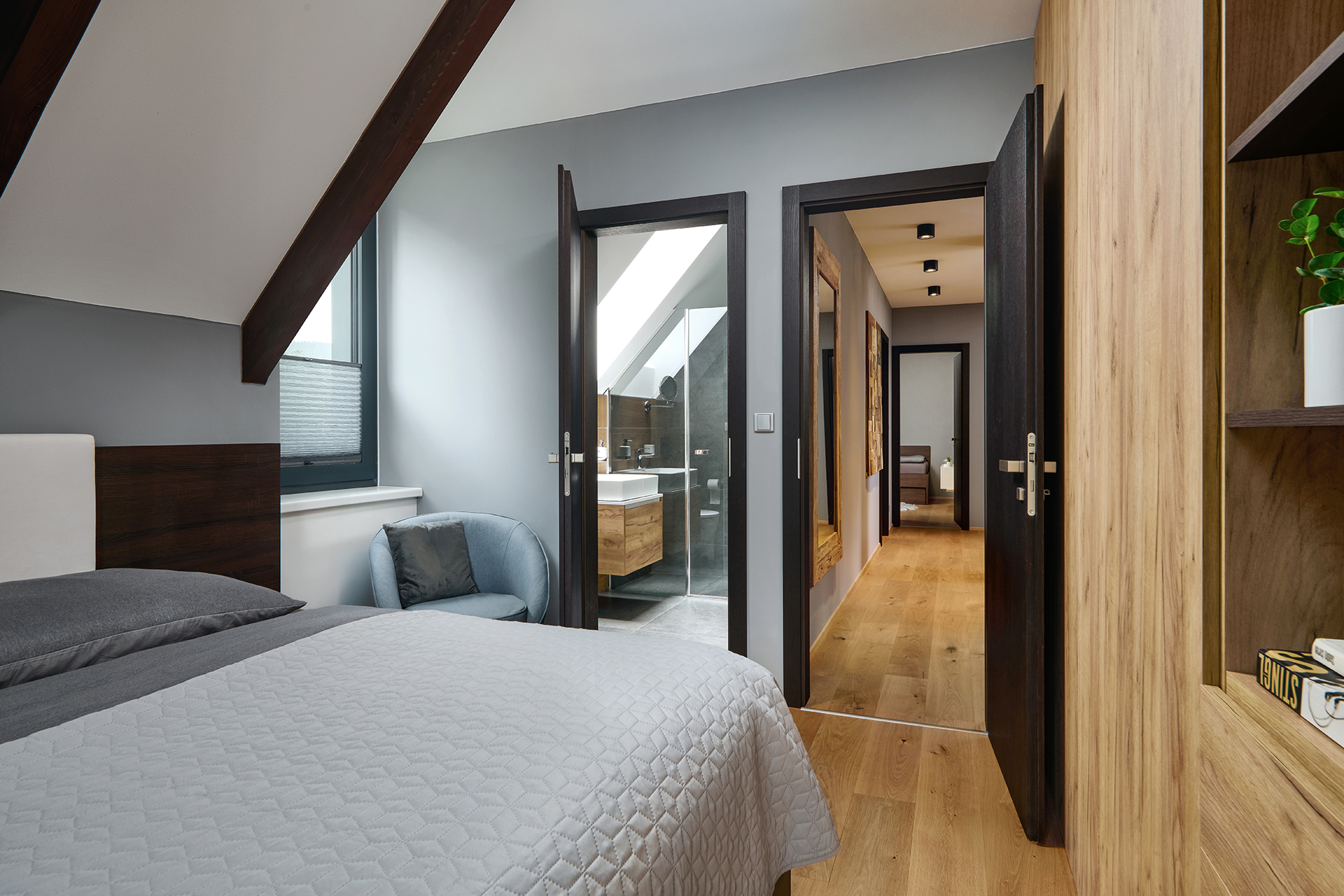 Ložnice a pokoje pro hosty jsou sladěny v jednotném moderním stylu, který podtrhuje dekor šatních skříní OPTIMA. Zatímco postele s nočními stolky zajišťují především pohodlný odpočinek, speciální výsuvné postele a křeslo EFFECT proměňují prostor v útulné a praktické zázemí pro hosty. Na stejný koncept navazuje i koupelna - kombinace dřeva a šedých tónů zde působí uklidňujícím dojmem a podporuje relaxaci.