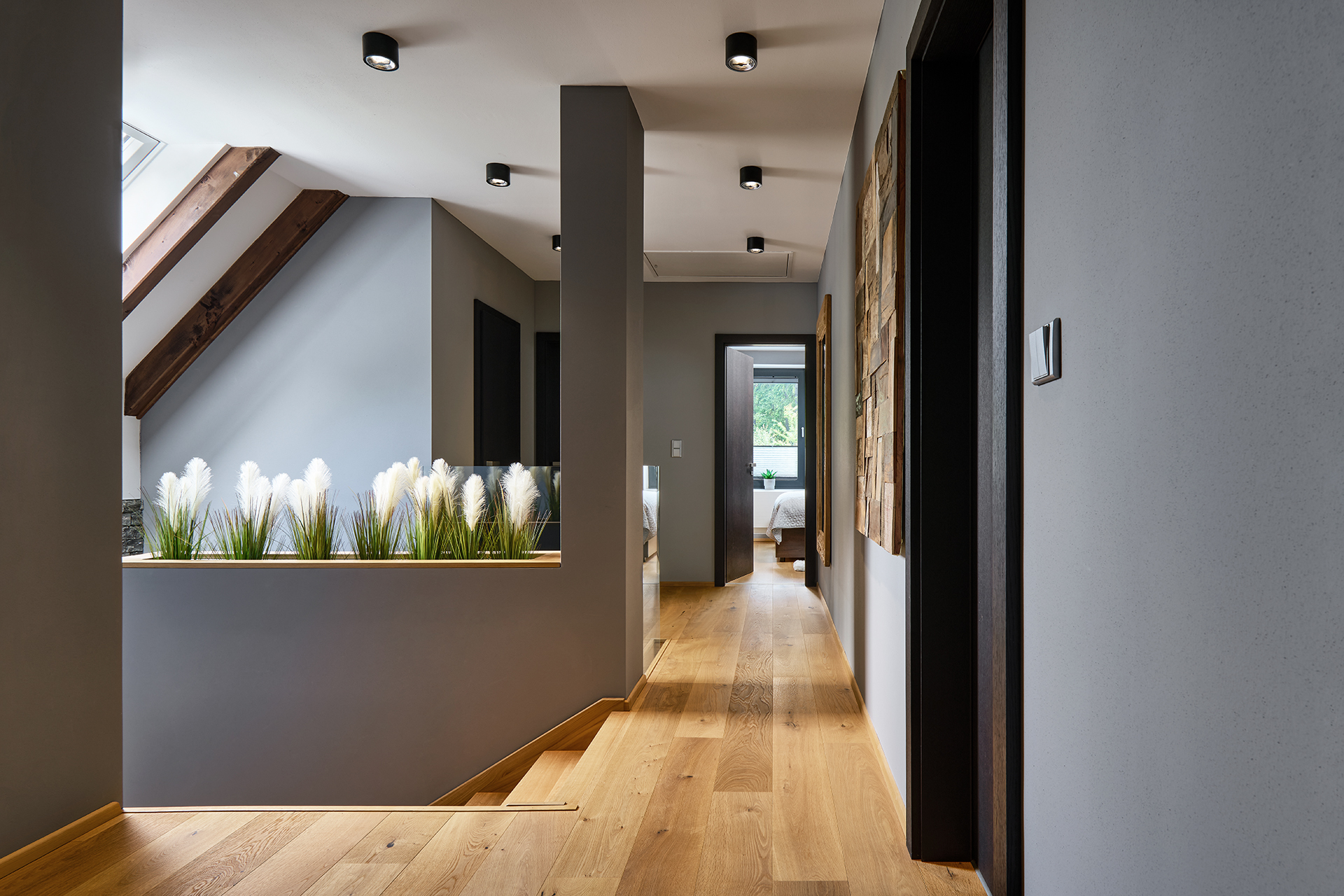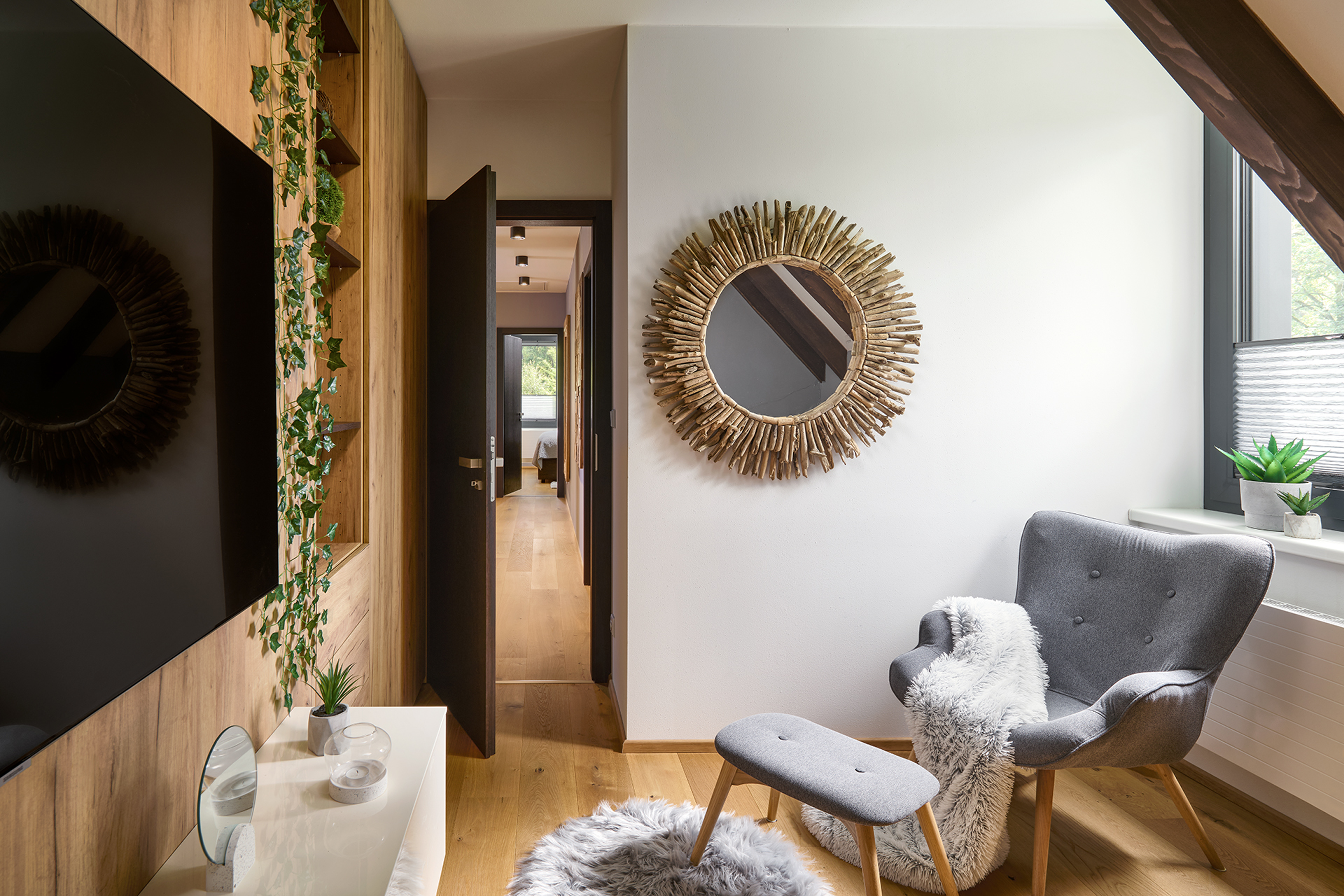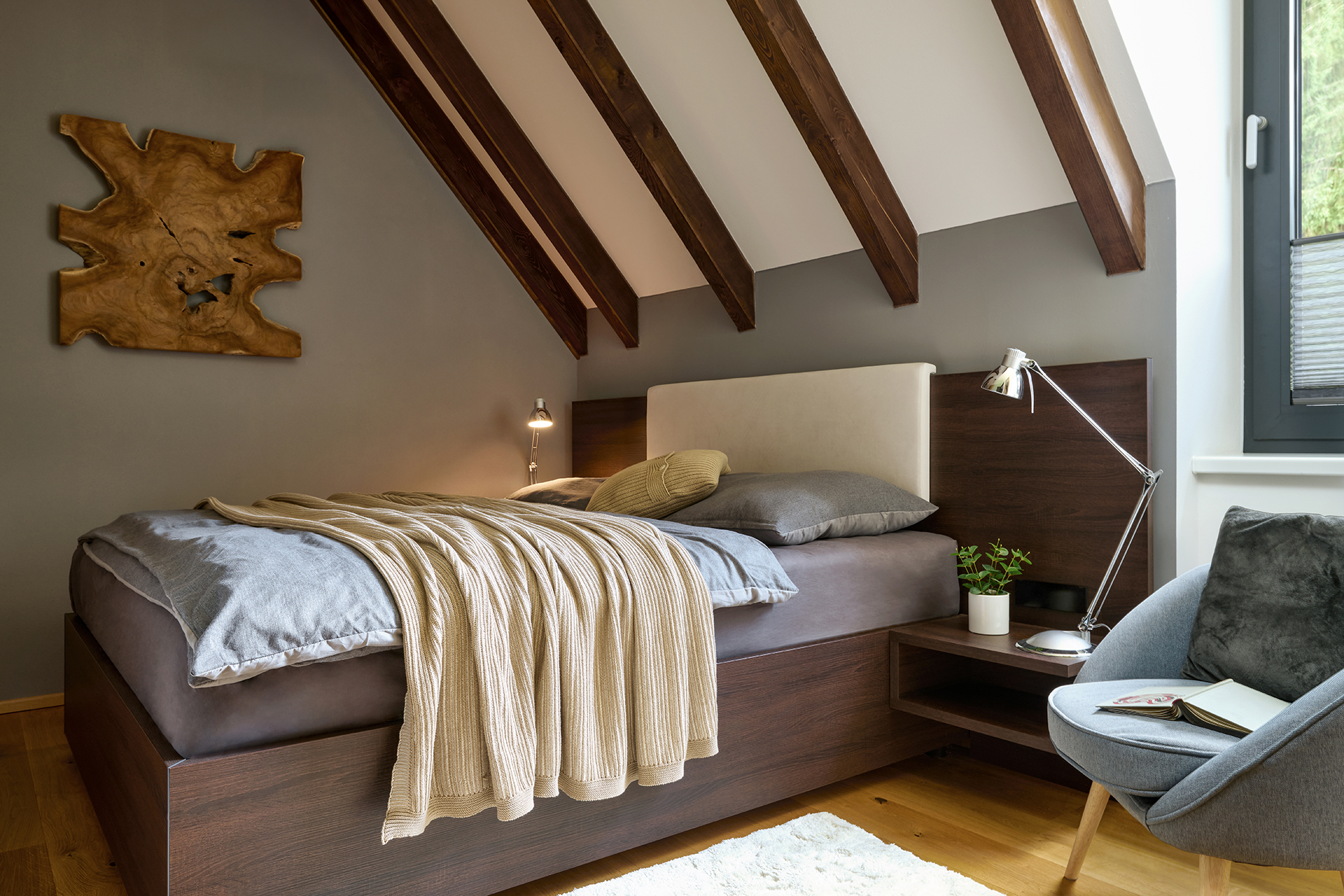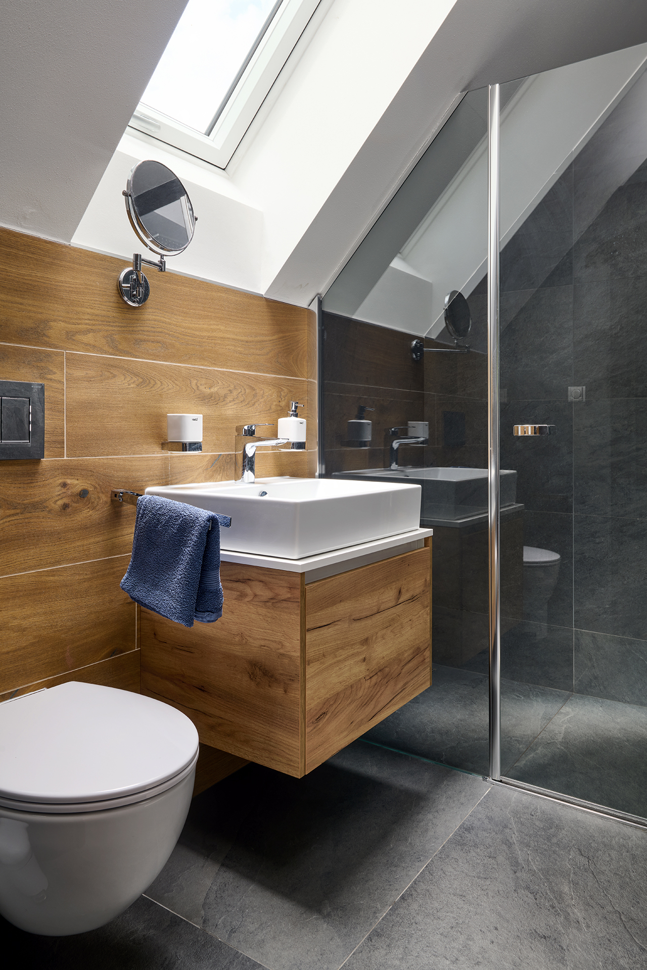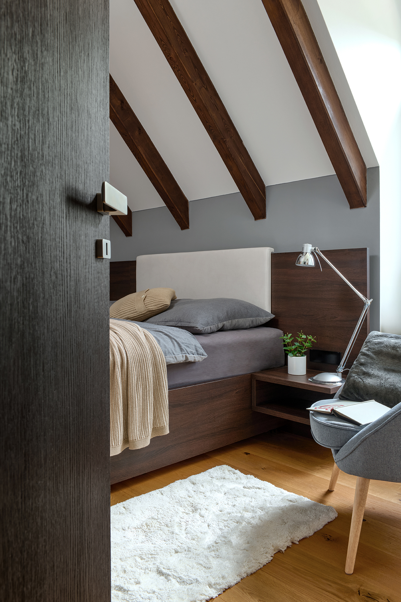 Ložnice a pokoje pro hosty jsou sladěny v jednotném moderním stylu, který podtrhuje dekor šatních skříní OPTIMA. Zatímco postele s nočními stolky zajišťují především pohodlný odpočinek, speciální výsuvné postele a křeslo EFFECT proměňují prostor v útulné a praktické zázemí pro hosty. Na stejný koncept navazuje i koupelna - kombinace dřeva a šedých tónů zde působí uklidňujícím dojmem a podporuje relaxaci.