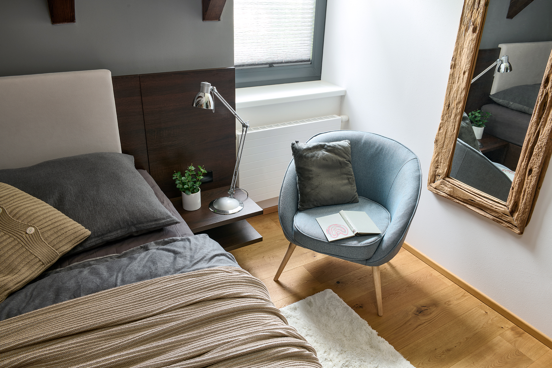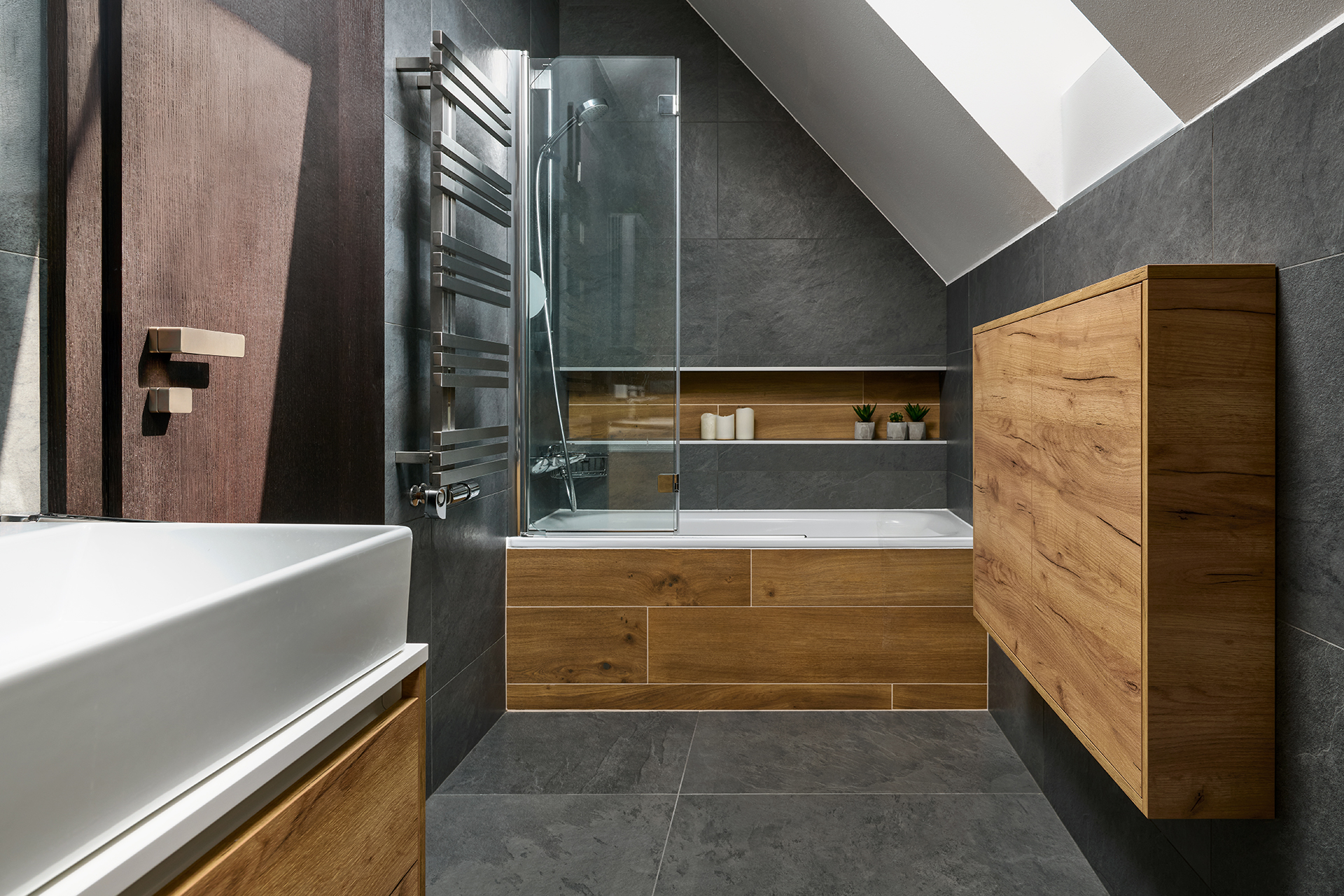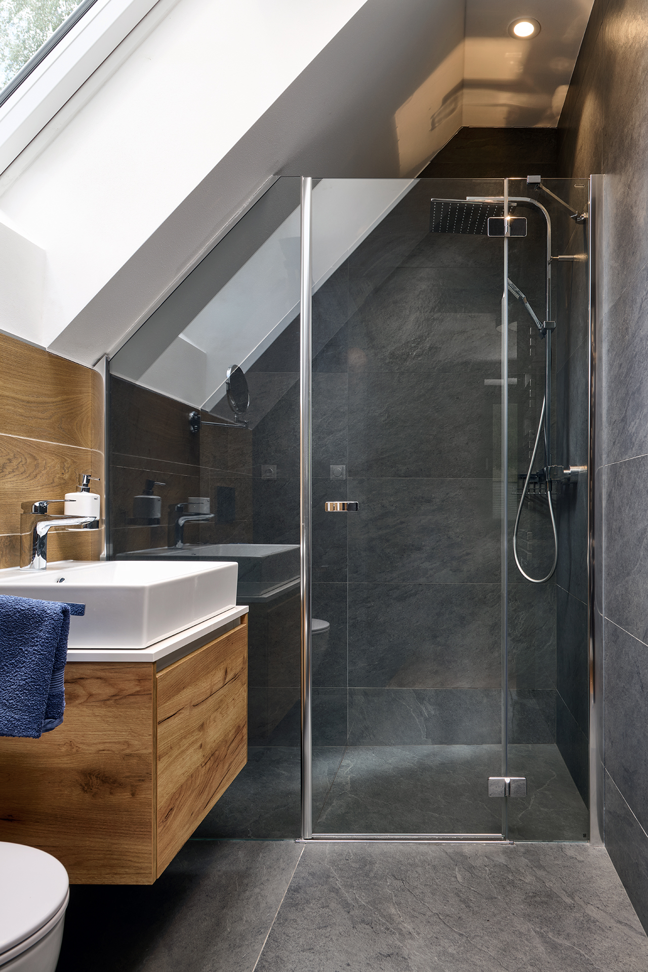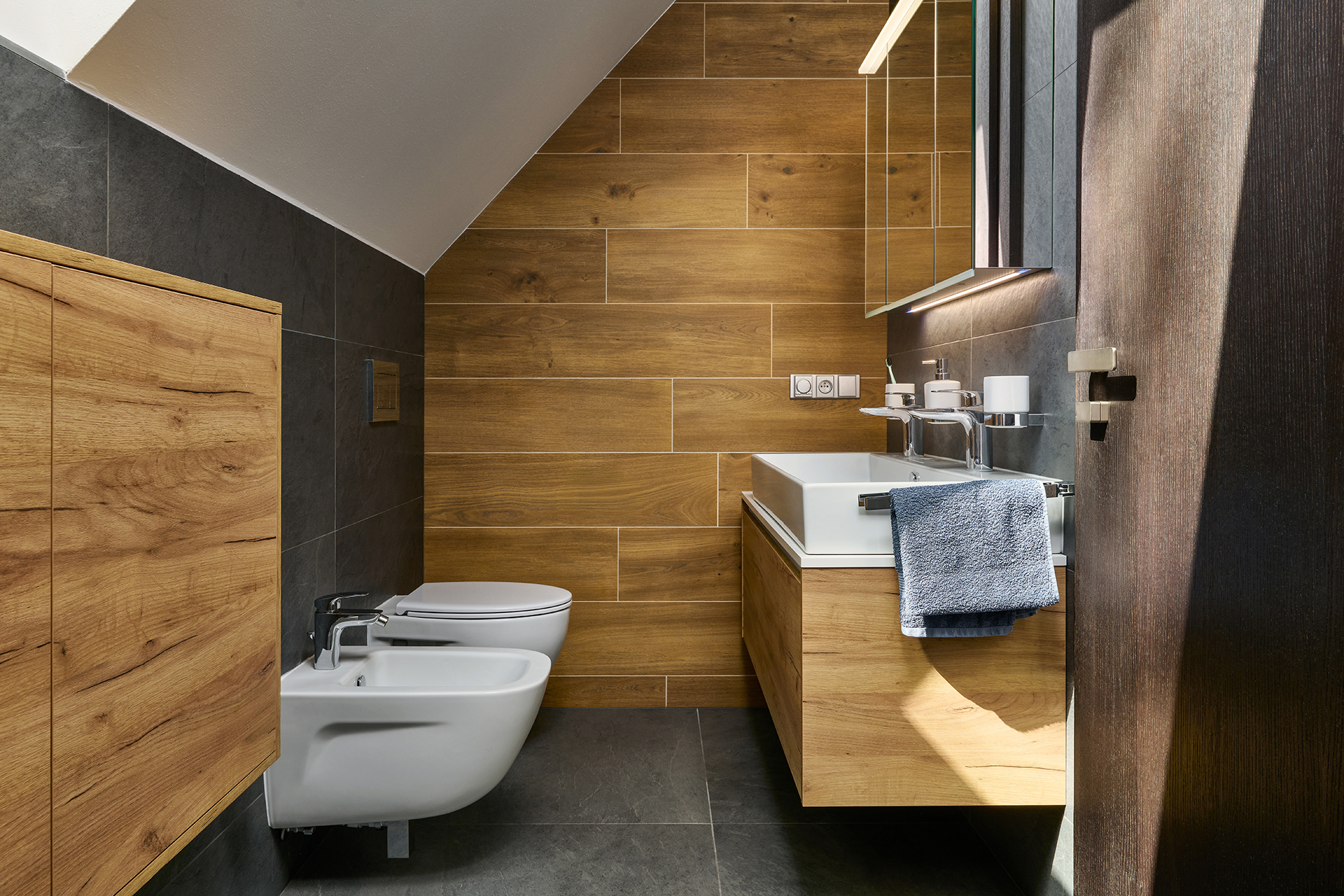 Ložnice a pokoje pro hosty jsou sladěny v jednotném moderním stylu, který podtrhuje dekor šatních skříní OPTIMA. Zatímco postele s nočními stolky zajišťují především pohodlný odpočinek, speciální výsuvné postele a křeslo EFFECT proměňují prostor v útulné a praktické zázemí pro hosty. Na stejný koncept navazuje i koupelna - kombinace dřeva a šedých tónů zde působí uklidňujícím dojmem a podporuje relaxaci.