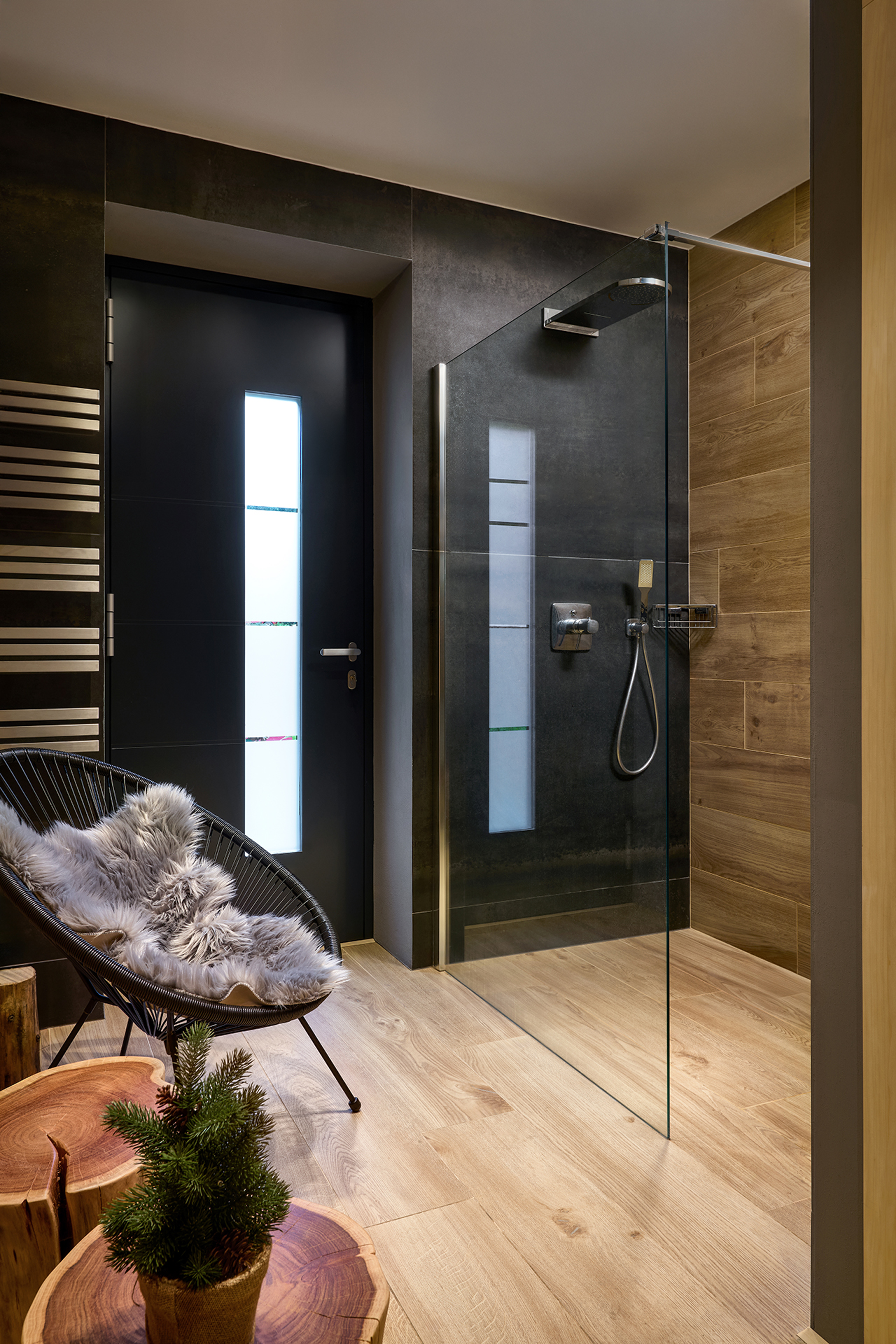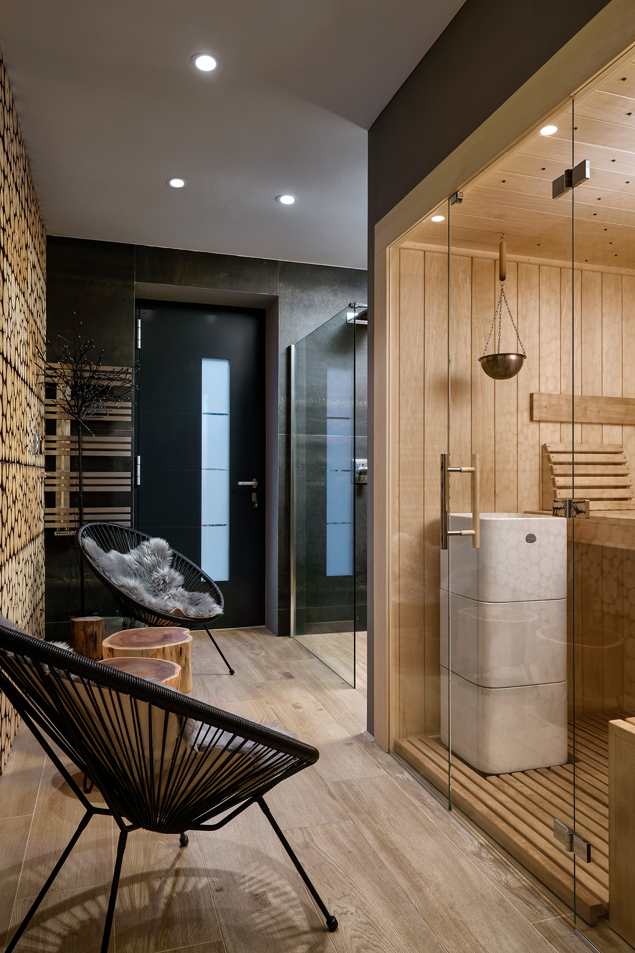Součástí domu je také sauna, která slouží jako soukromé místo pro regeneraci těla i mysli. Přírodní materiály a teplé tóny harmonicky doplňují celkové ladění a navozují pocit hlubokého klidu po náročném dni.