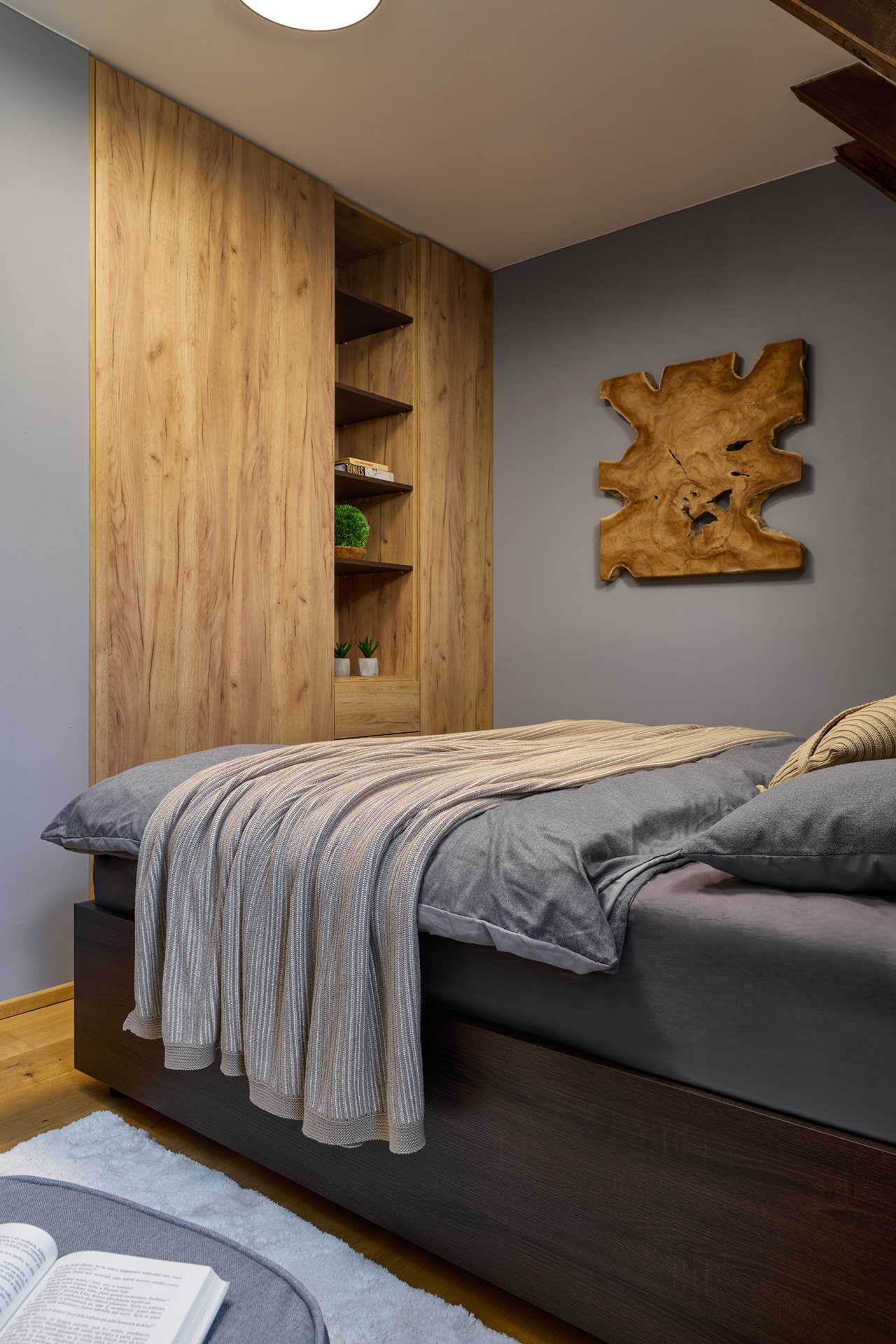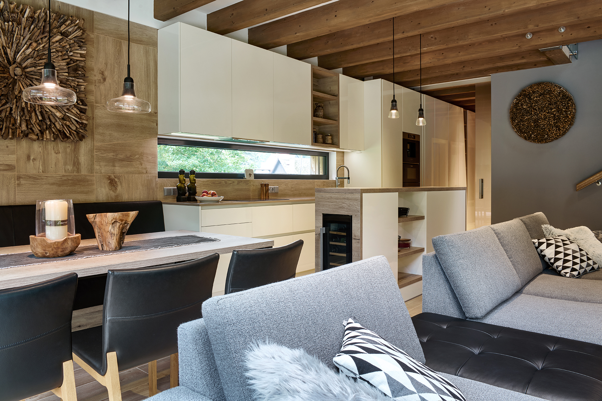 Tento interiér ztělesňuje nadčasovou eleganci s pocitem útulného pohodlí. Koncept staví na harmonii přírodního dřeva, kameninových dekorů a čistých, moderních linií, které dohromady vytvářejí klidný a vizuálně působivý celek.