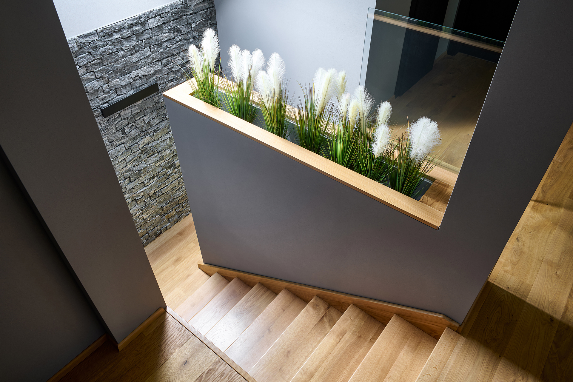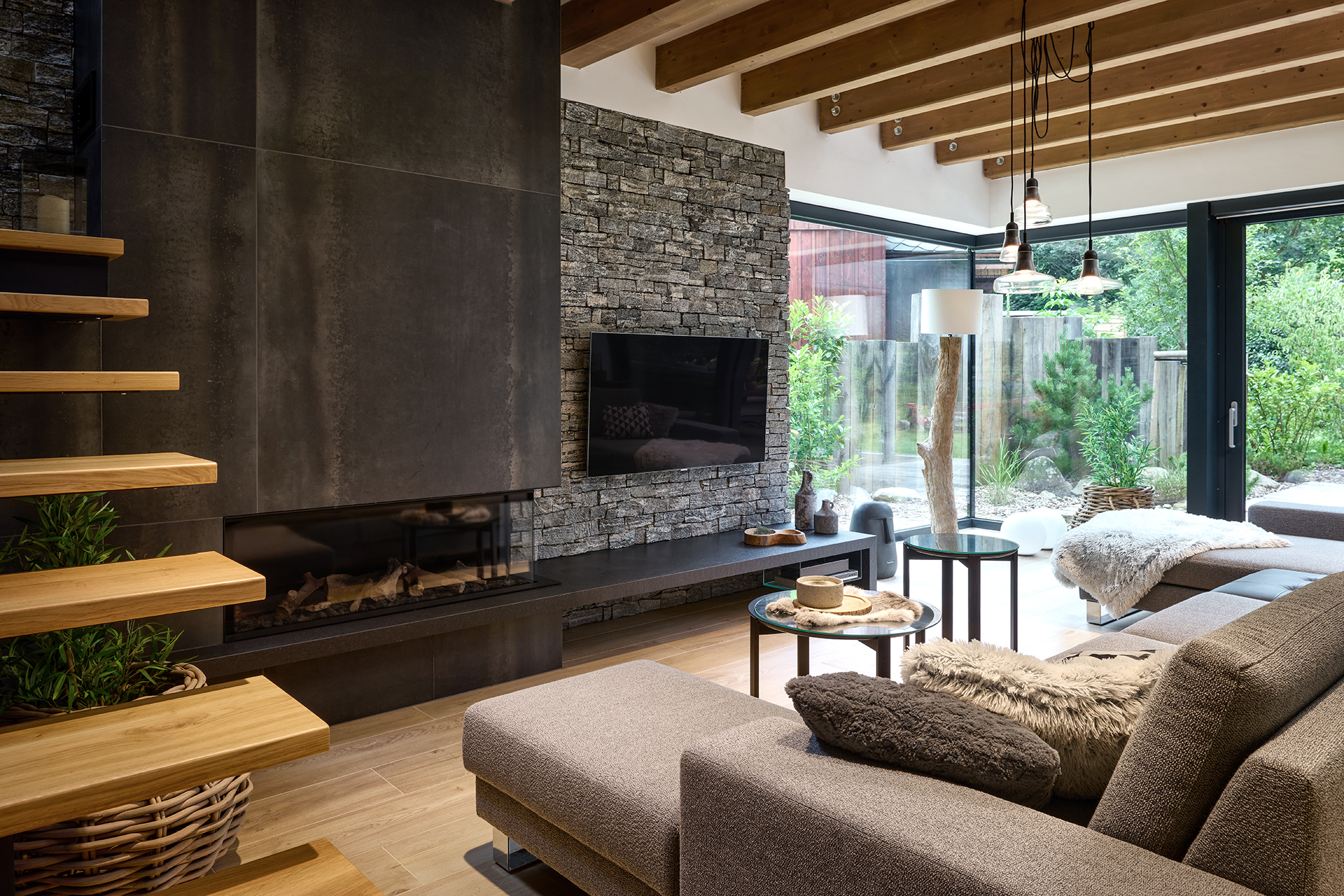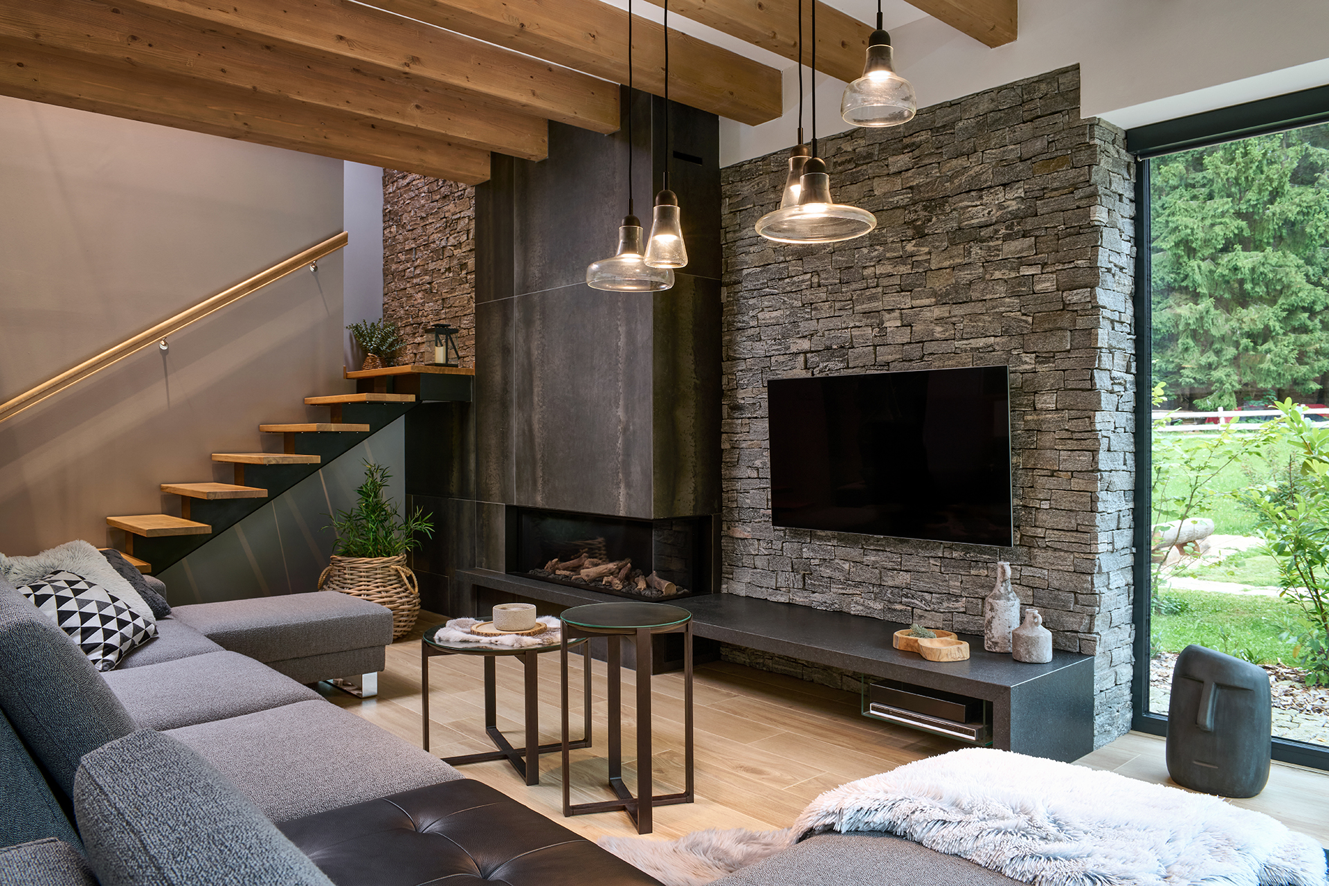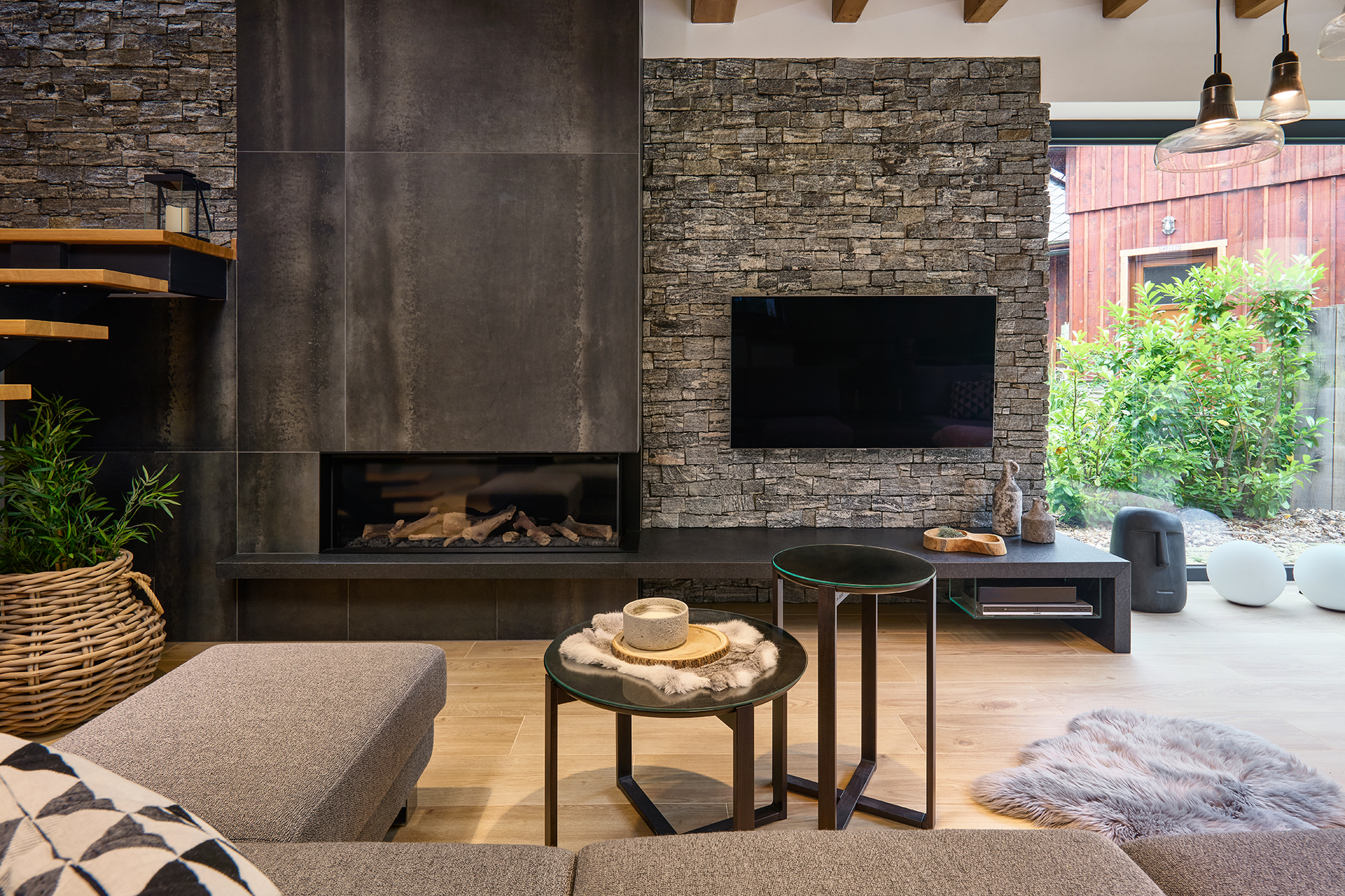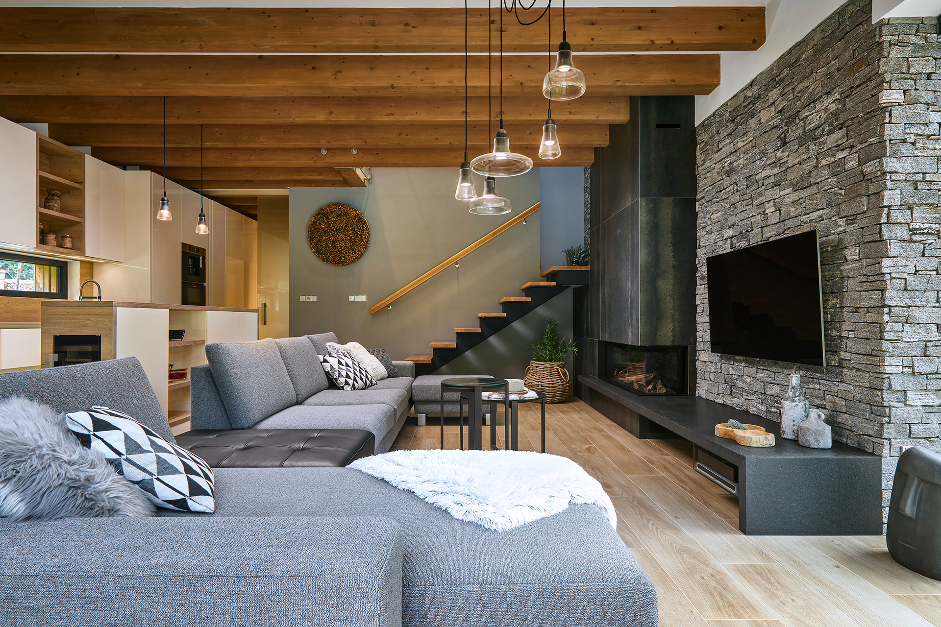 Obývací část zaujme propojením materiálů a detailů. Výrazné šedé kamenné obložení kontrastuje s lehkostí konferenčních stolků, zatímco skříňka pod TV vyrobená na míru prostoru dodává osobitý charakter a luxusní nádech.