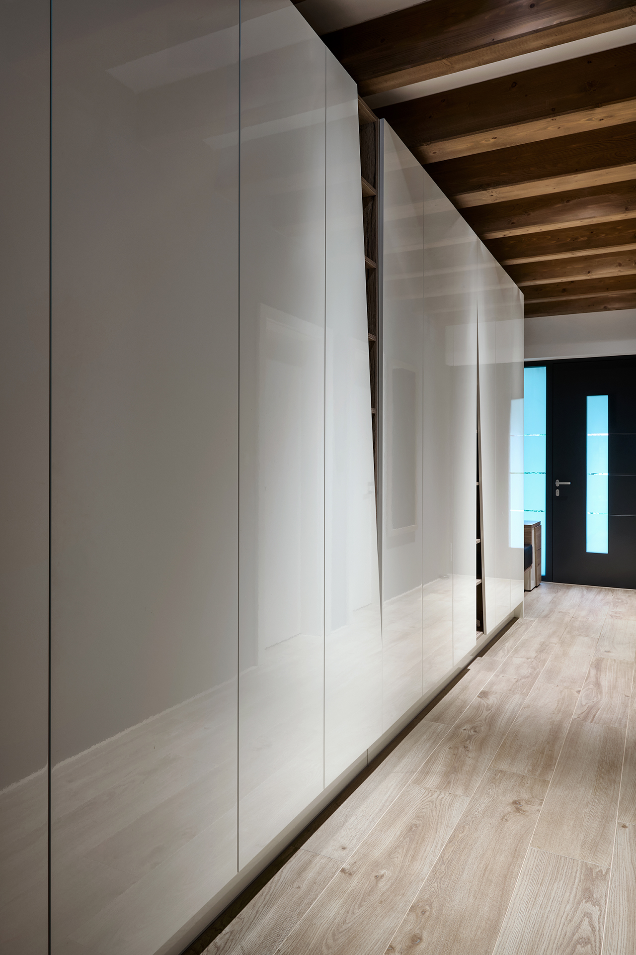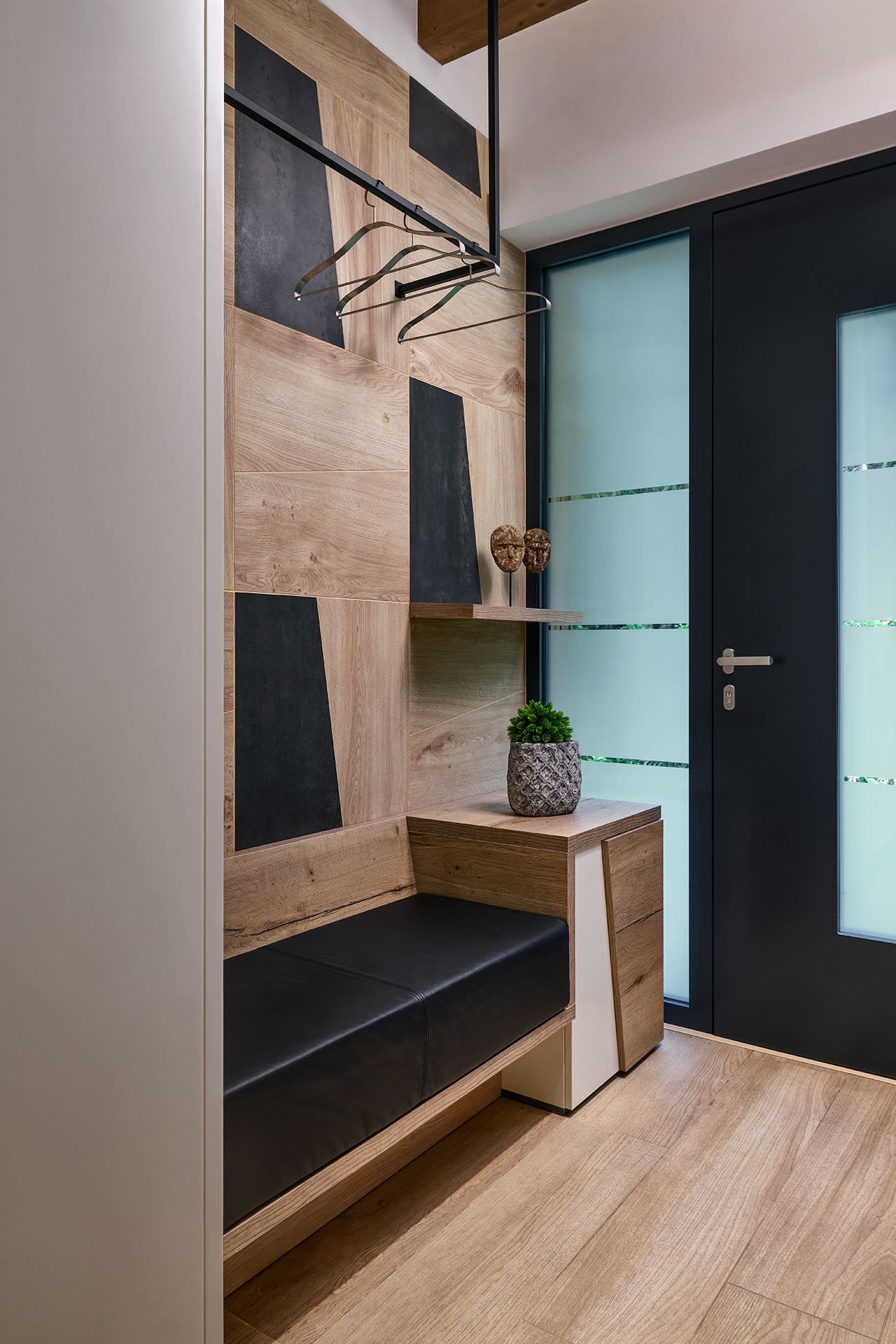 Funkční a estetické řešení chodby doplňují skříně s originálním frézováním a čalouněná lavice v černé kůži pro pohodlné sezení.