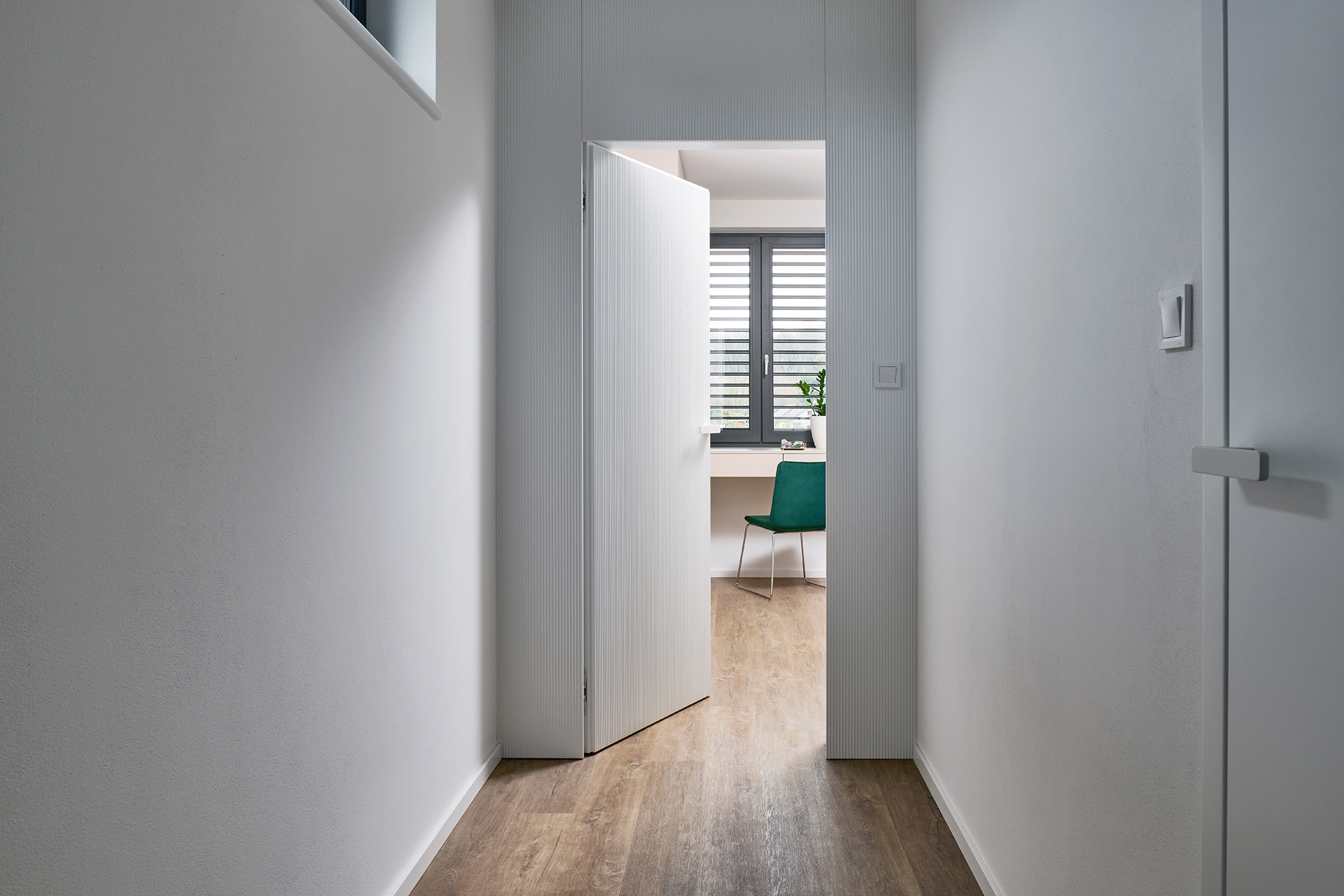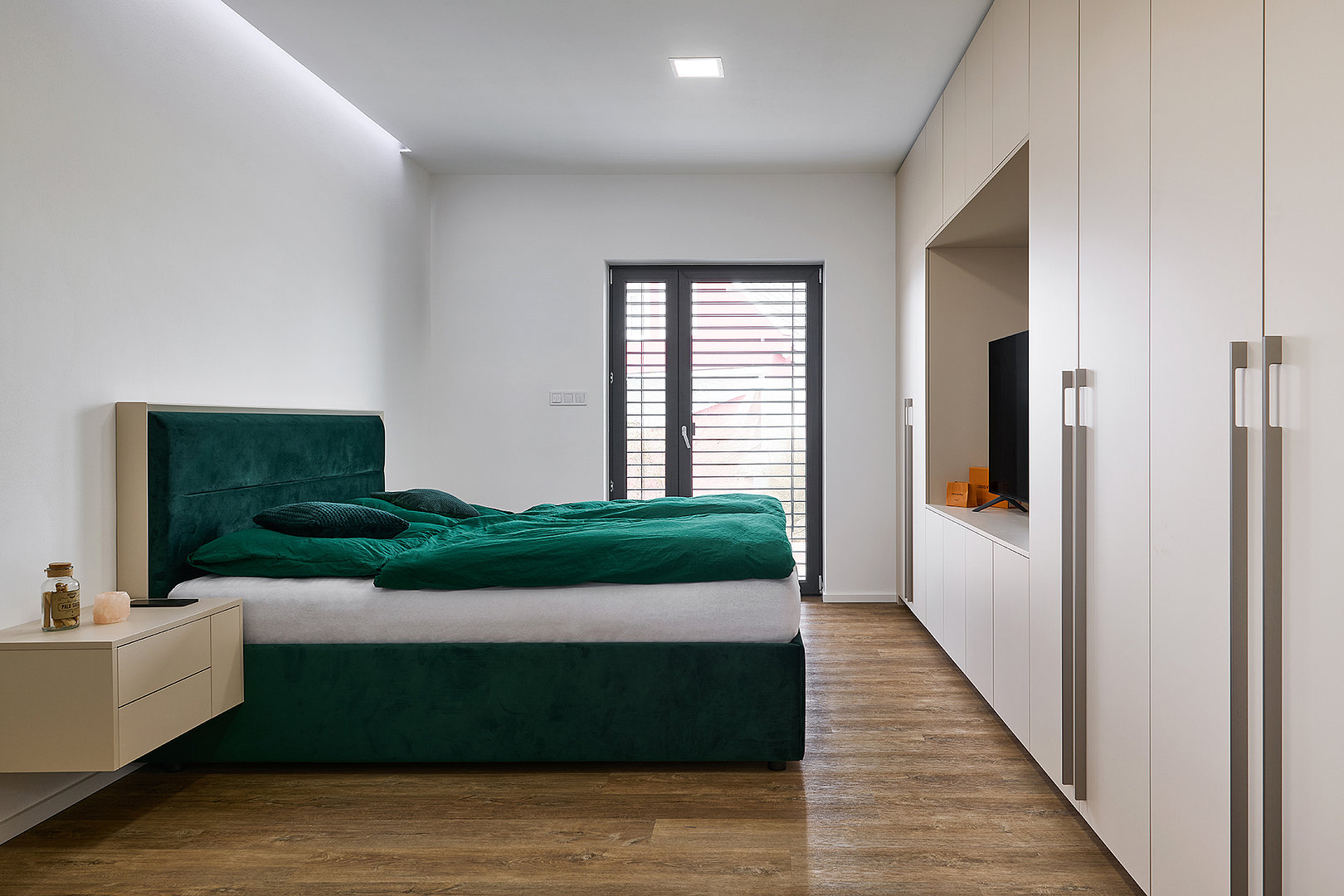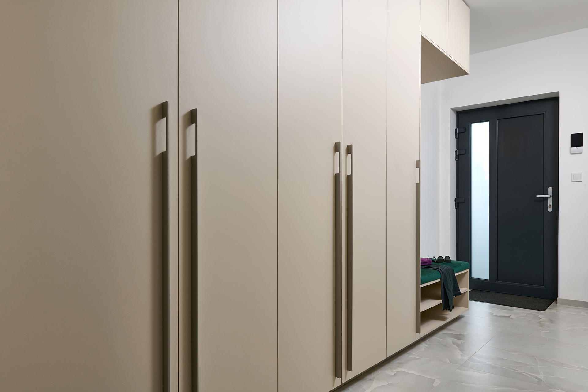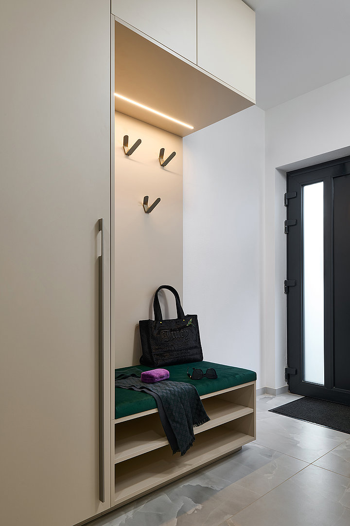 V ložnici navozuje atmosféru klidu a pohodlí postel MADISON, která zaujme jednoduchou formou a důrazem na funkčnost. Koupelna kombinuje hladké plochy LINE s plastickou strukturou v bílém lesku, jež prostor projasňuje a dodává mu svěží výraz. Předsíň už při vstupu nastavuje barevnou paletu i precizní úroveň zpracování. Ta se promítá do každého detailu a dotváří pocit promyšleného, harmonického domova.