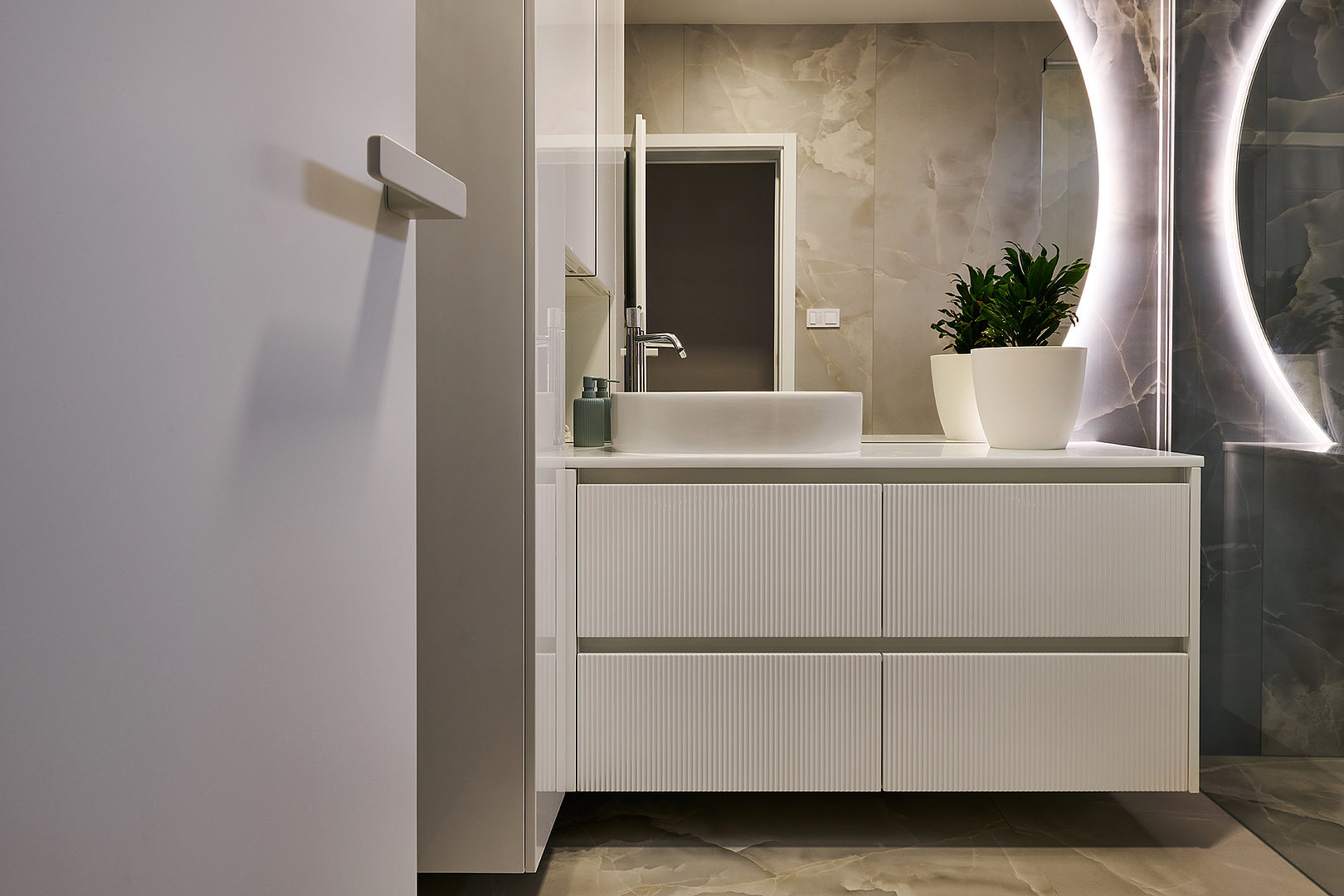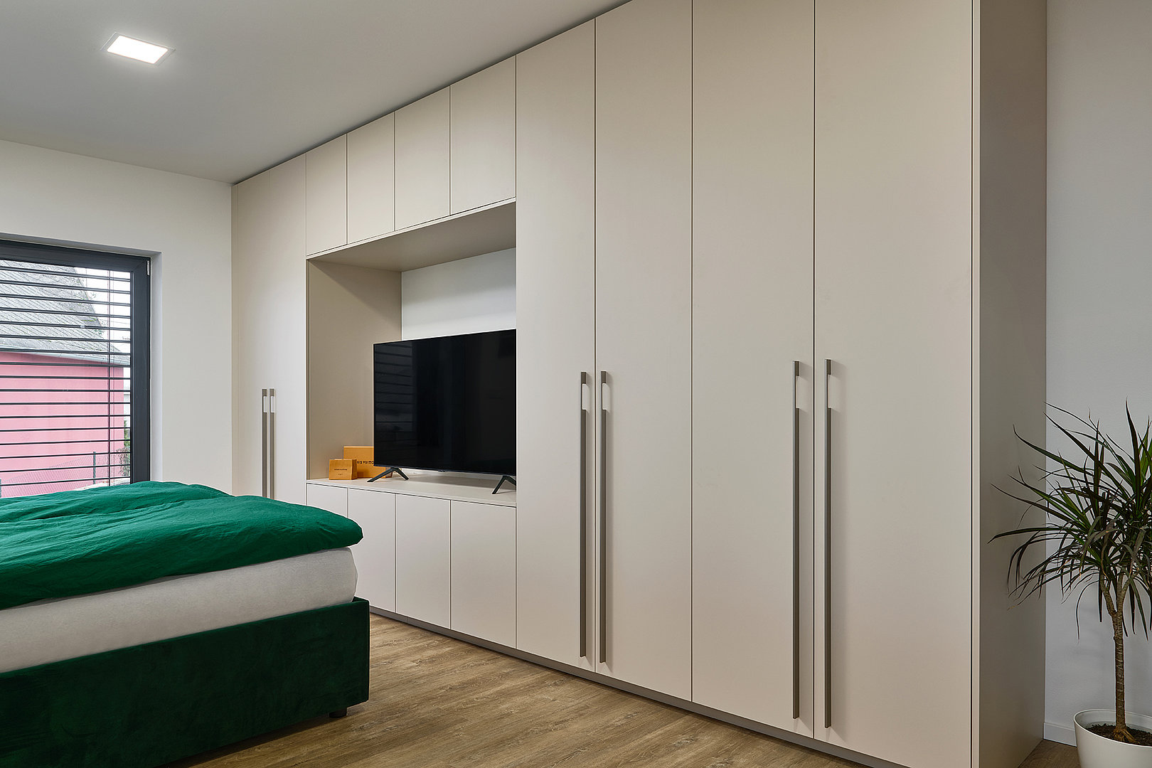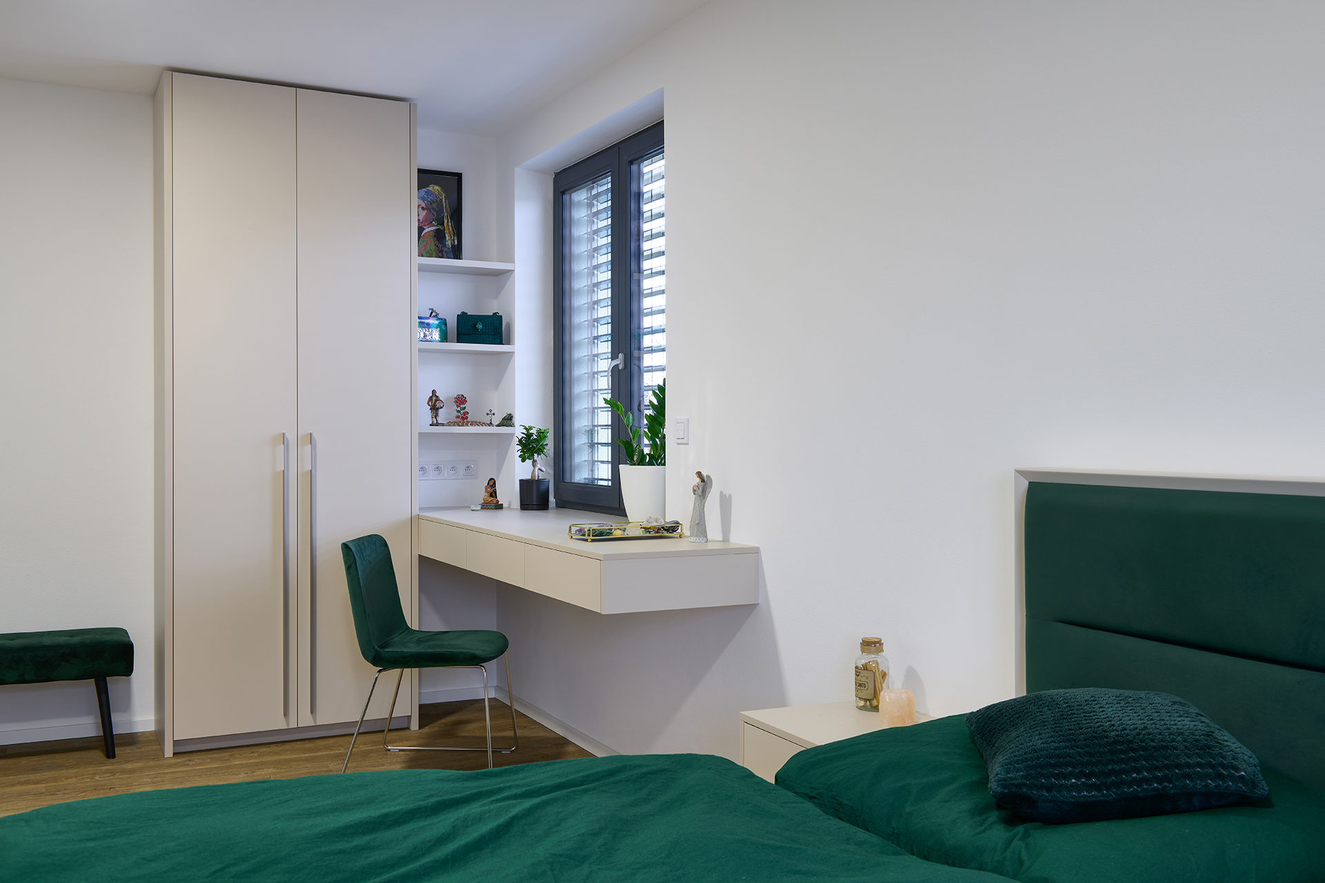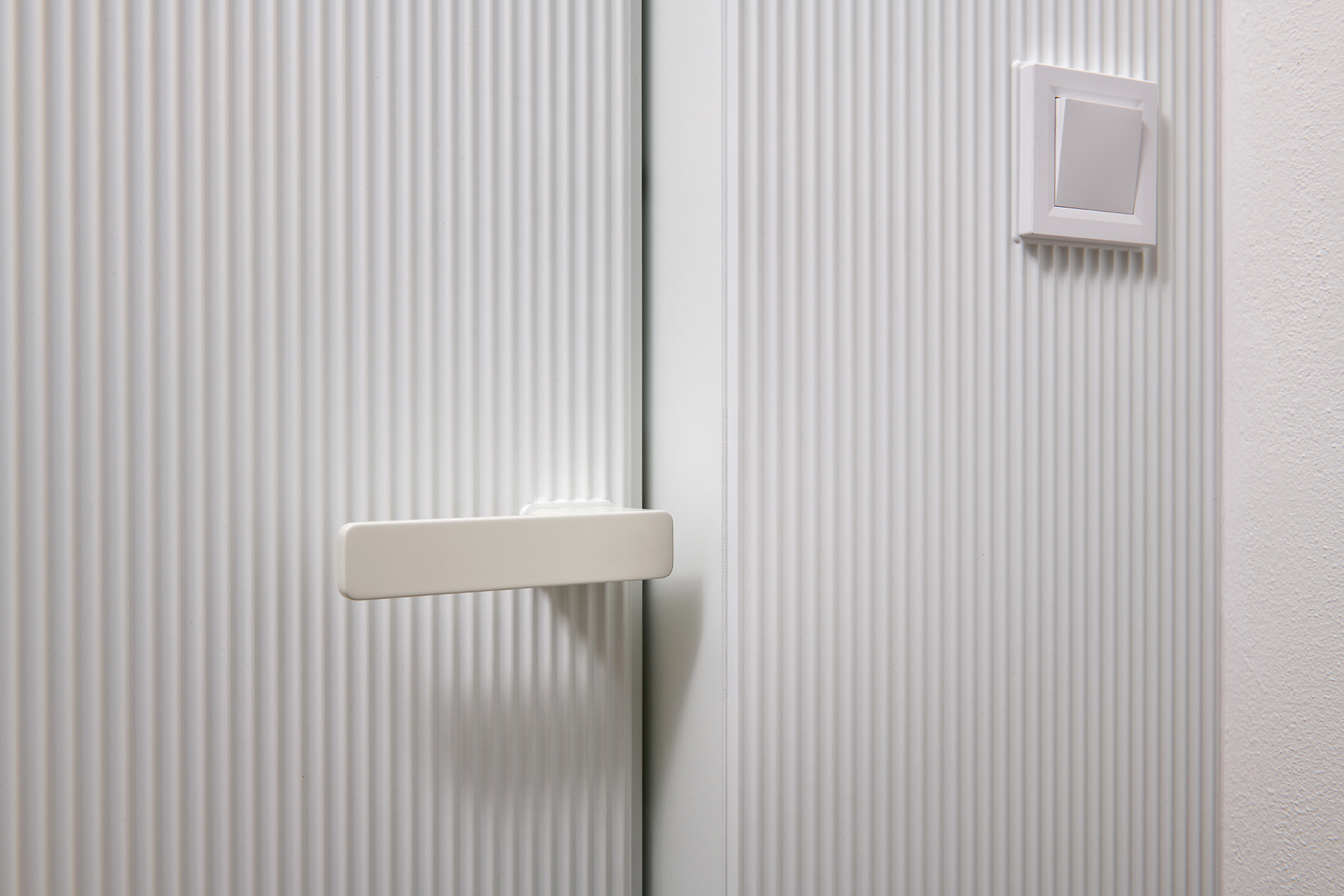 V ložnici navozuje atmosféru klidu a pohodlí postel MADISON, která zaujme jednoduchou formou a důrazem na funkčnost. Koupelna kombinuje hladké plochy LINE s plastickou strukturou v bílém lesku, jež prostor projasňuje a dodává mu svěží výraz. Předsíň už při vstupu nastavuje barevnou paletu i precizní úroveň zpracování. Ta se promítá do každého detailu a dotváří pocit promyšleného, harmonického domova.