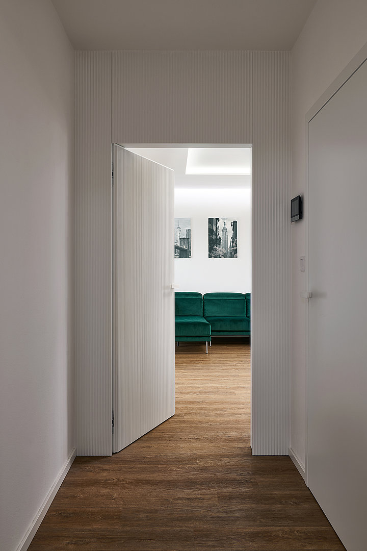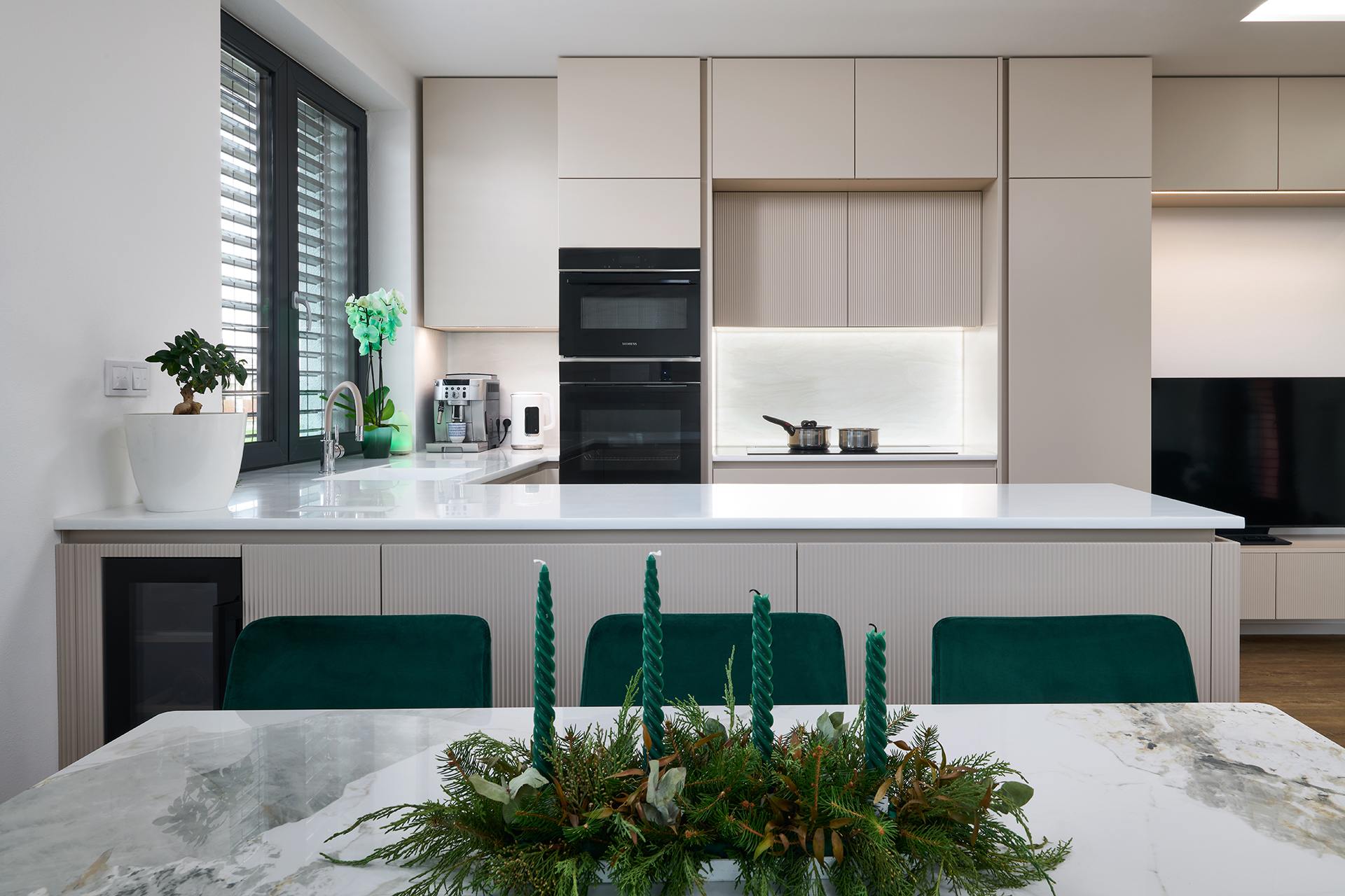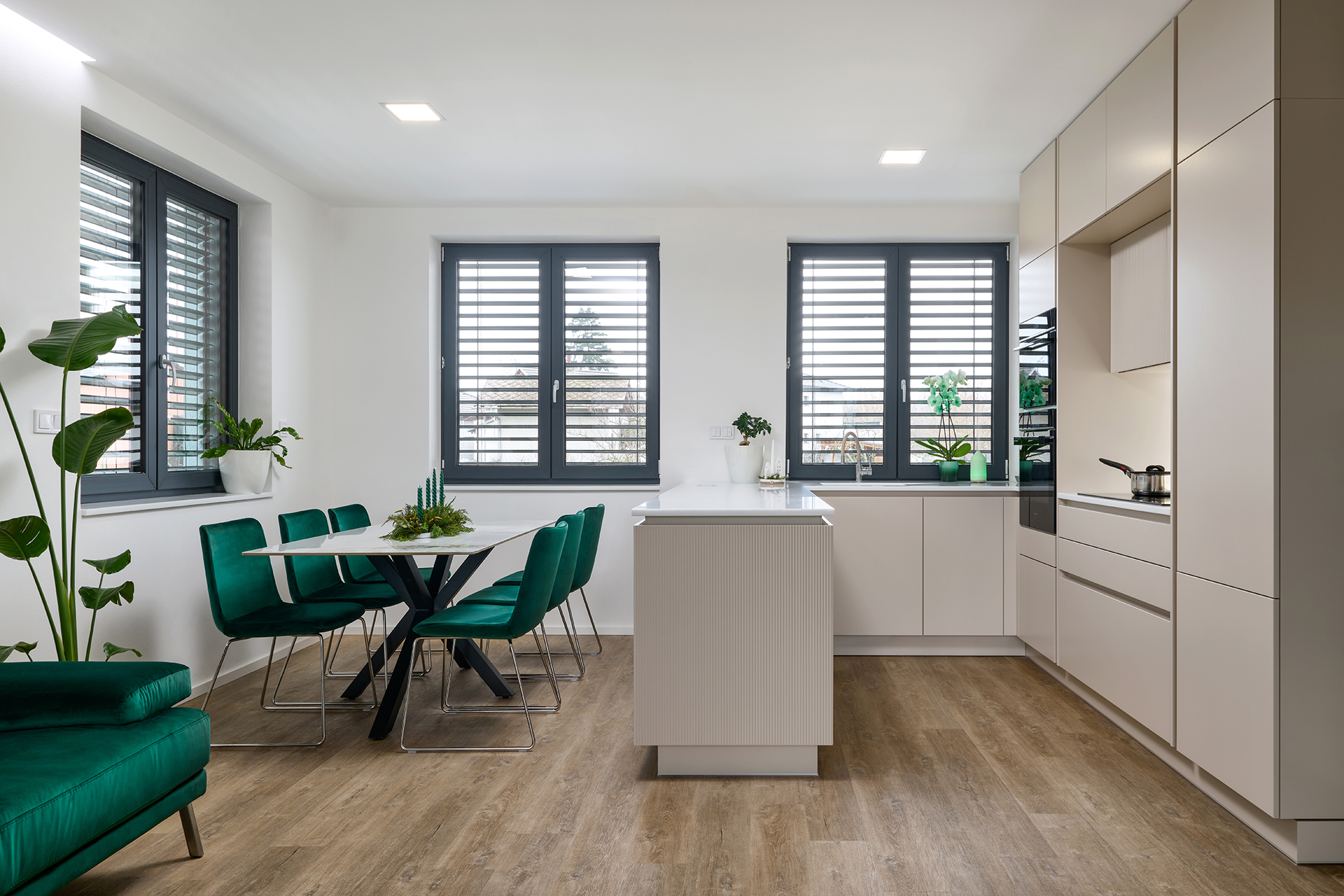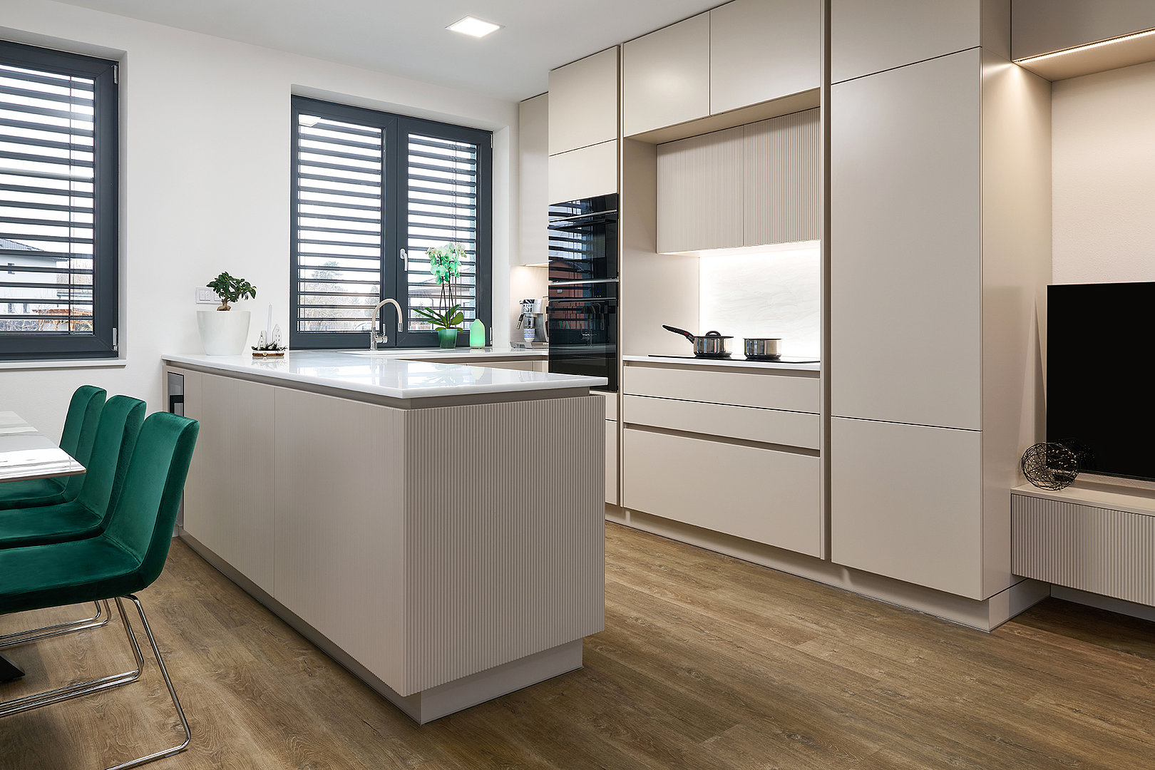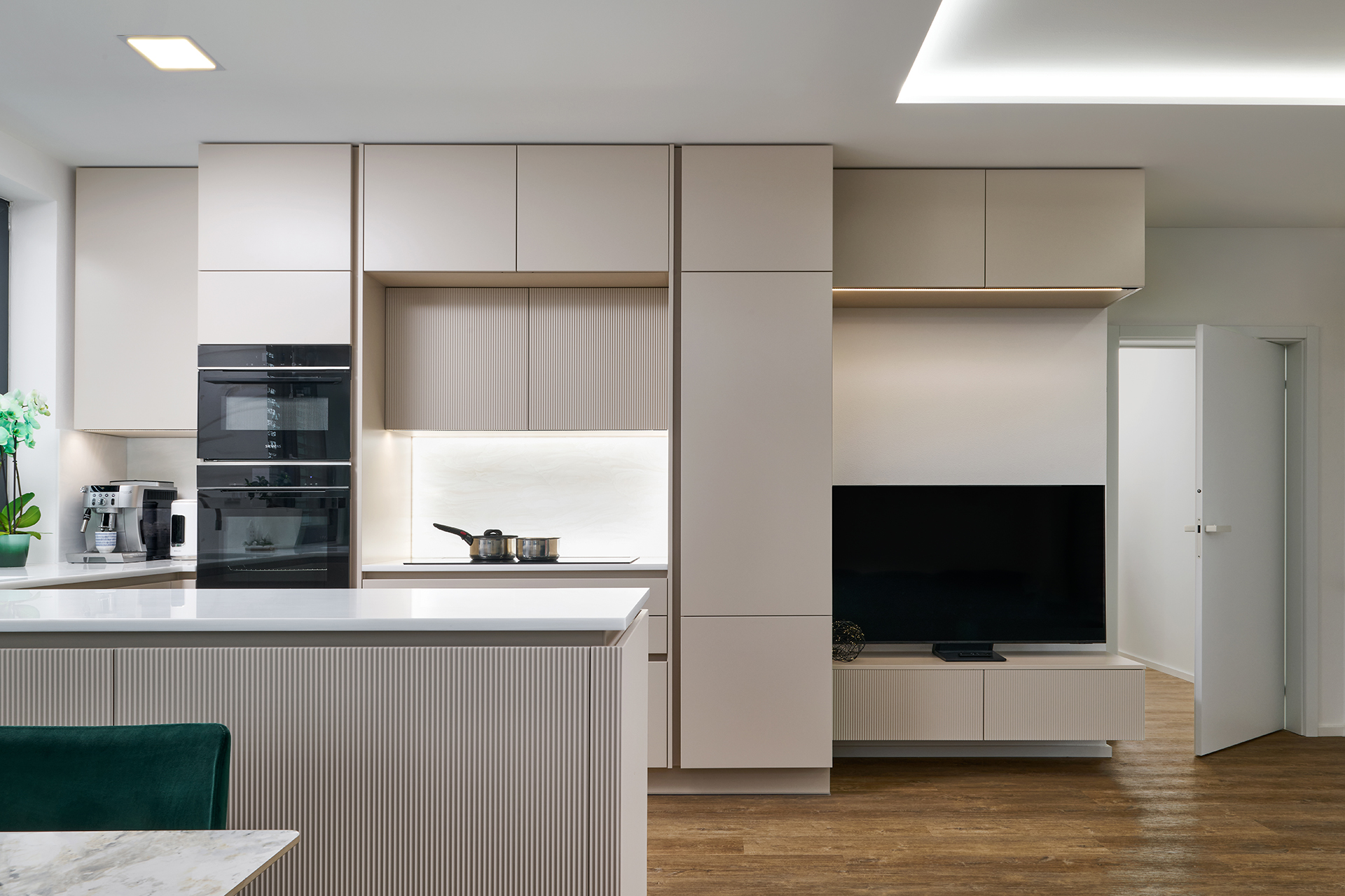 Kuchyně ELITE/WAVE v matném odstínu Champagne pracuje s jemnou strukturou i se světlem. Reliéf na ostrůvku vnáší do prostoru hloubku a nenápadný pohyb, který jej oživuje, aniž by narušoval jeho střídmost. Plynulý přechod do obývací části, doplněný přírodní podlahou a smaragdovými detaily, podporuje otevřený a hřejivý charakter interiéru. Motiv jemného vlnění se navíc prostřednictvím bílých matných dveří s detailem WAVE promítá i do ostatních místností.