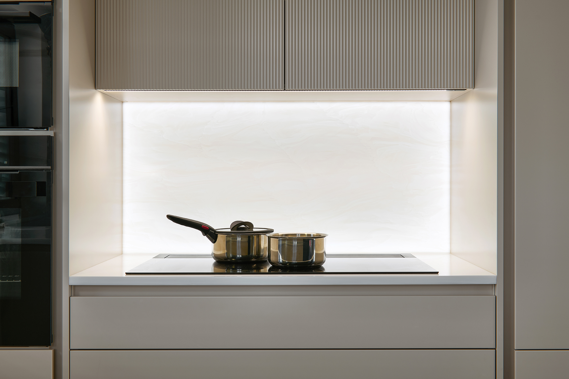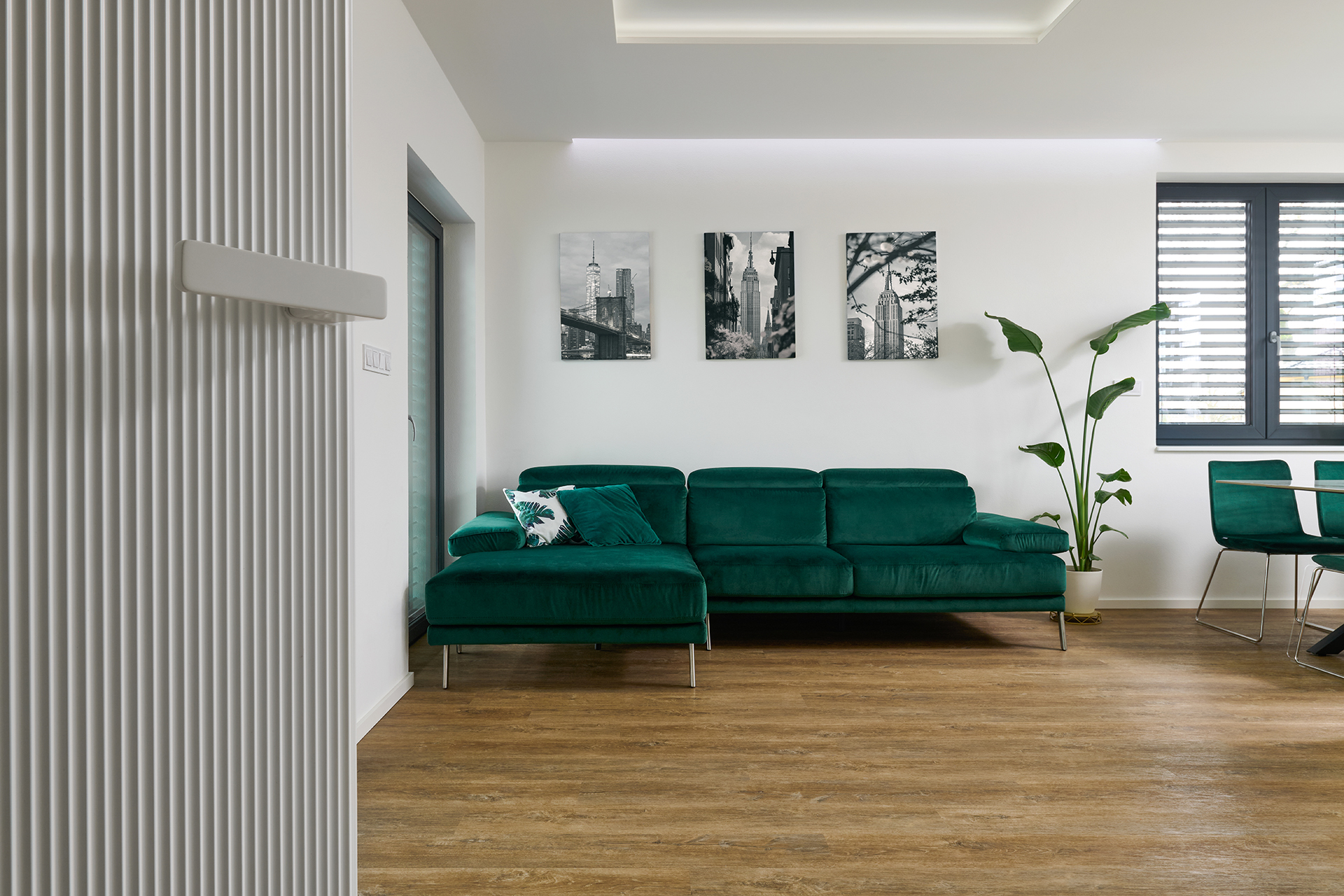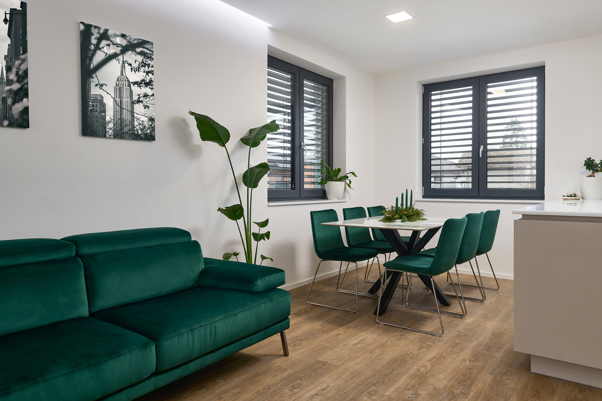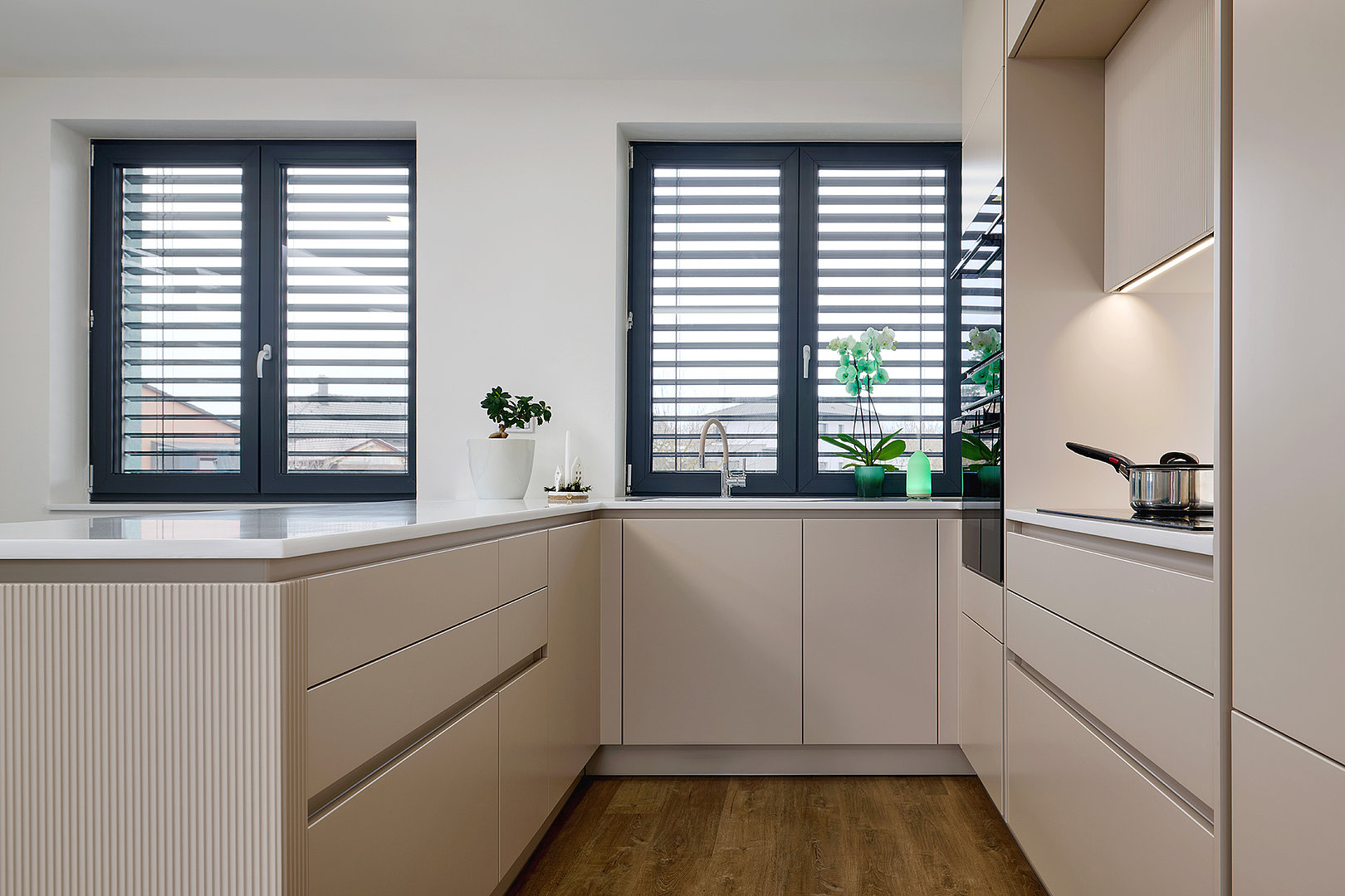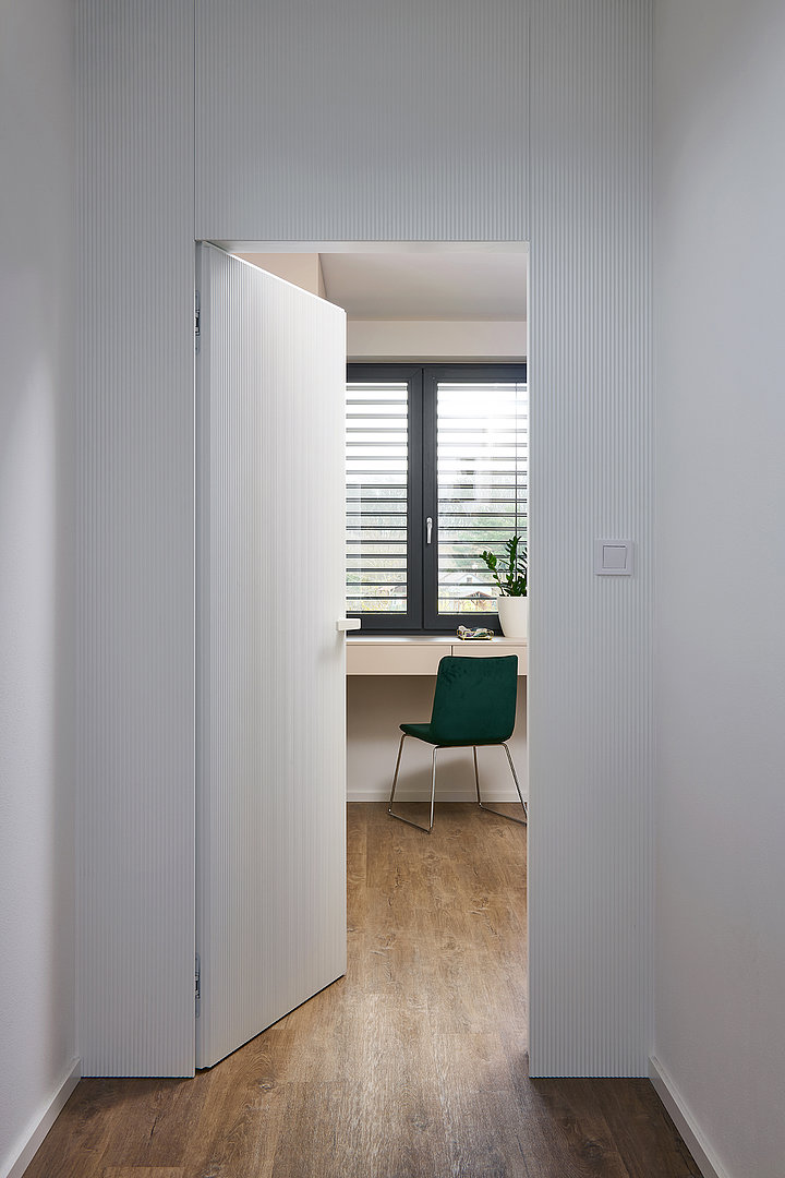 Kuchyně ELITE/WAVE v matném odstínu Champagne pracuje s jemnou strukturou i se světlem. Reliéf na ostrůvku vnáší do prostoru hloubku a nenápadný pohyb, který jej oživuje, aniž by narušoval jeho střídmost. Plynulý přechod do obývací části, doplněný přírodní podlahou a smaragdovými detaily, podporuje otevřený a hřejivý charakter interiéru. Motiv jemného vlnění se navíc prostřednictvím bílých matných dveří s detailem WAVE promítá i do ostatních místností.