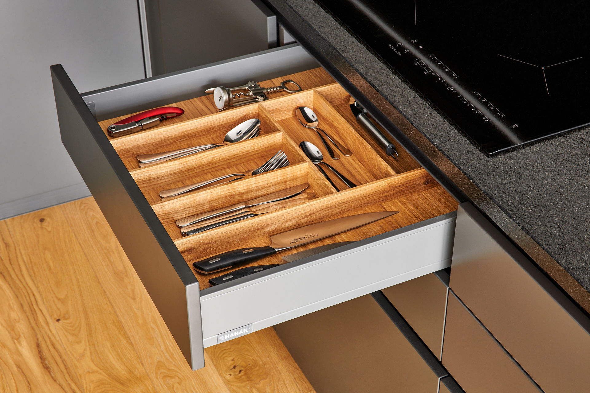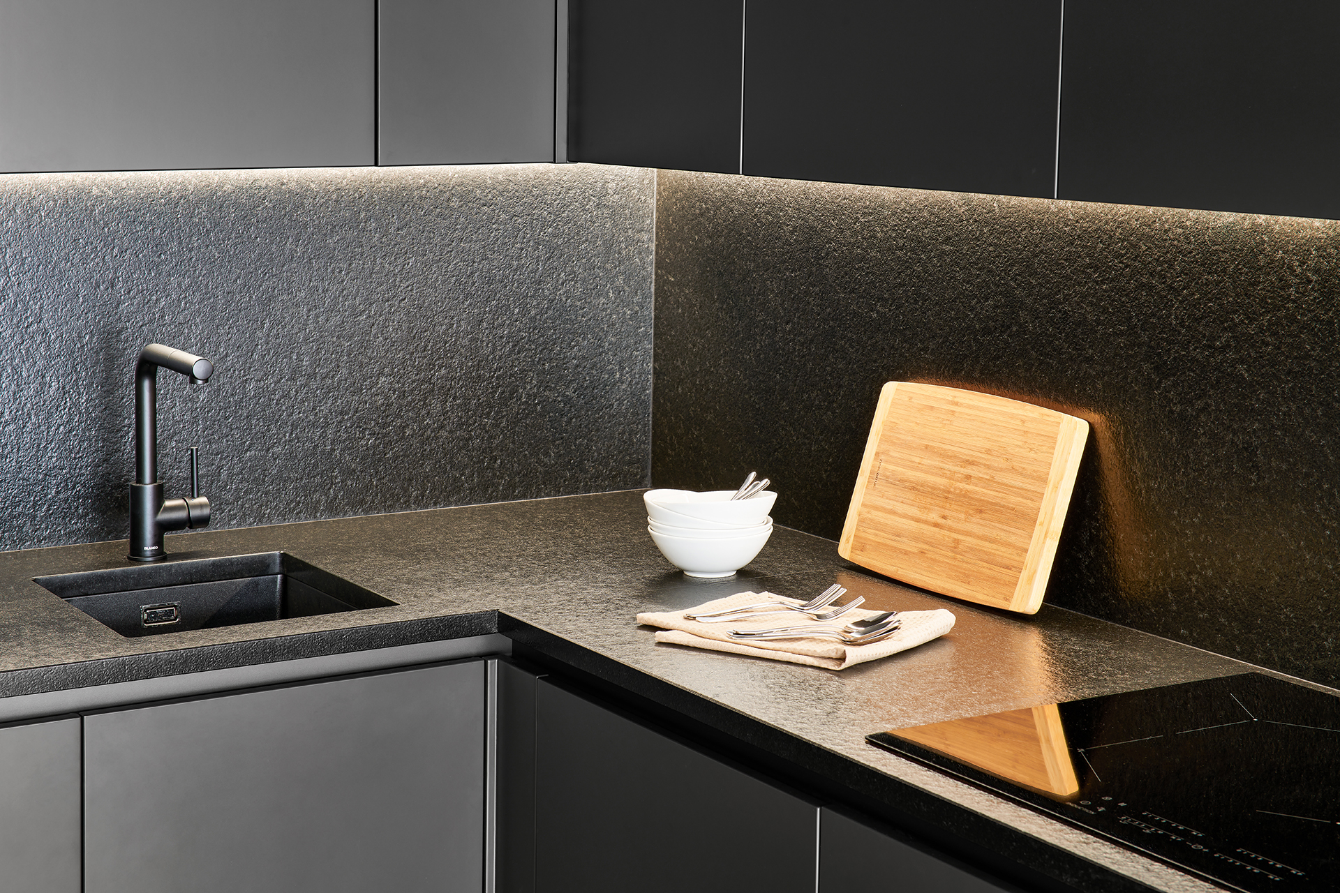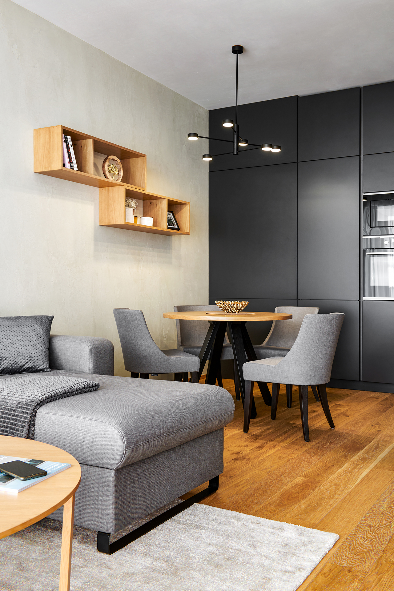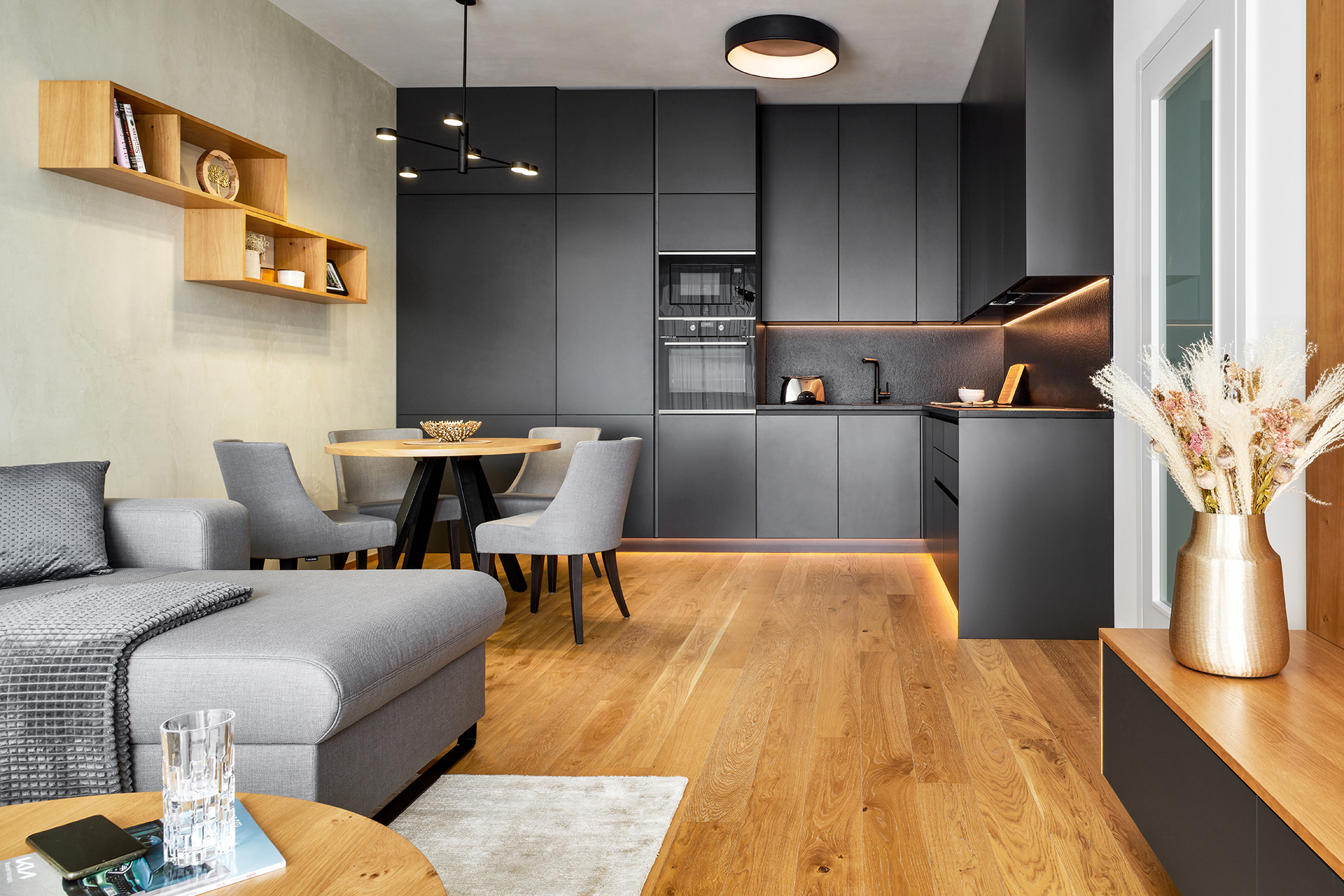 Kuchyně v rytmu matného titanu a hřejivého dubu