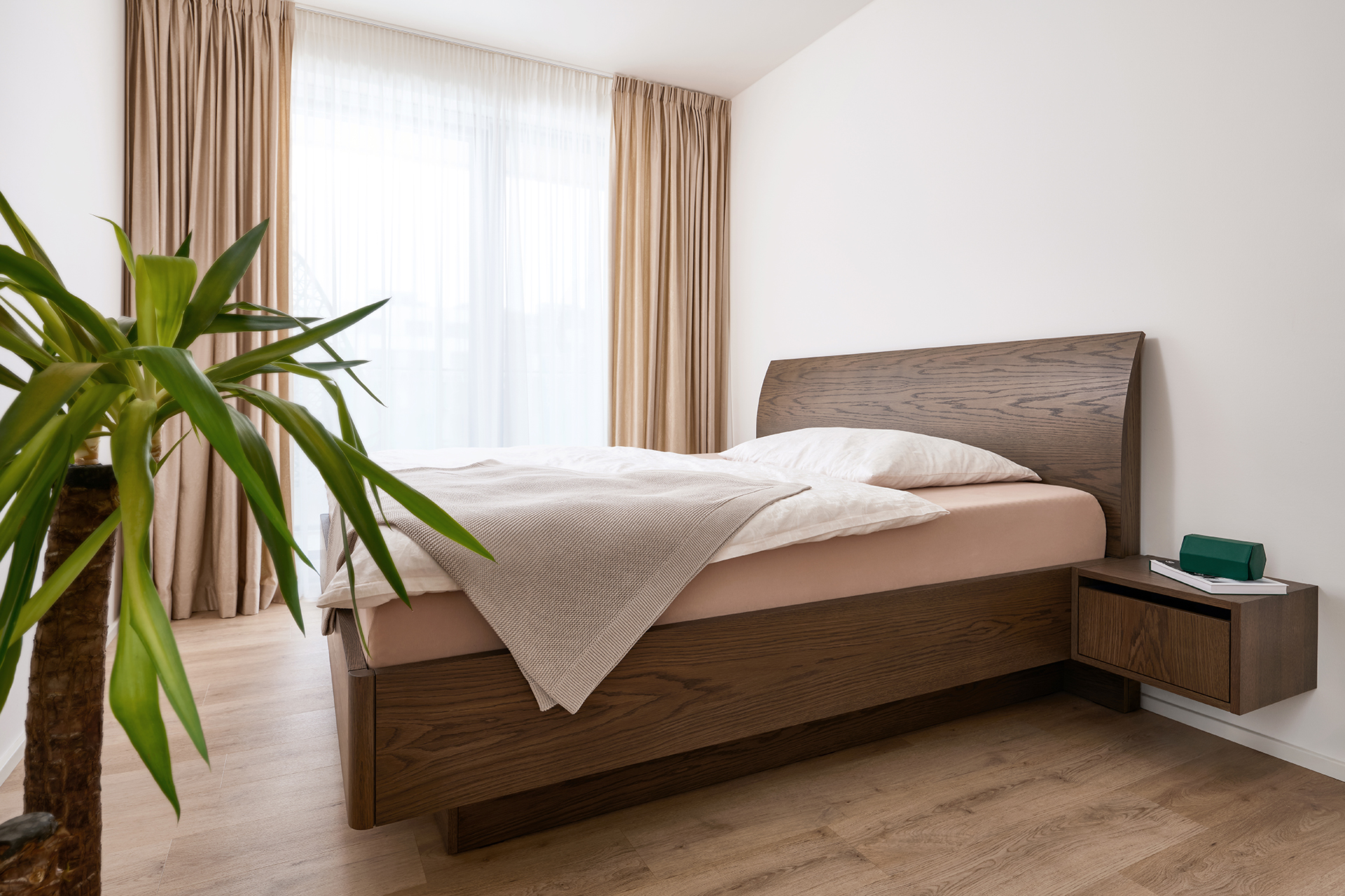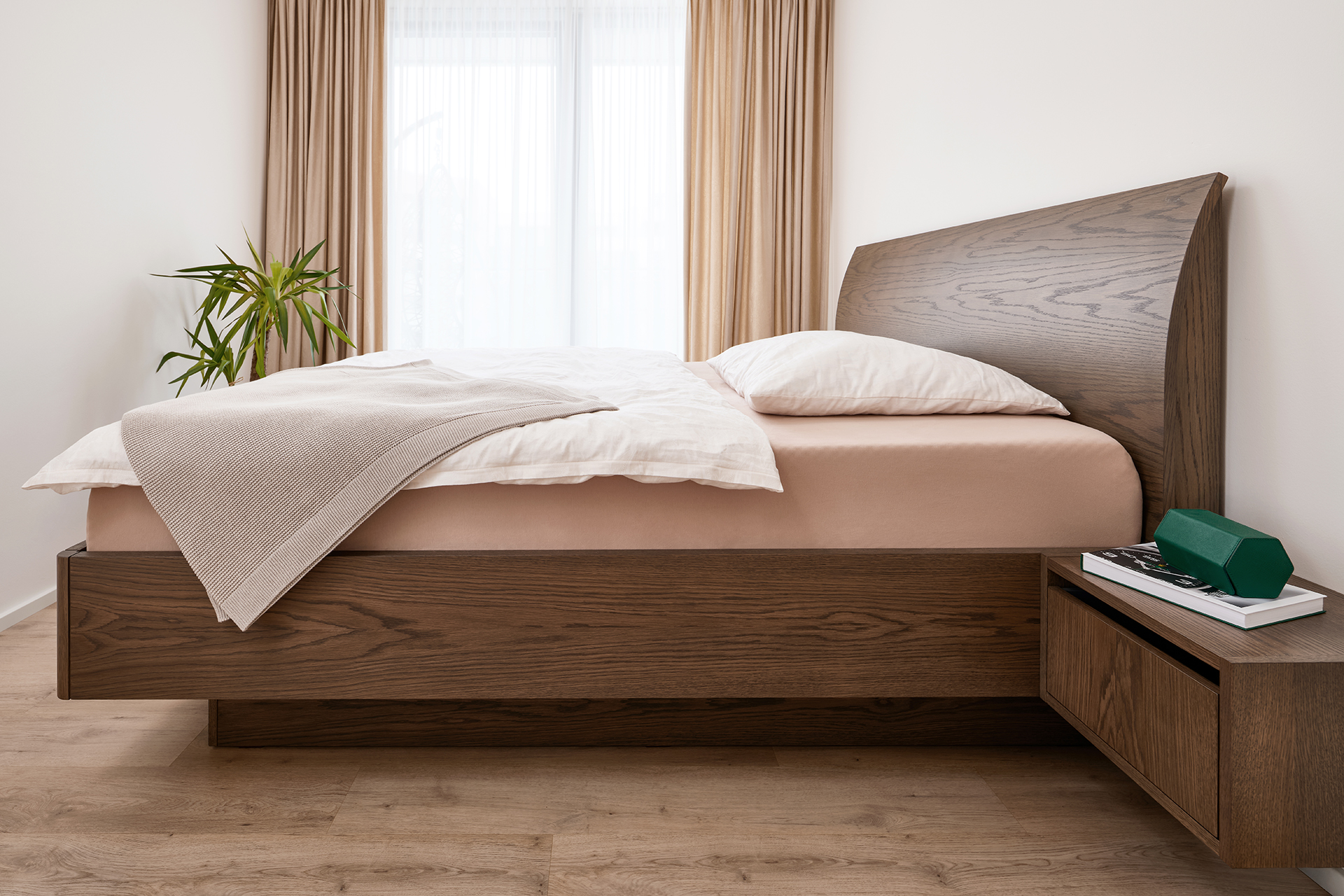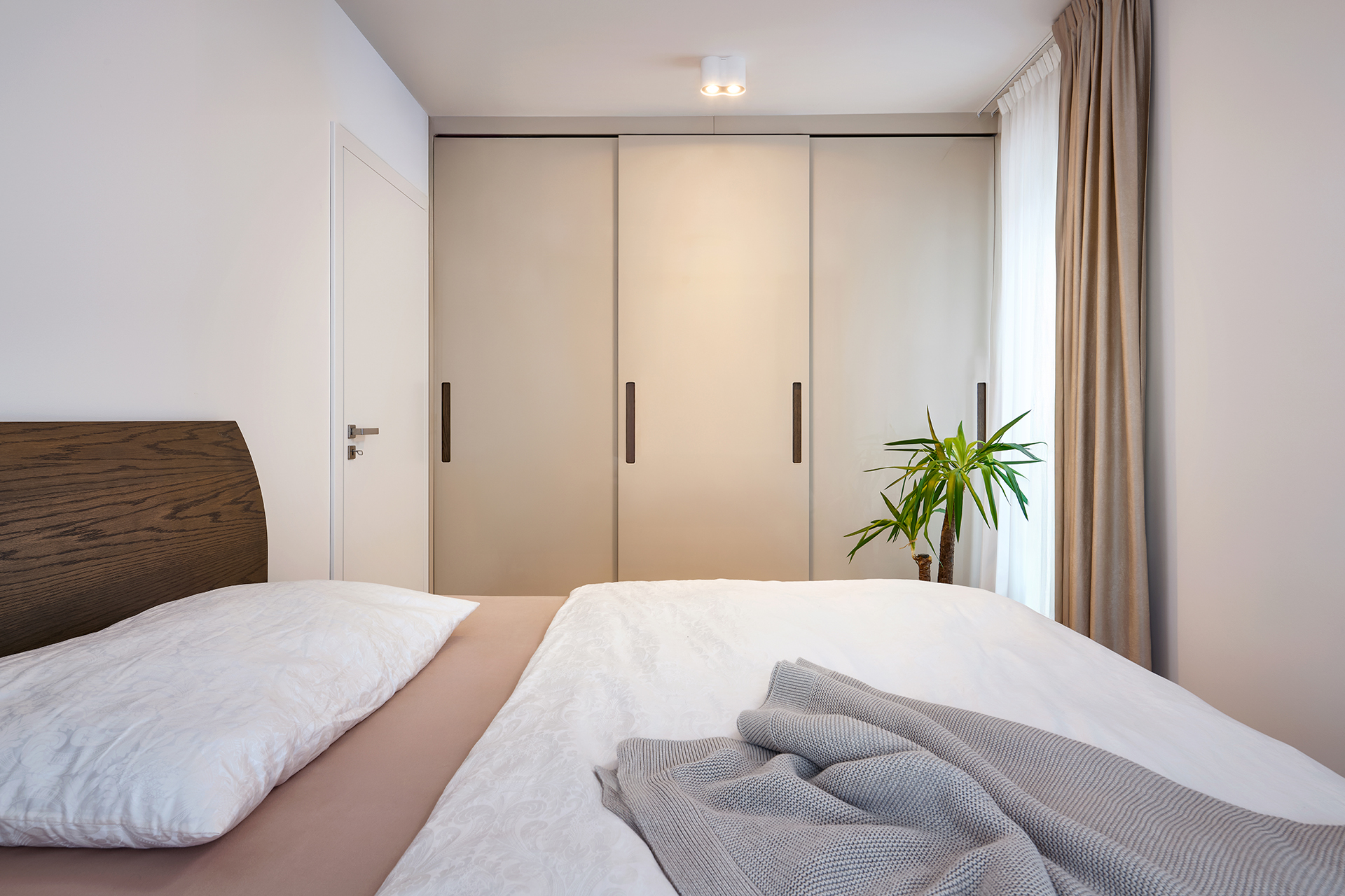 Jednotný designový koncept se promítá i v soukromých částech bytu. Ložnice s prostornou šatní skříní NATALIA a komfortní postelí KLAUDIE vytváří intimní útočiště, kde se klid potkává s naprostým pohodlím. Každý detail je zde navržen tak, aby chvíle odpočinku působily uvolněně a harmonicky. V chodbě a pracovně byl zvolen světlejší lak, který prostory opticky odlehčuje a dodává jim vzdušnost, přičemž v detailech zůstává zachována návaznost na hlavní linii nábytku. Technická místnost s policovým systémem HARMONY je řešena s důrazem na funkčnost a precizní zpracování — hodnoty, které dlouhodobě definují naši výrobu.